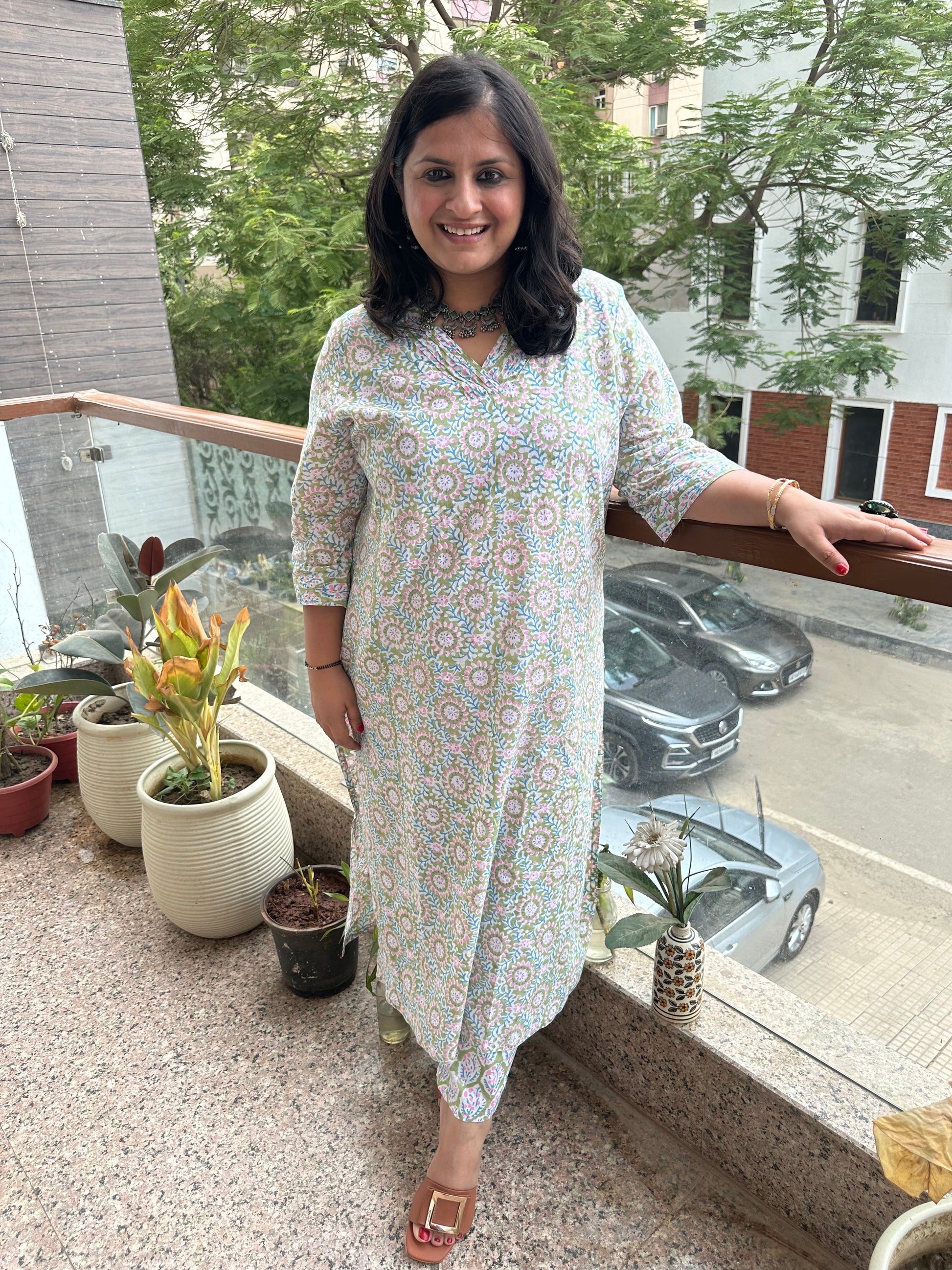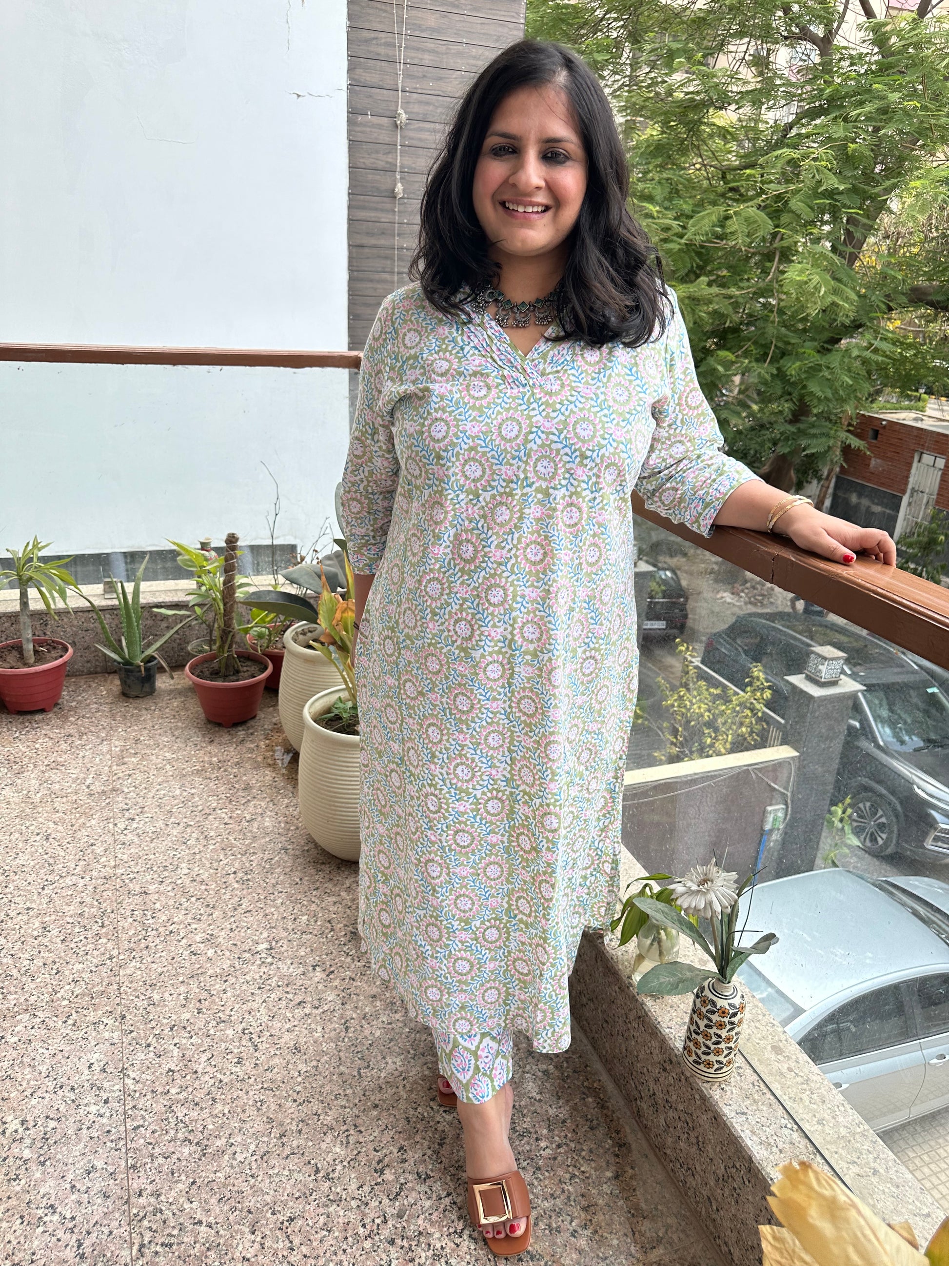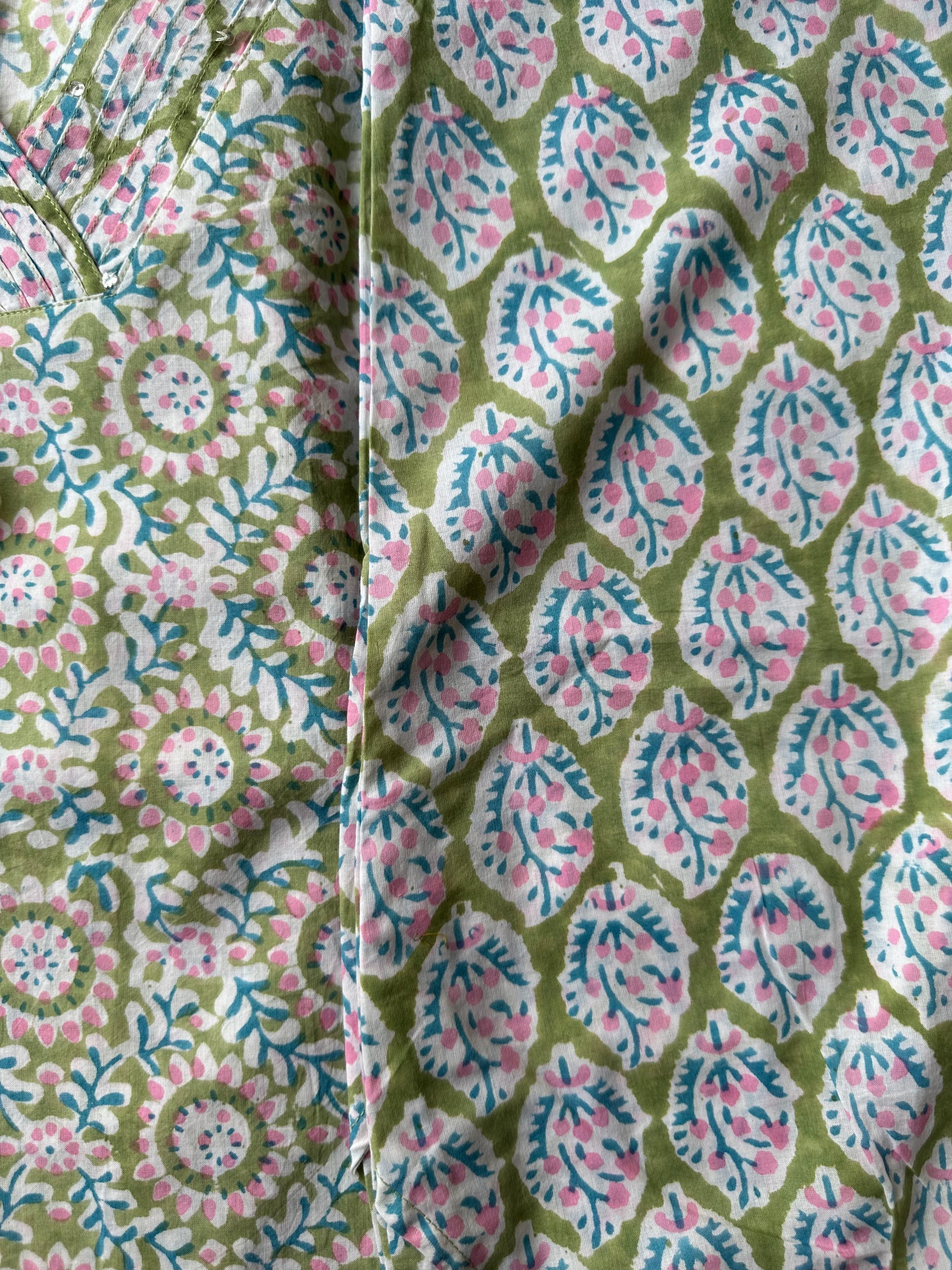 GREEN FLORAL COTTON HANDBLOCK HANDCRAFTED KURTA SET WITH BORDER