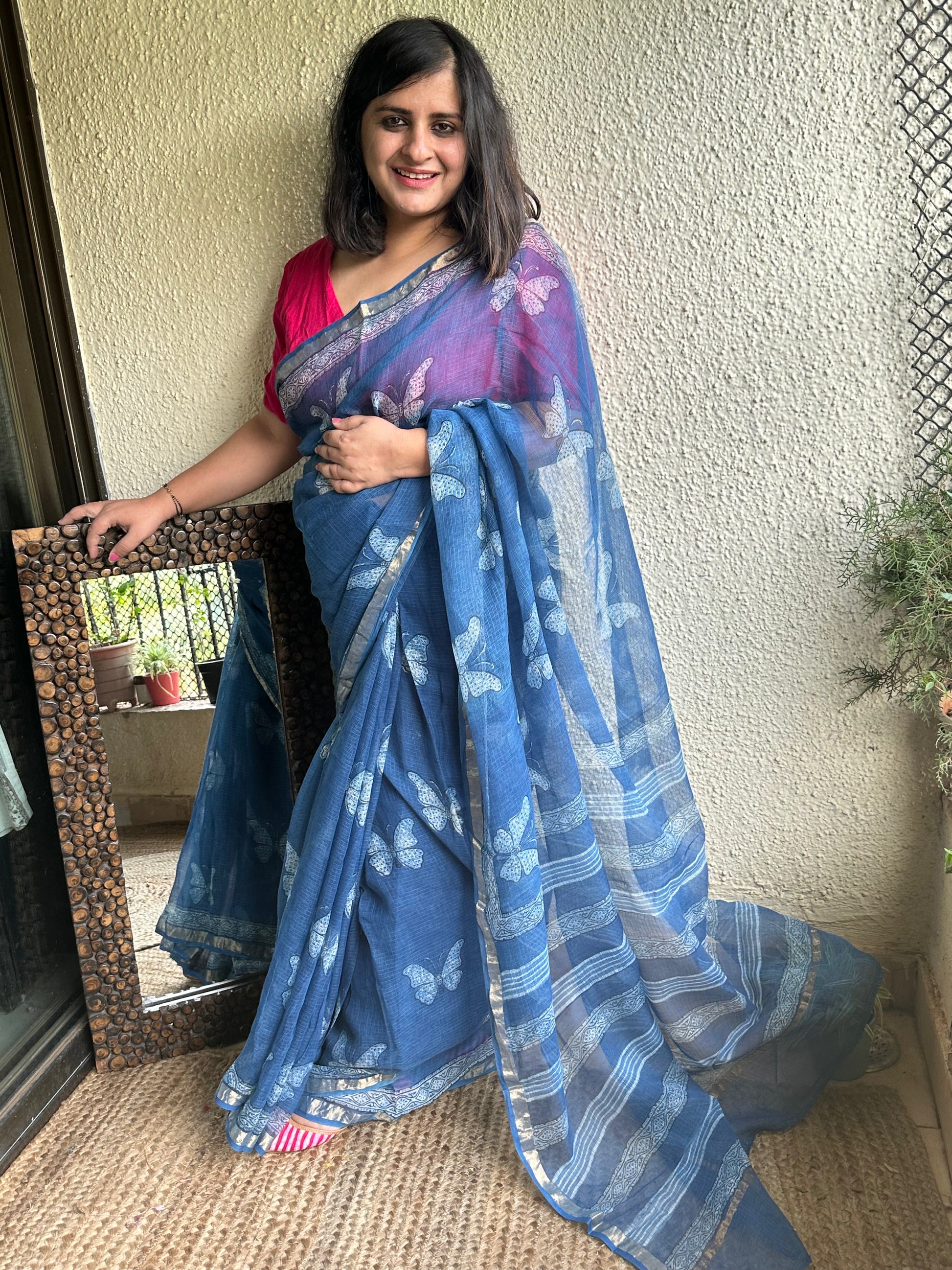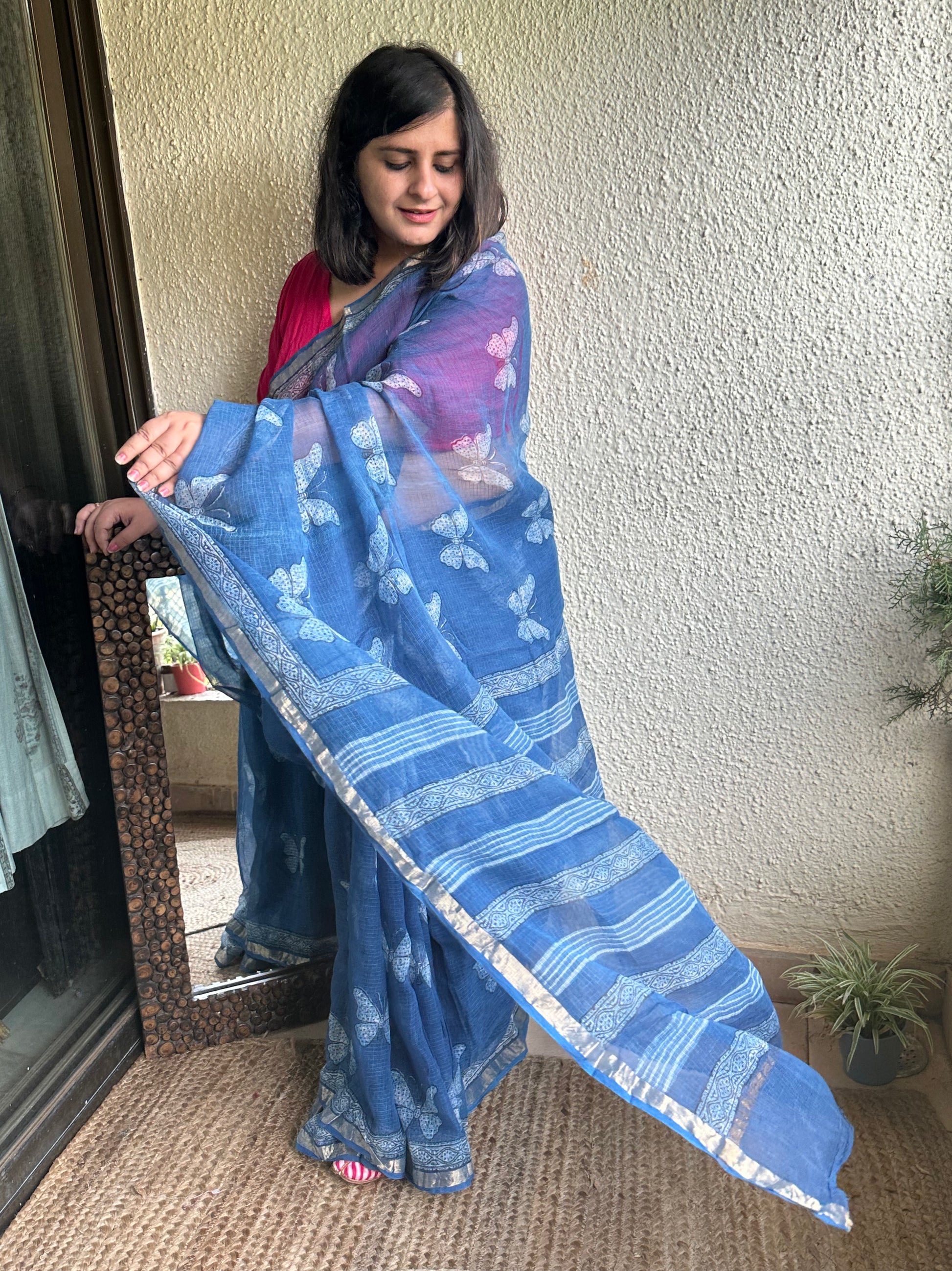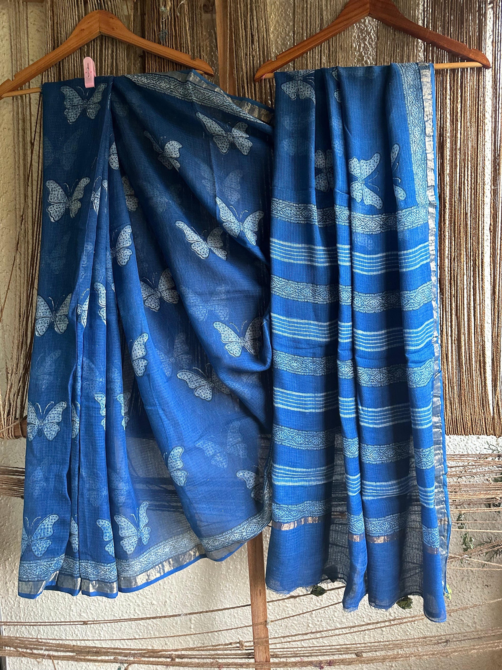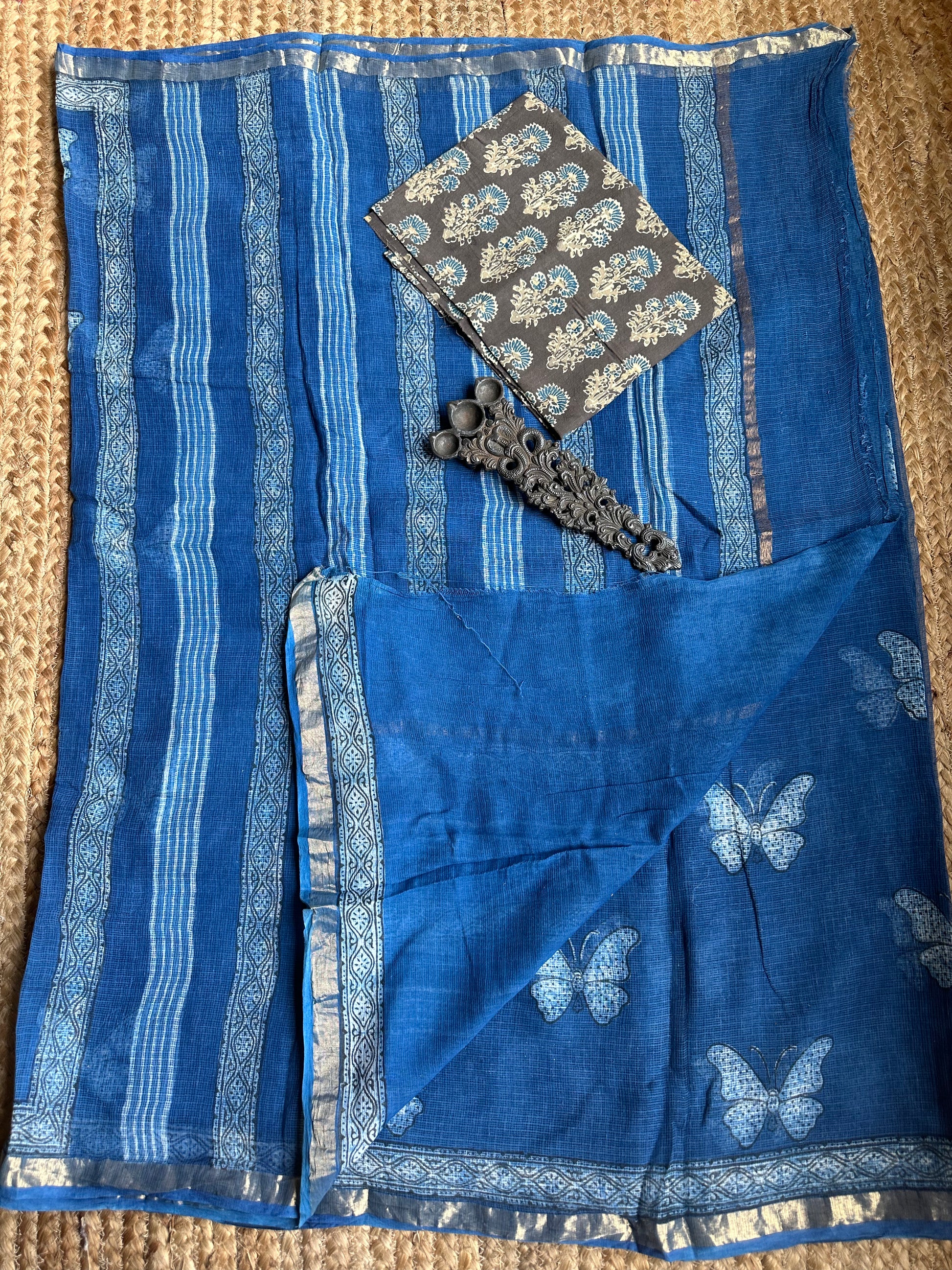 INDIGO AKOLA KOTA COTTON HAND BLOCK SAREE, HAS ITS OWN RUNNING BLOUSE PIECE, HOWEVER, PAIRED WITH A HAND BLOCK BLOUSE