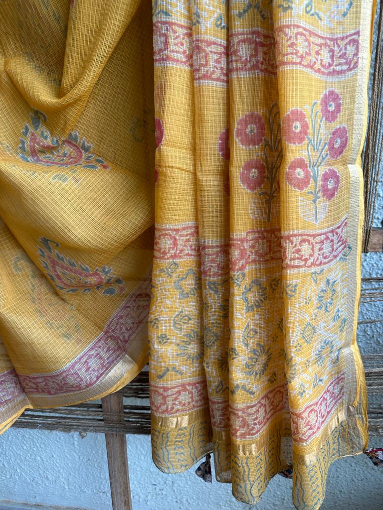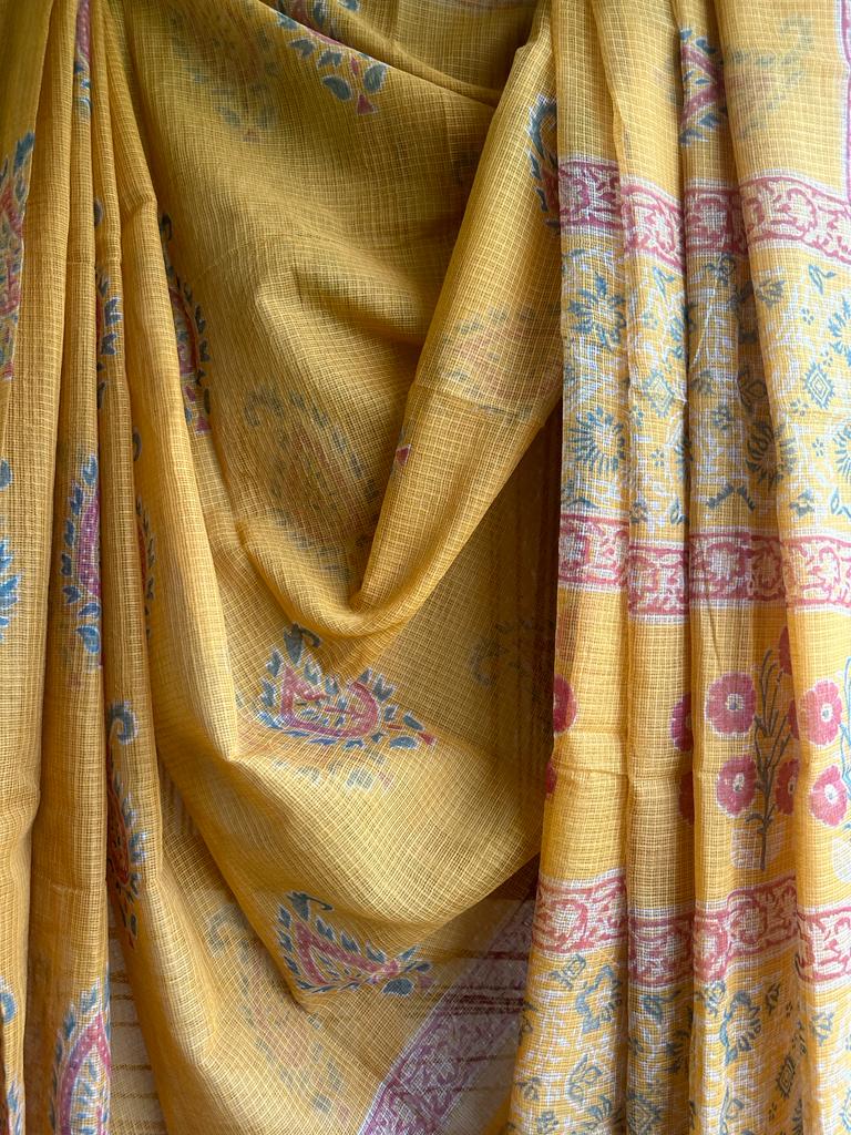 MUSTARD KOTA COTTON HAND BLOCK SAREE, HAS ITS OWN RUNNING BLOUSE PIECE, HOWEVER, PAIRED WITH A HAND BLOCK BLOUSE