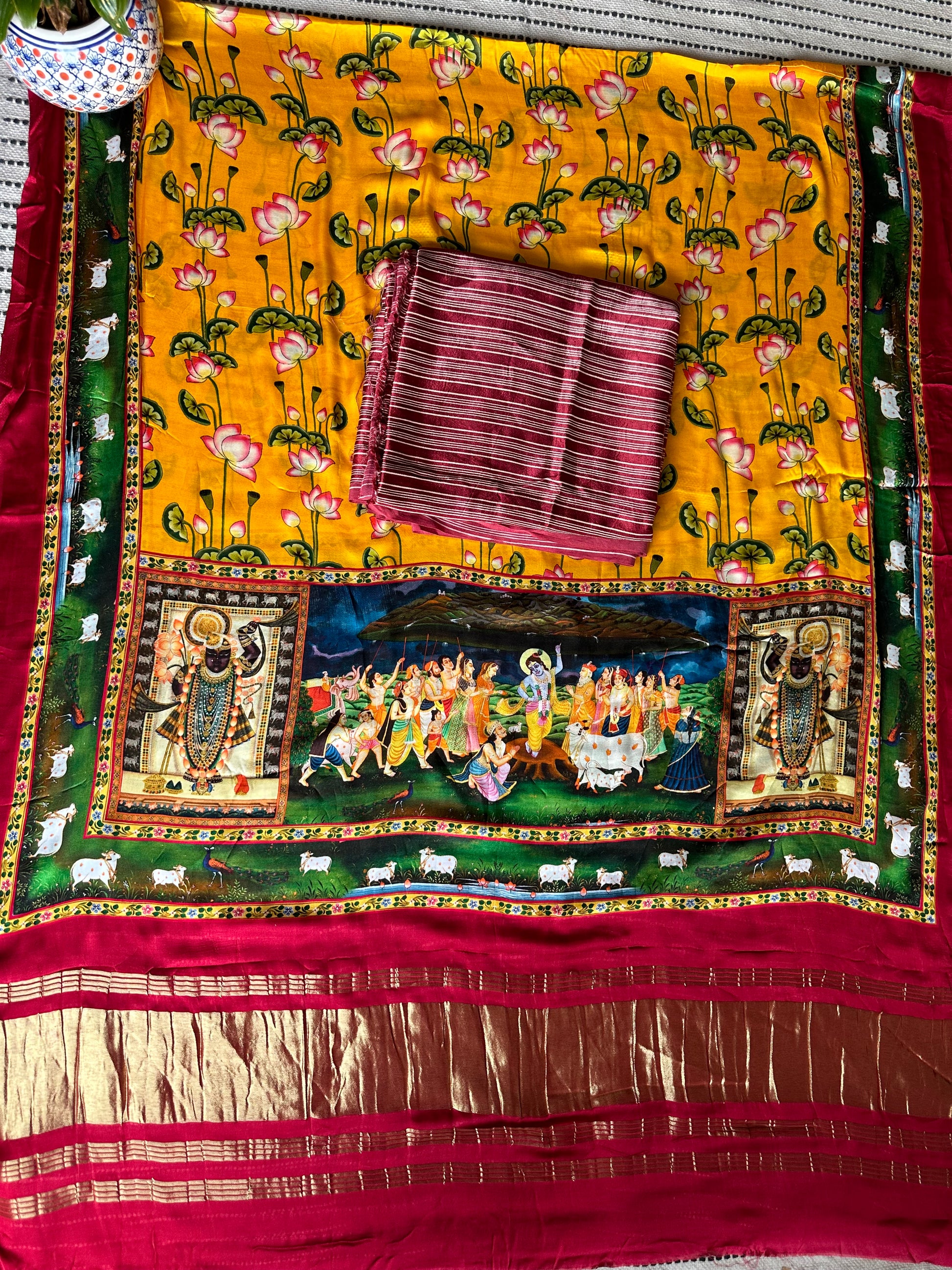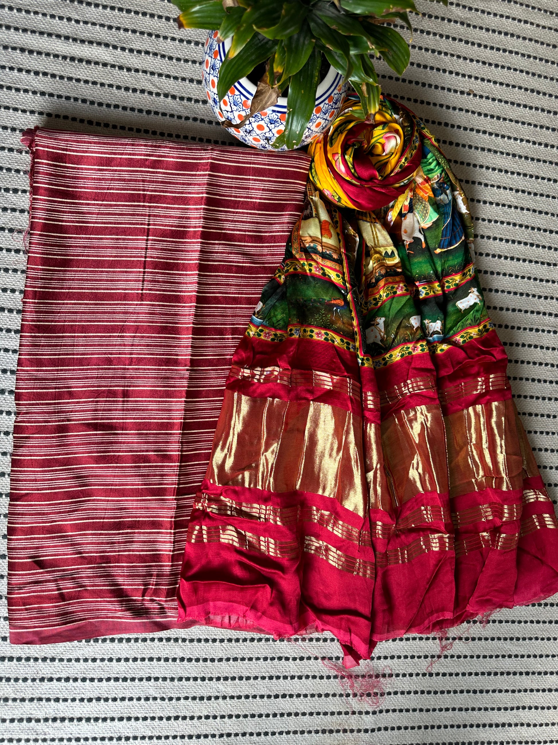 fabric: 2.5 mtrs meter dupatta : 2.5 mtrs * 35'' a slight difference in shade could be due to the camera & lights. embrace the imperfection !! happy handloom dry clean only |