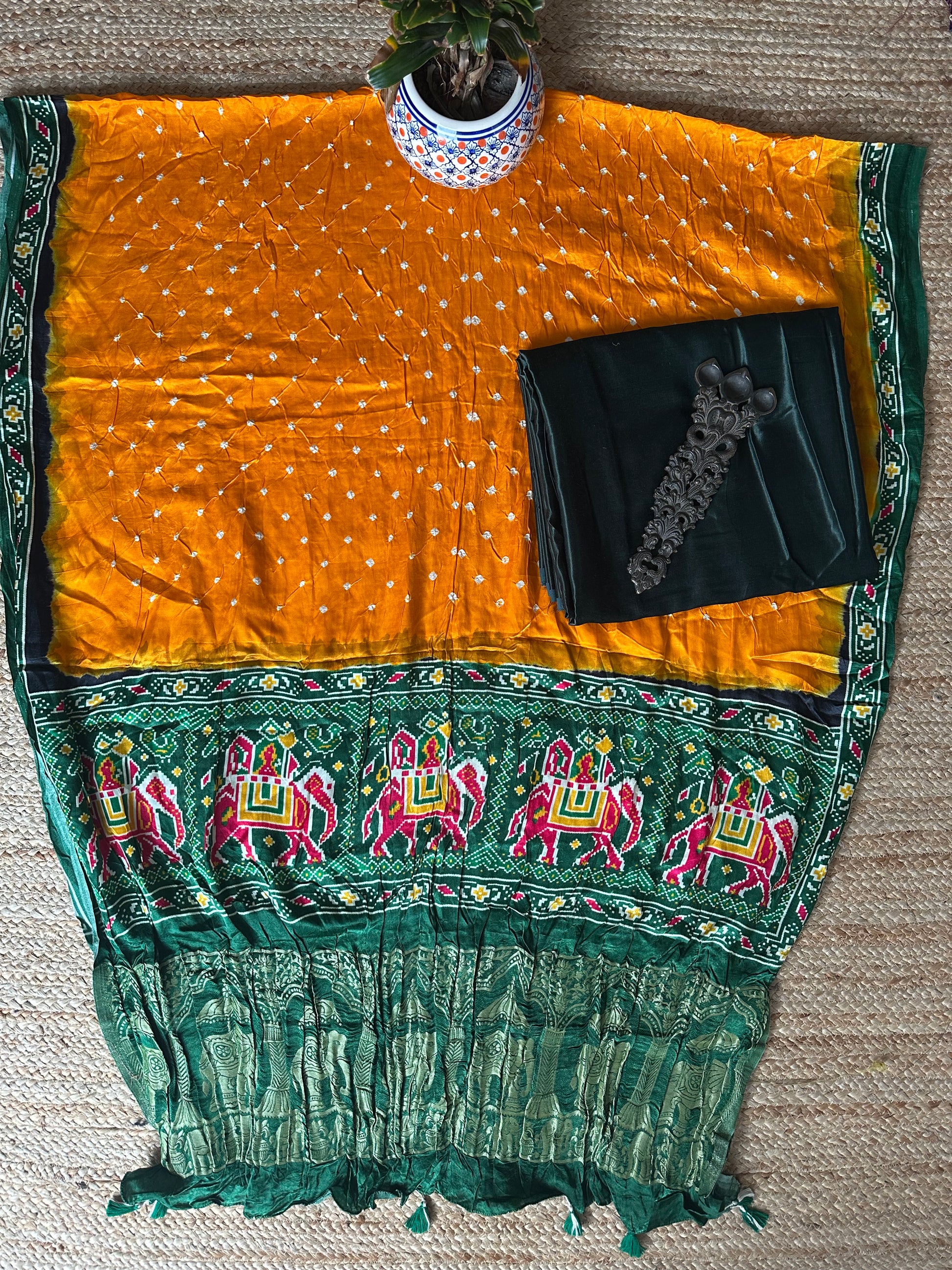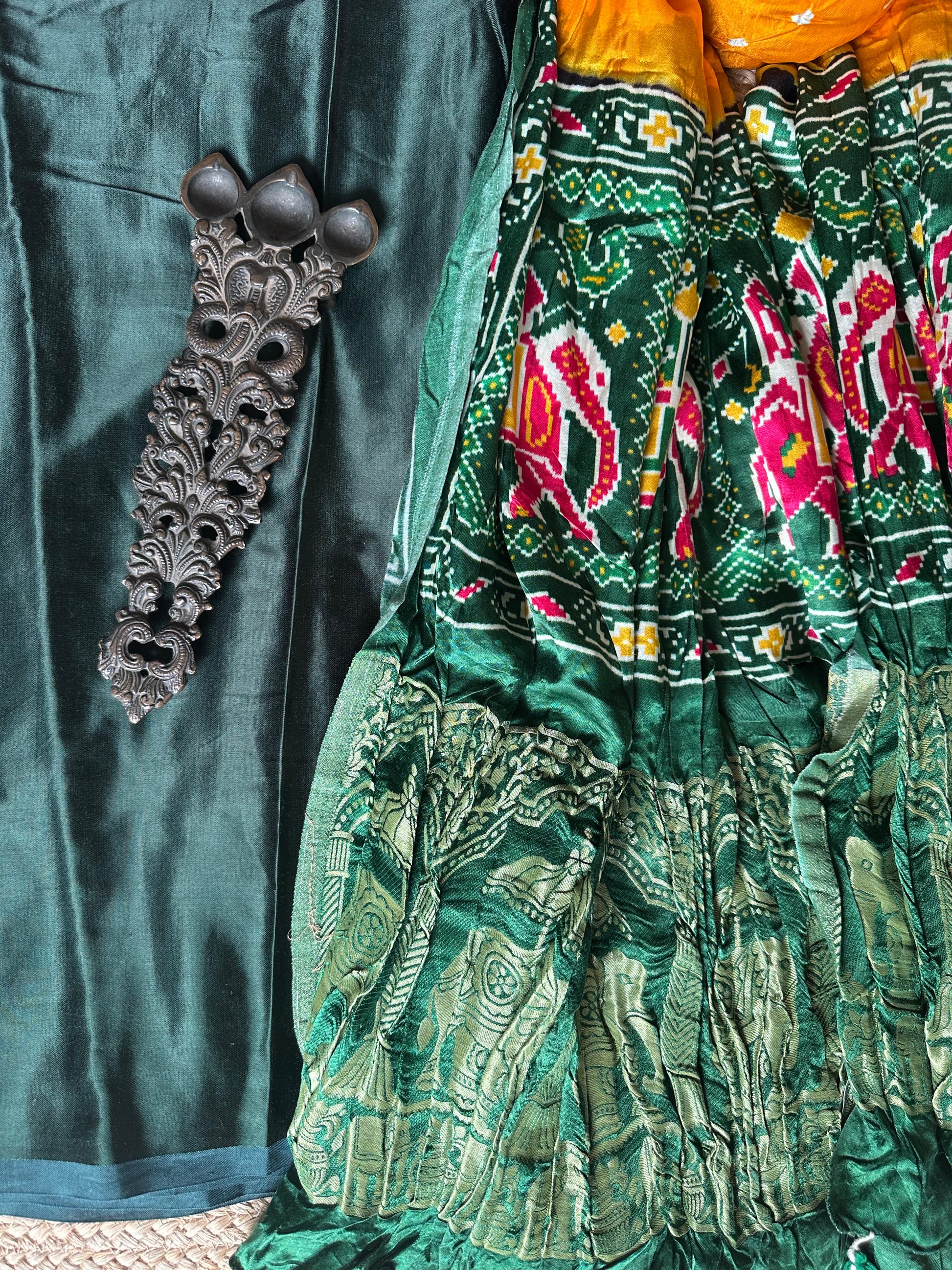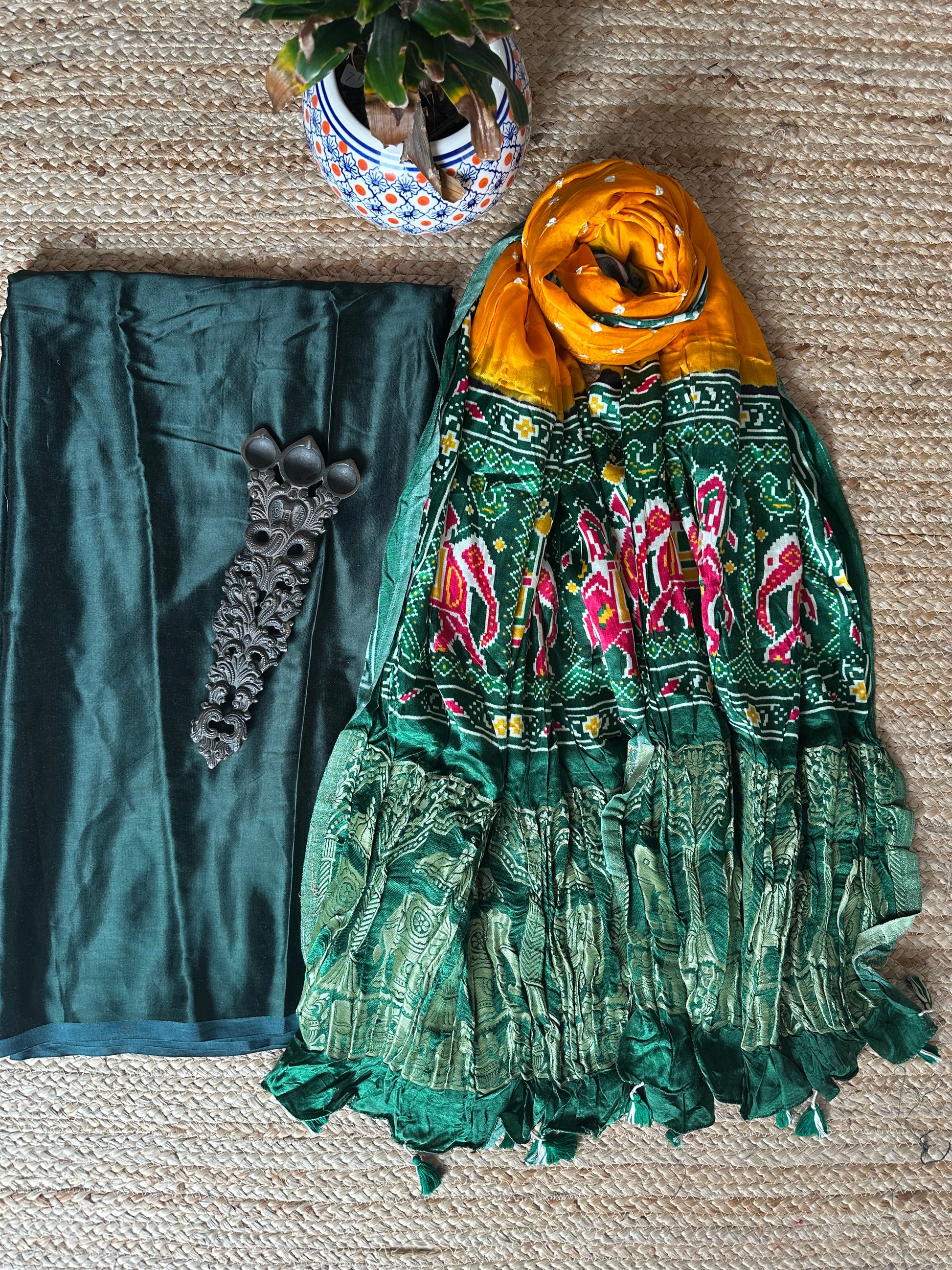 | dark green mashru silk kurta with handcrafted bandhani Pichwai modal silk dupatta