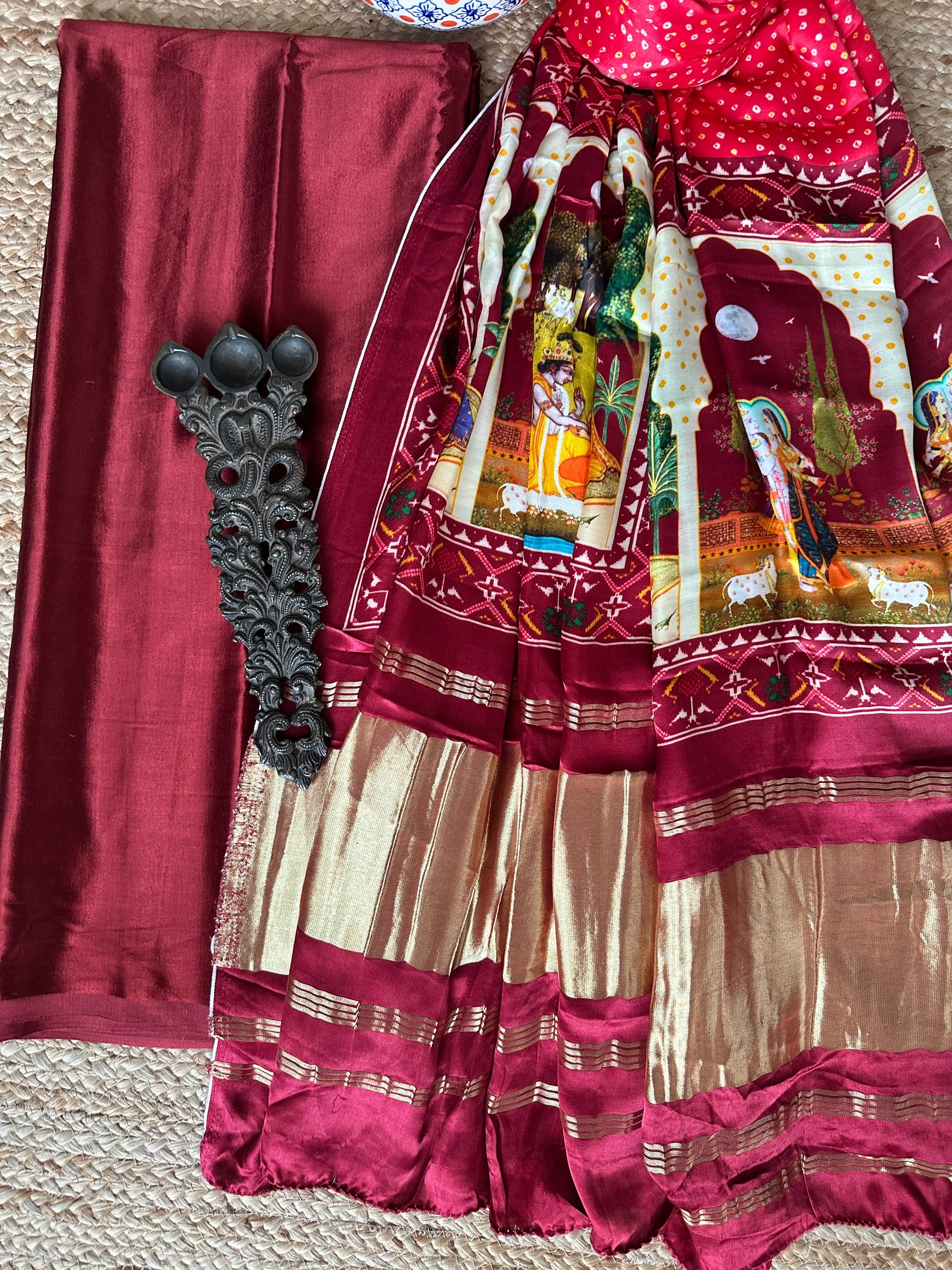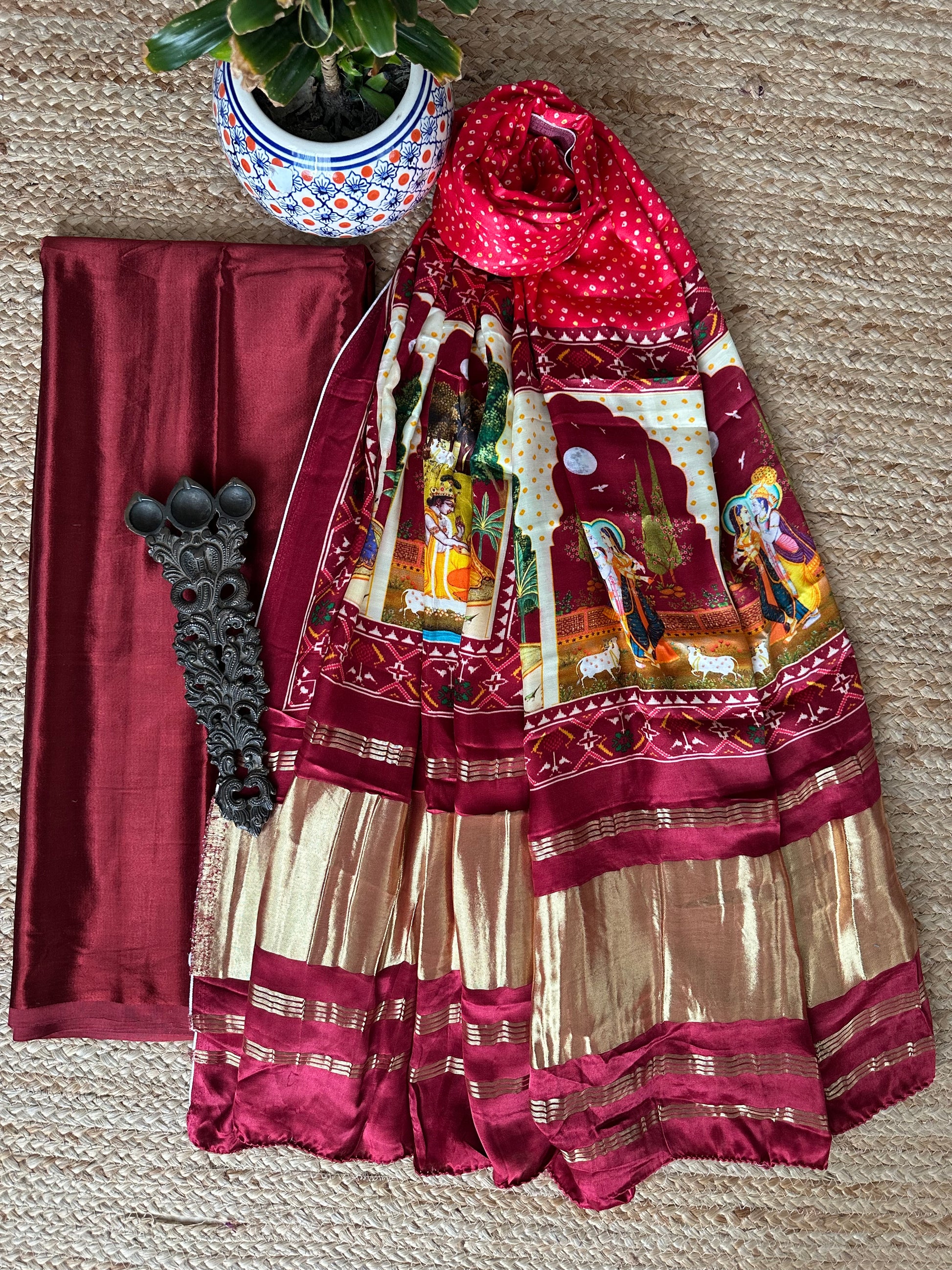 | Dark maroon mashru  silk kurta with handcrafted Patola modal silk dupatta fabric: 2.5 mtrs meter dupatta : 2.5 mtrs * 35'' a slight difference in shade could be due to the camera & lights. embrace the imperfection !! happy handloom dry clean only |