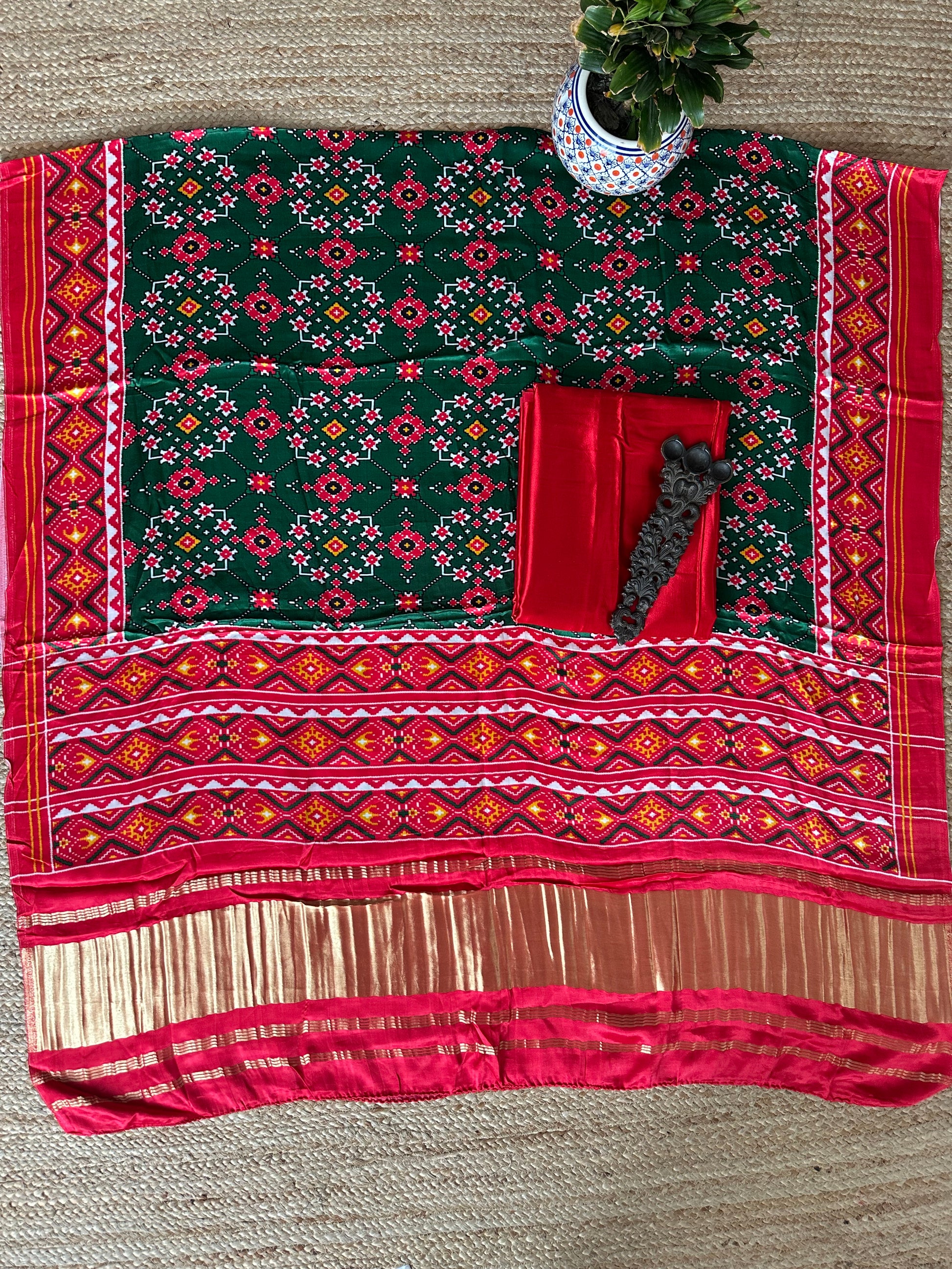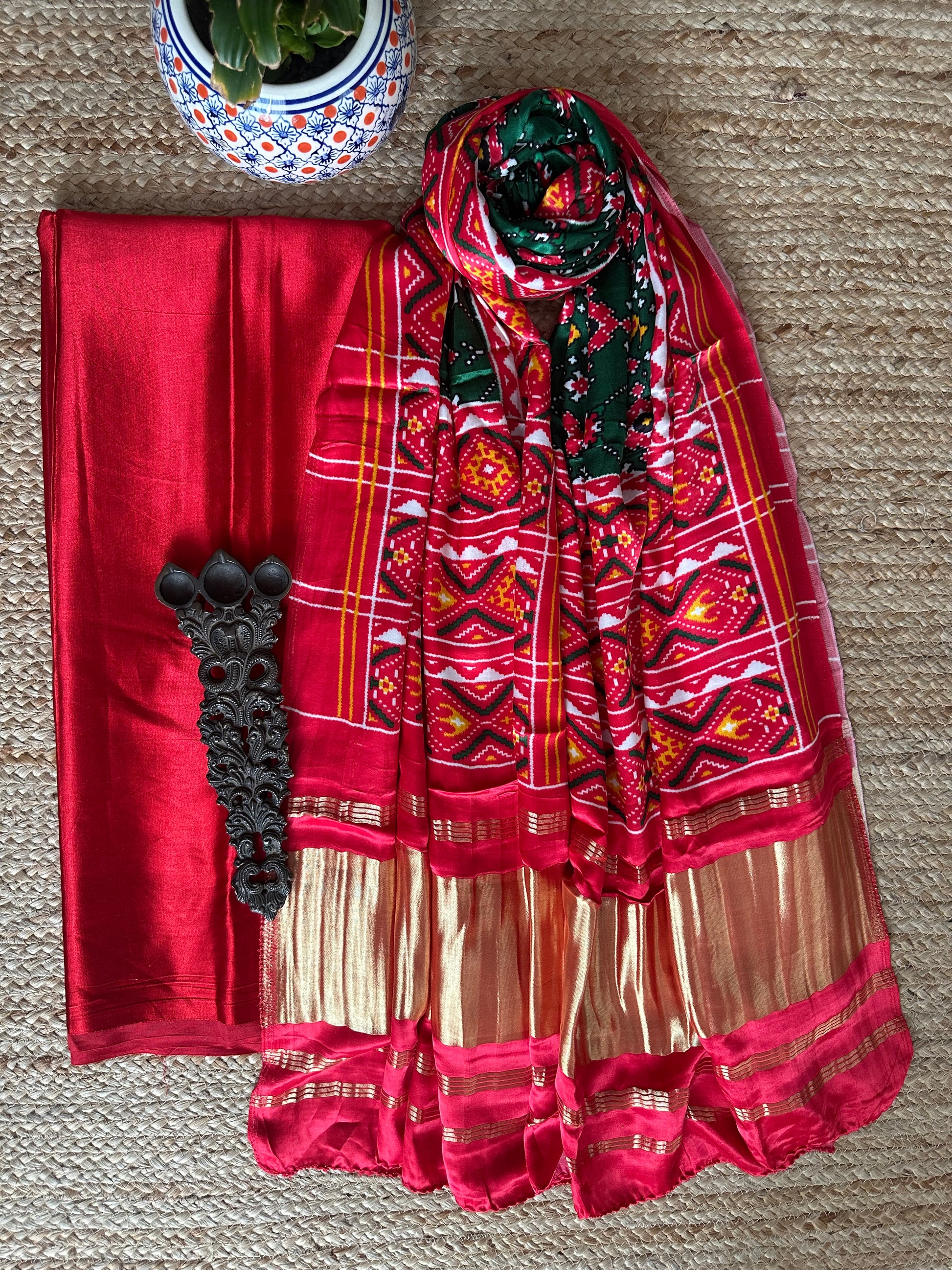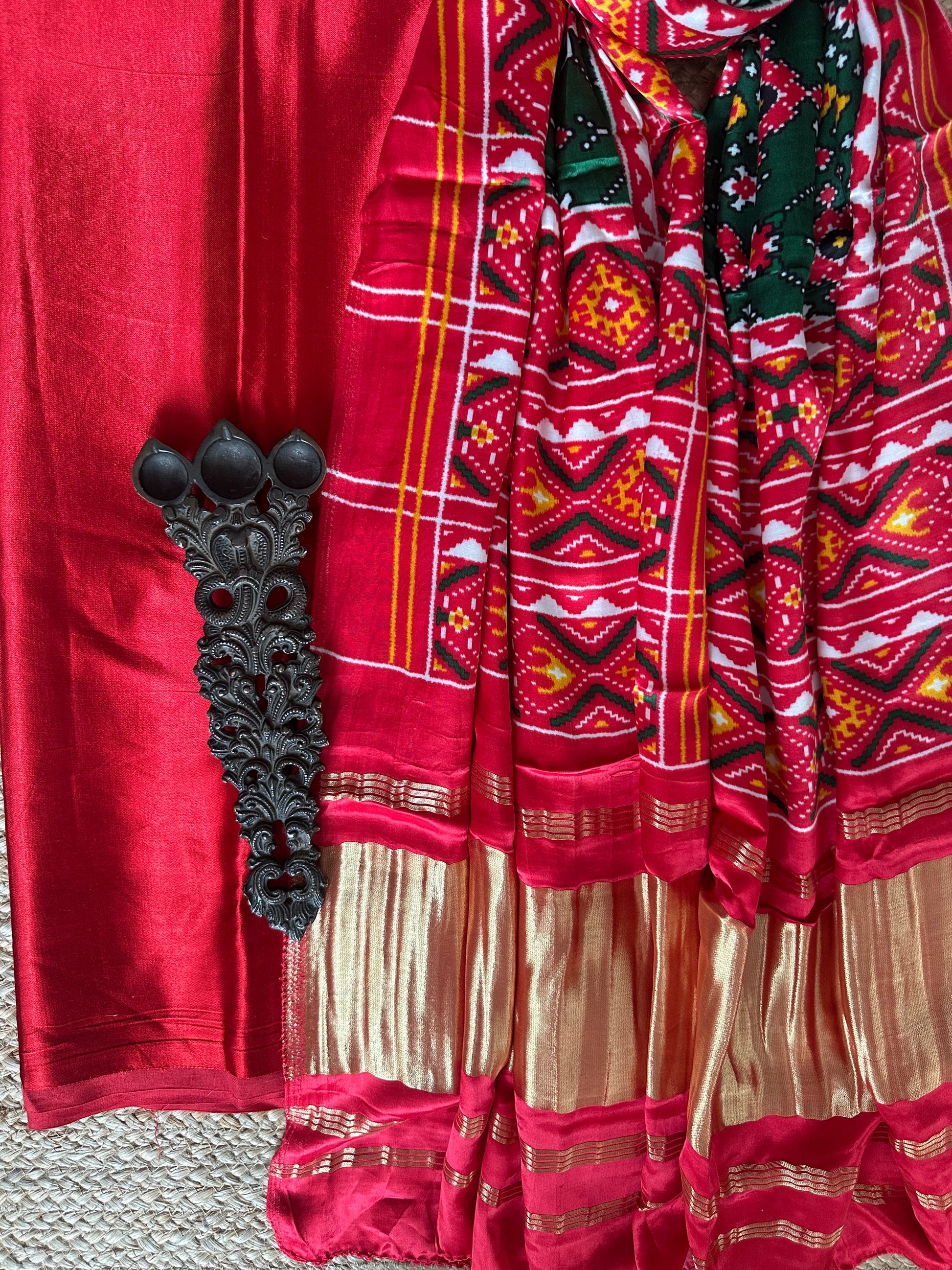 | Red  mashru  silk kurta with handcrafted Patola modal silk dupatta fabric: 2.5 mtrs meter dupatta : 2.5 mtrs * 35'' a slight difference in shade could be due to the camera & lights. embrace the imperfection !! happy handloom dry clean only |