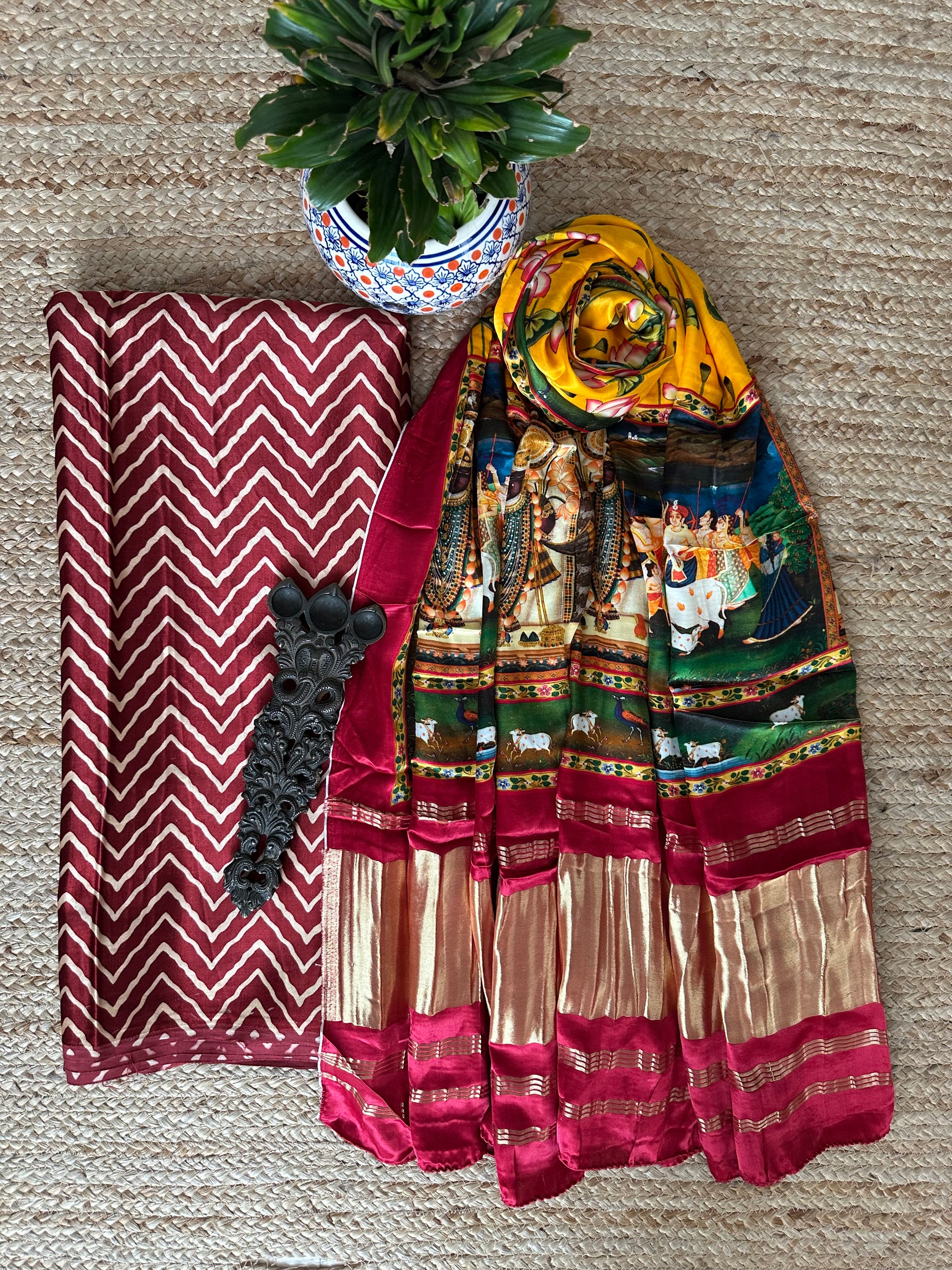 MAROON ZIGZAG MASHRU SILK KURTA WITH PATOLA HANDCRAFTED MODAL SILK DUPATTA PS-3