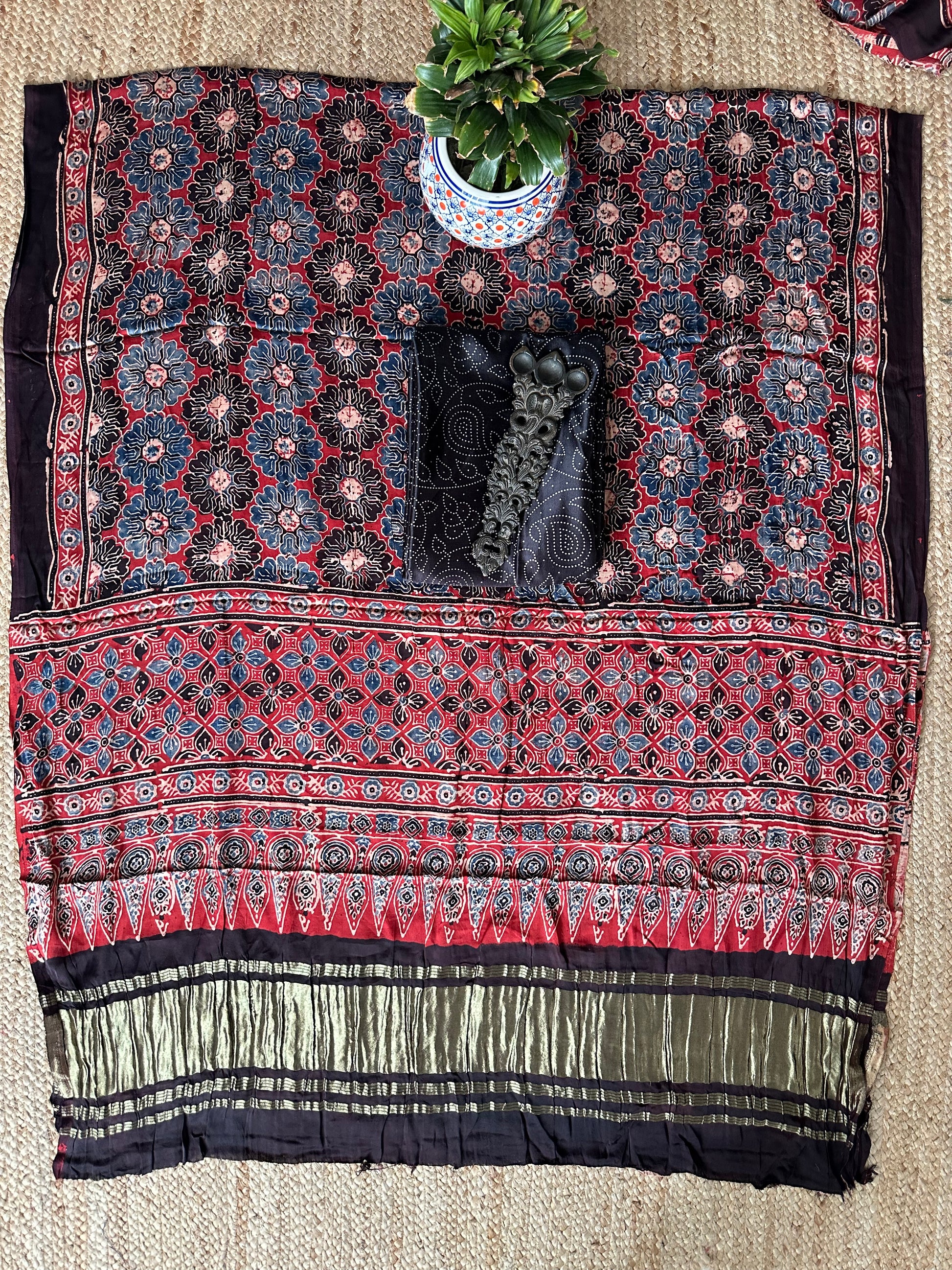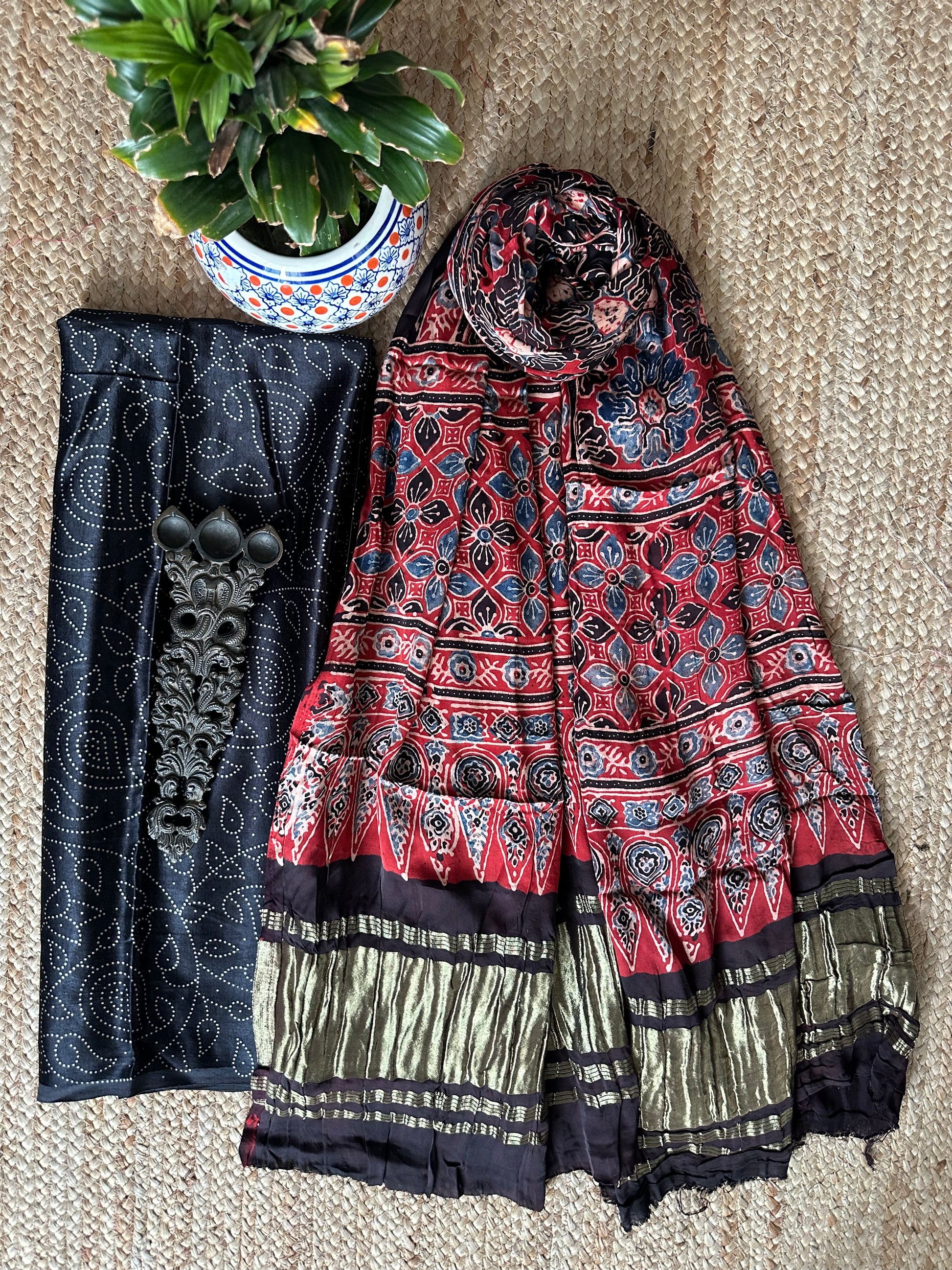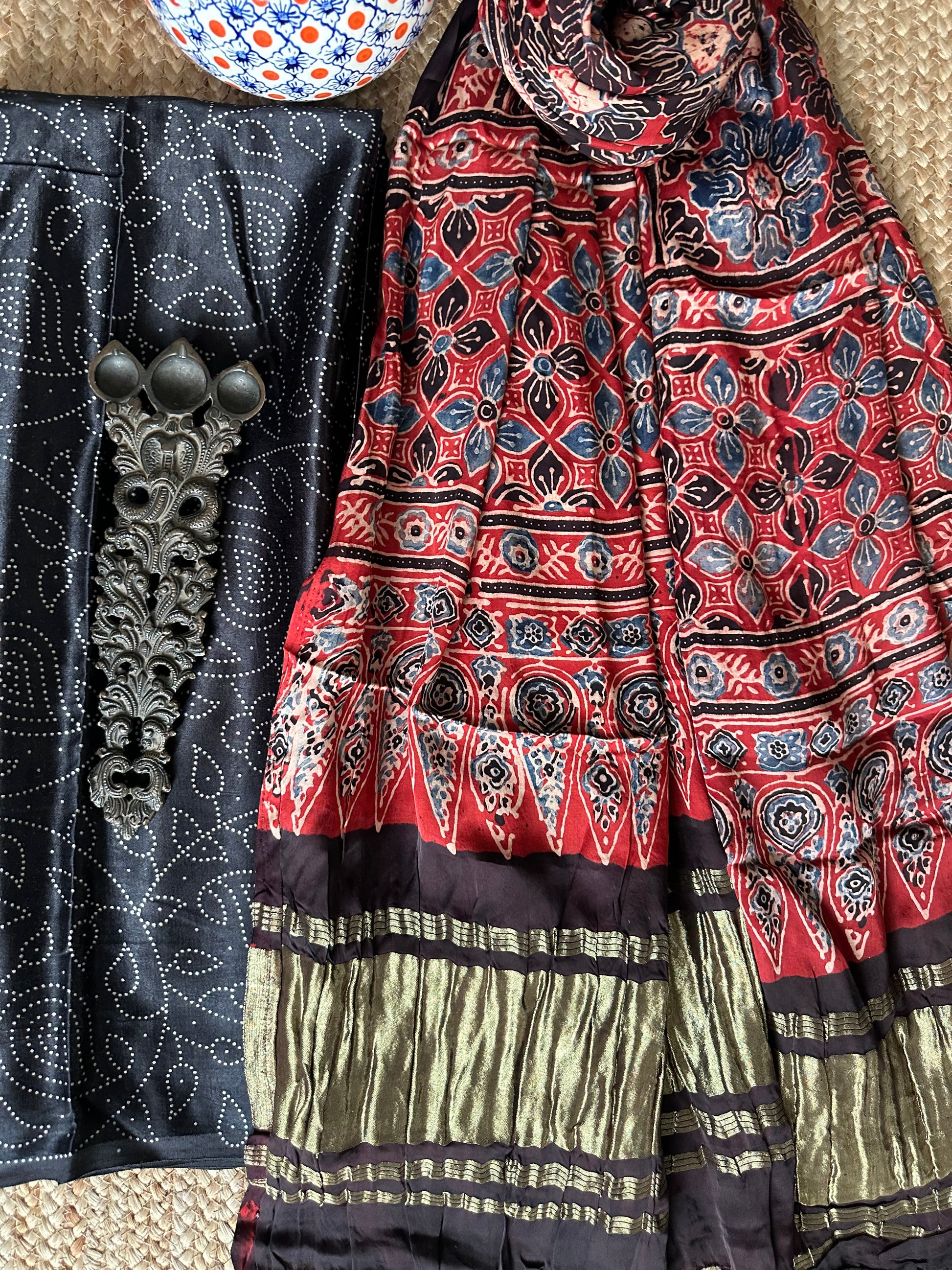 | BLACK MASHRU SILK KURTA WITH AJRAKH HANDBLOCK PRINT MODAL SILK DUPATTA