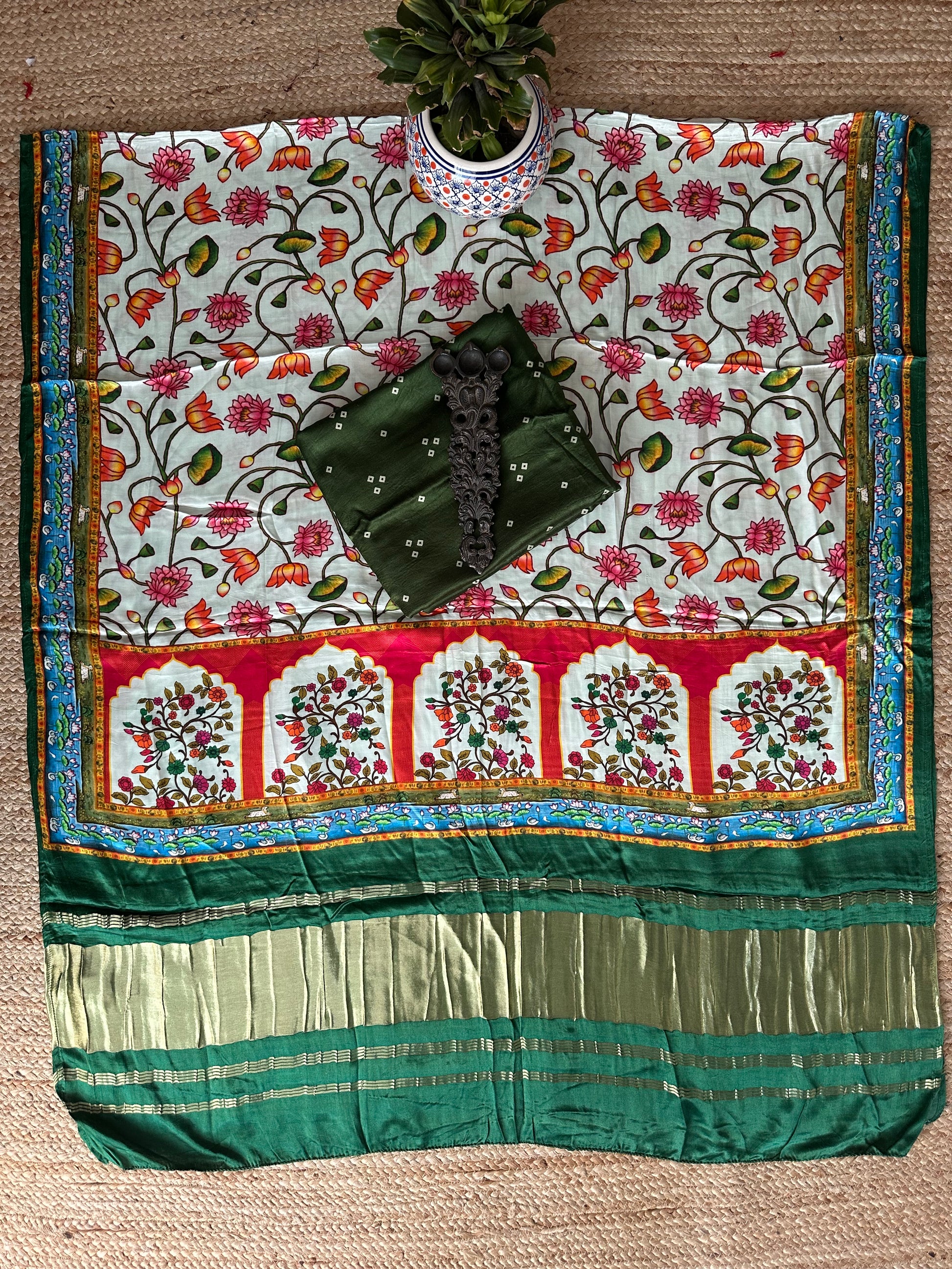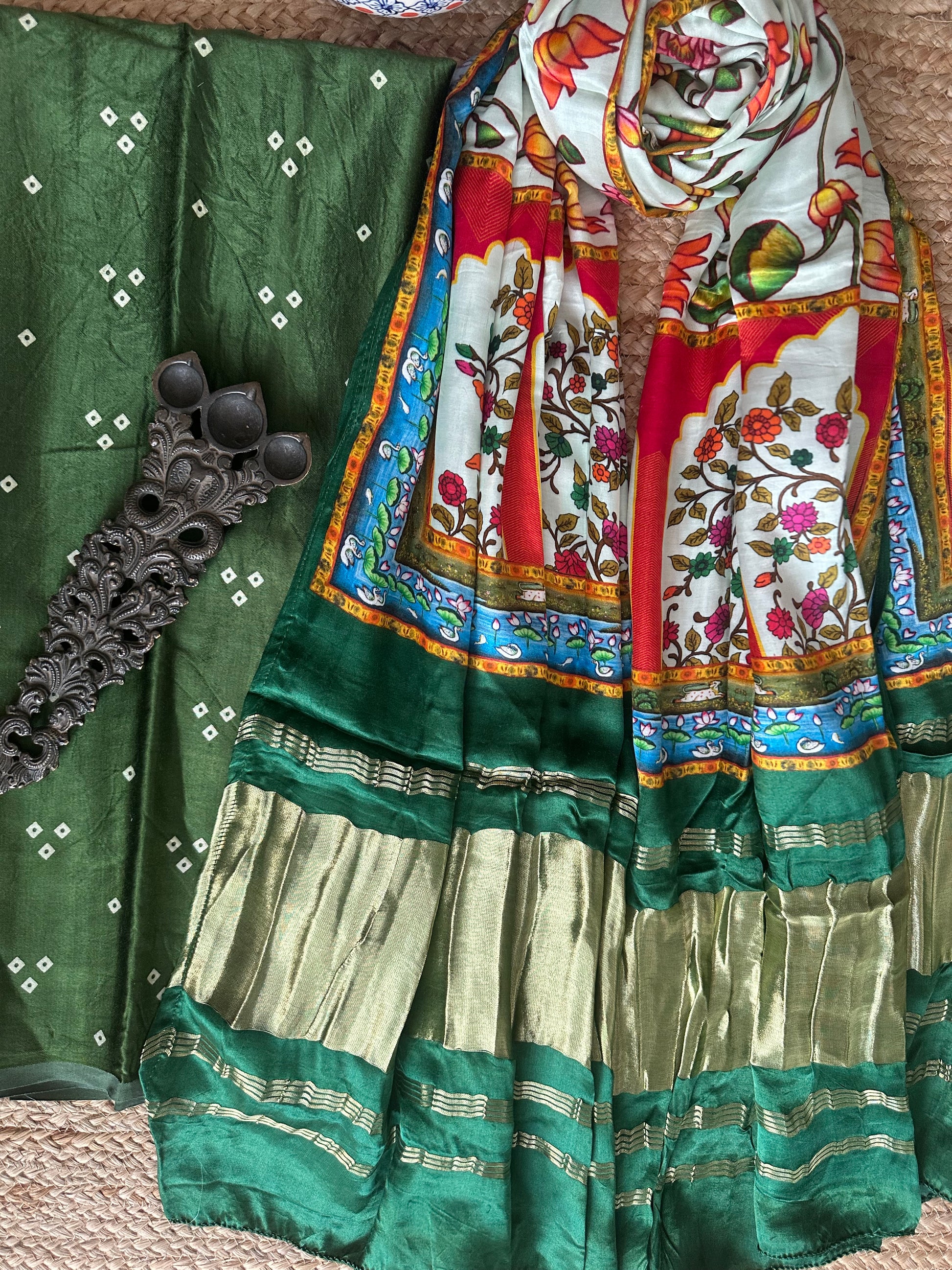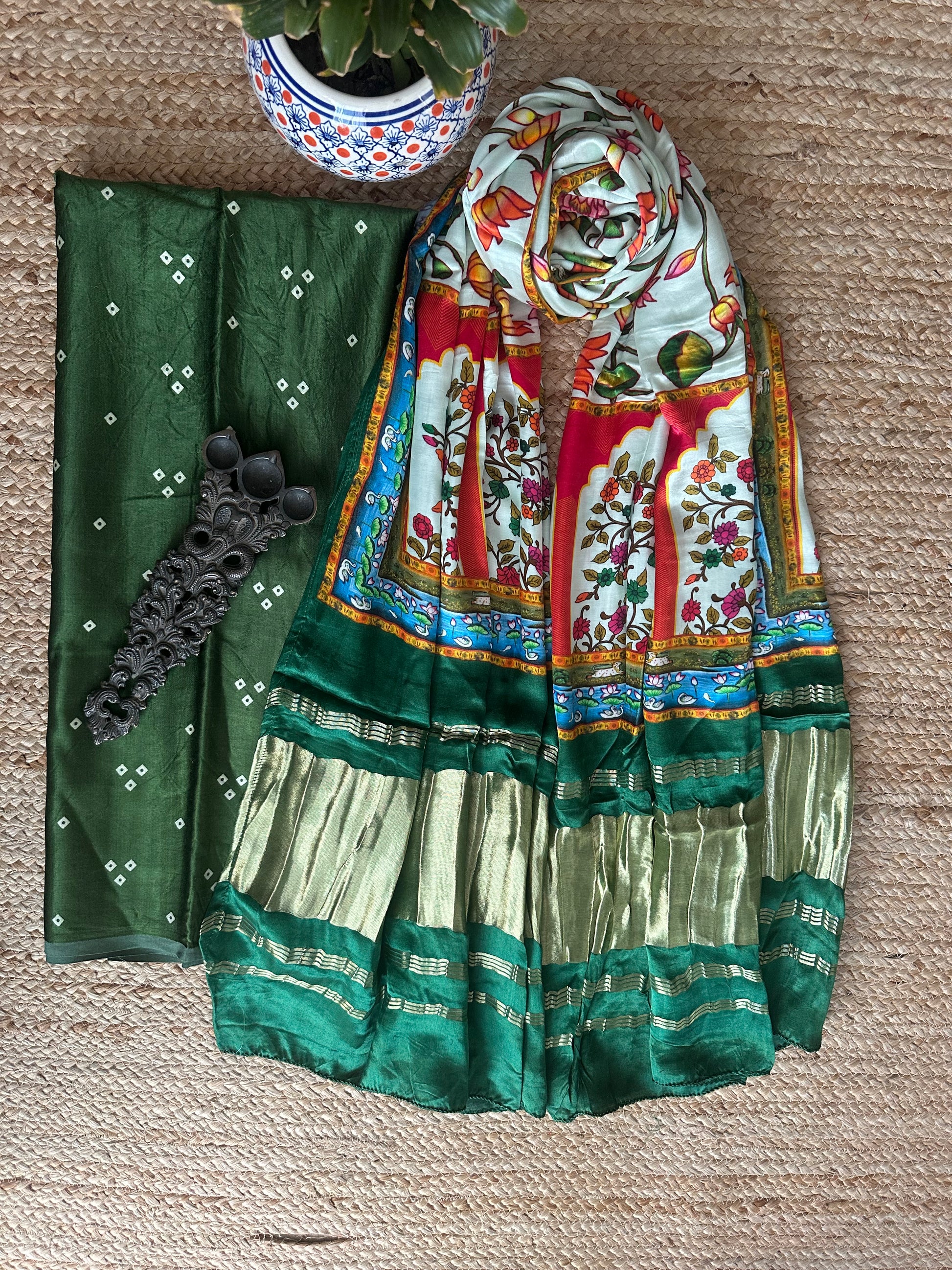 | GREEN 3 BANDHANI MASHRU SILK KURTA WITH PATOLAPRINT MODAL SILK DUPATTA