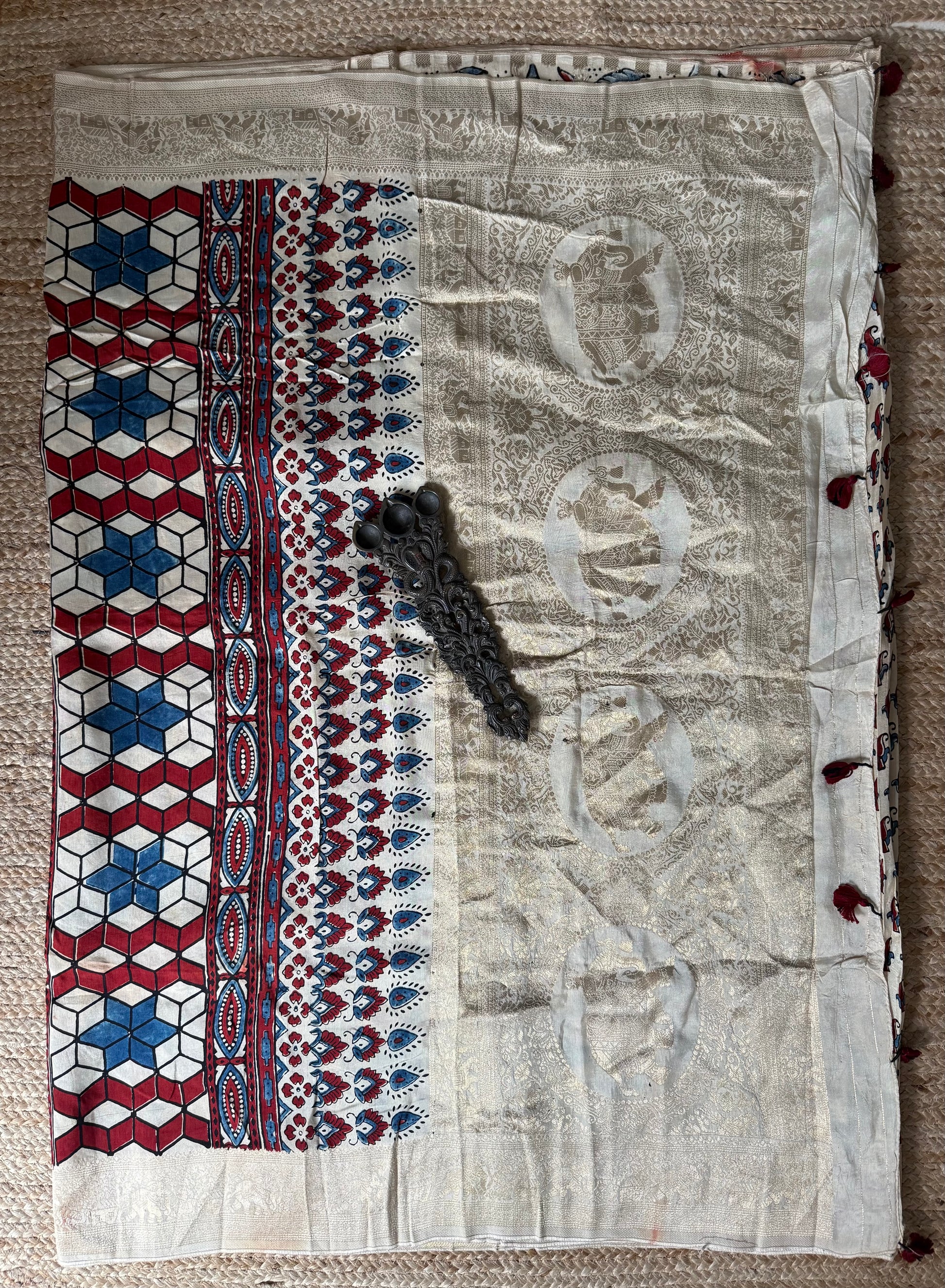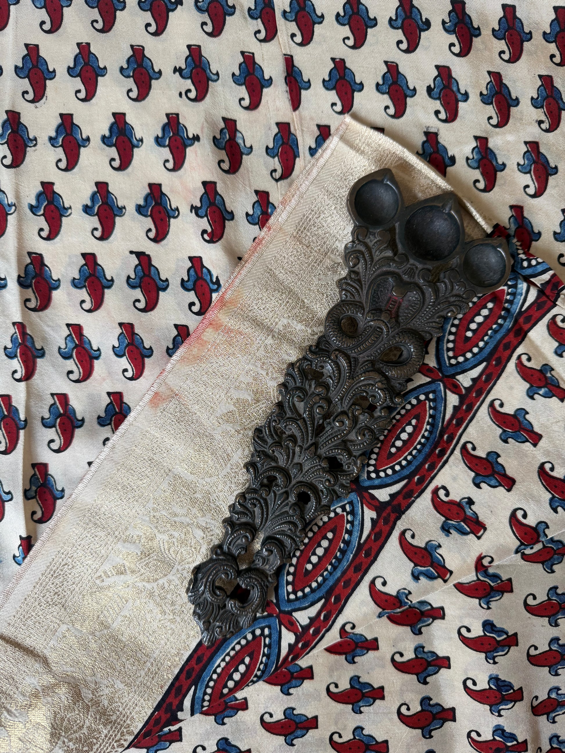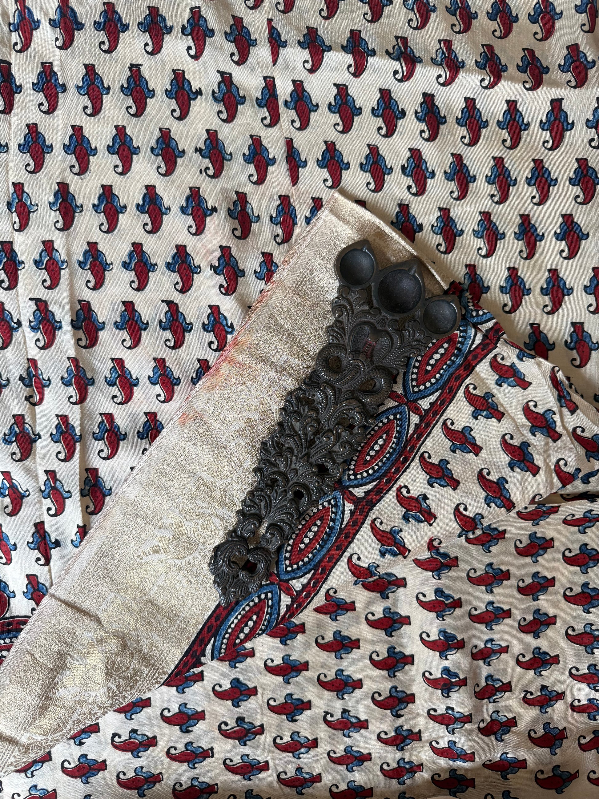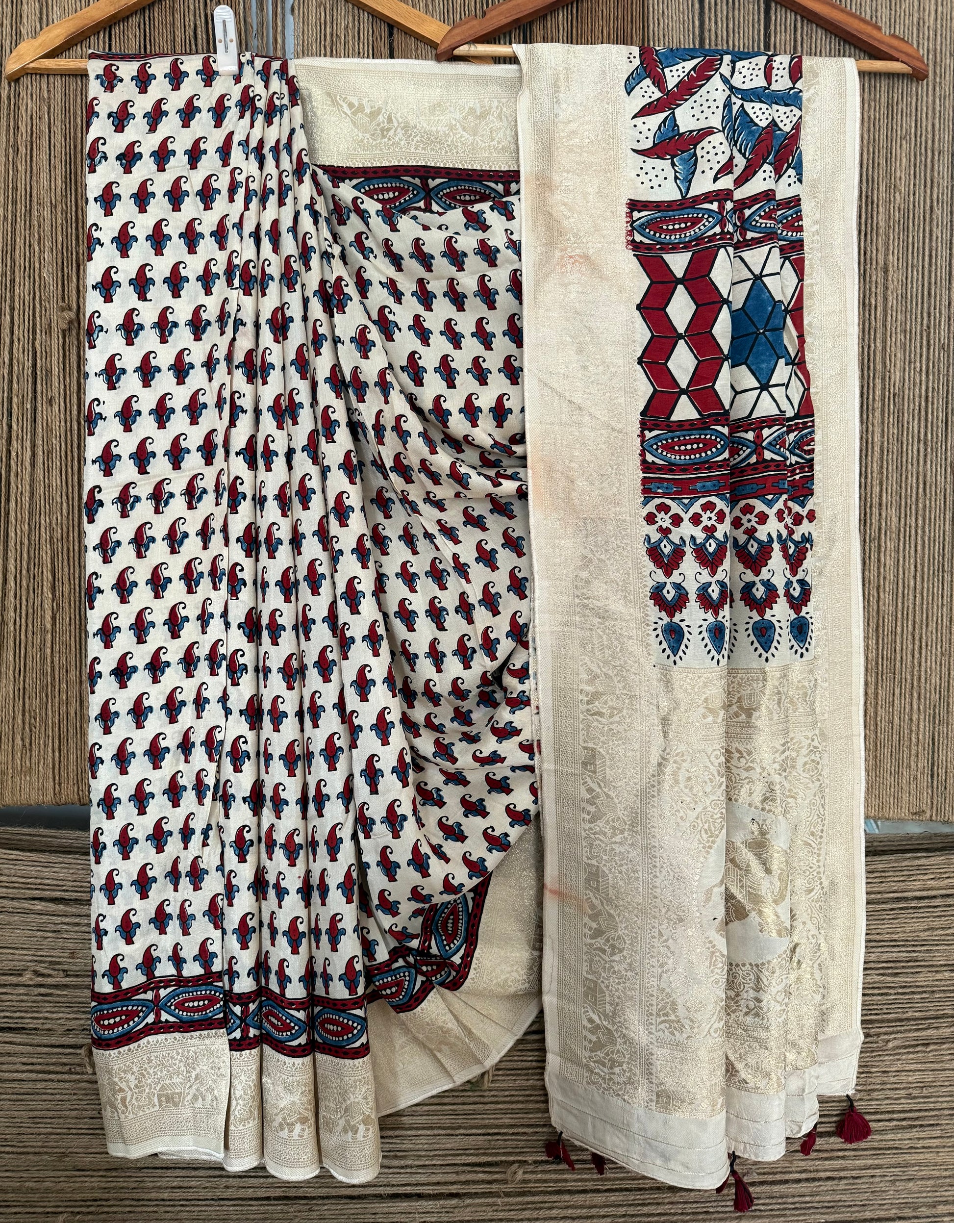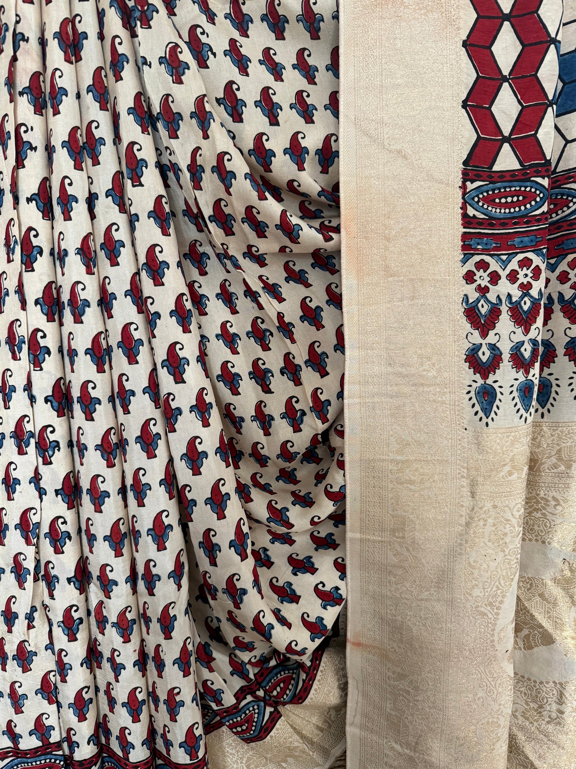 BEIGE GOLDEN DOLA SILK AJRAKH ZARI BORDER SARI