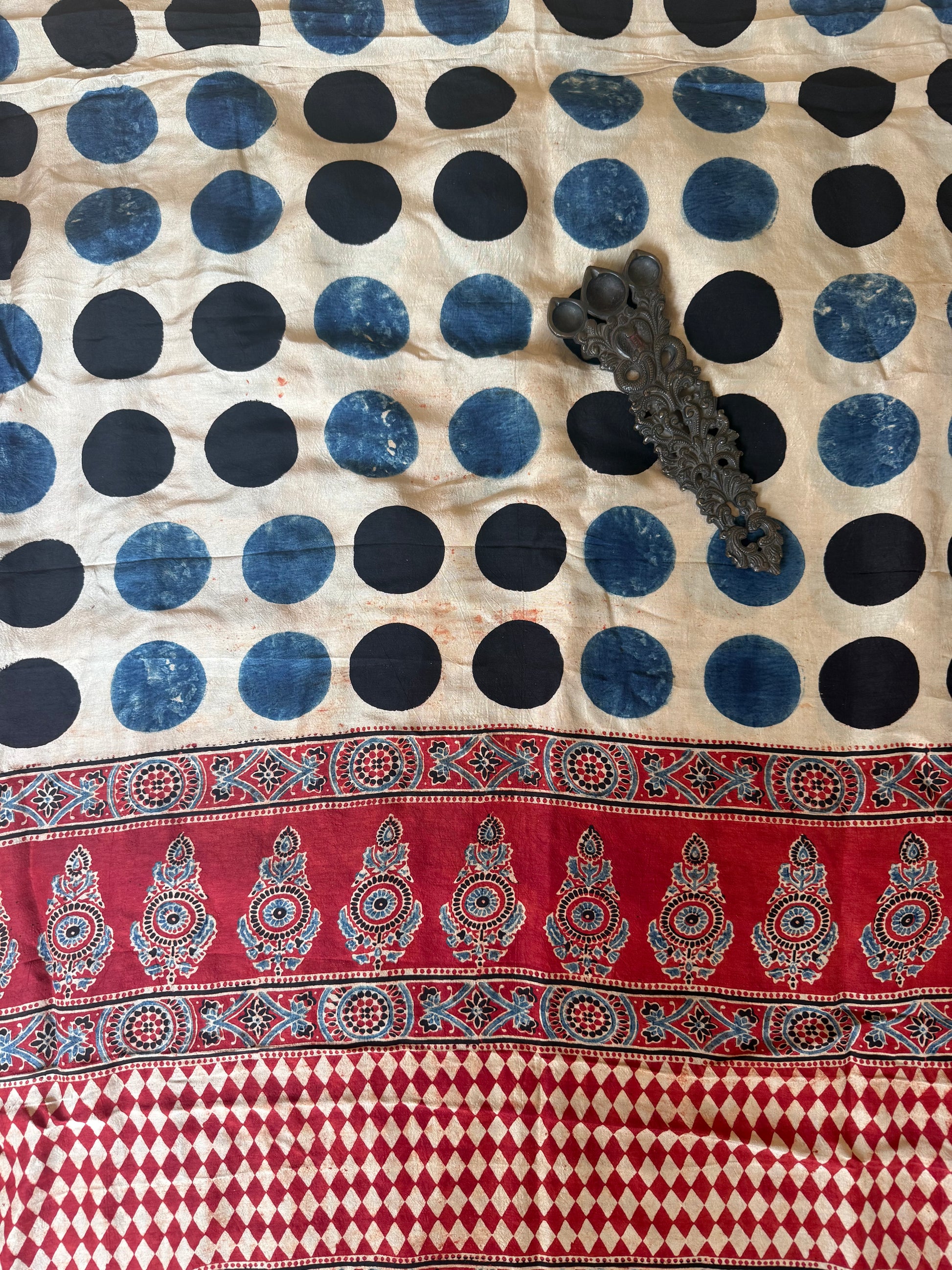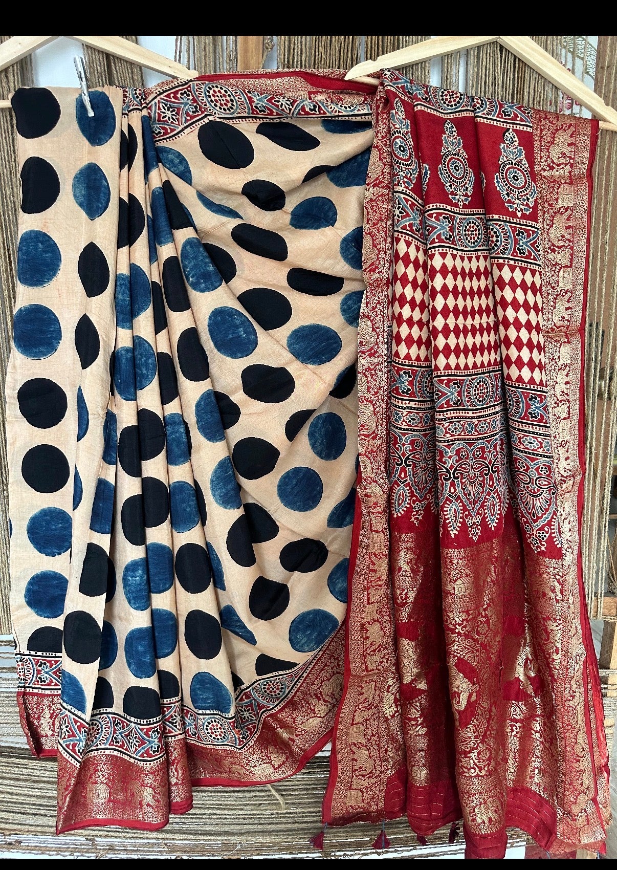 BEIGE POLKA DOT DOLA  SILK AJRAKH ZARI BORDER SARI
