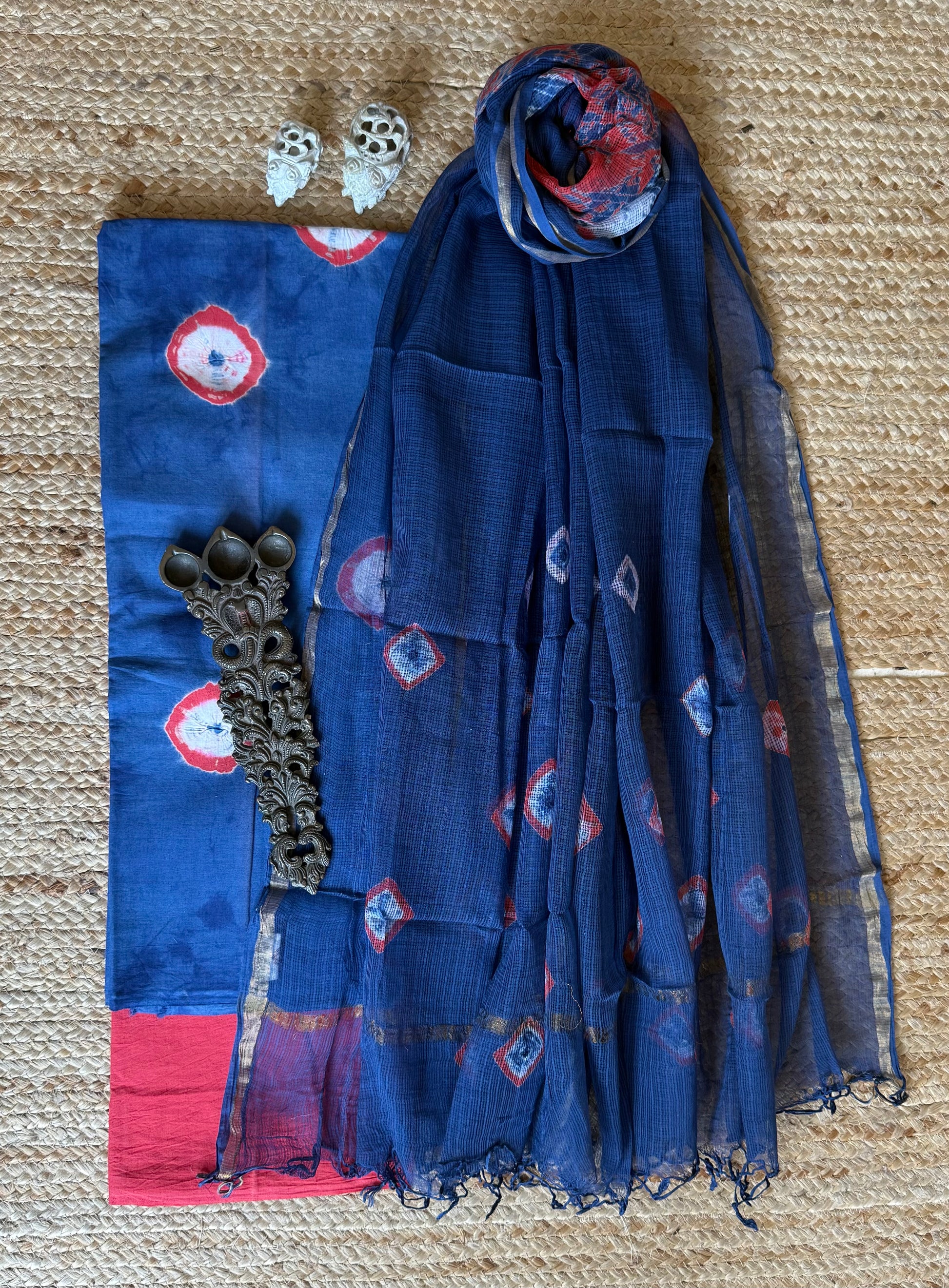 Blue Cotton Kota hand block print with cotton bottom paired with kota dupatta with zari woven border