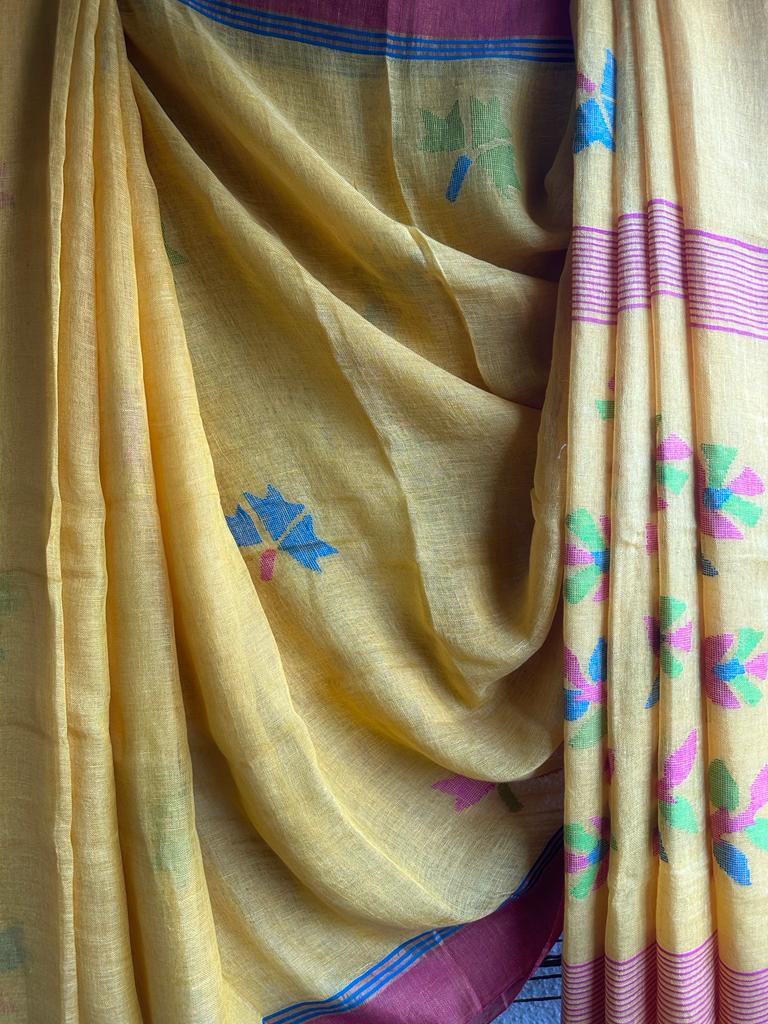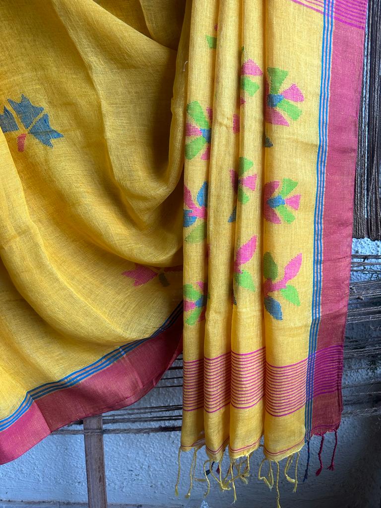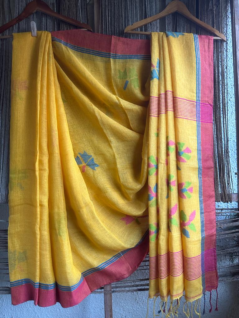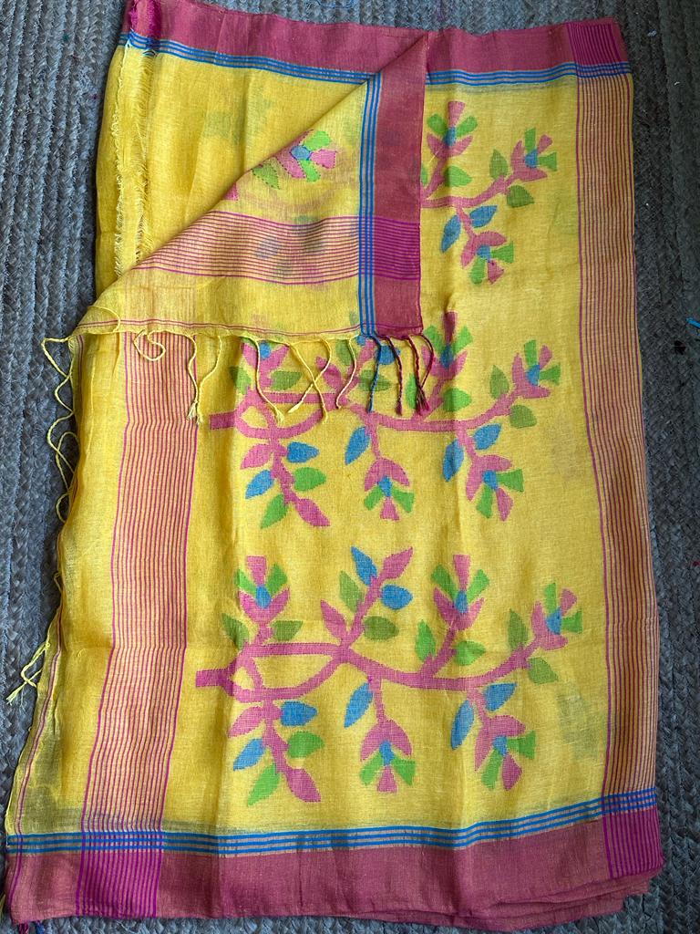 BEAUTIFUL YELLOW WITH RUST RED HAND WOVEN PURE ORGANIC JAMDANI SAREE