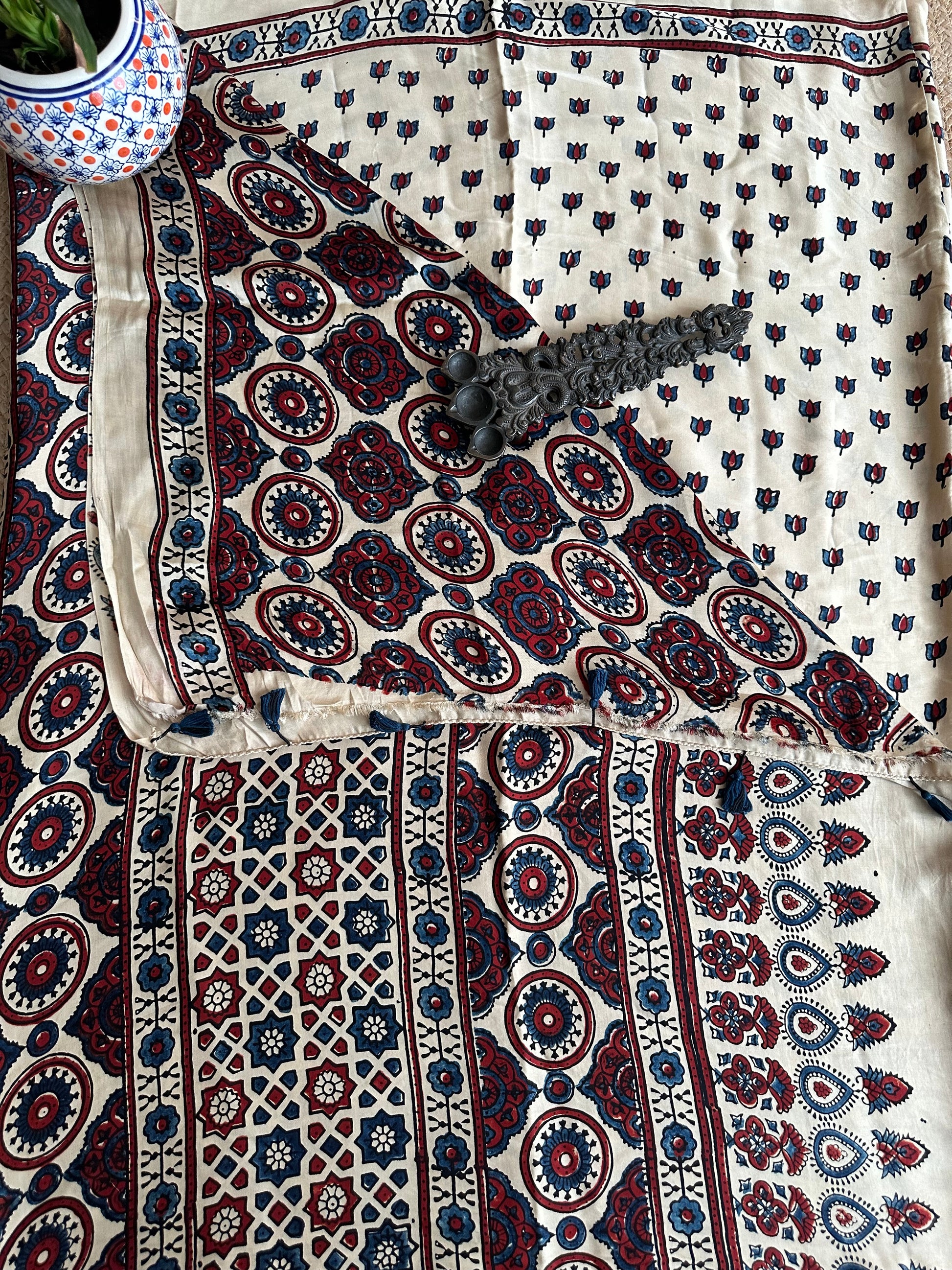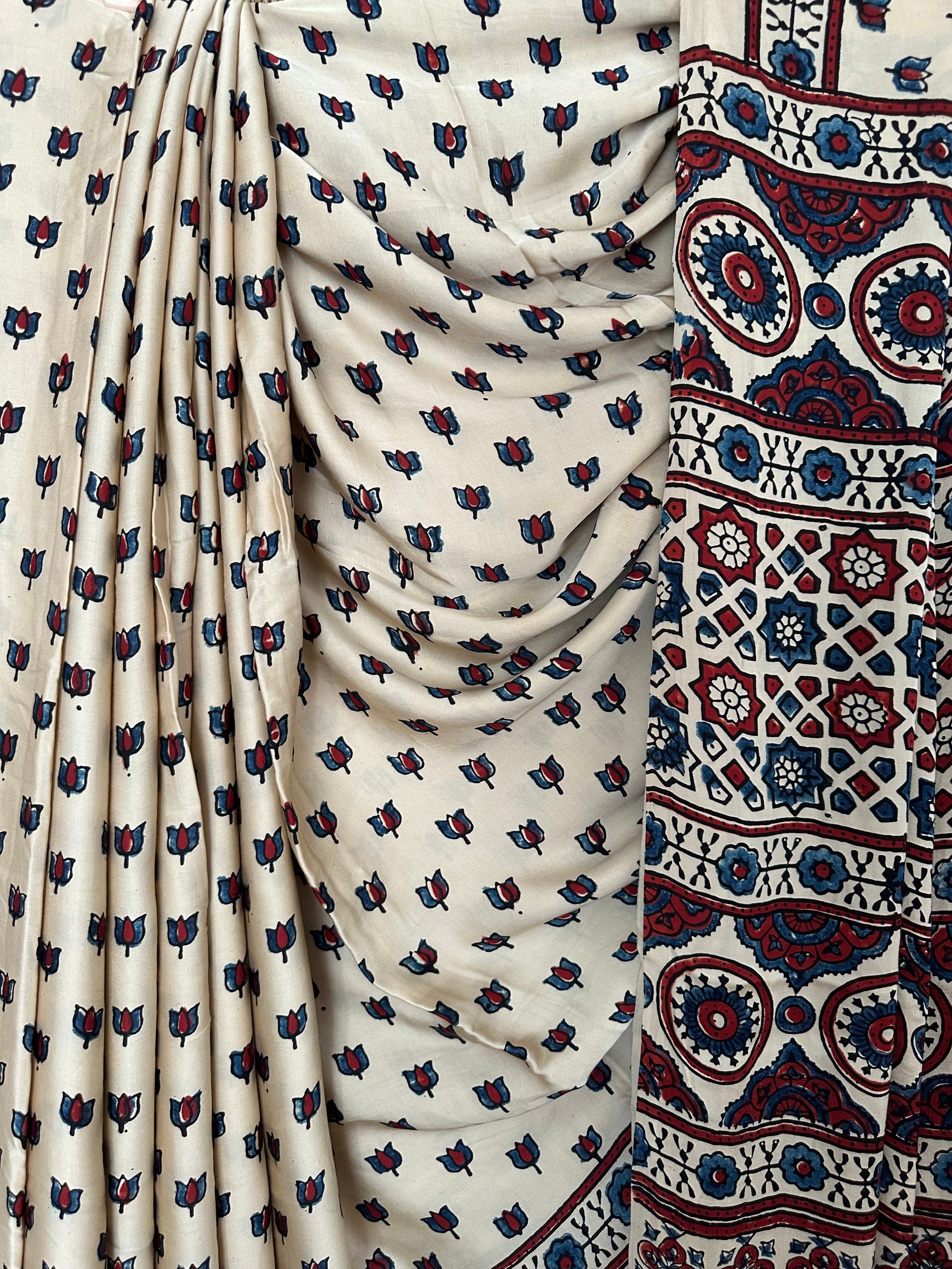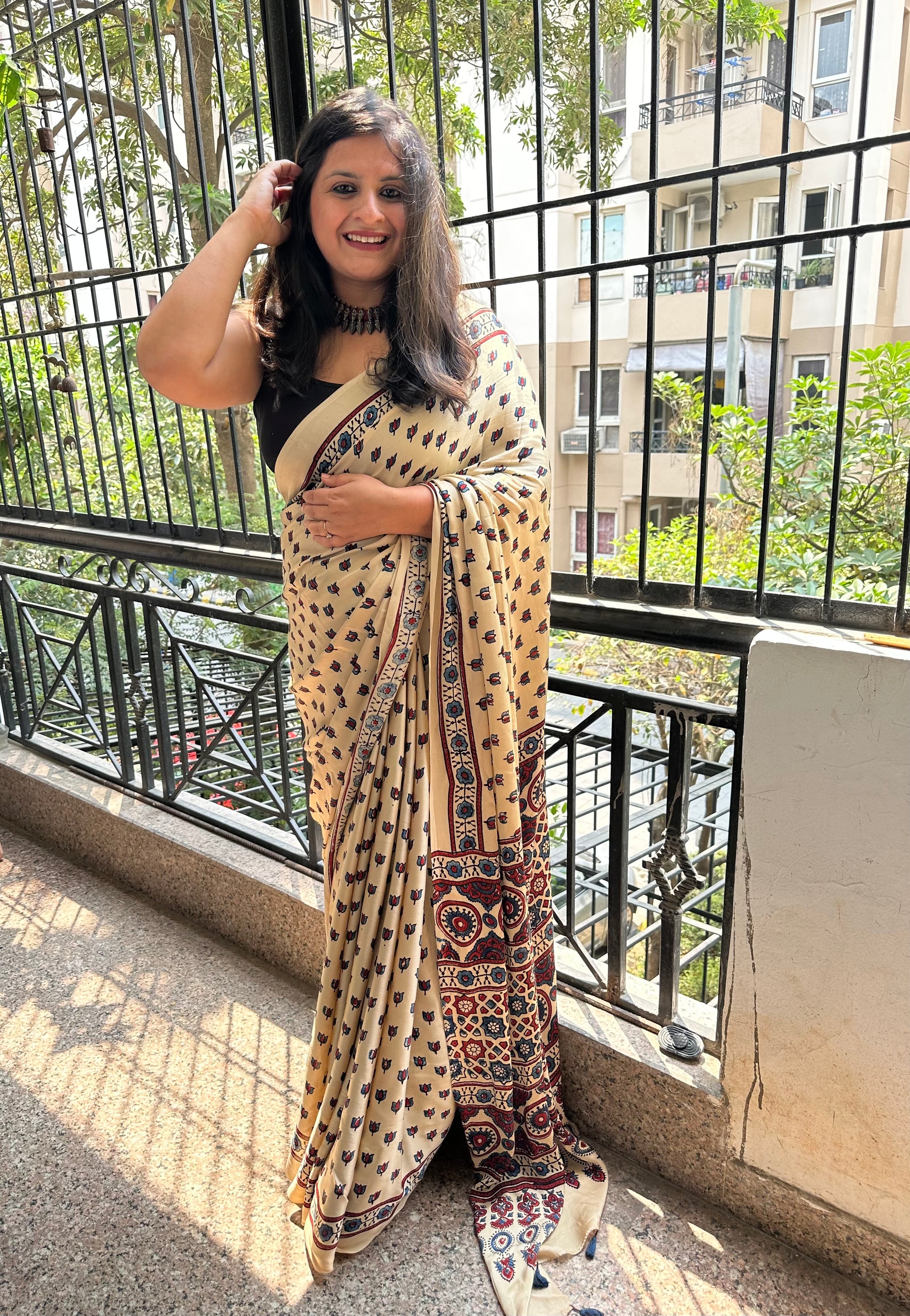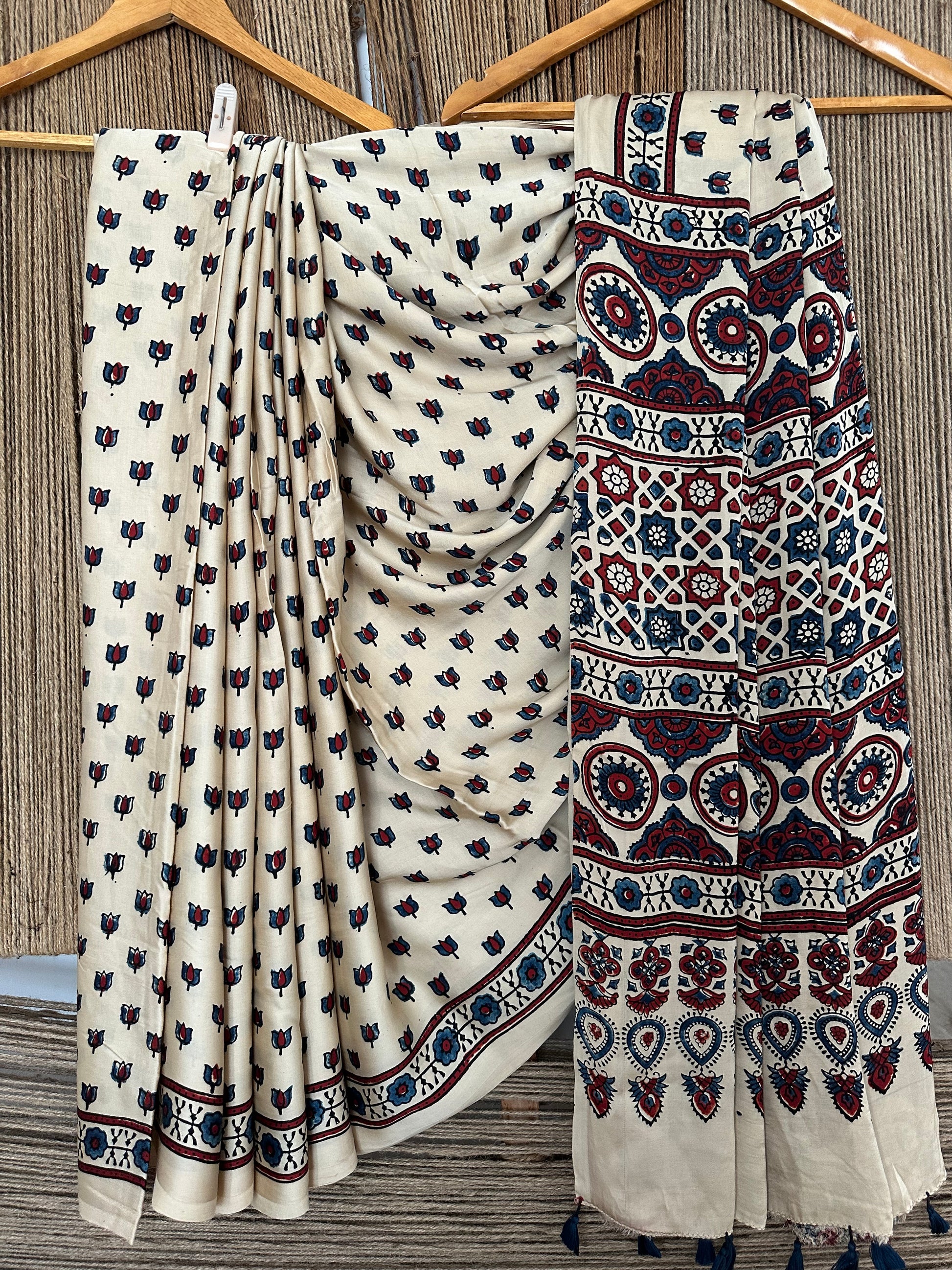 BEIGE LOTUS AJRAKH MODAL SILK SARI WITH BORDER