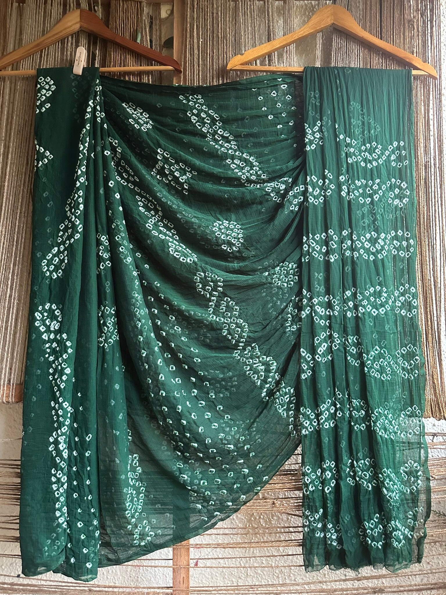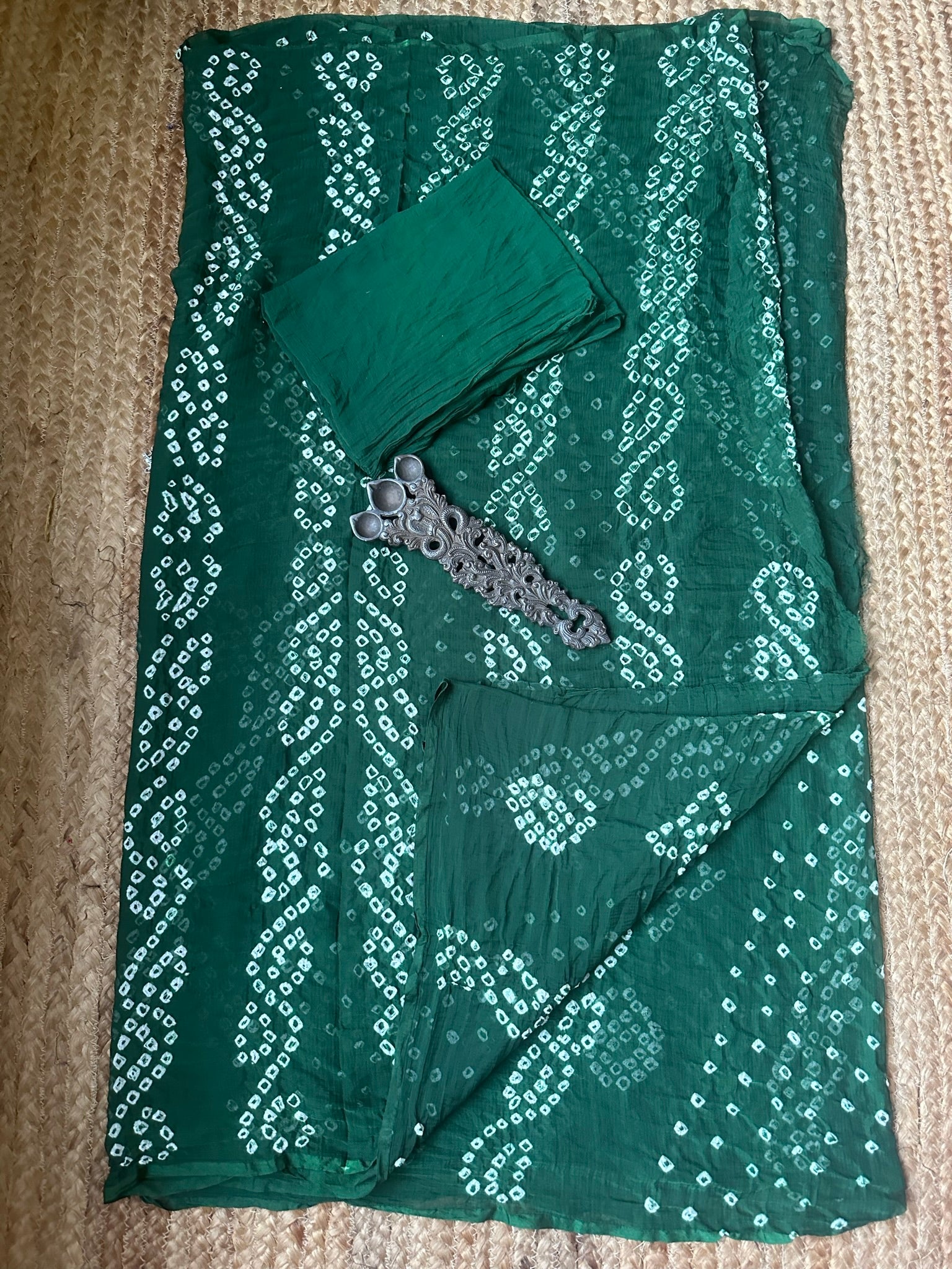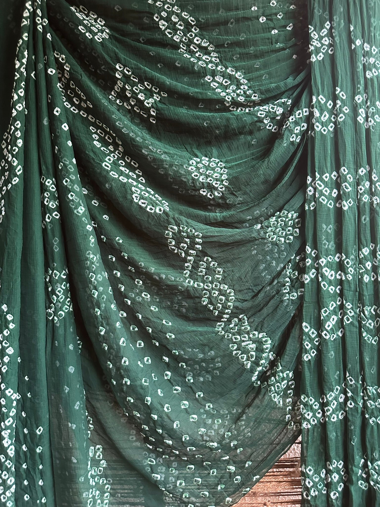 bottle green bandhani handcrafted chiffon sari own contrast blouse piece (80 cms)