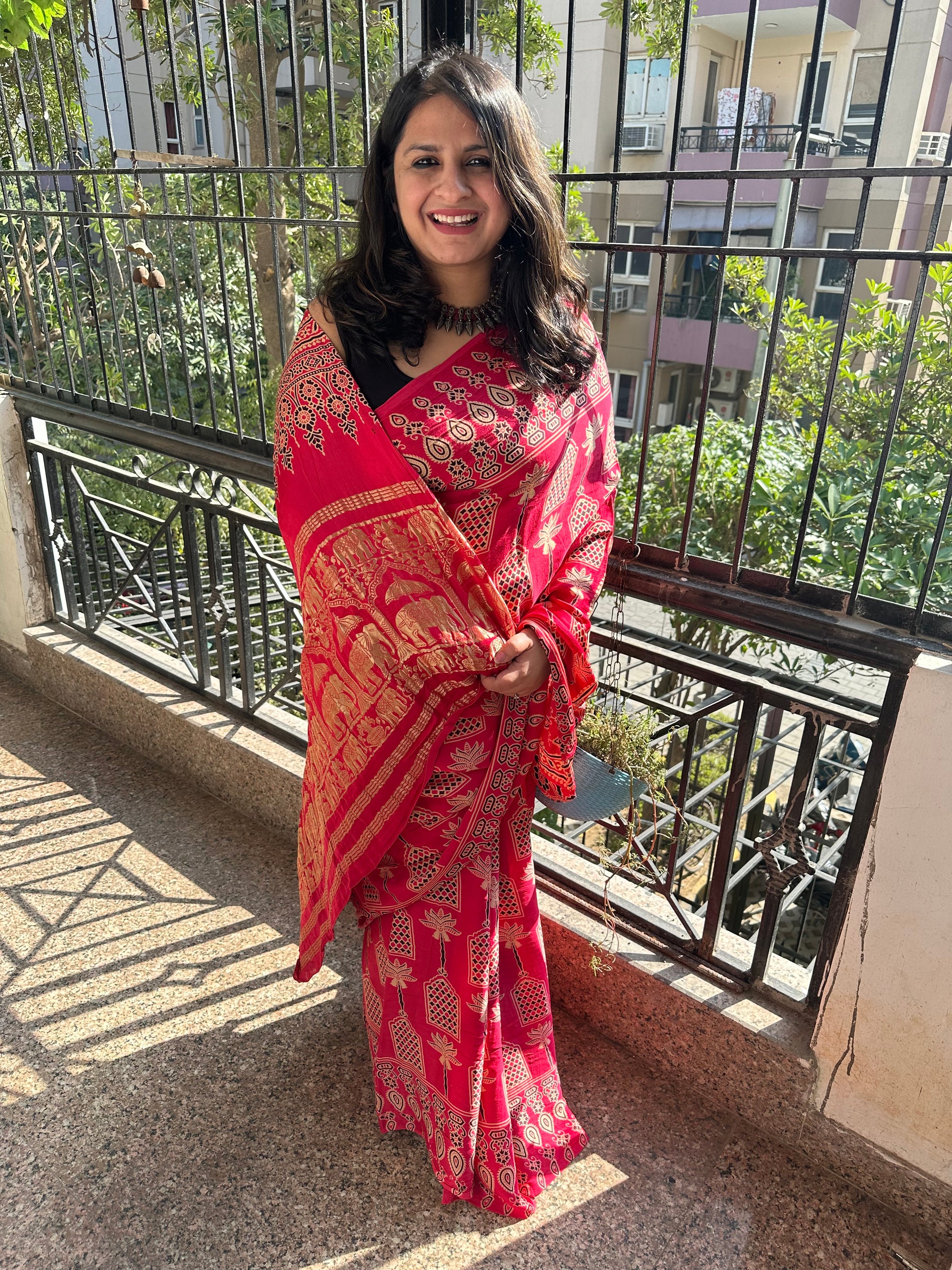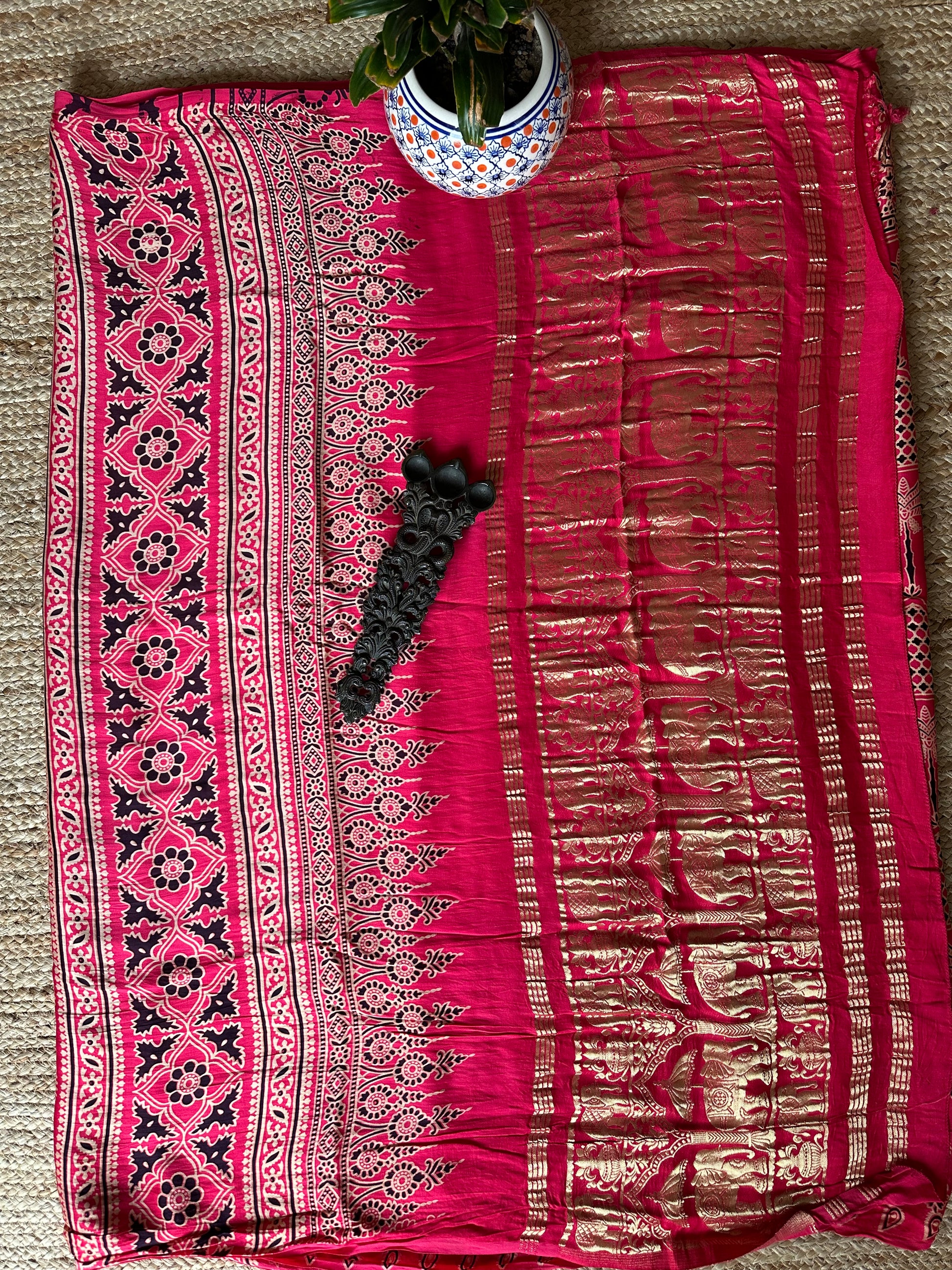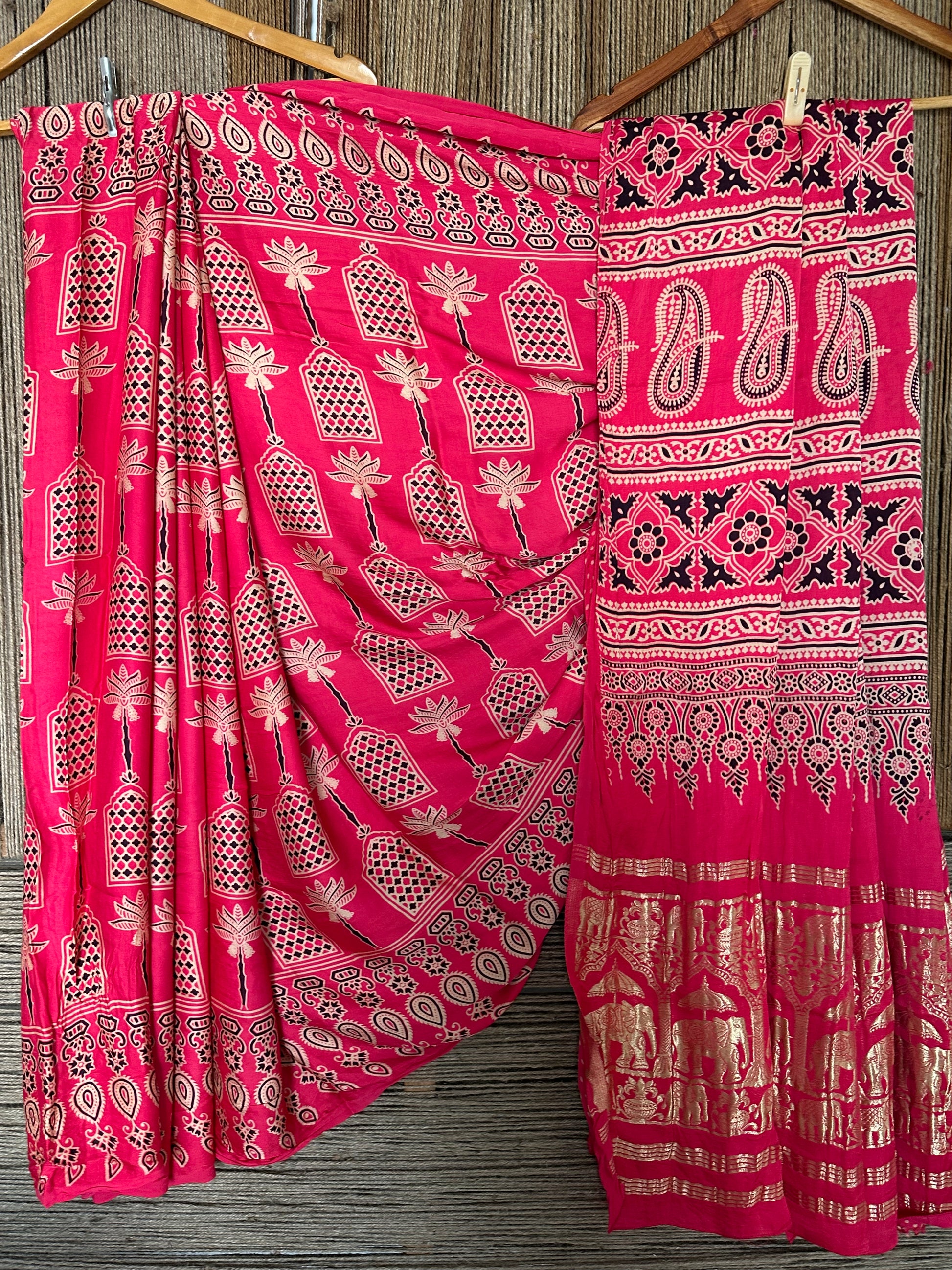 CANDY PINK AJRAKH PRINT MODAL SILK SARI WITH ZARI BORDER