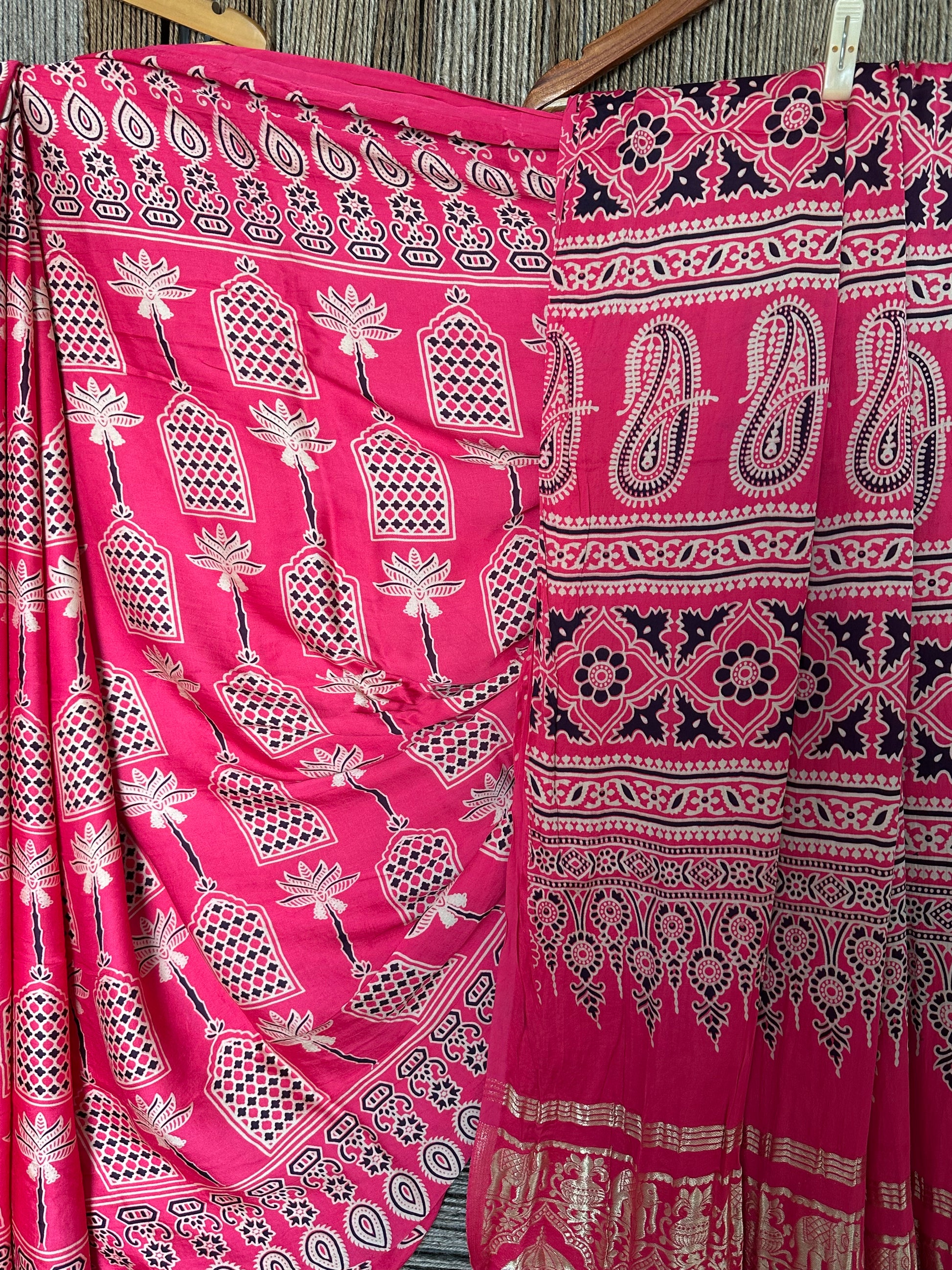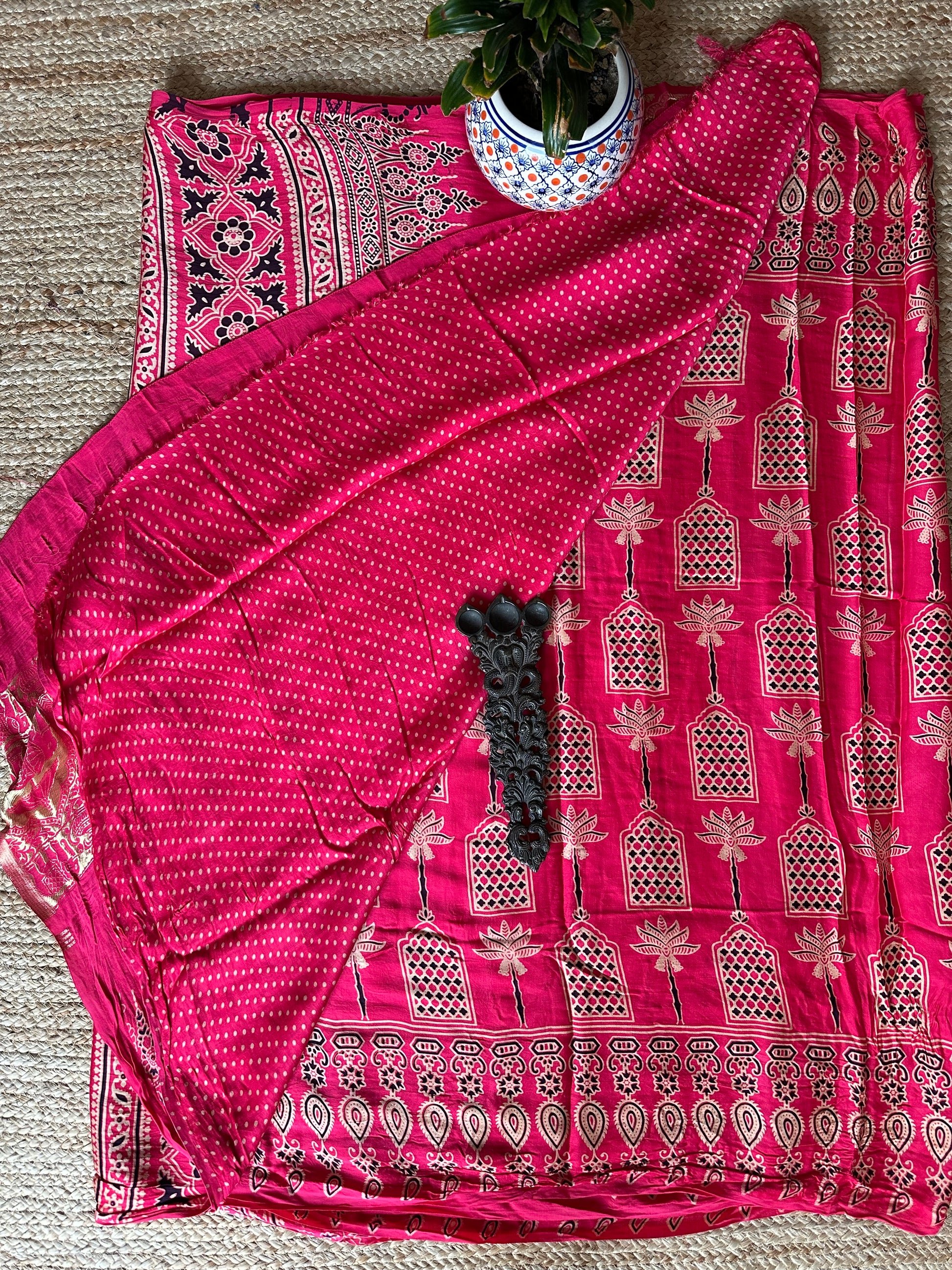 CANDY PINK  AJRAKH PRINT  MODAL SILK SARI WITH ZARI BORDER