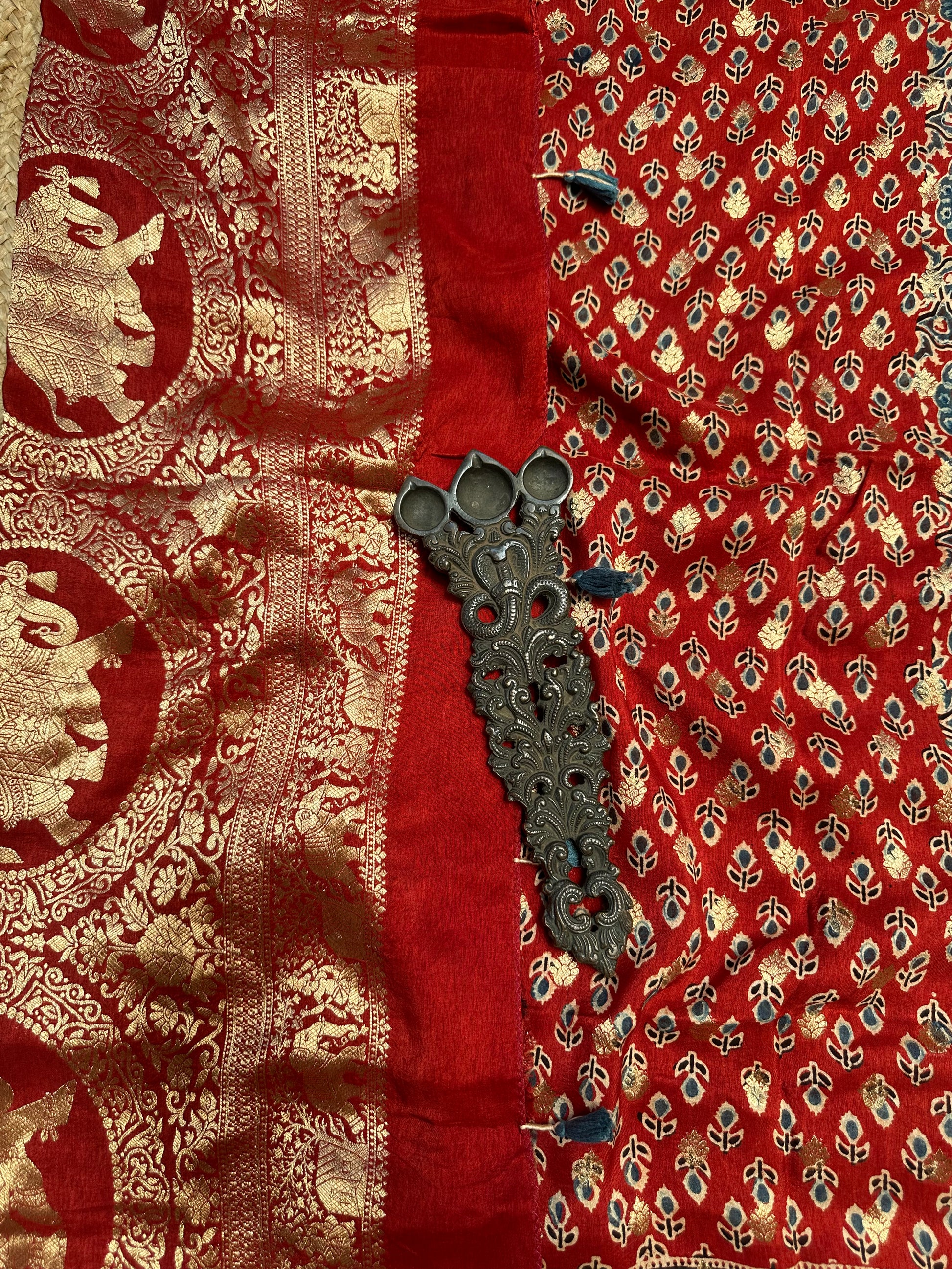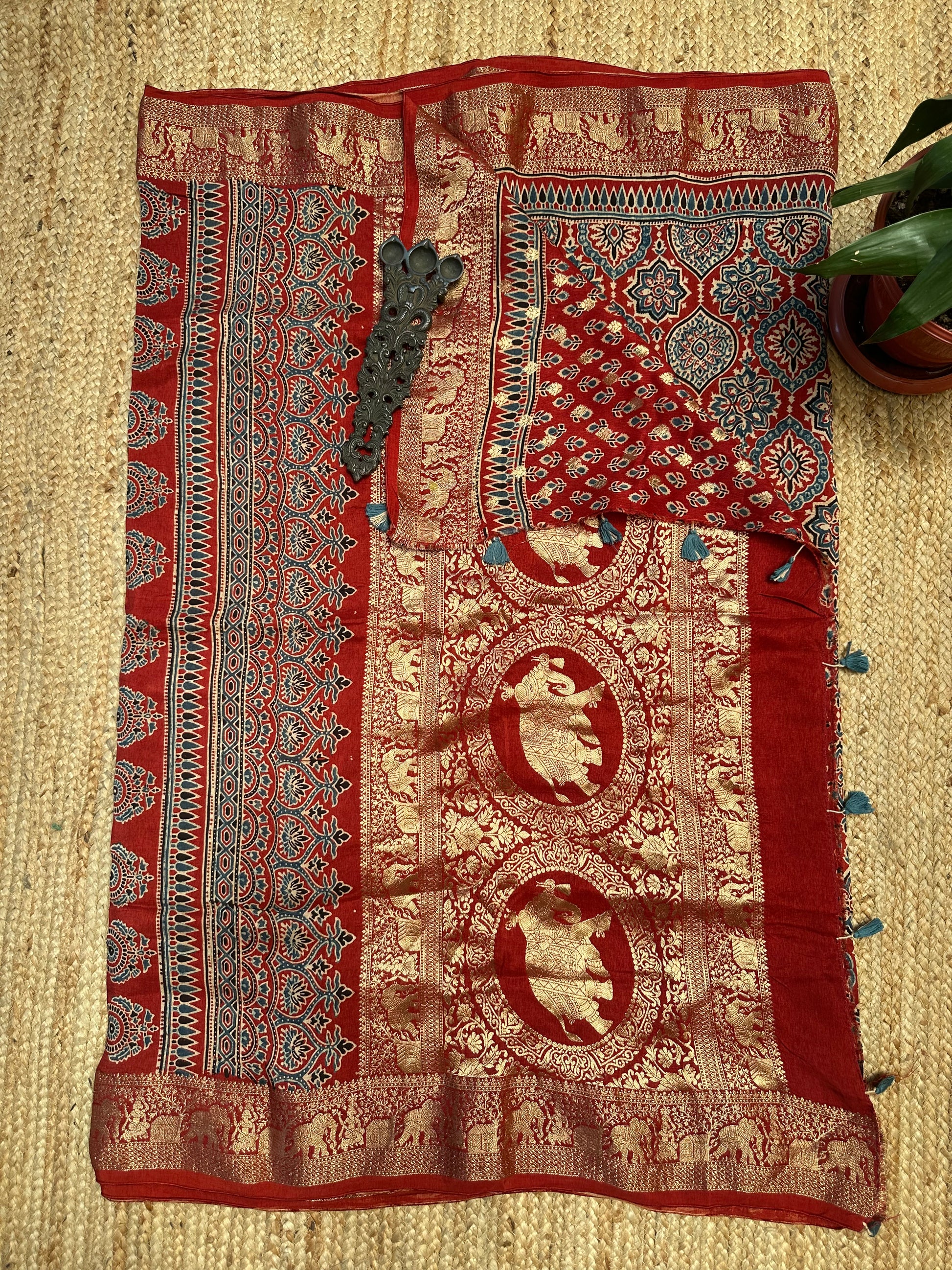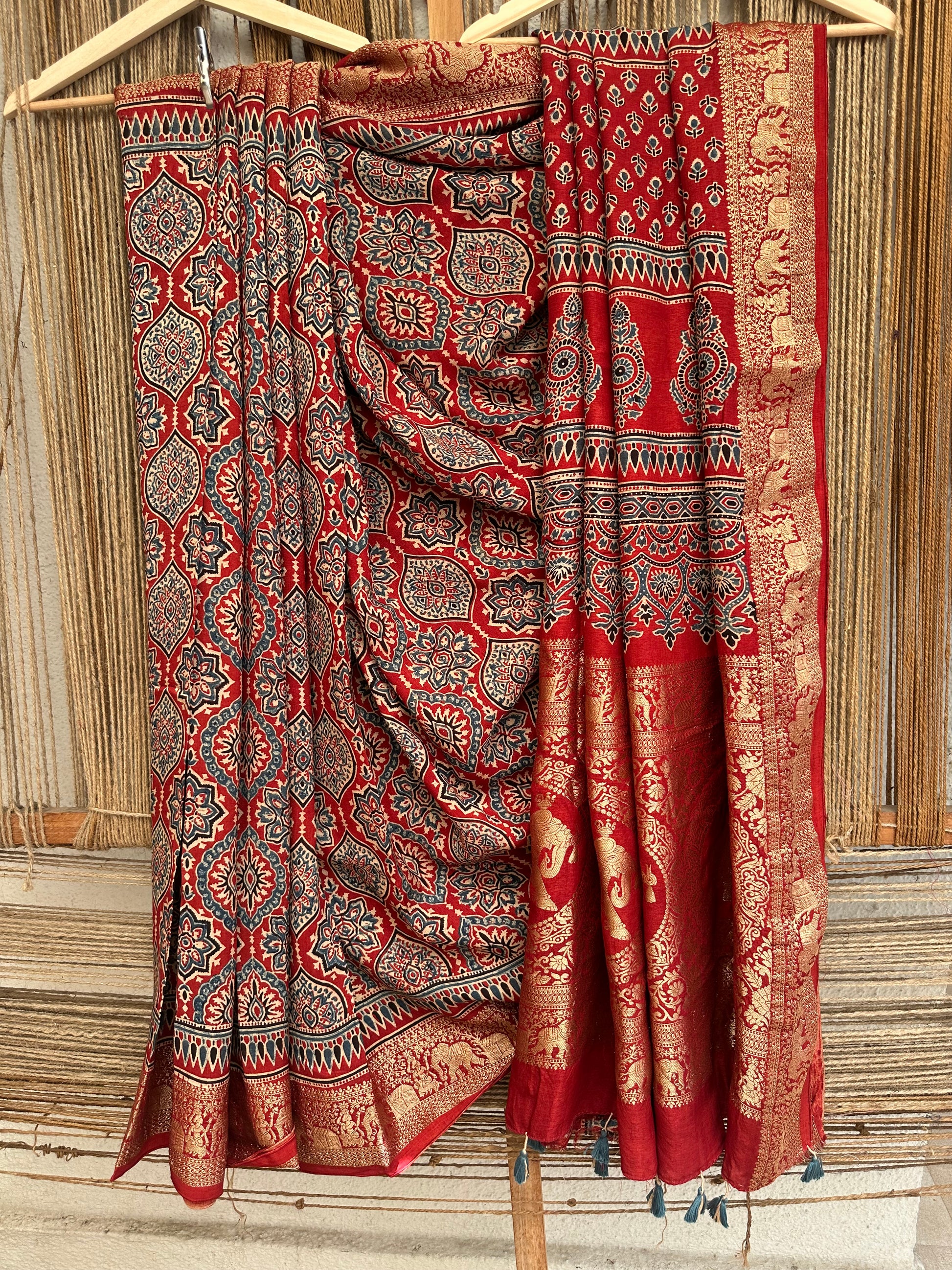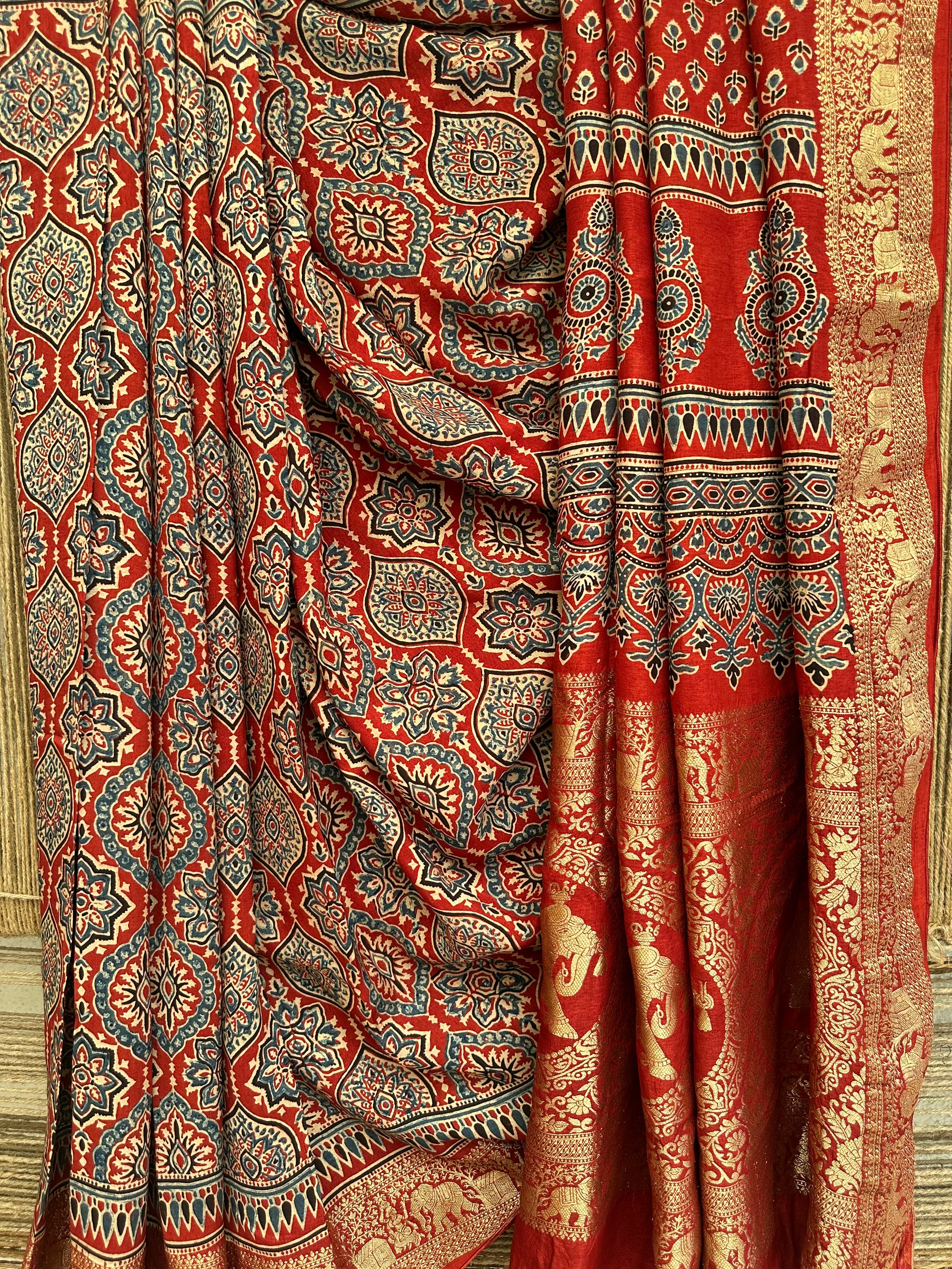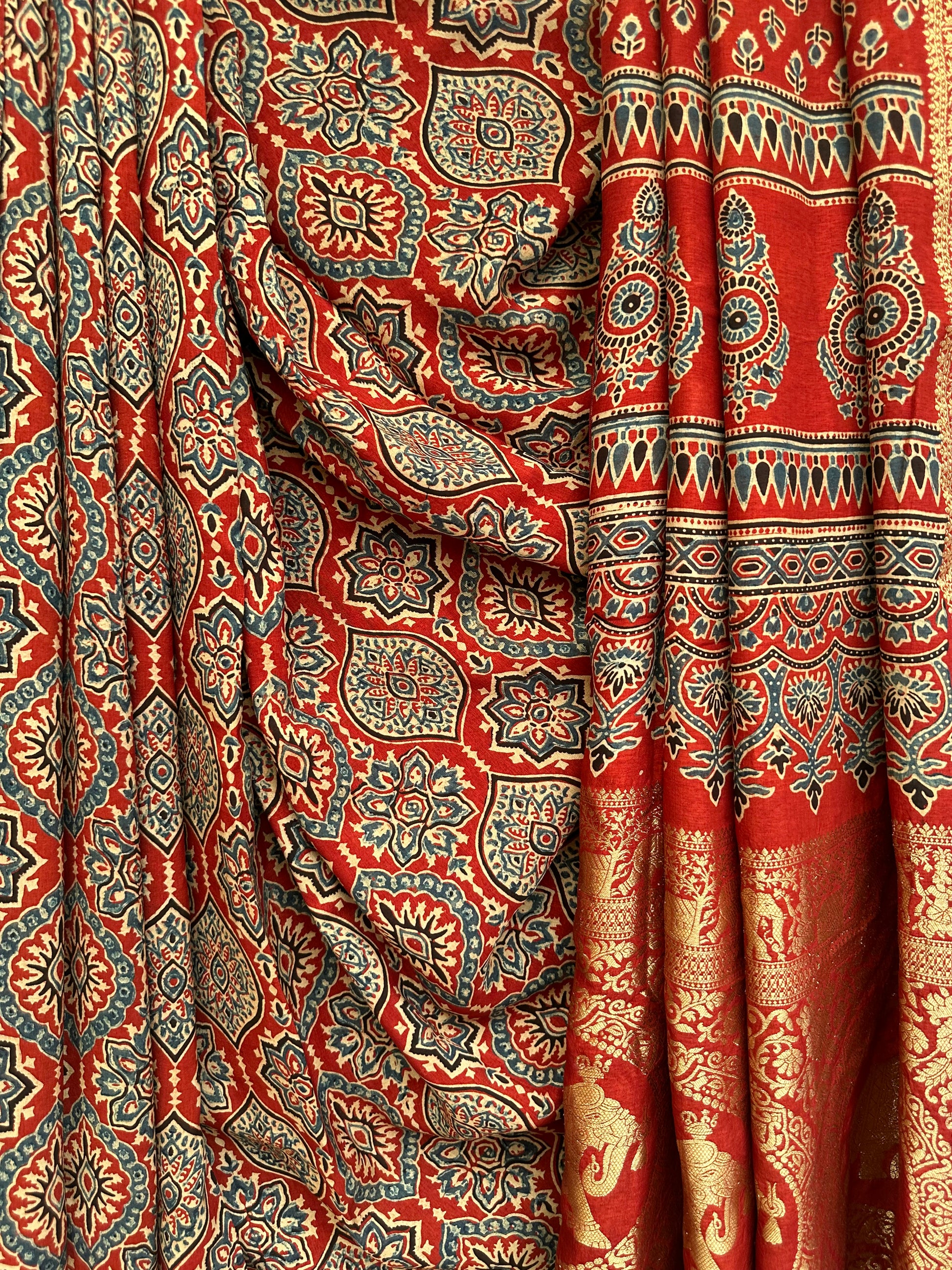RED DOLA SILK AJRAKH ZARI BORDER SARI