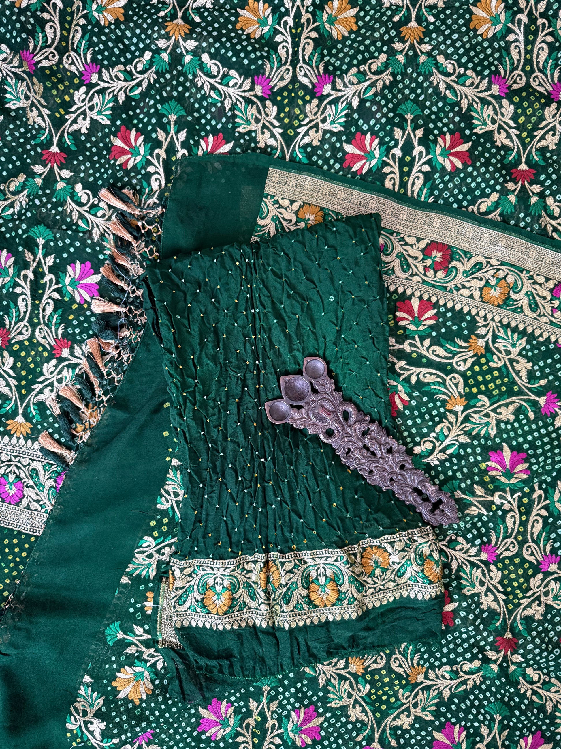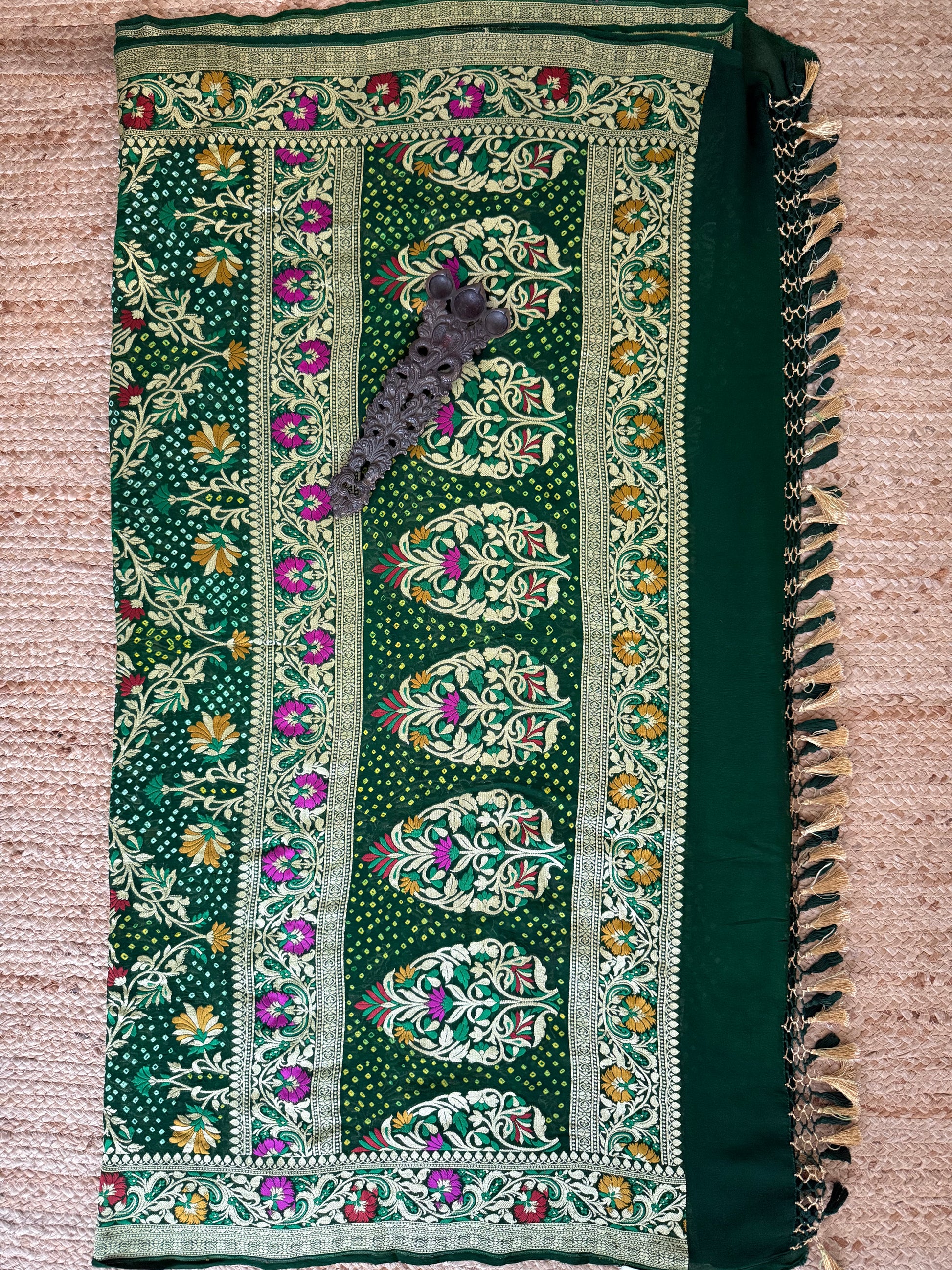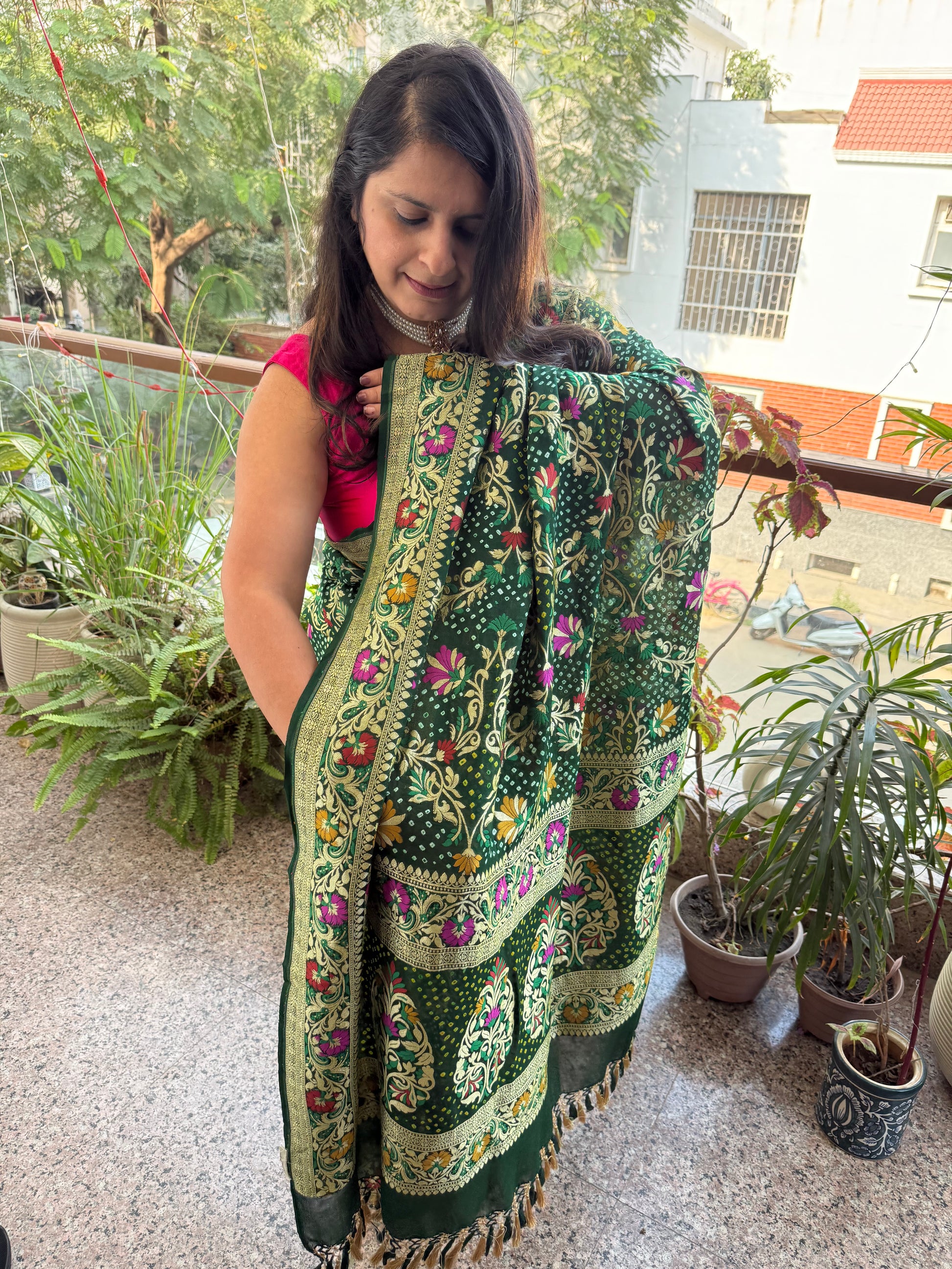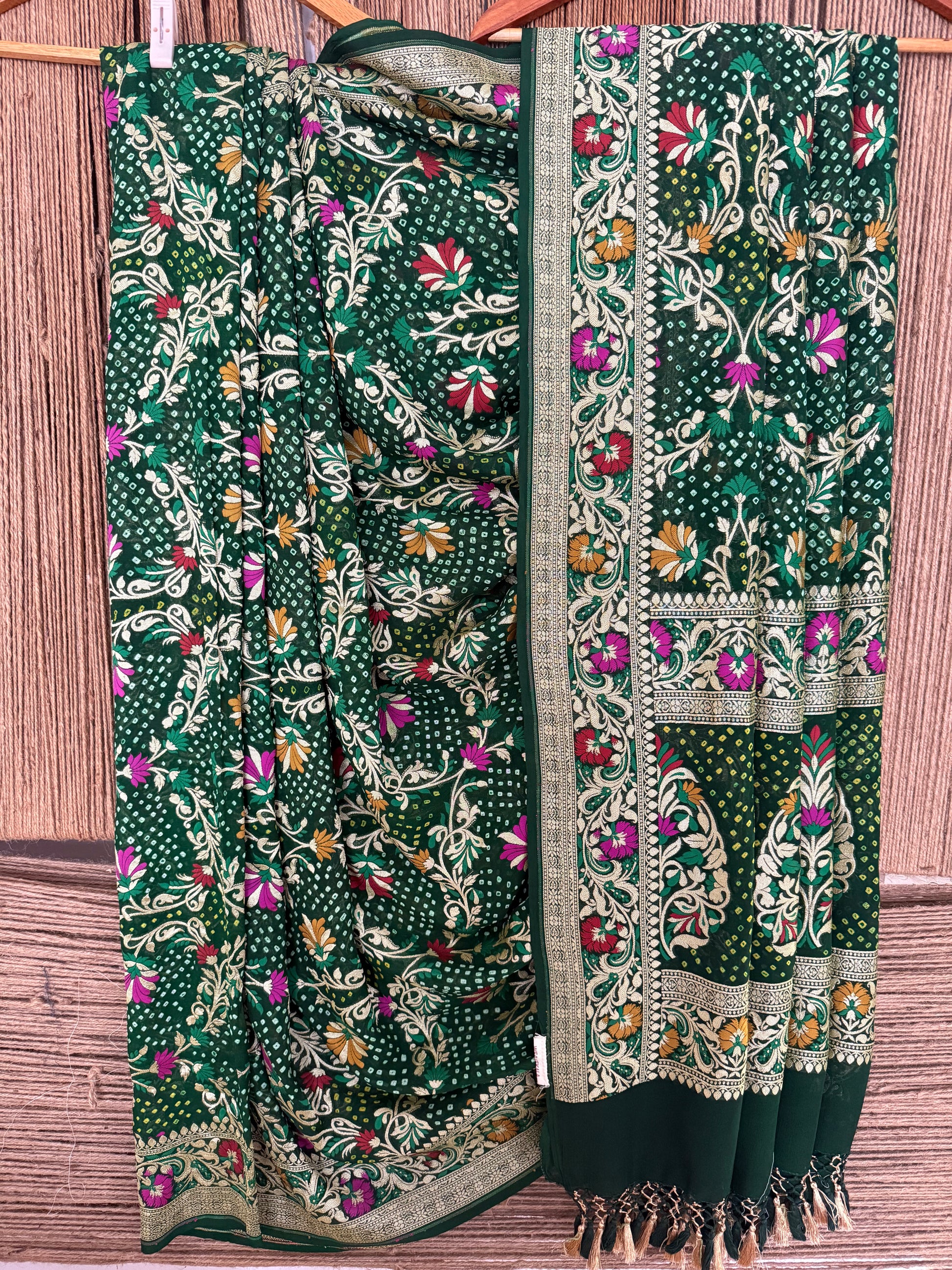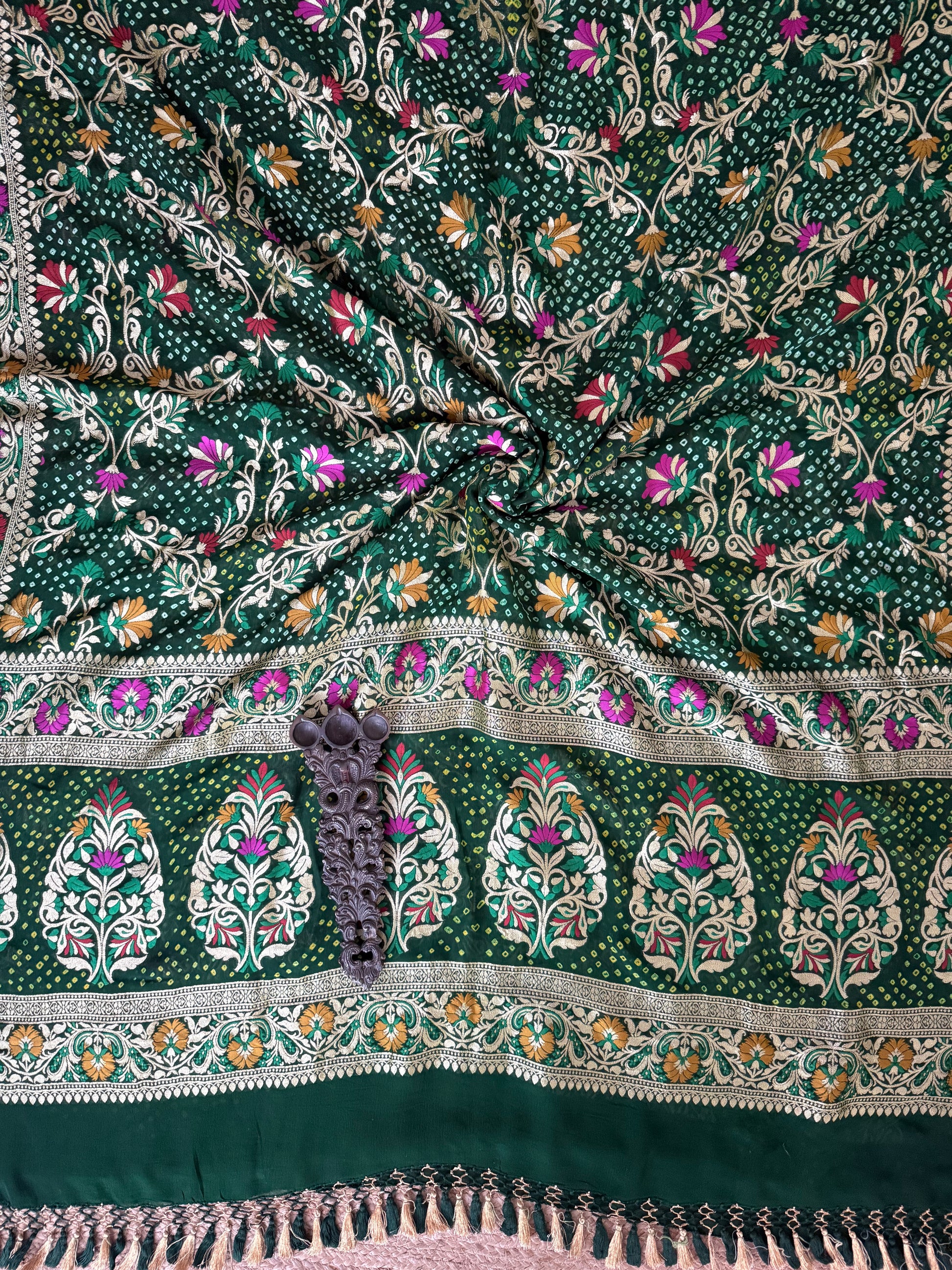 GREEN Handwoven Rai Bareek Bandhani Saree Meenakari Jaal with Khaddi Georgette Mks-13