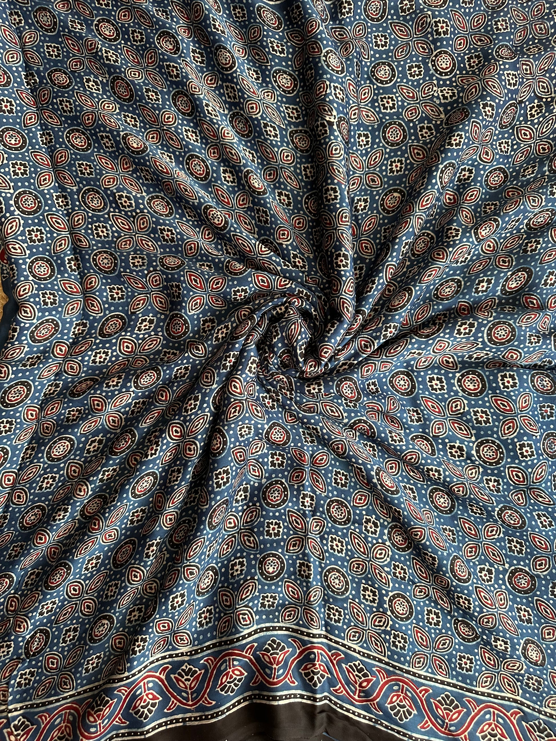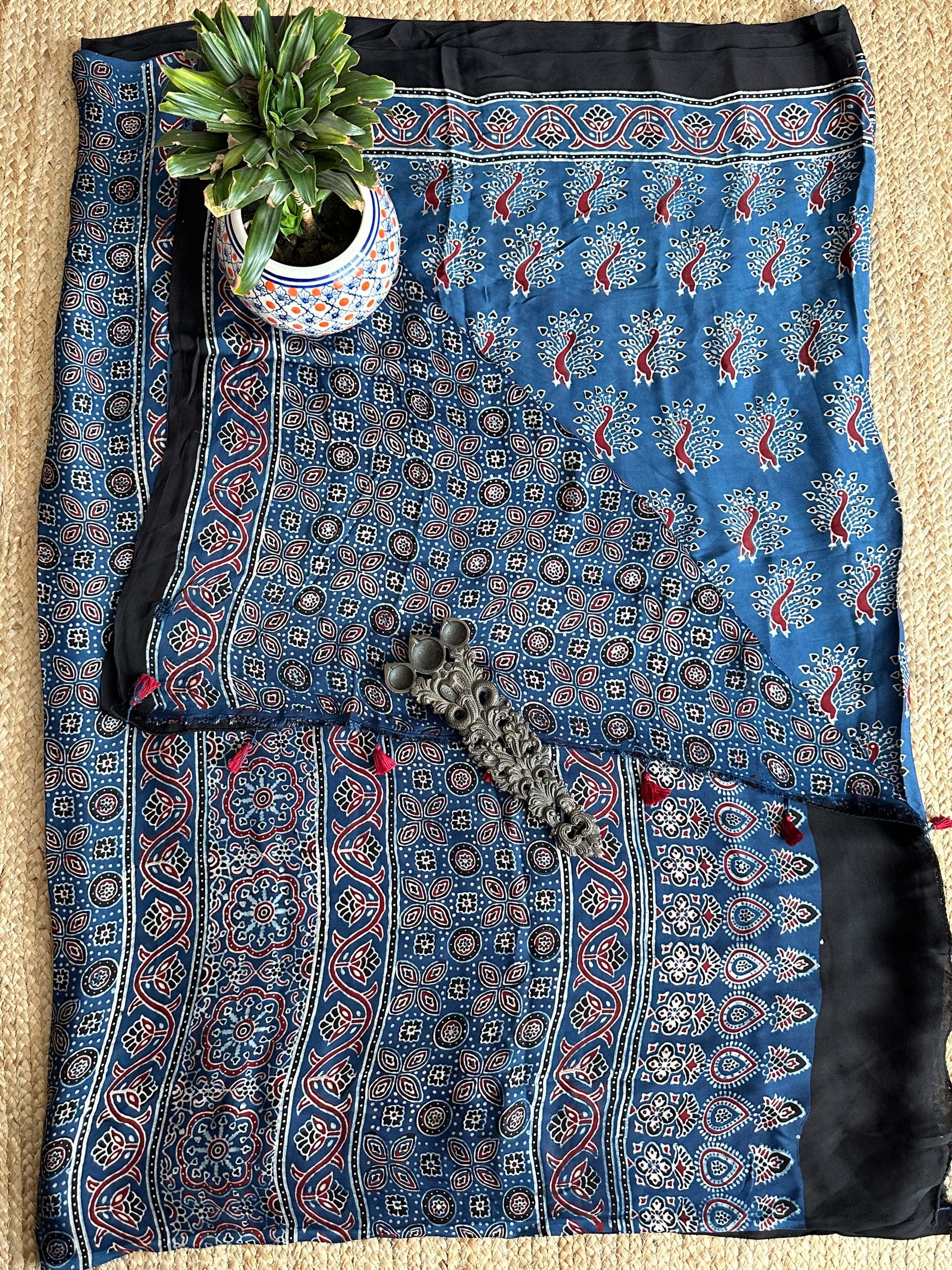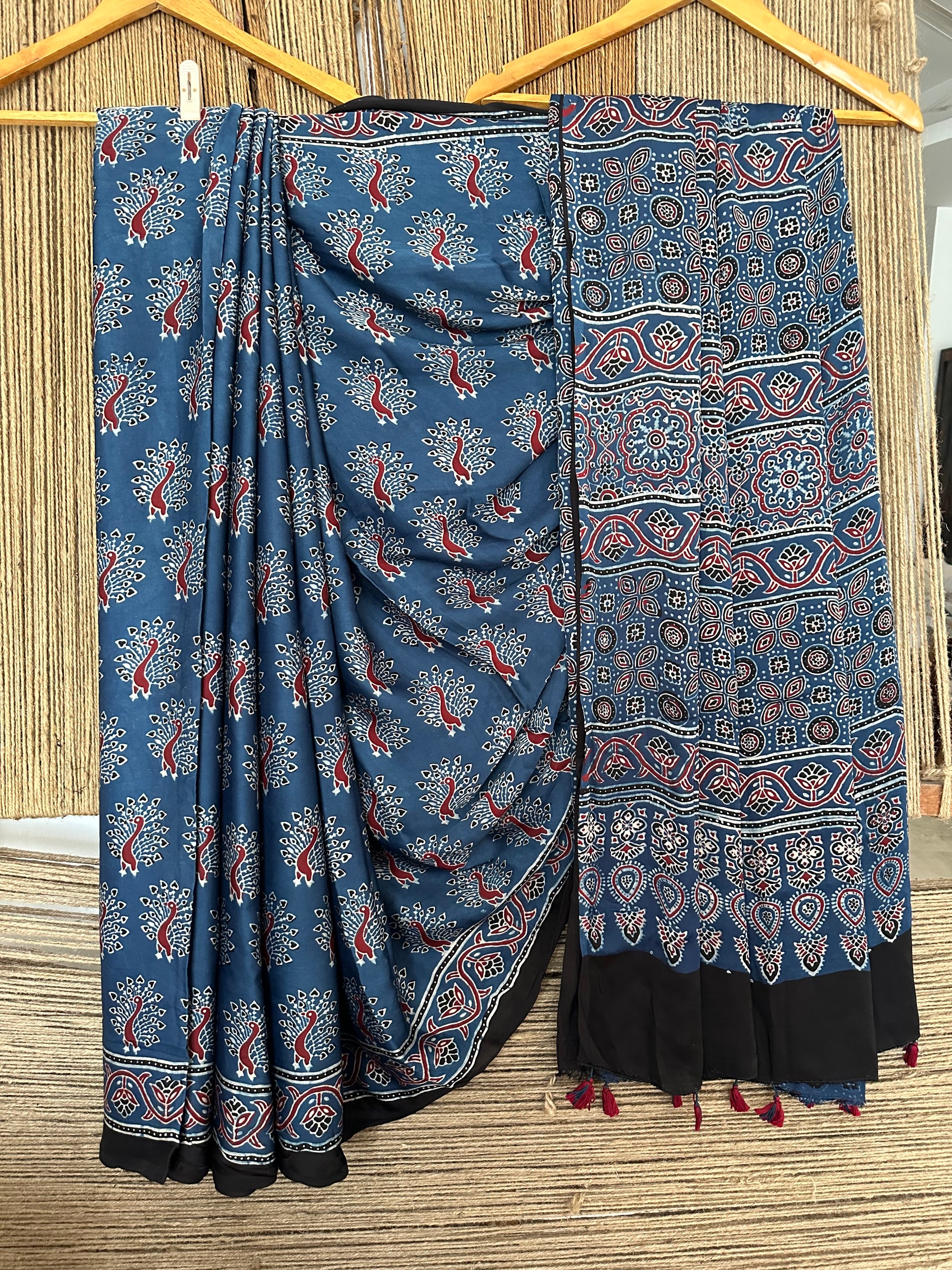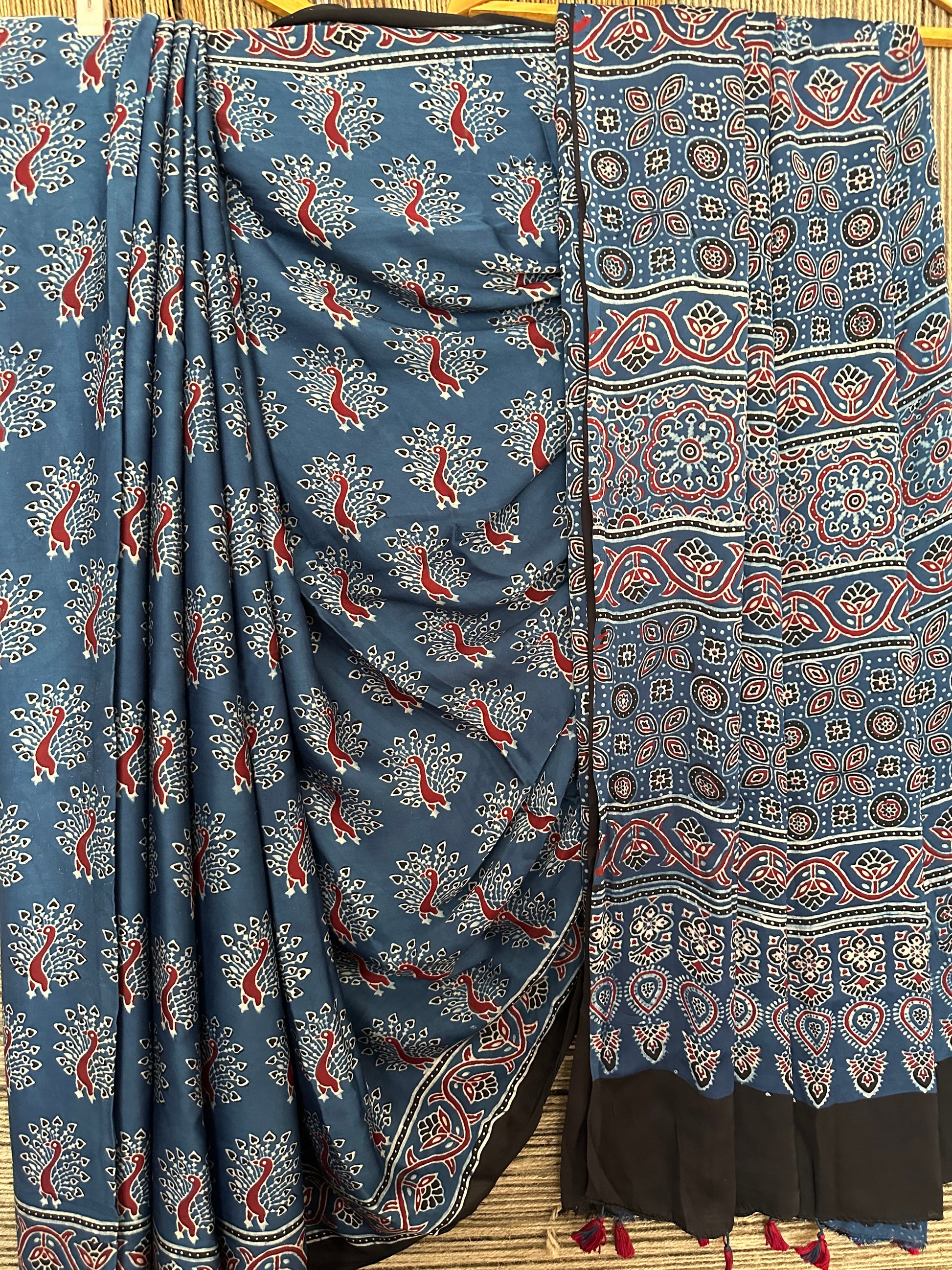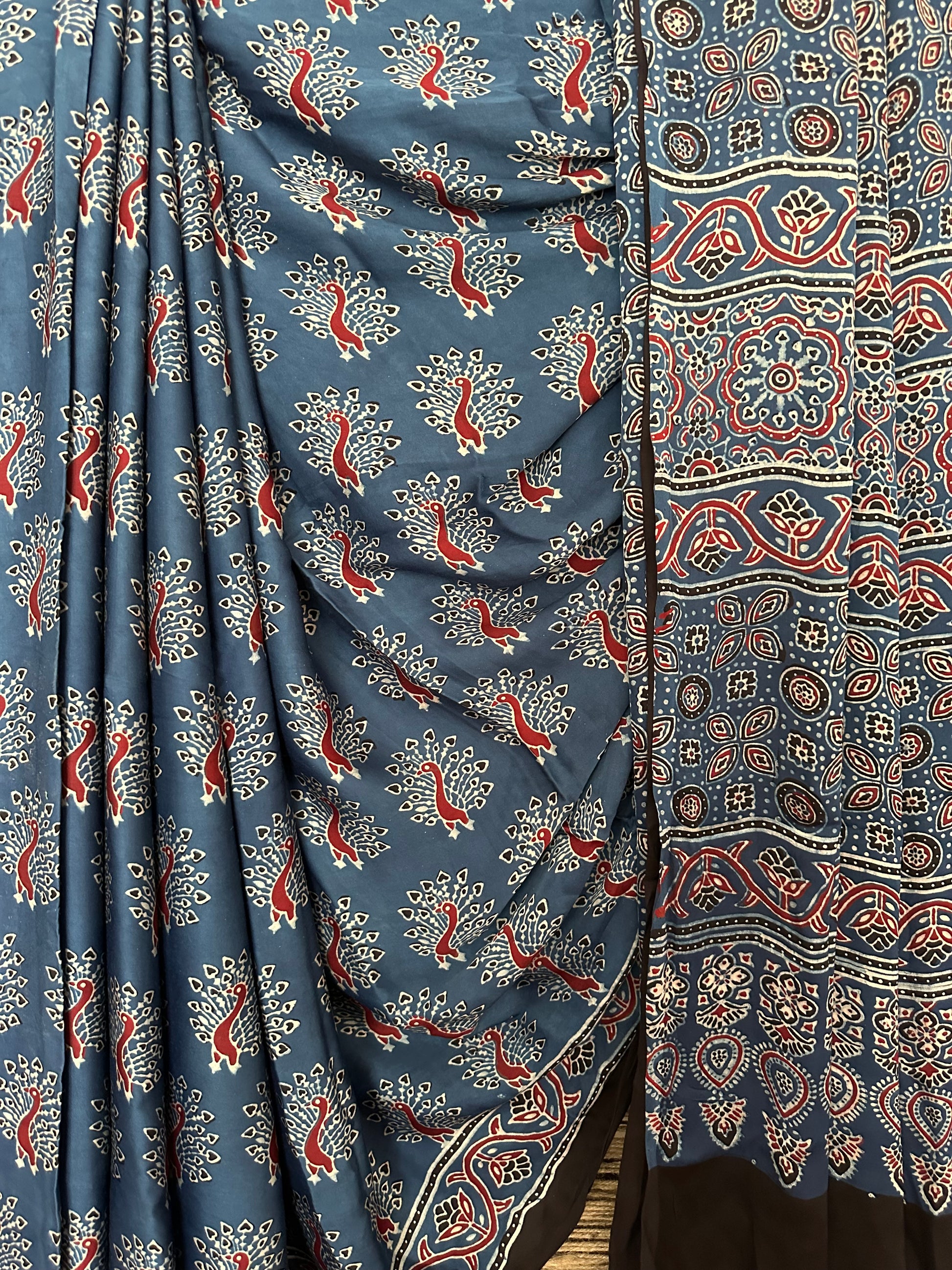 BLUE PEACOCK AJRAKH MODAL SILK SARI WITH BORDER