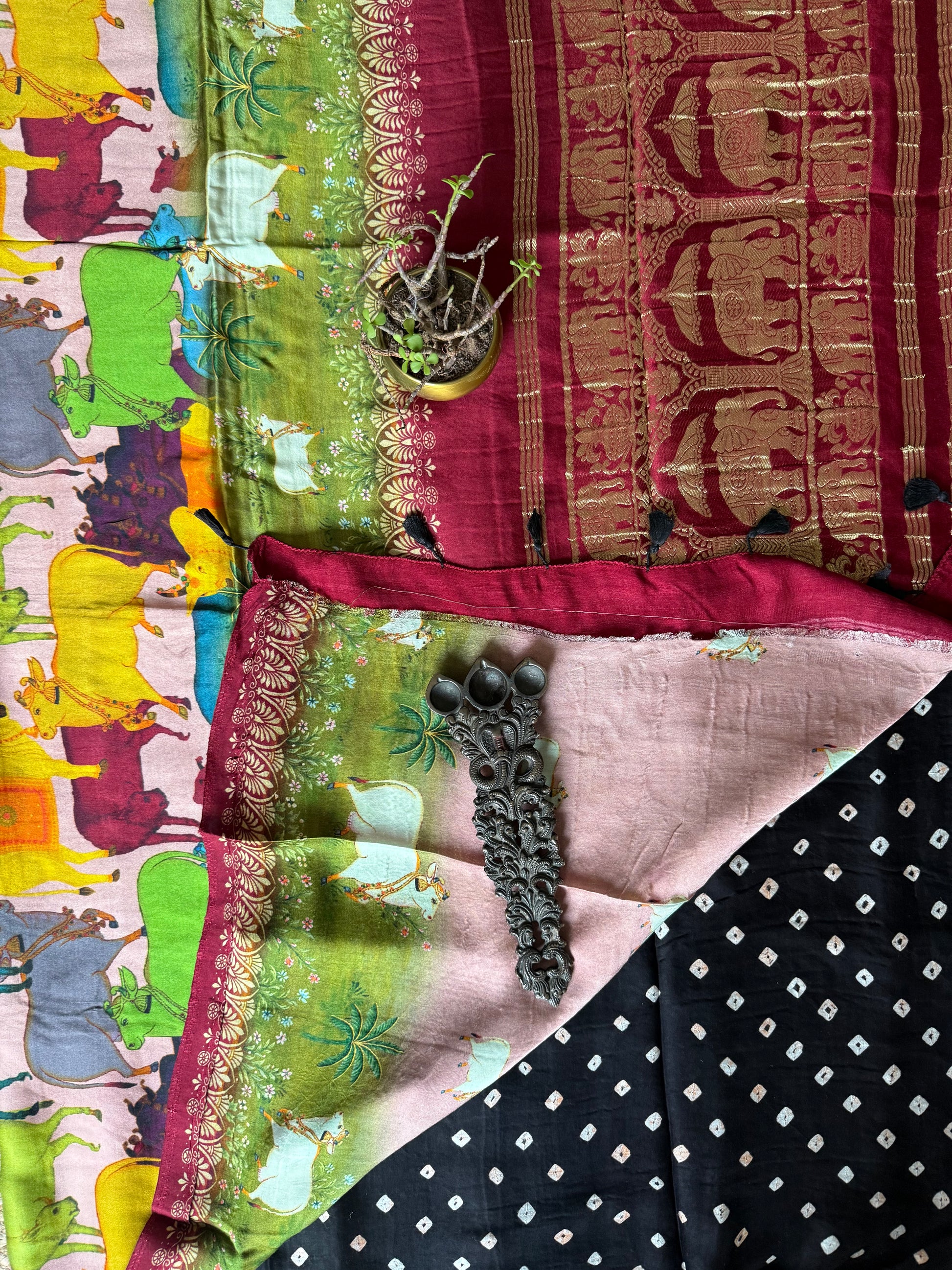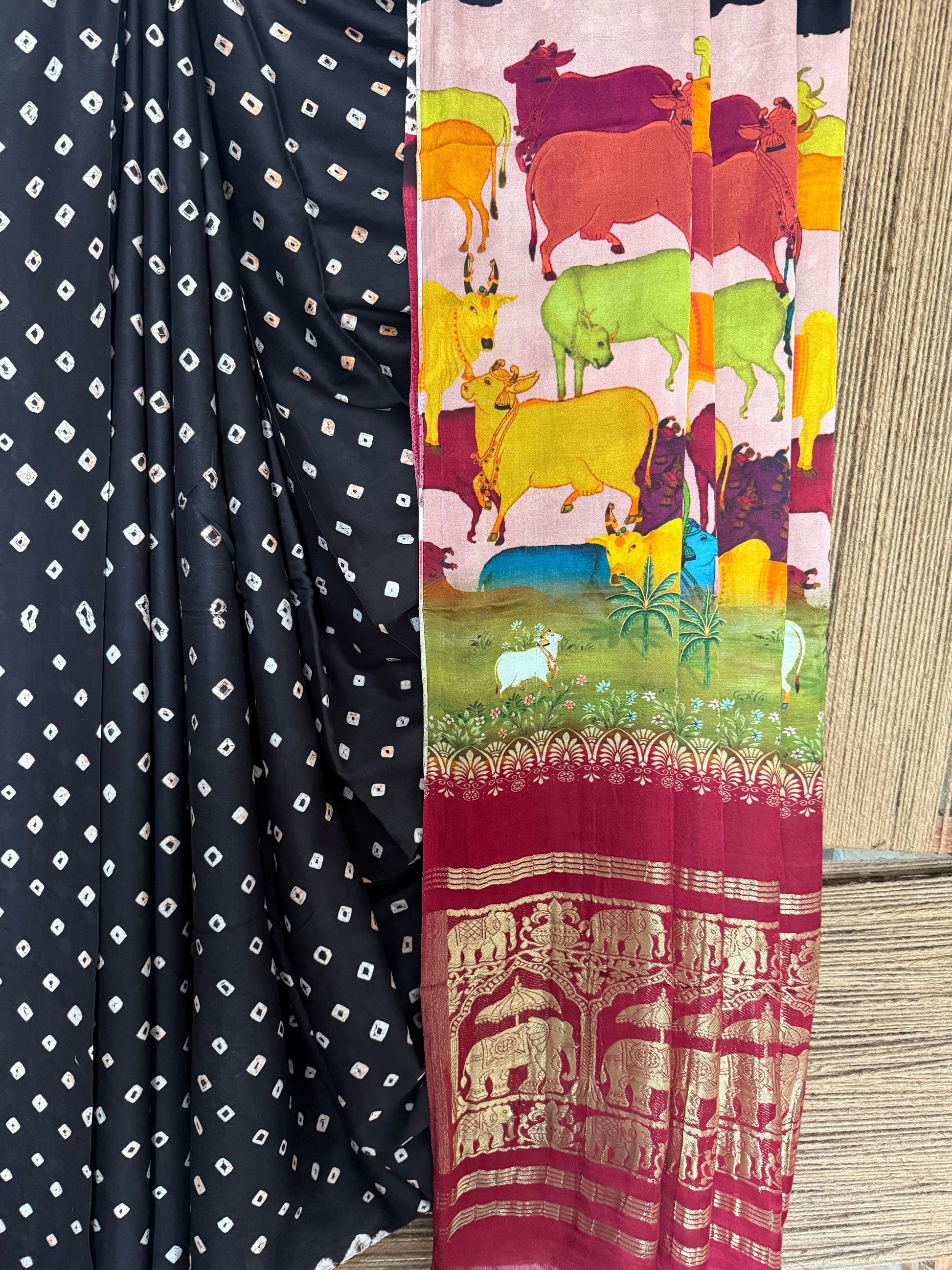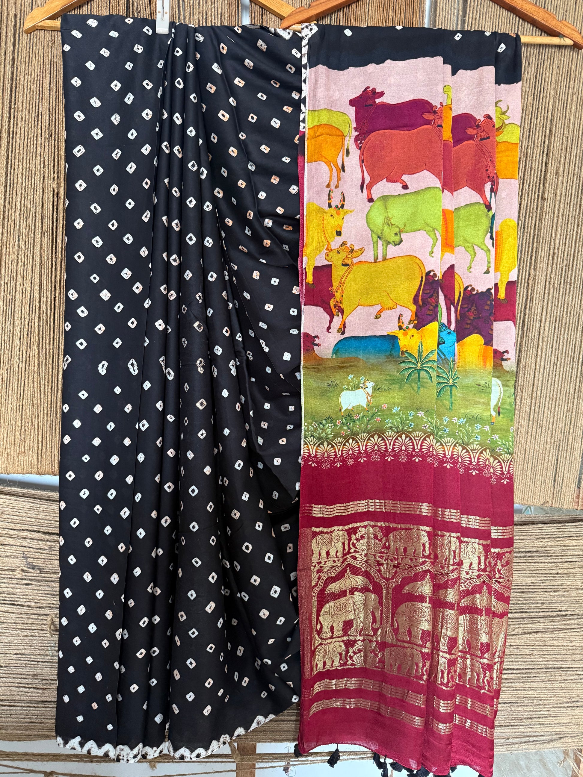BLACK & MAROON MODAL SILK BANDHANI WITH PICHWAI PRINT NAKSHI ZARI WOVEN SARI WITH BLOUSE PIECE