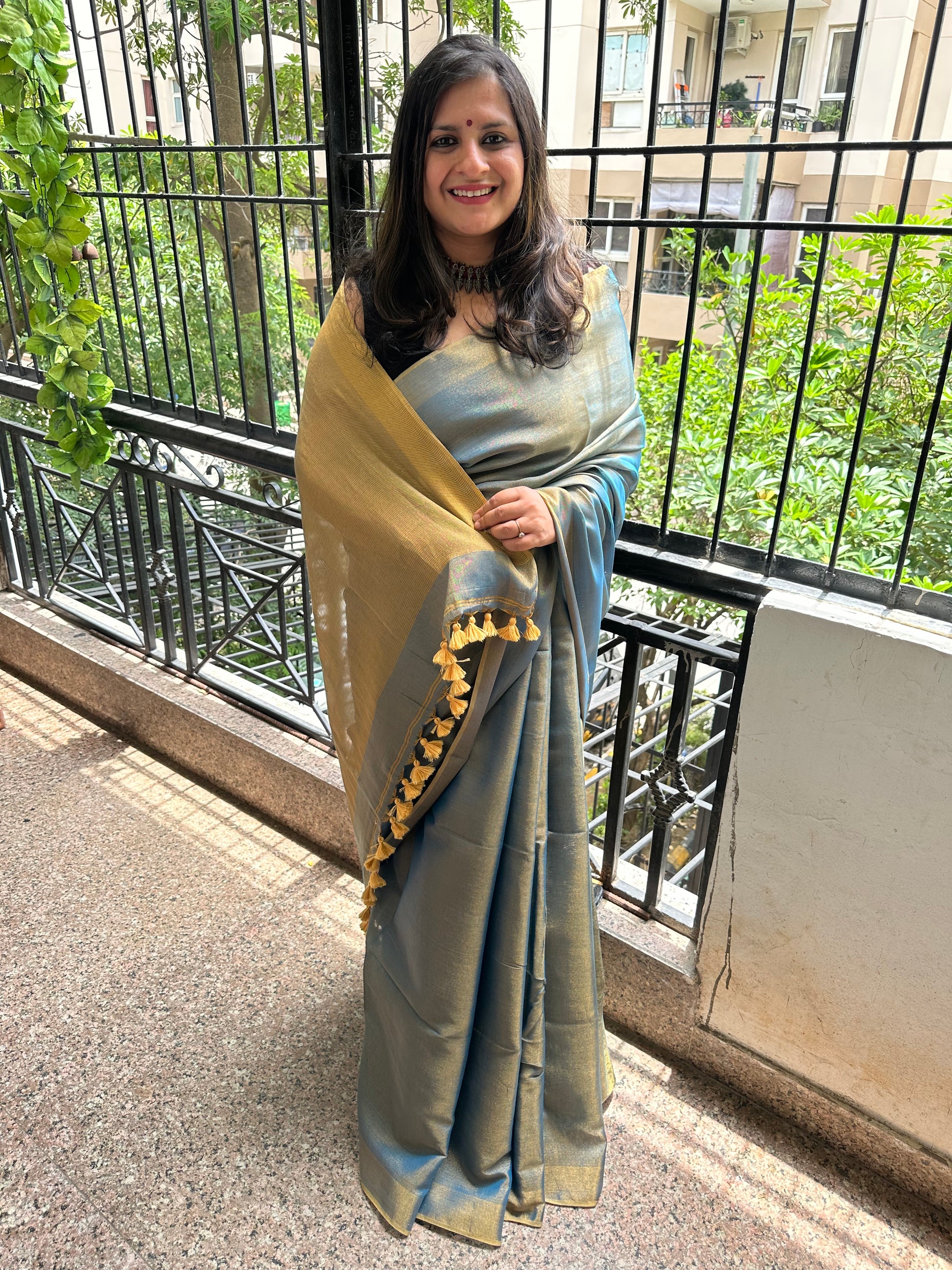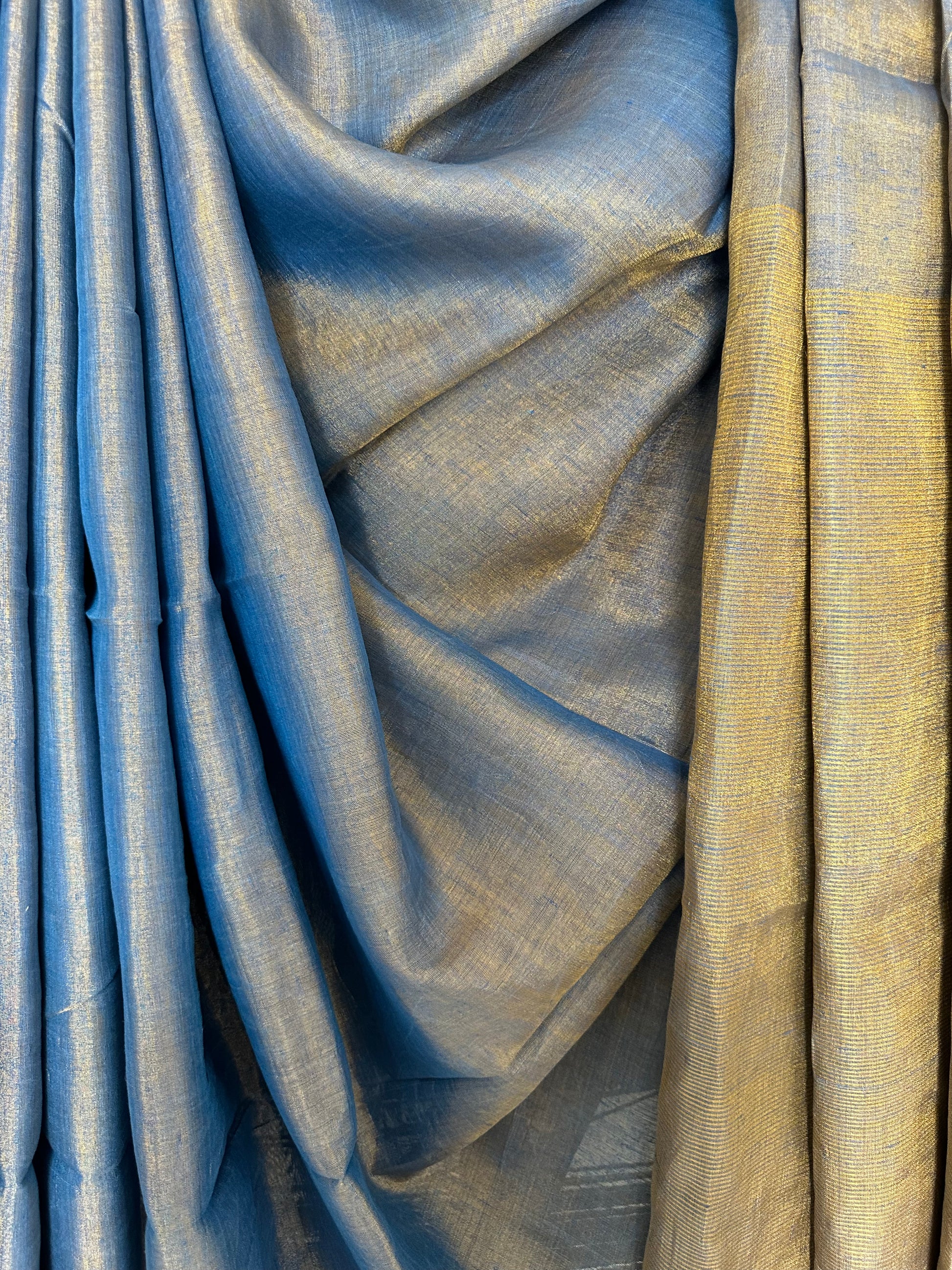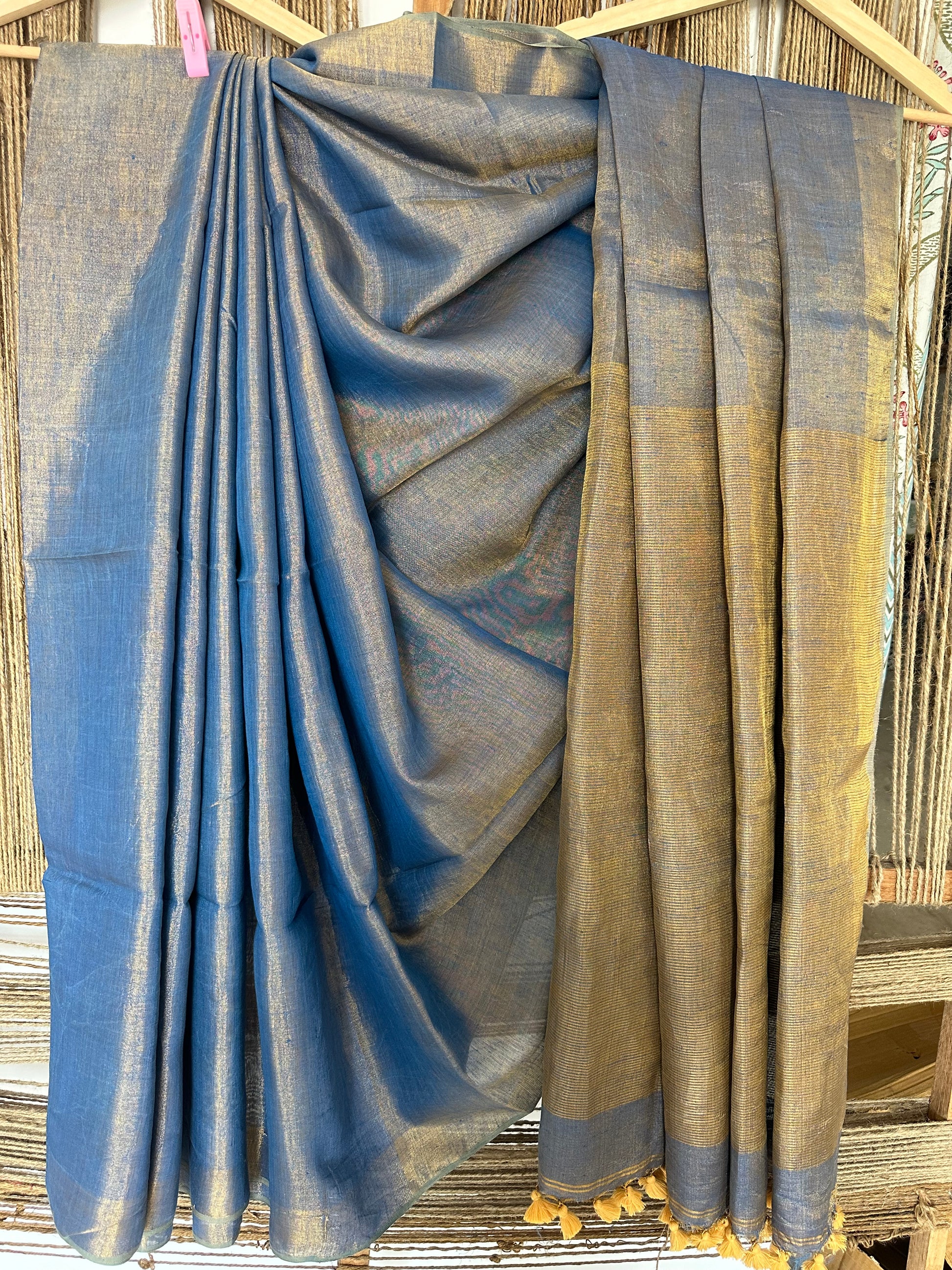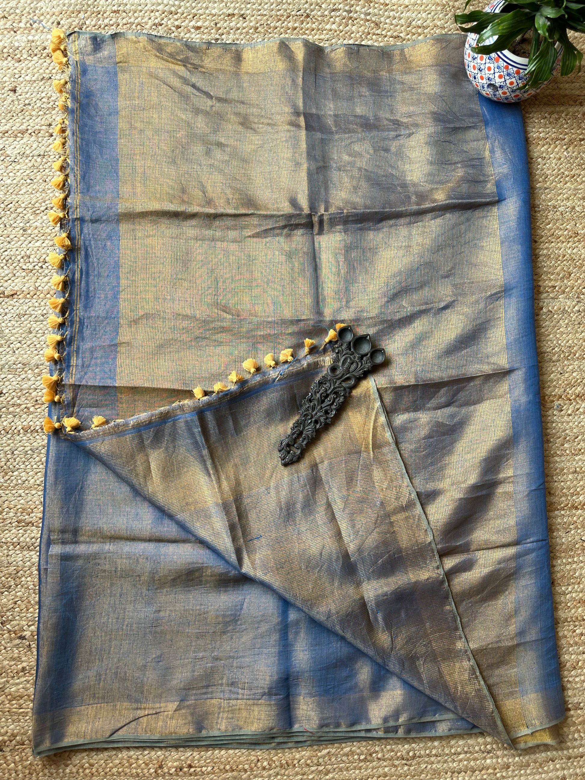 BLUE GOLDEN TISSUE LINEN SARI WITH WOVEN BORDER & TASSELS SIZE: 5.56 MTRS (Excluding 86 CMS BLOUSE) X 46" THE SAREES ARE NATURAL DYED HENCE THEY ARE NOT AS BRIGHT AS SEEN IN PICTURES. A SLIGHT DIFFERENCE IN SHADE COULD BE DUE TO THE CAMERA & LIGHTS. EMBRACE THE IMPERFECTION !! HAPPY HANDLOOM DRY CLEAN ONLY