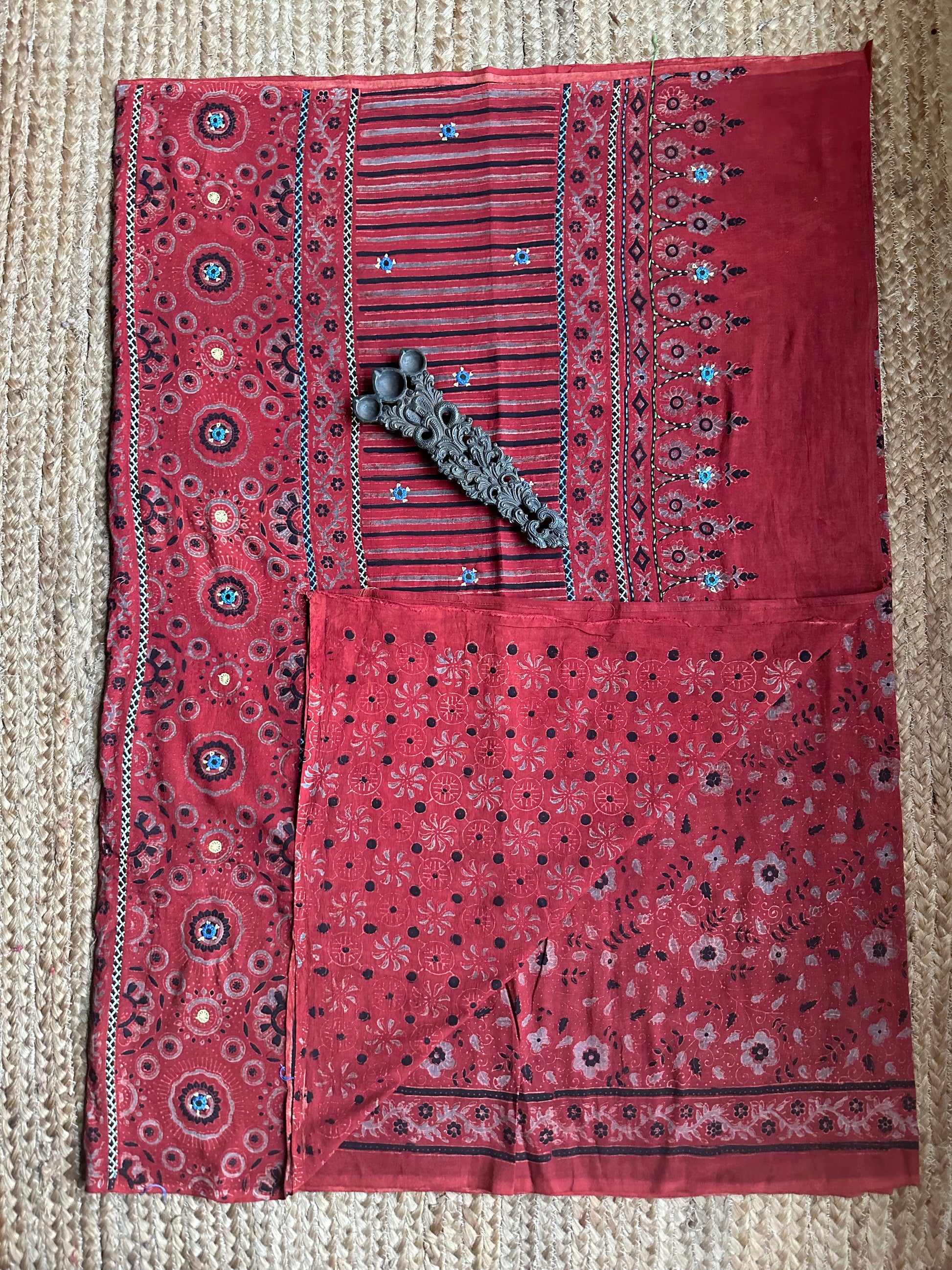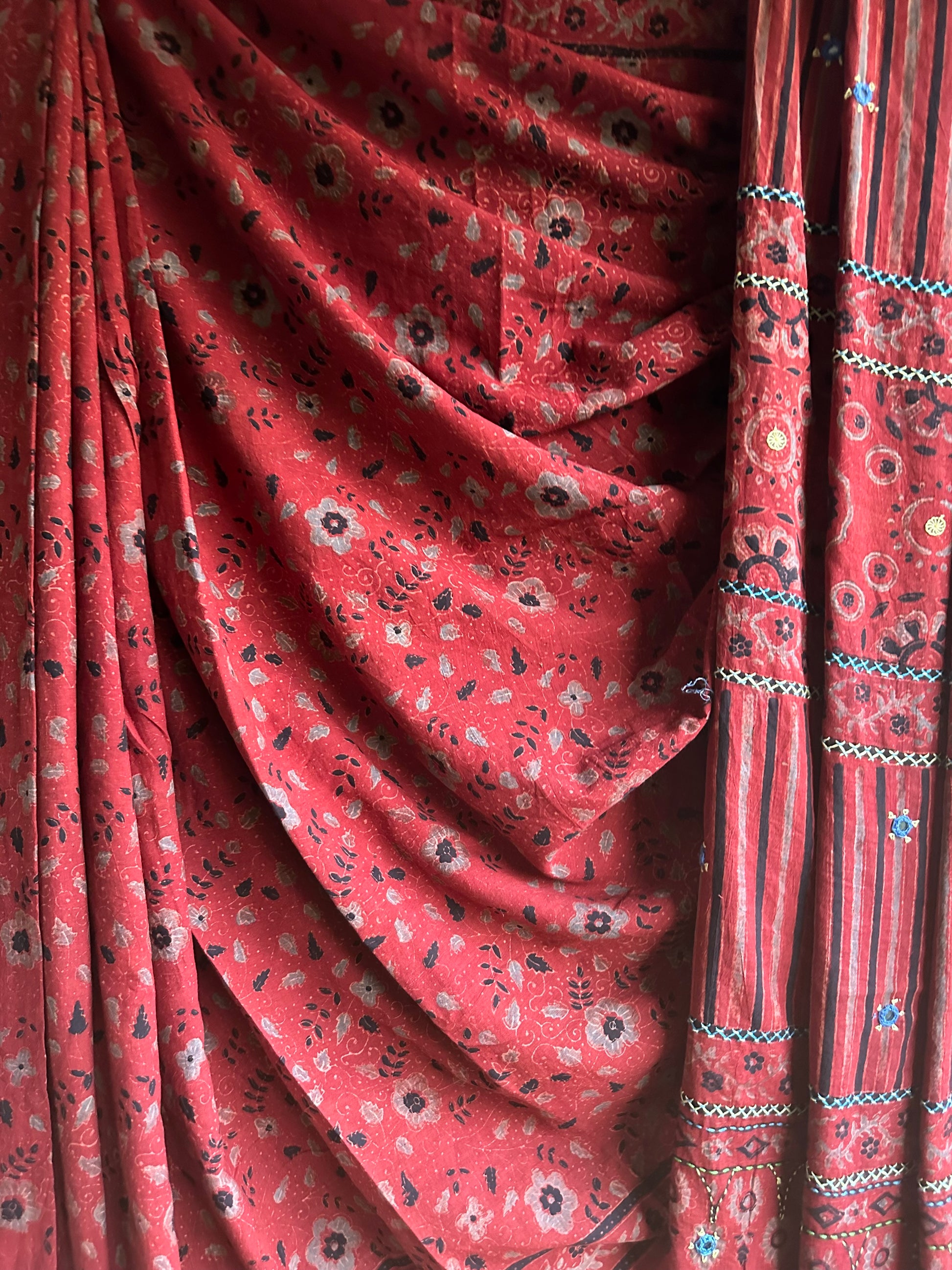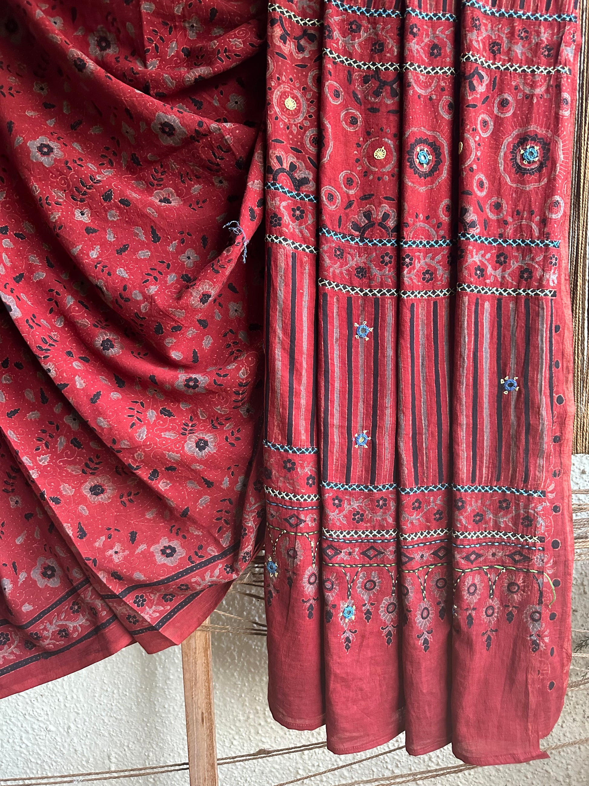Red cotton ajrakh hand block hand embroidery sari with blouse piece