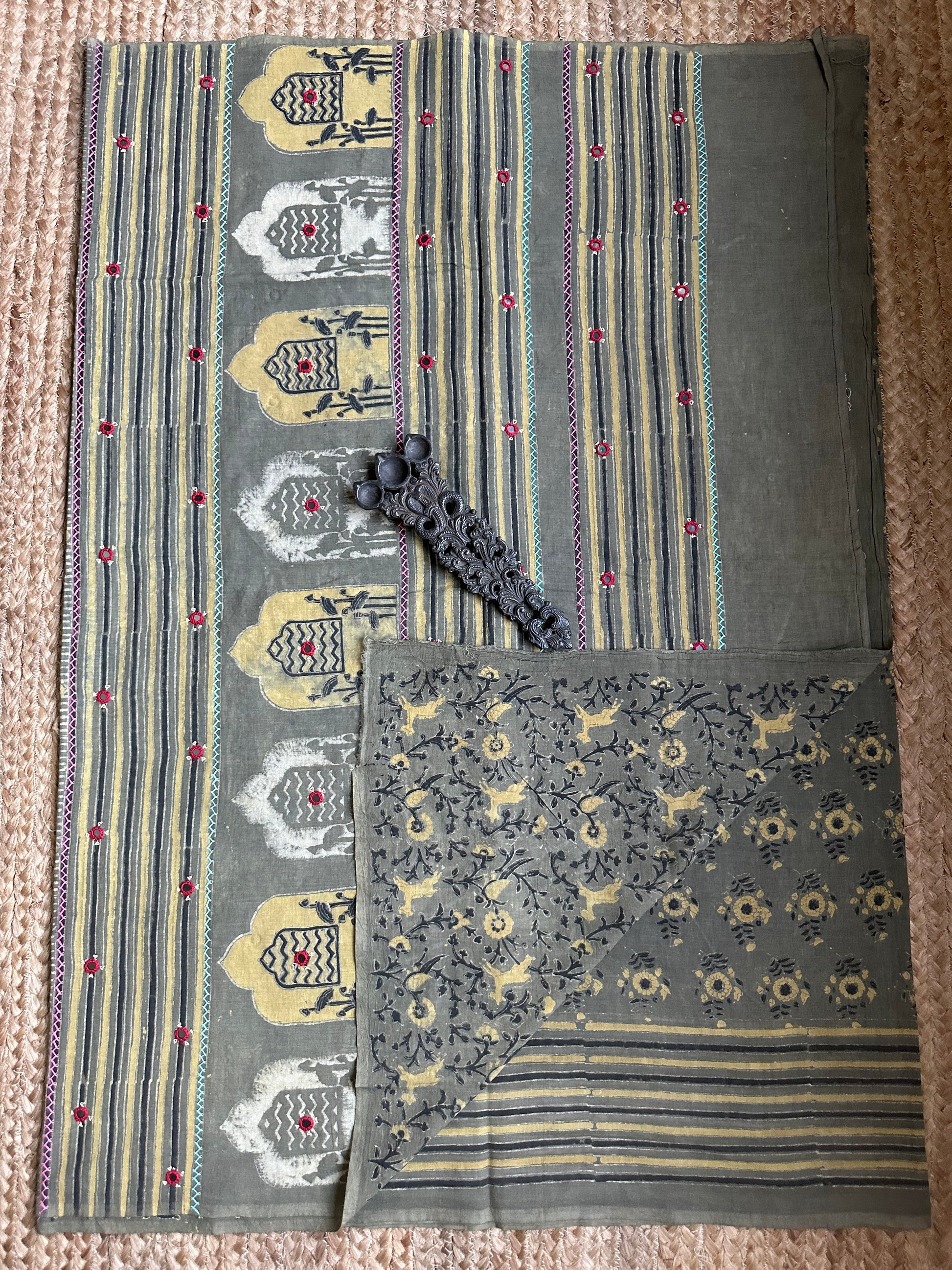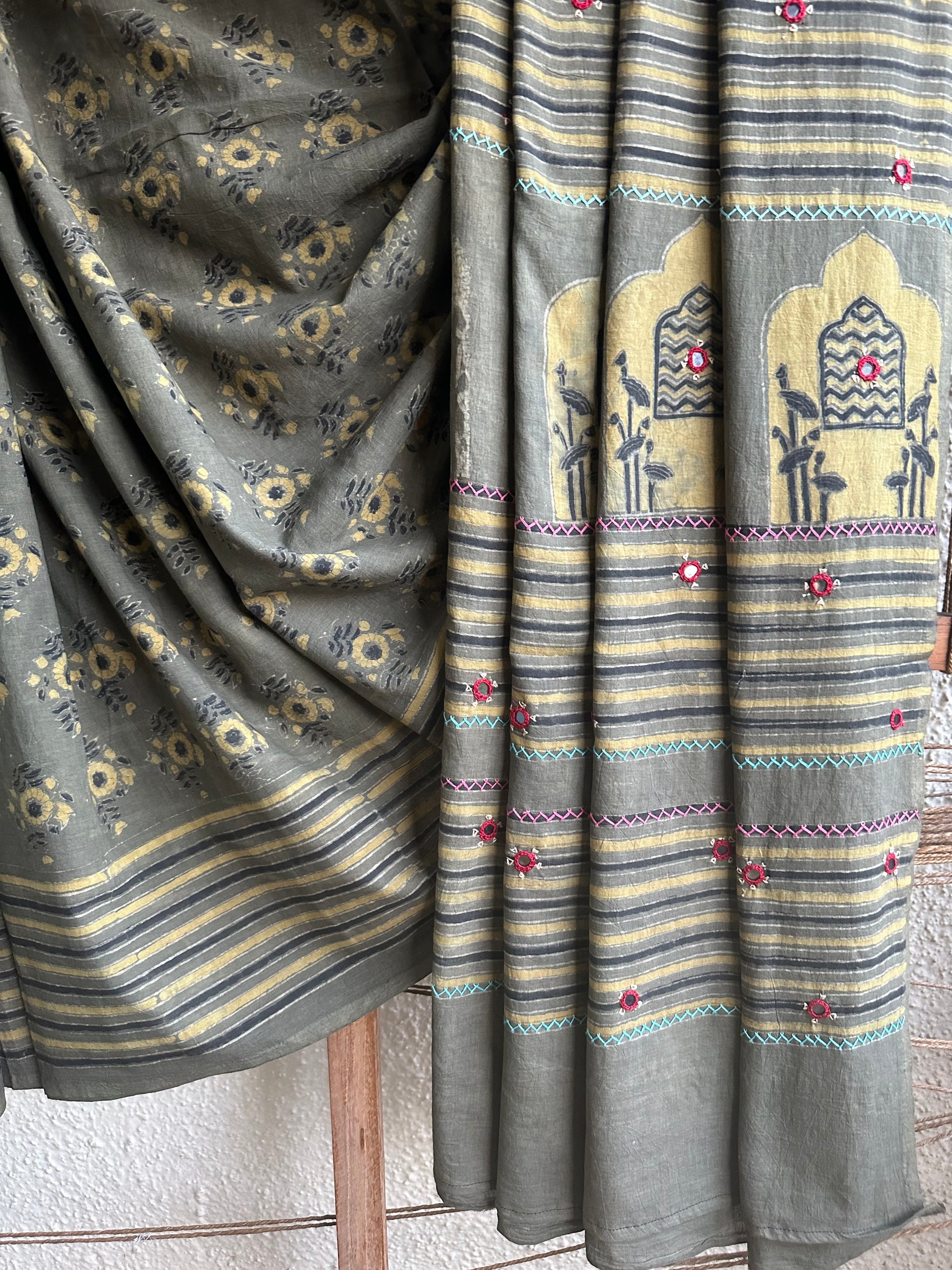Mehendi green otton ajrakh hand block hand embroidery sari with blouse piece