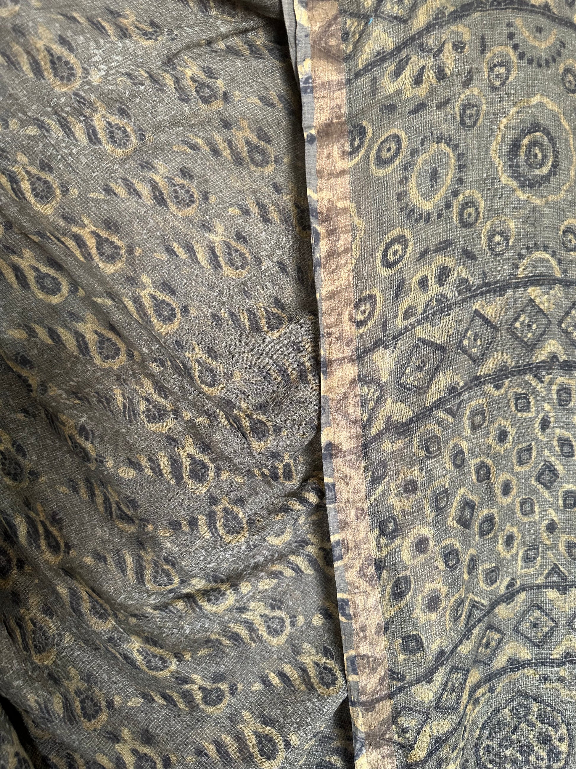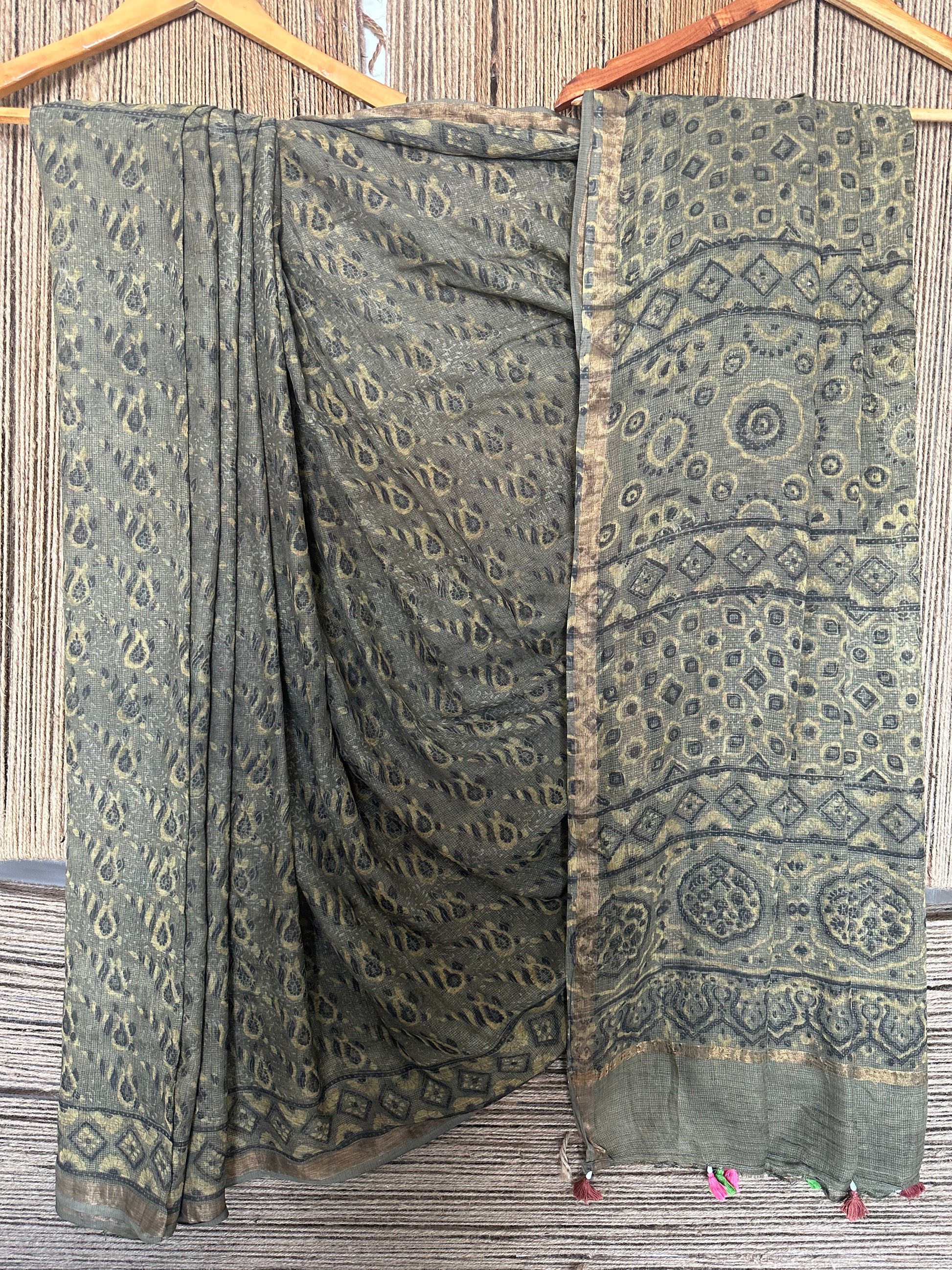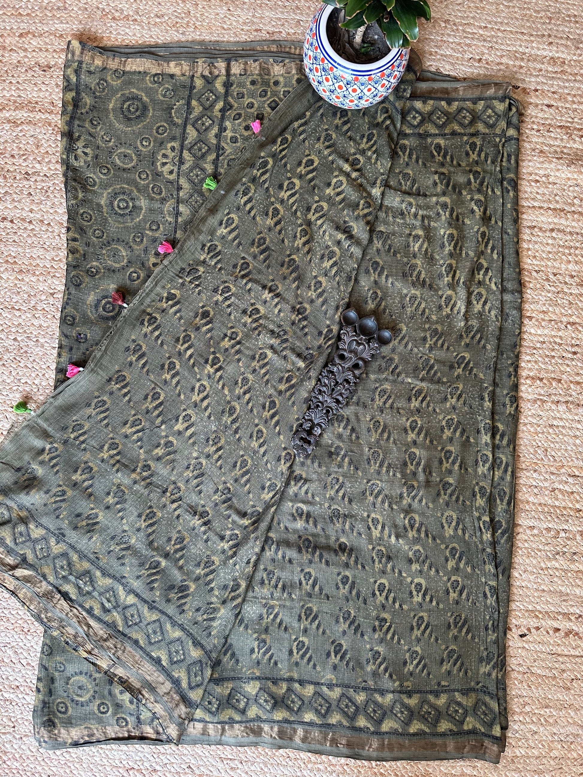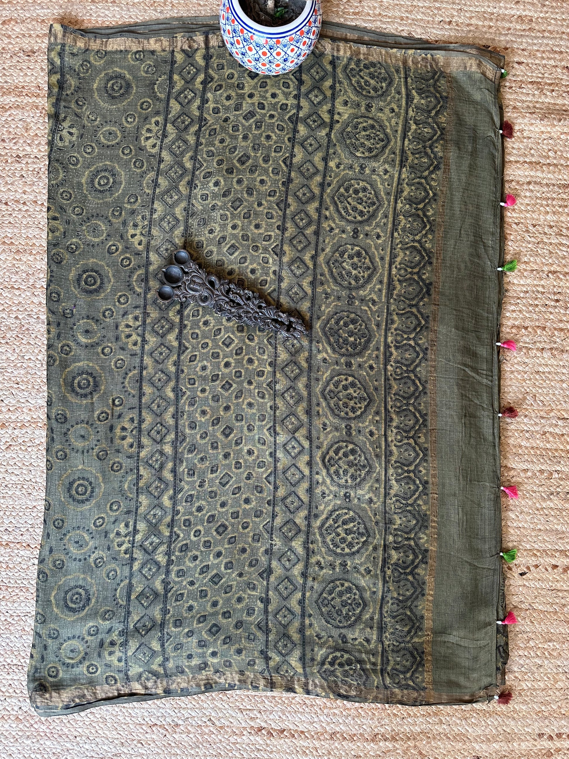 OLIVE GREEN KOTA AJRAK HANDBLOCK SARI