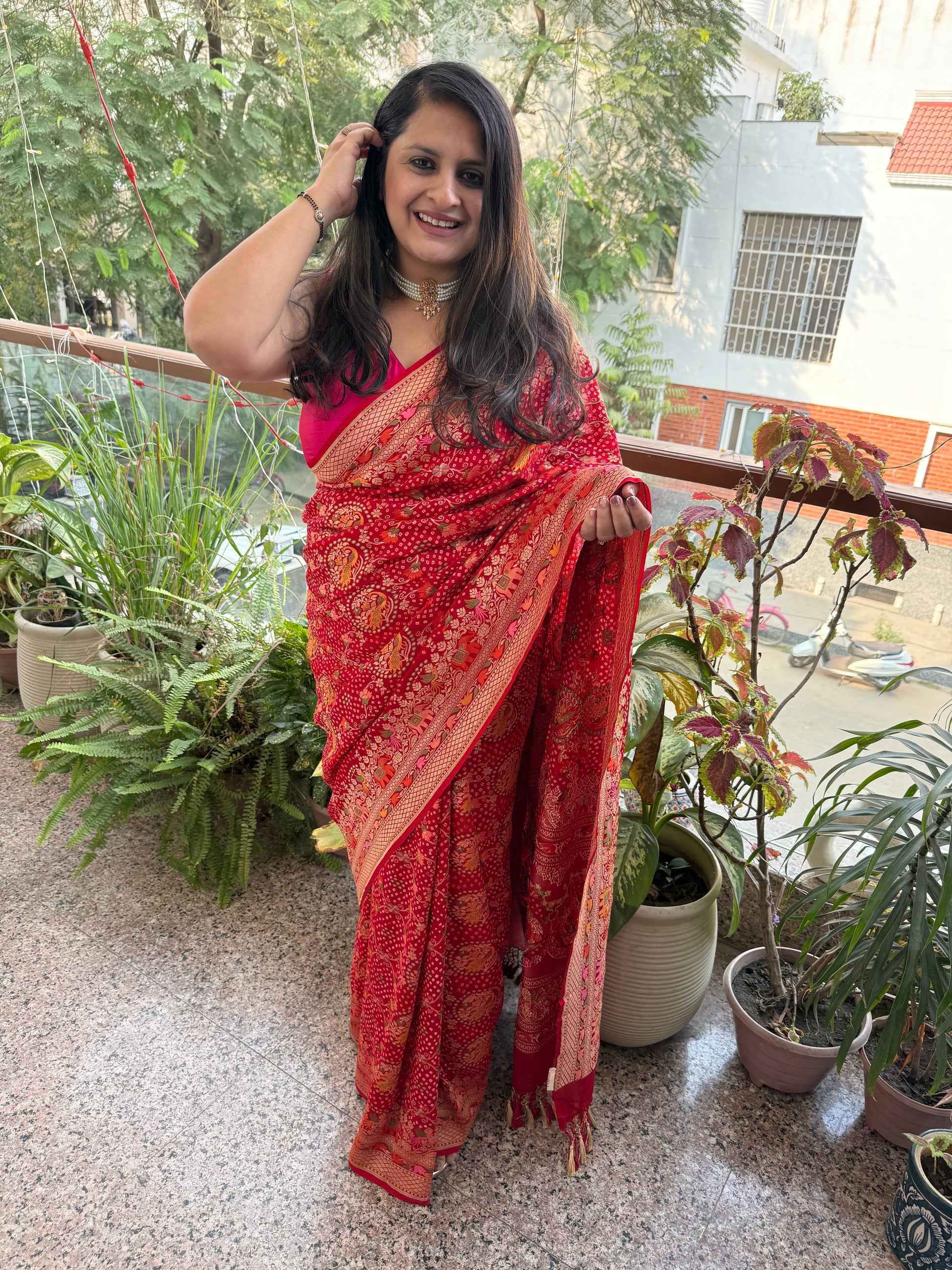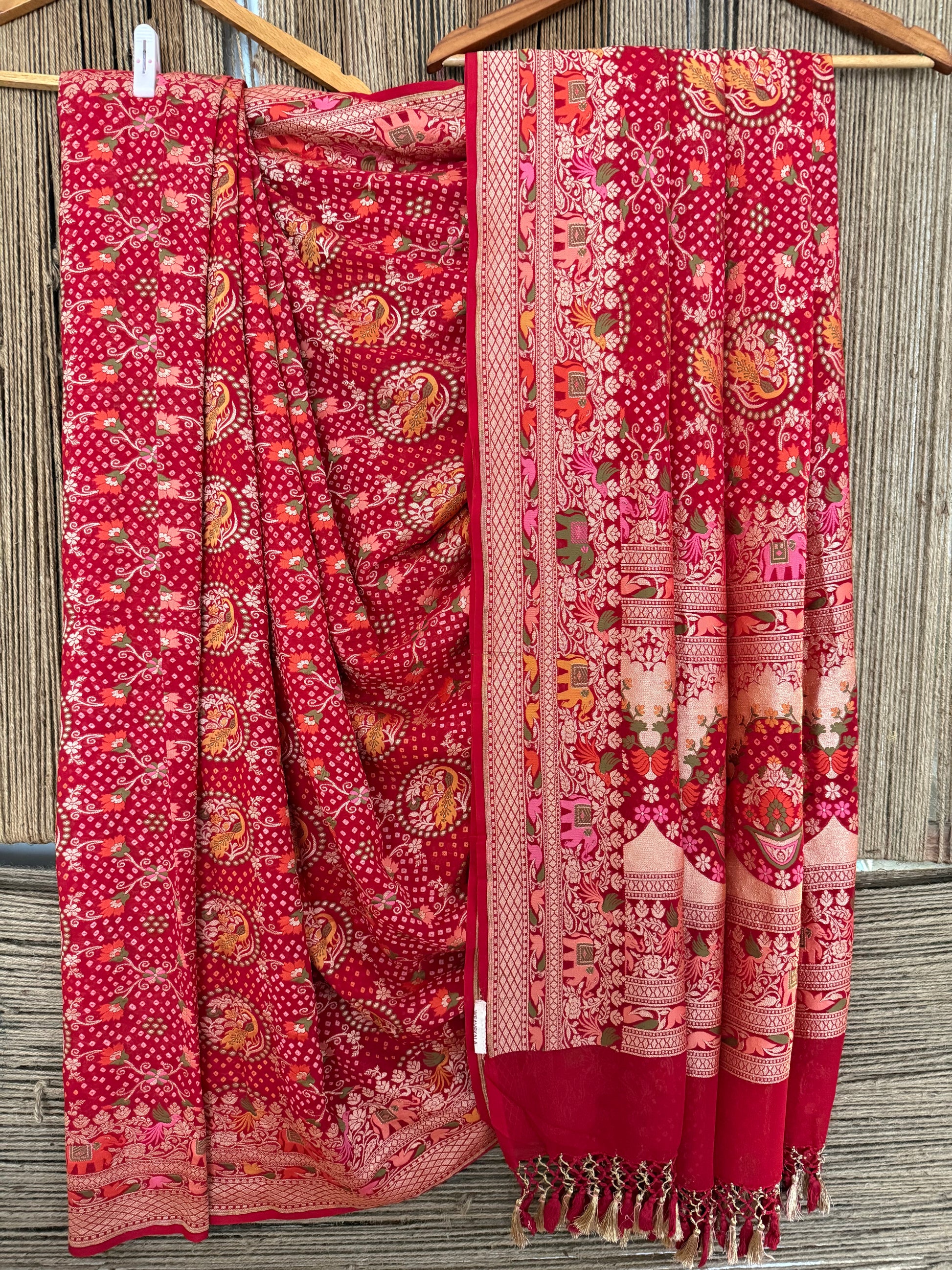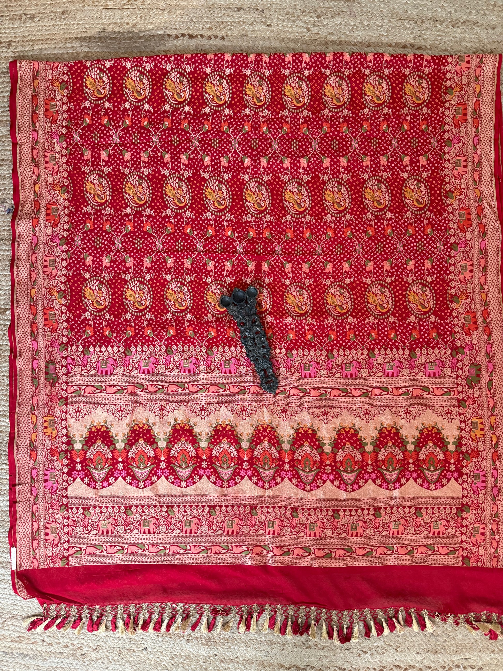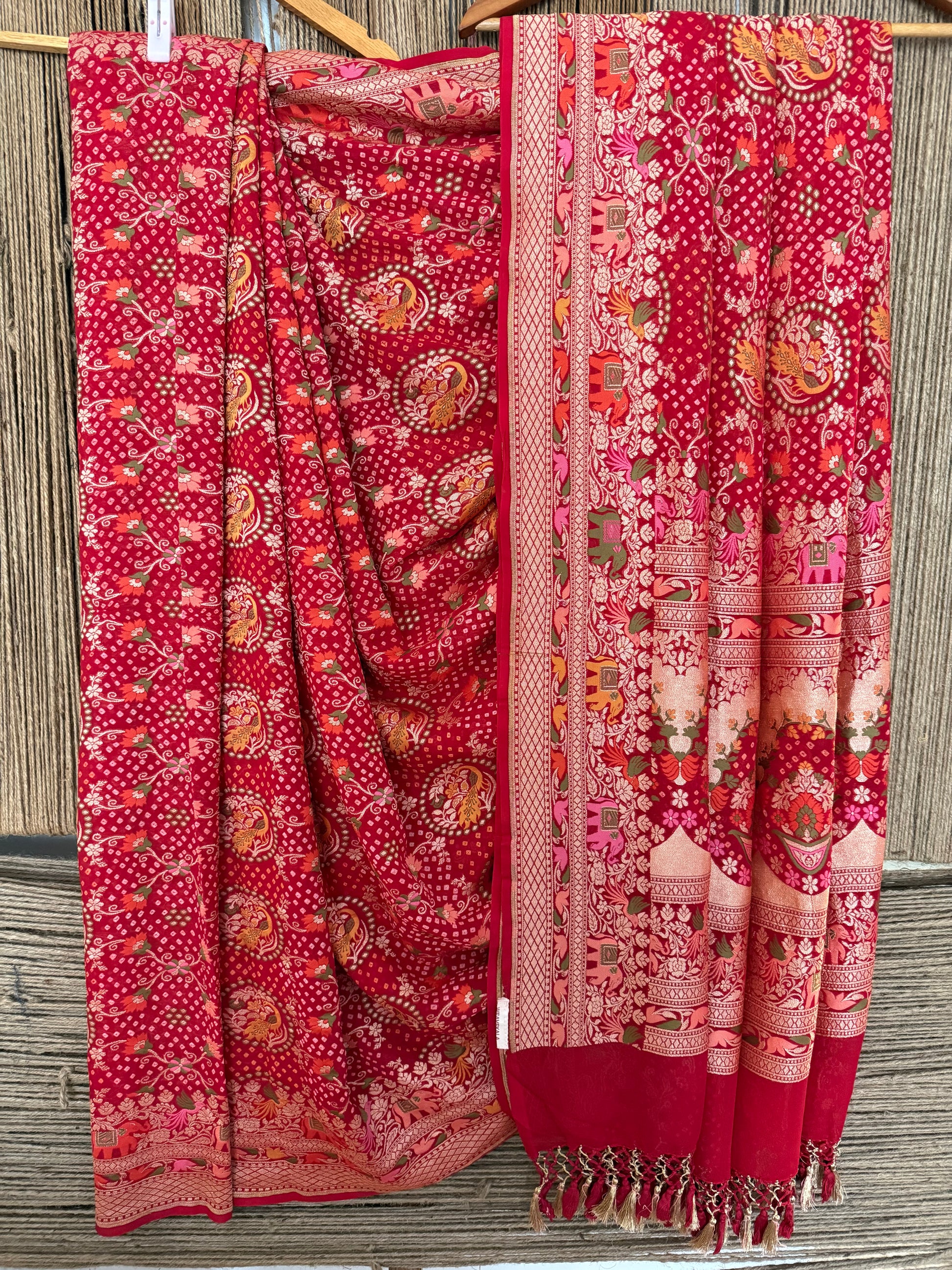 RED Handwoven Rai Bareek Bandhani Saree Meenakari Jaal with Khaddi Georgette Mks-12