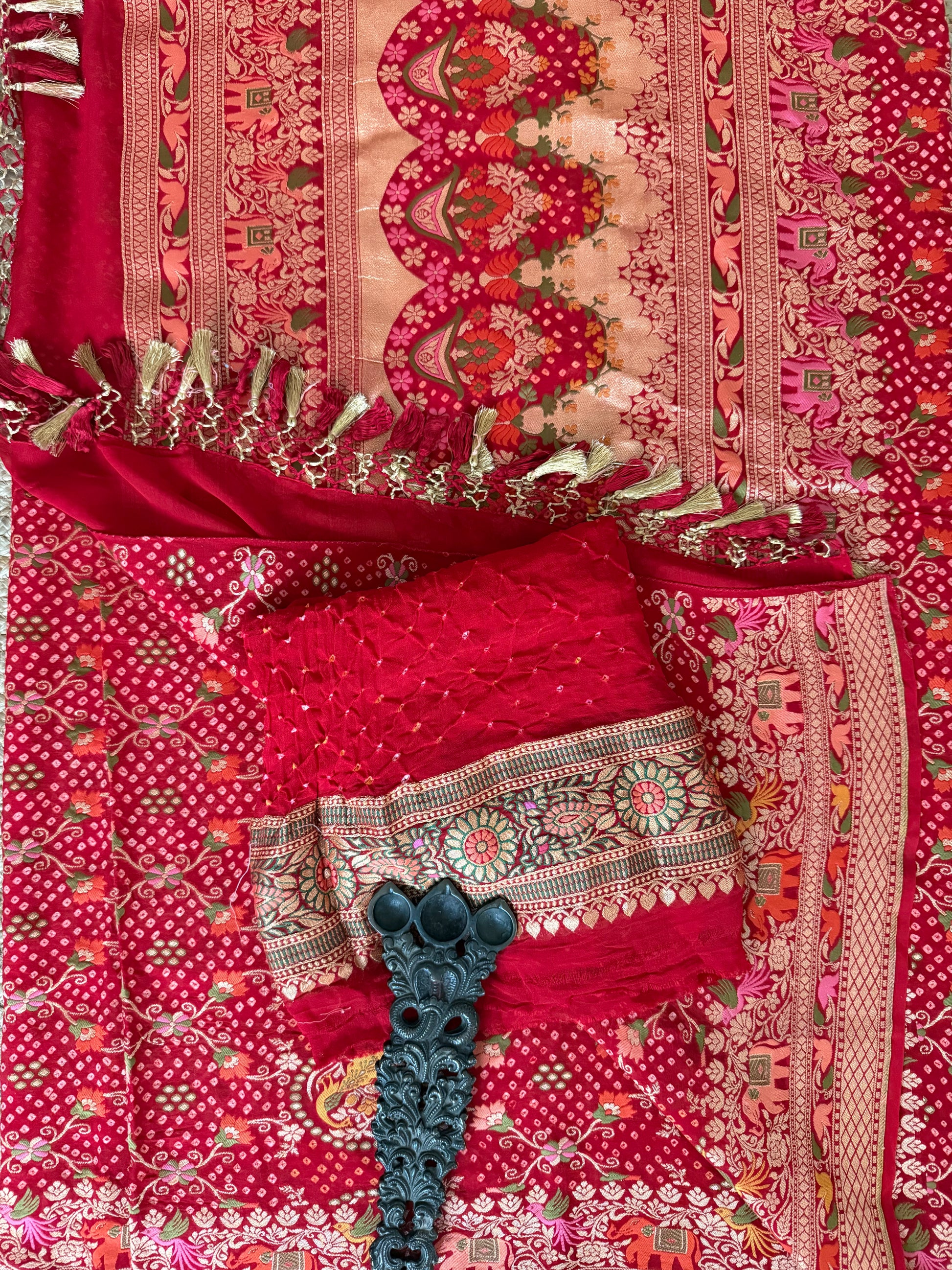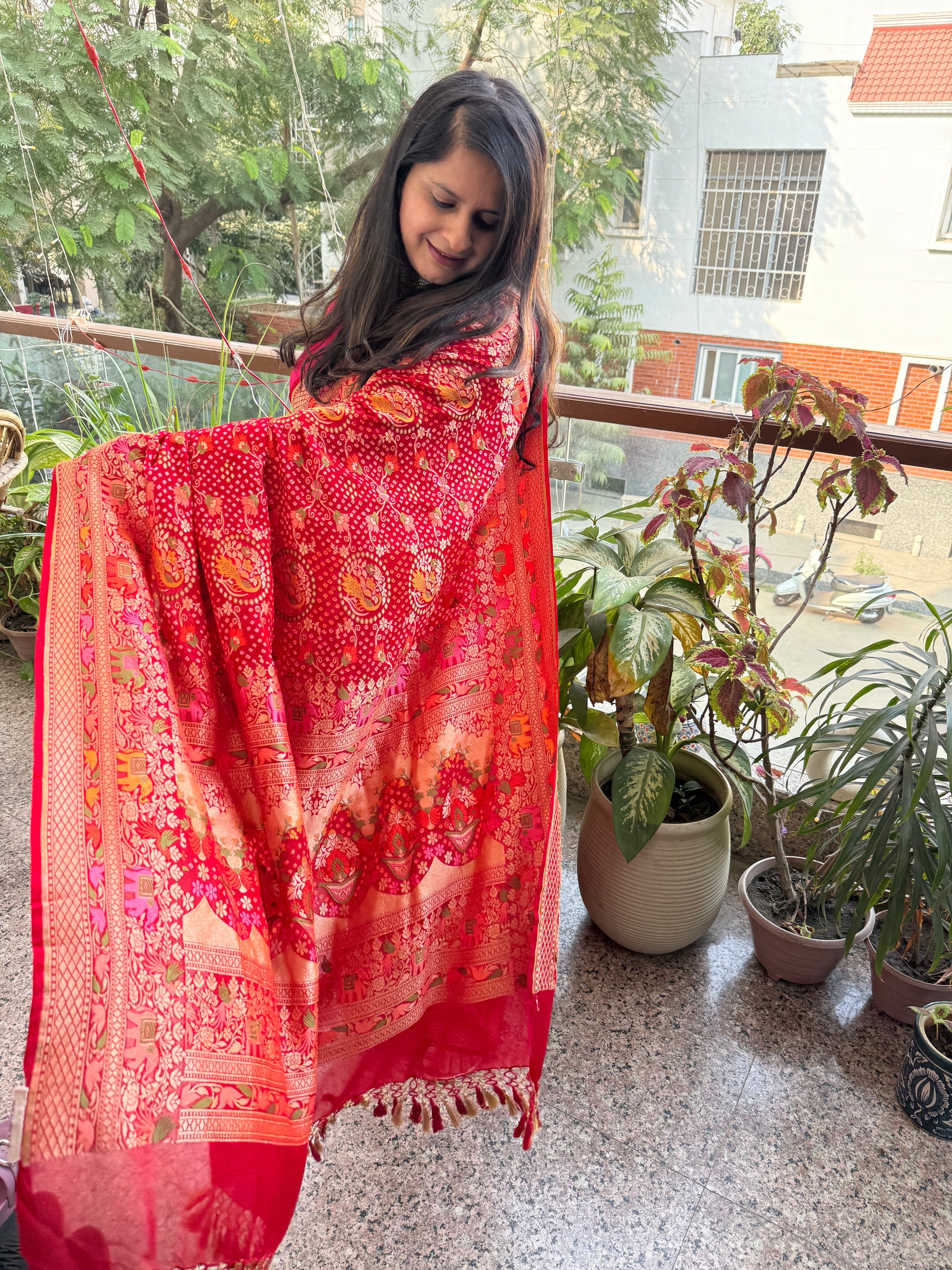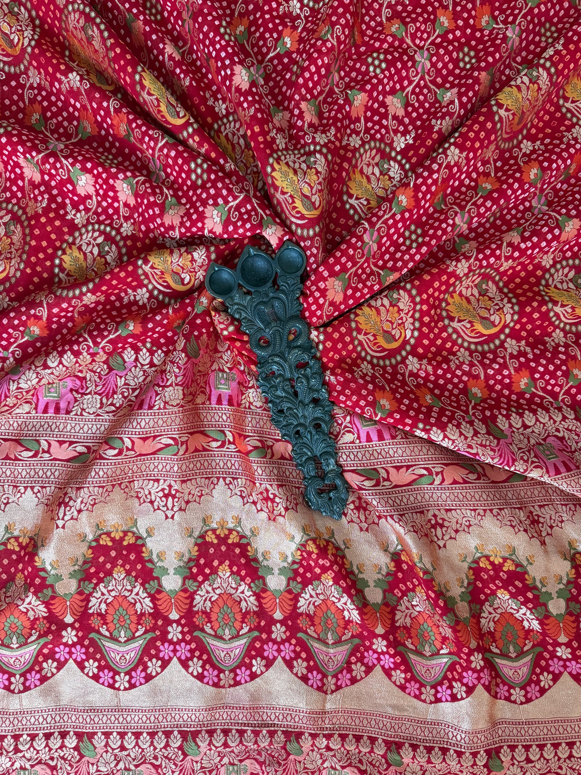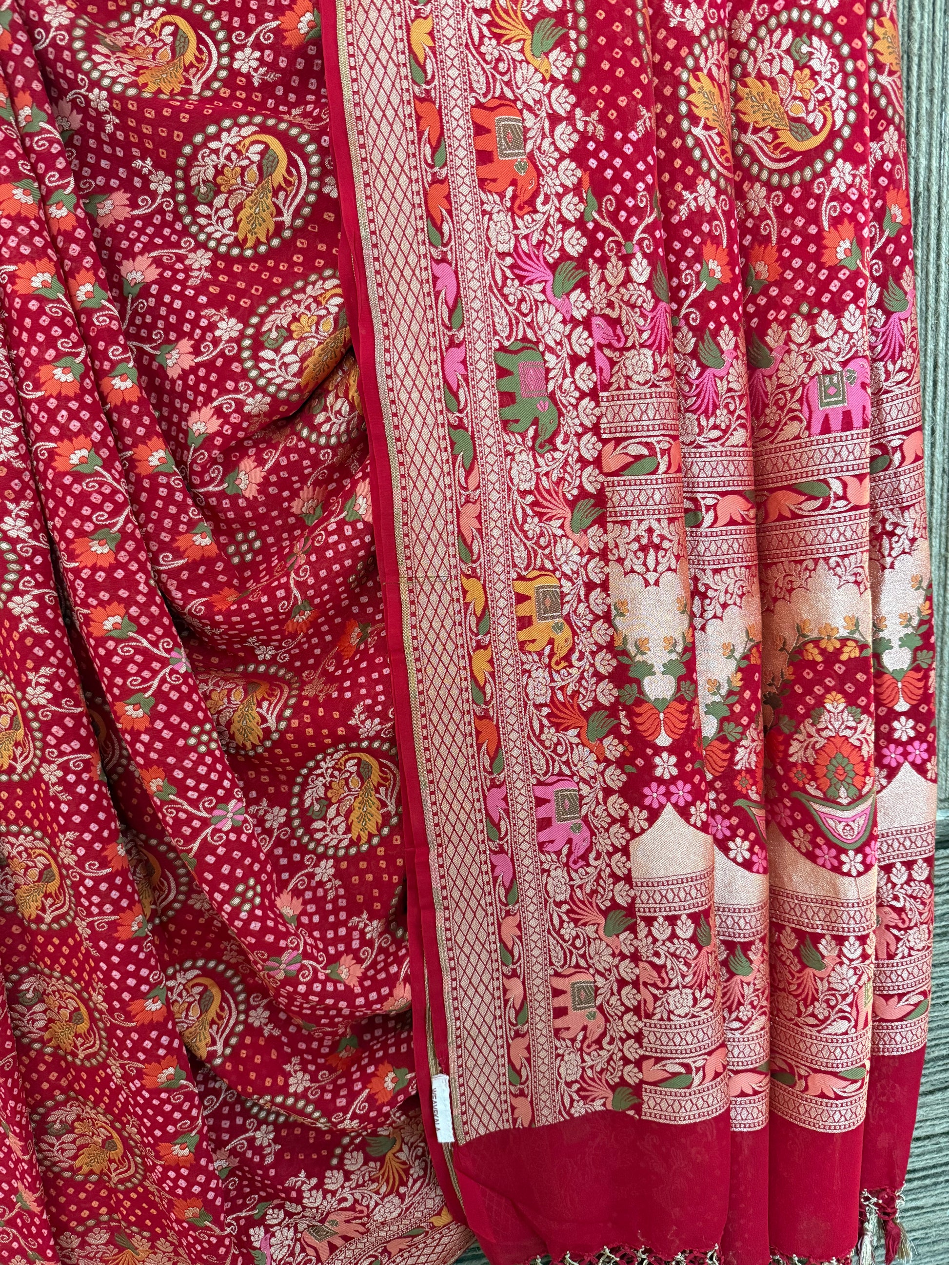 RED Handwoven Rai Bareek Bandhani Saree Meenakari Jaal with Khaddi Georgette Mks-12