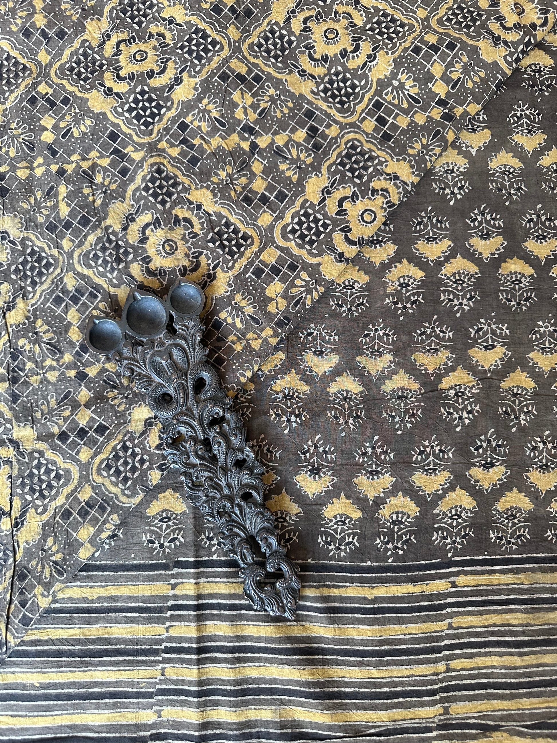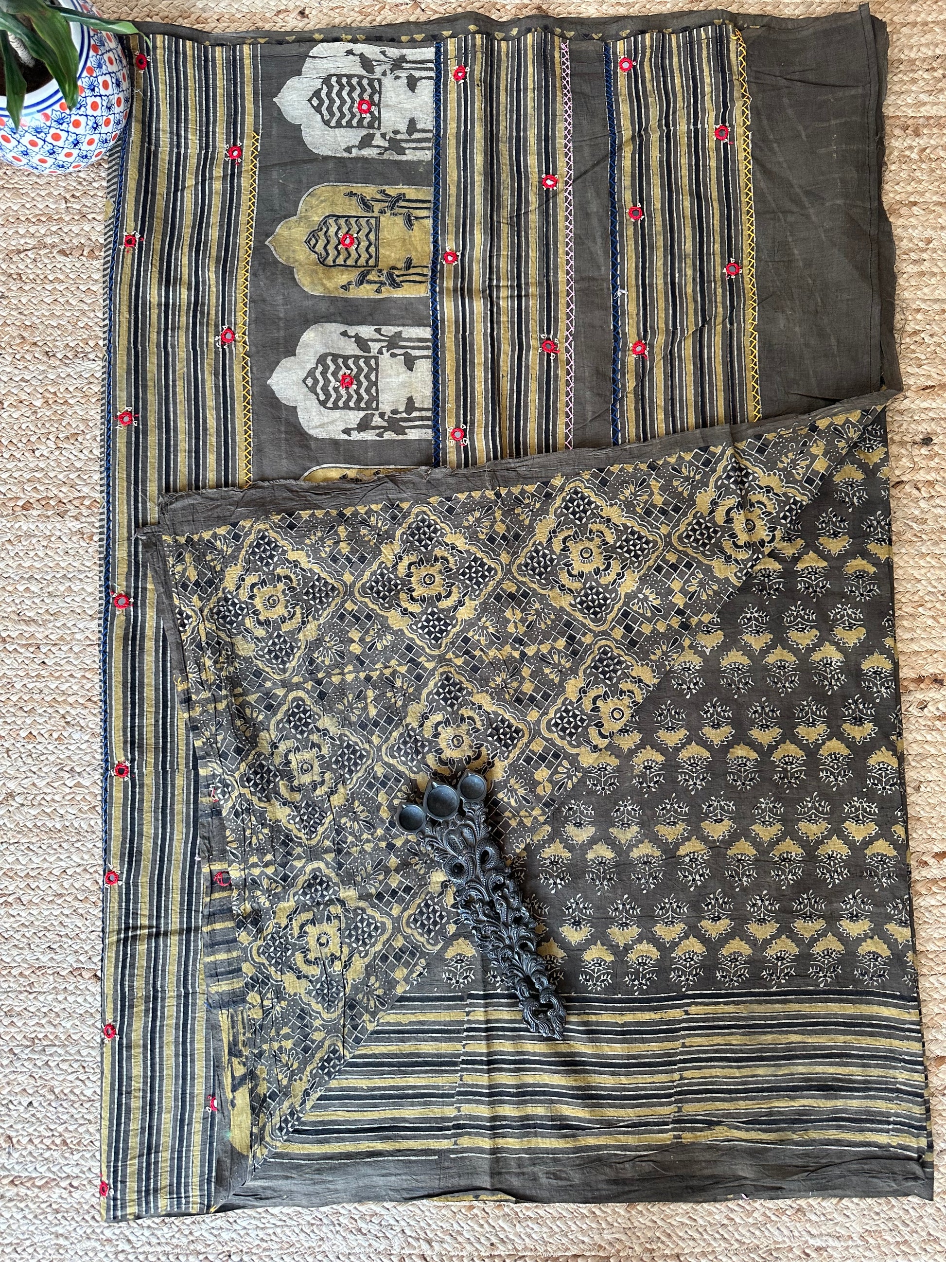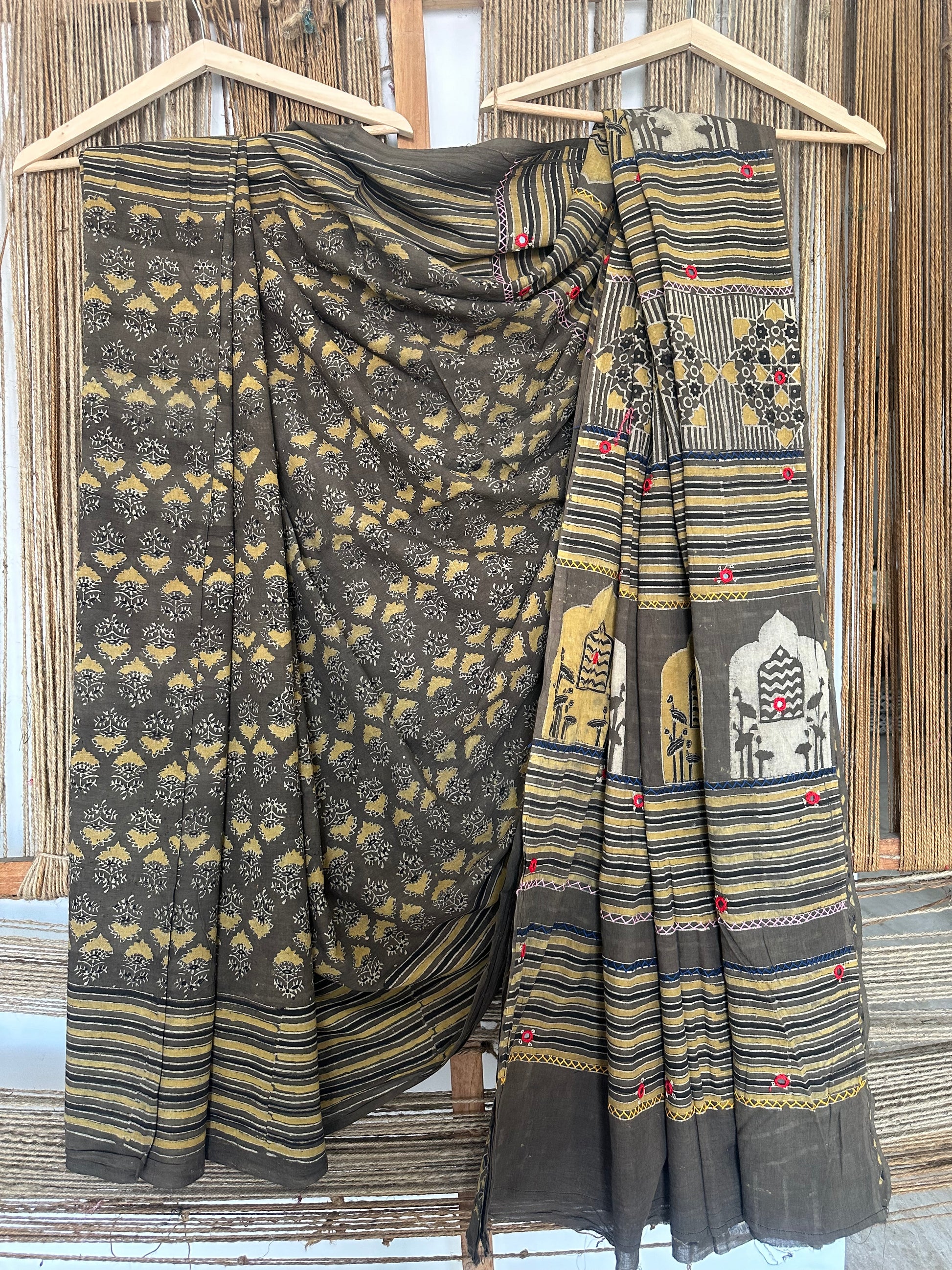 mustard with mehndi green Cotton ajrakh hand block hand embroidery sari with blouse piece