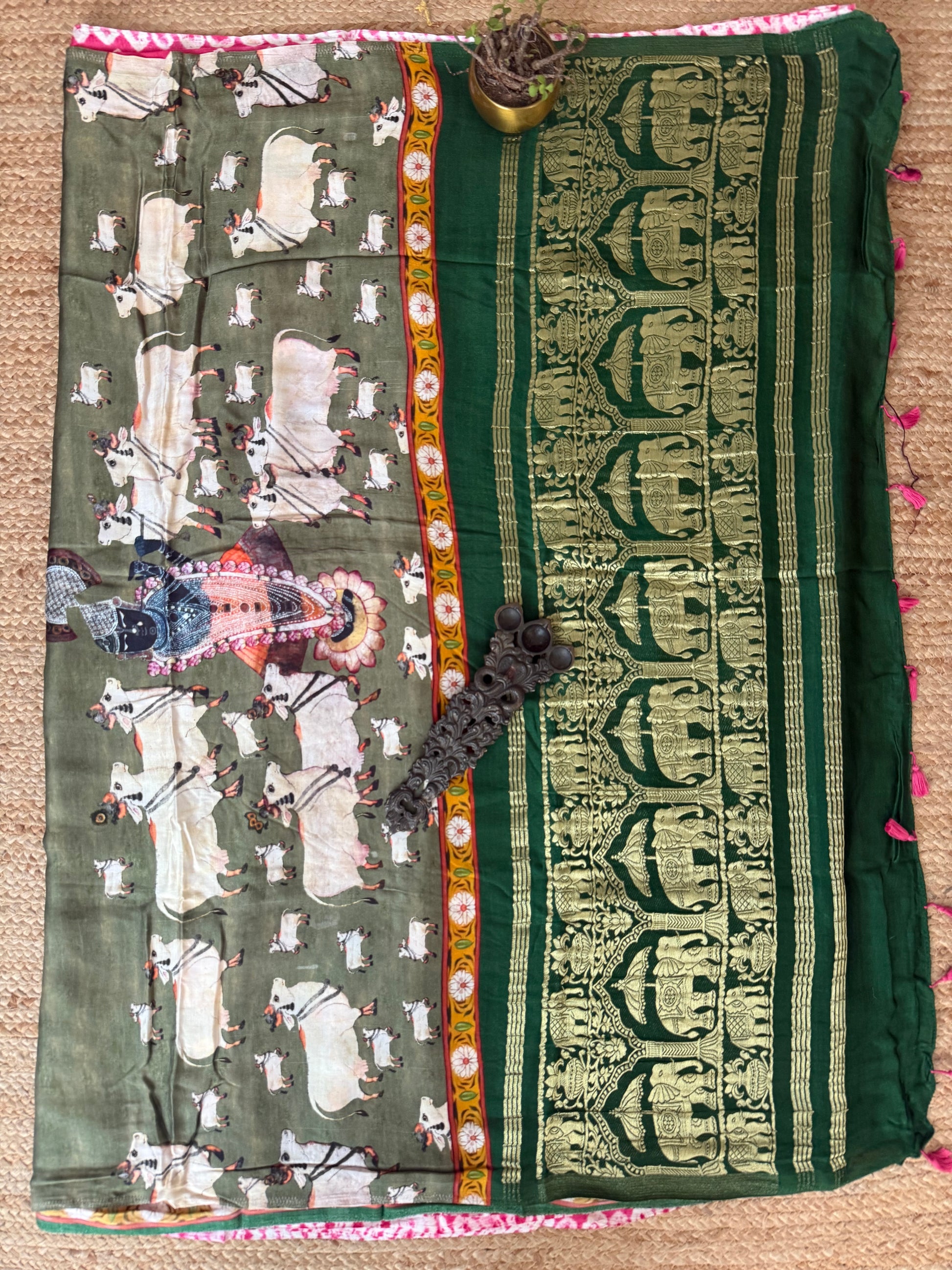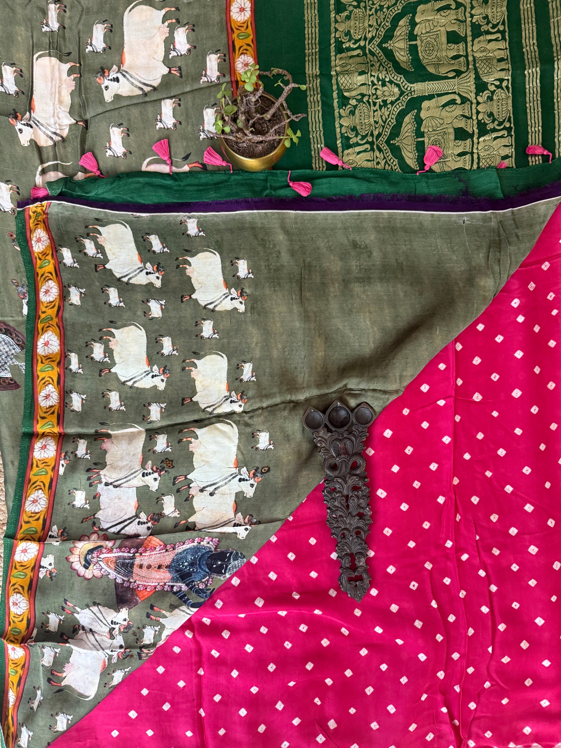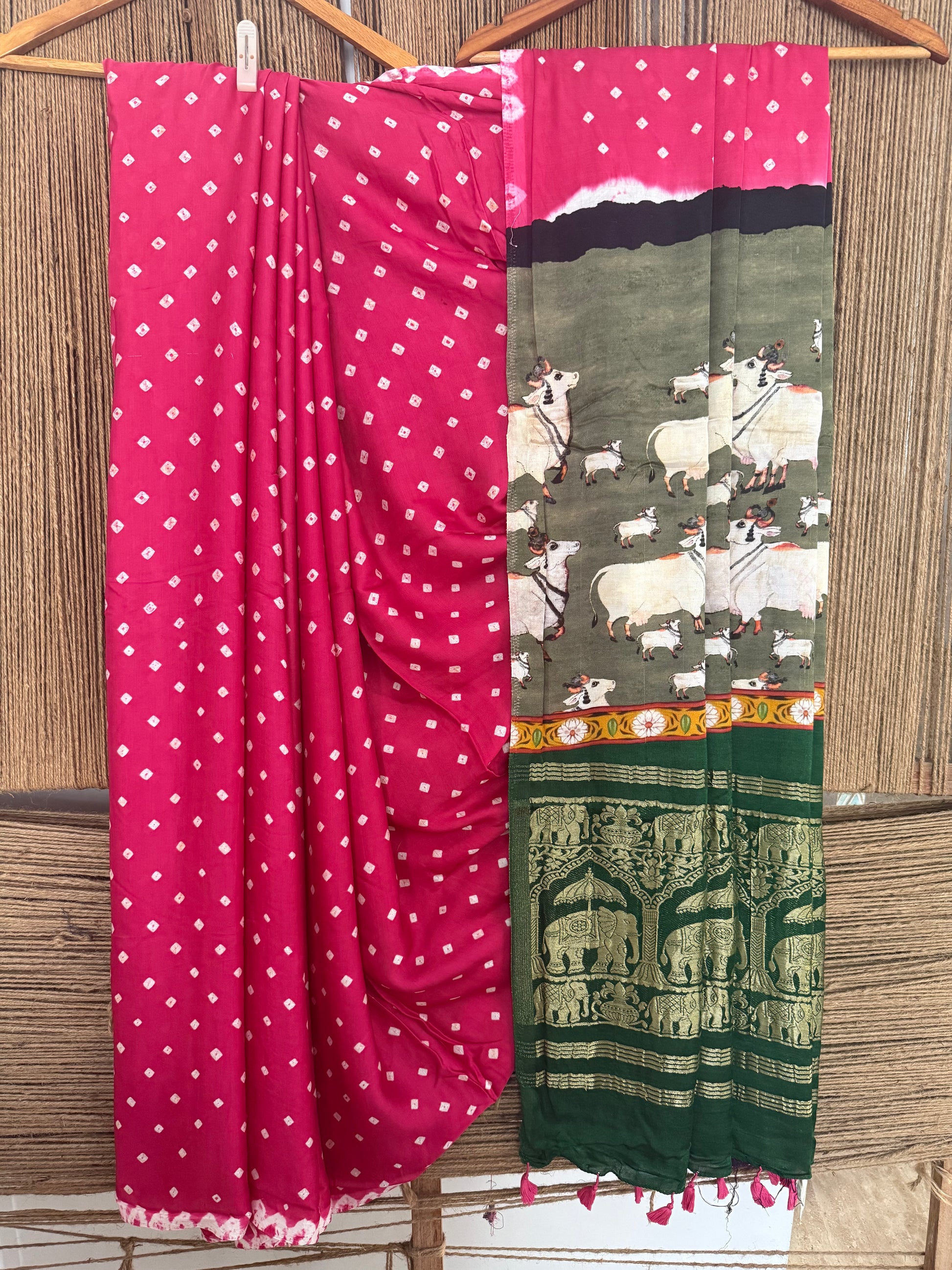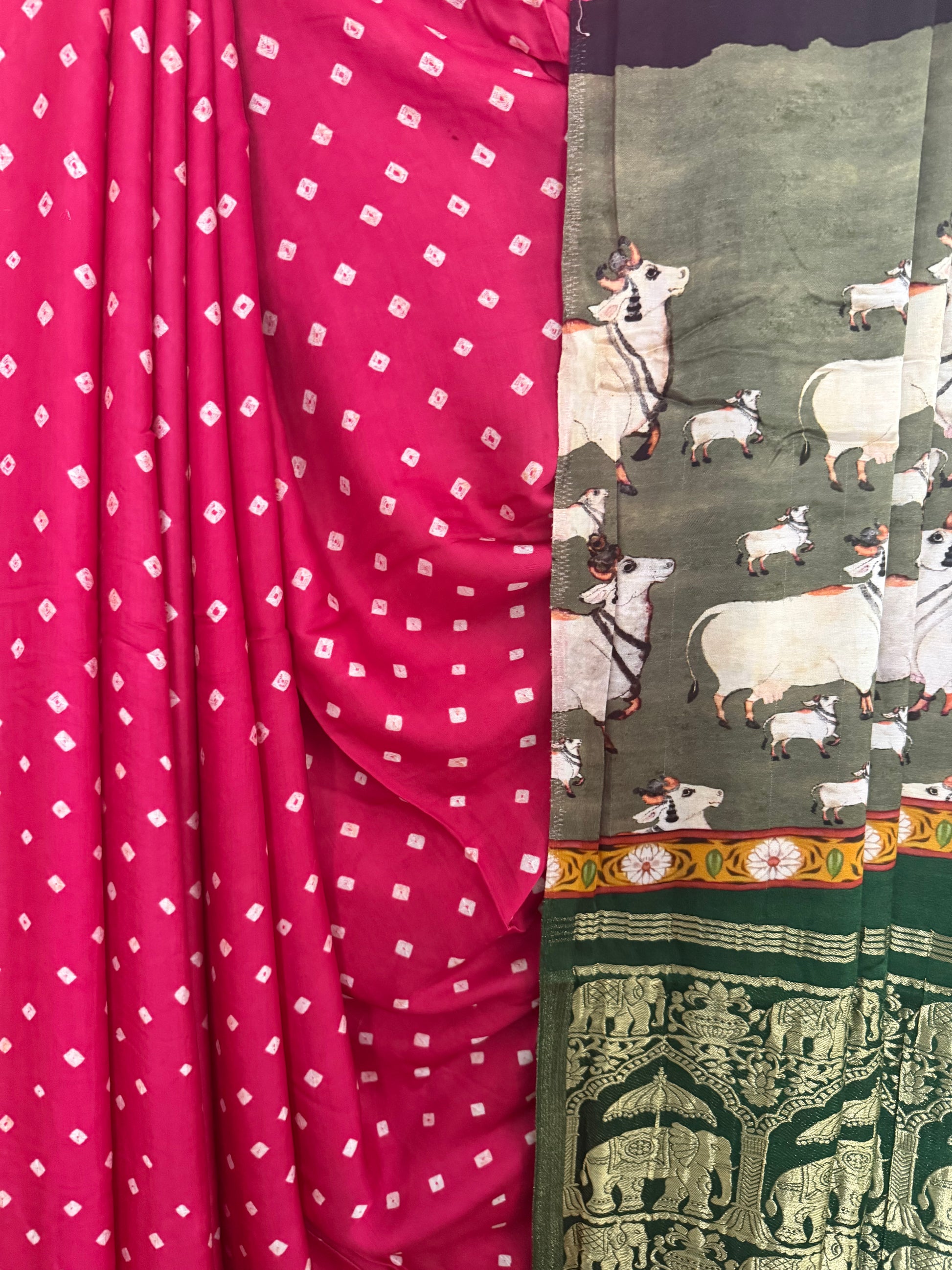 PINK & GREEN MODAL SILK BANDHANI SARI WITH PICHWAI PRINT BPS 42