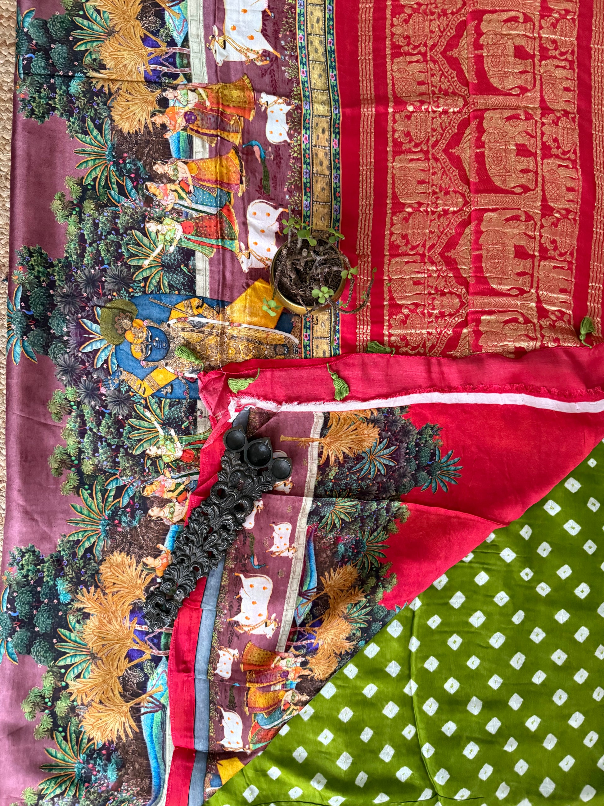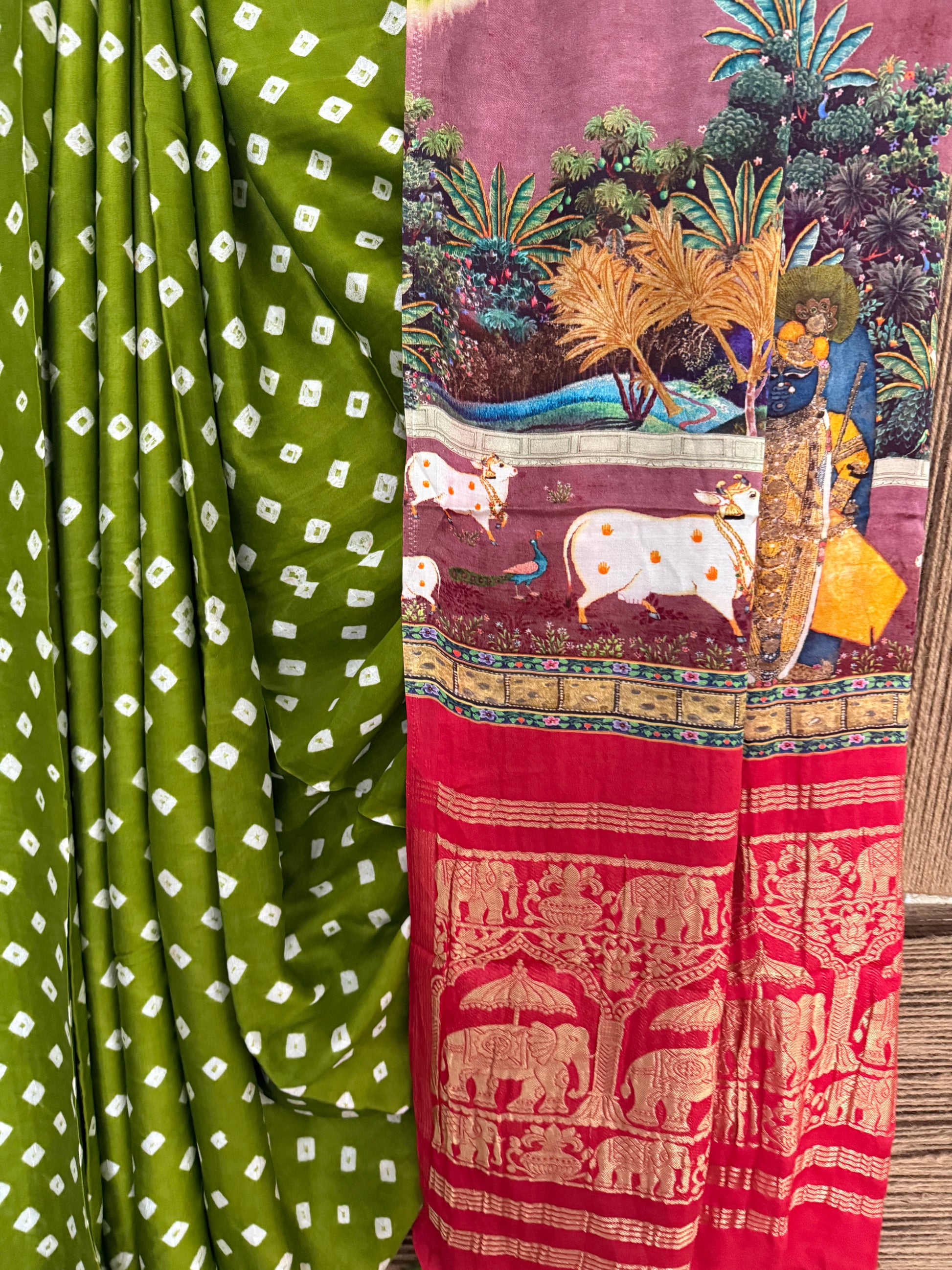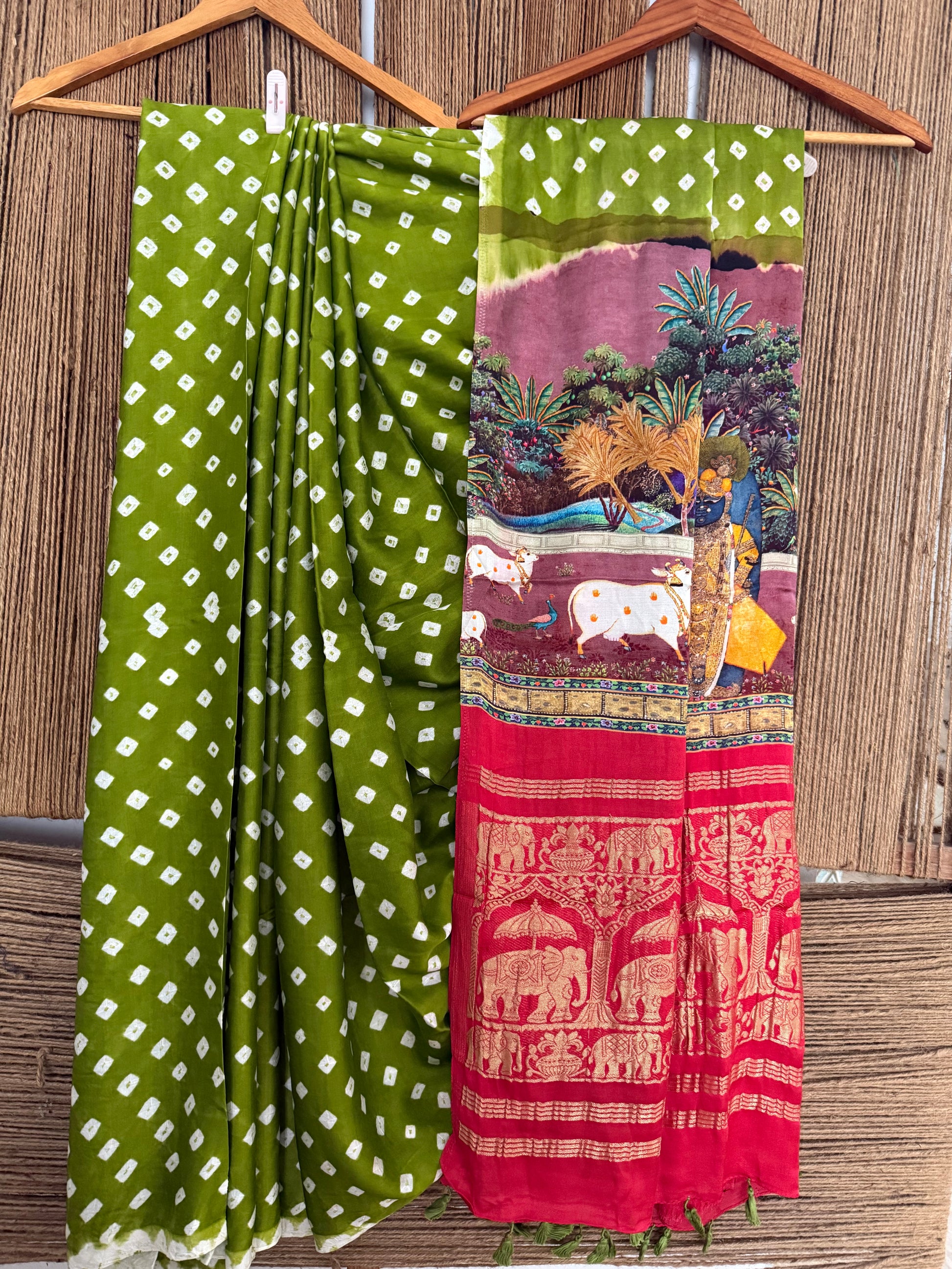 MEHENDI GREEN & RED MODAL SILK BANDHANI WITH PICHWAI PRINT NAKSHI ZARI WOVEN SARI WITH BLOUSE PIECE