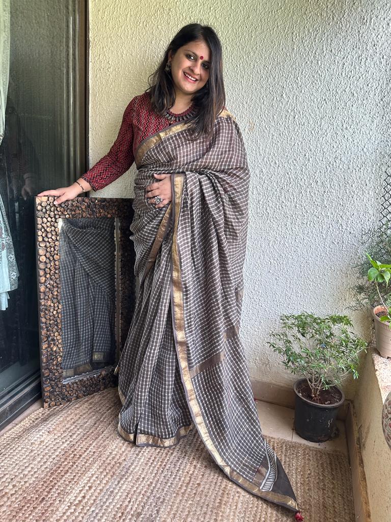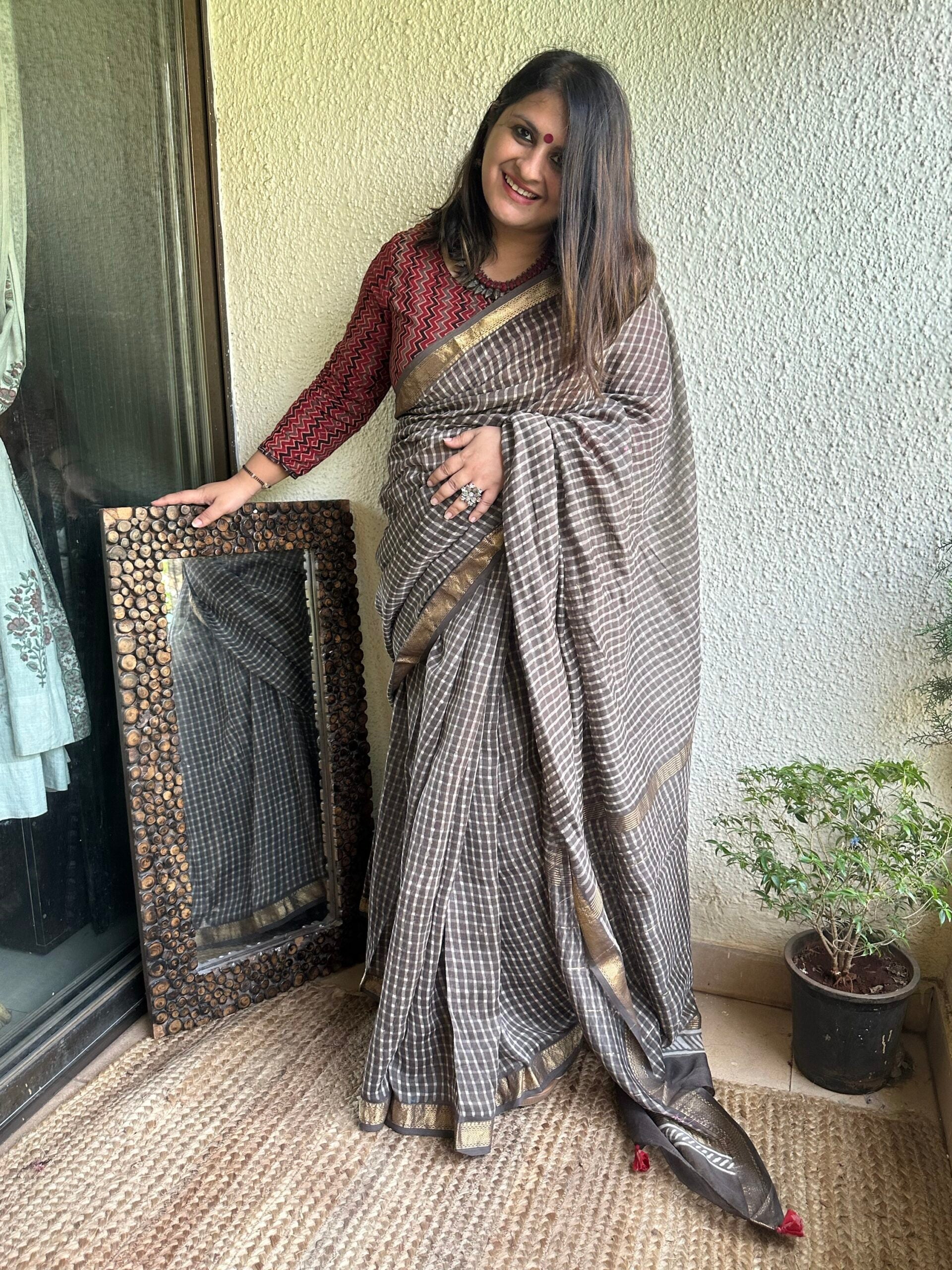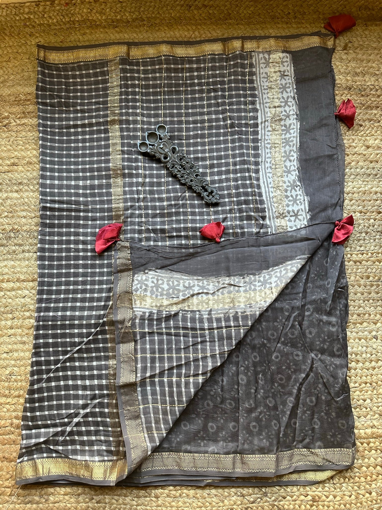 gray check maheshwari silk cotton hand block sari in natural dye with blouse piece accessories with tassels.