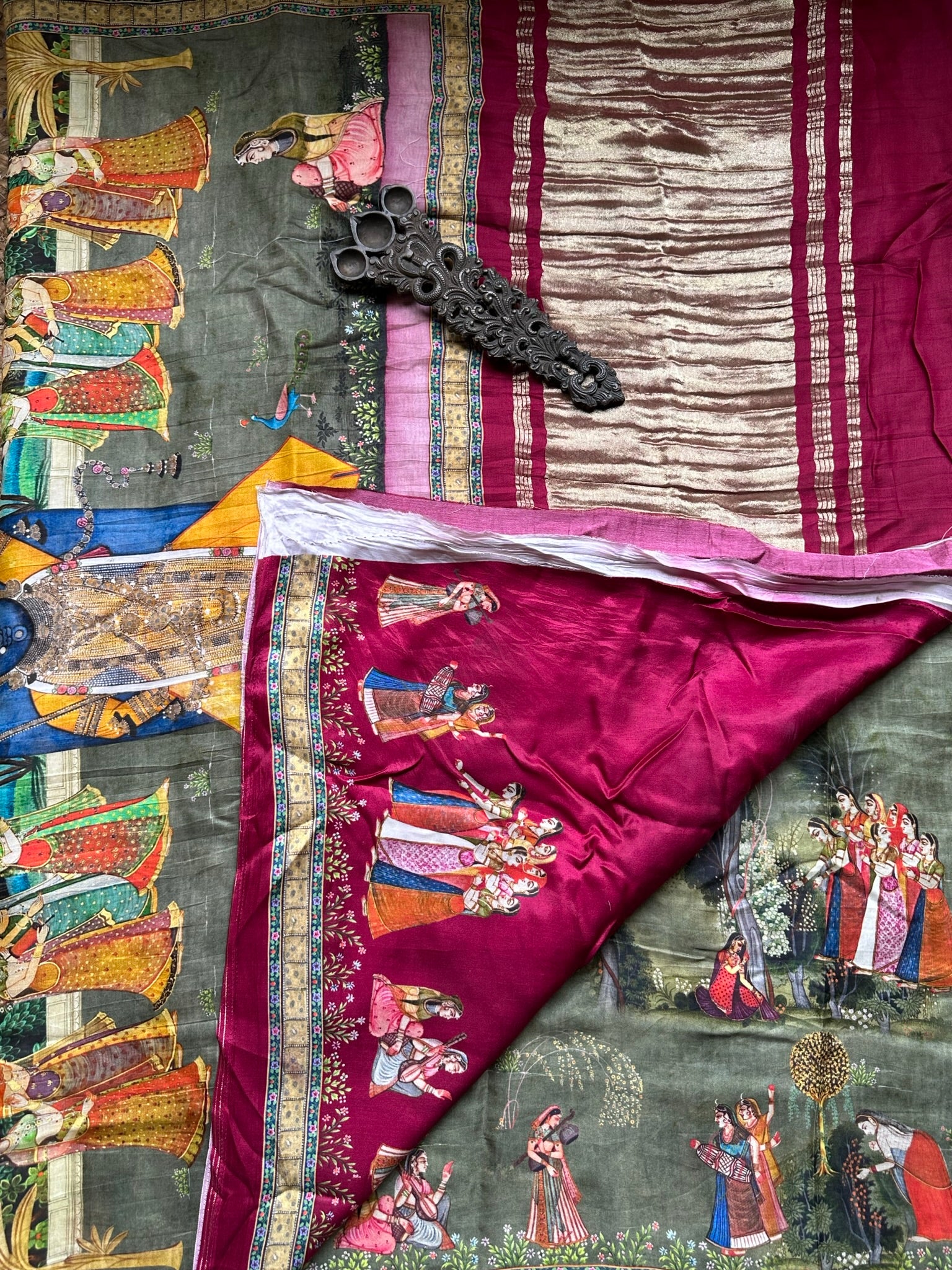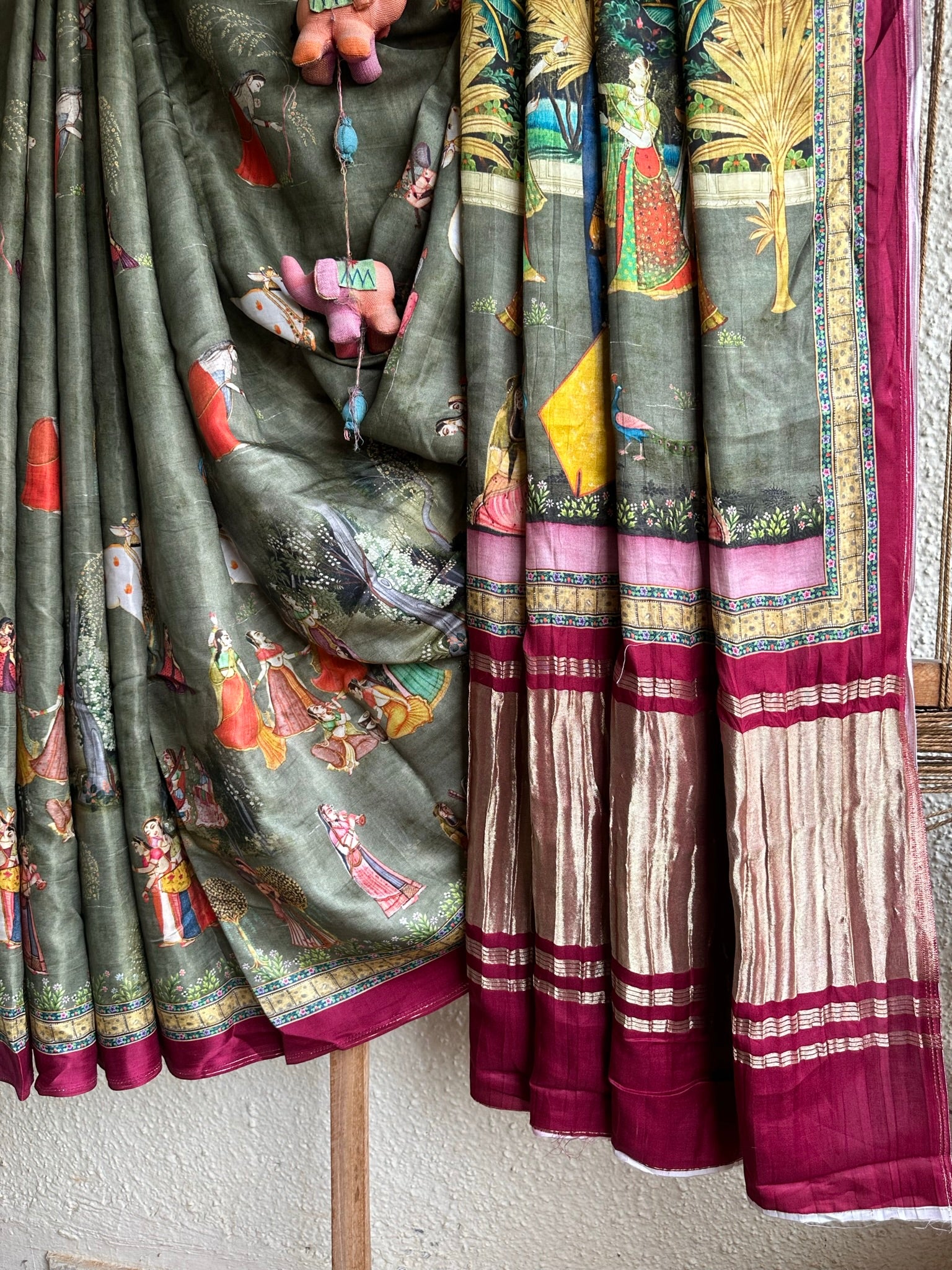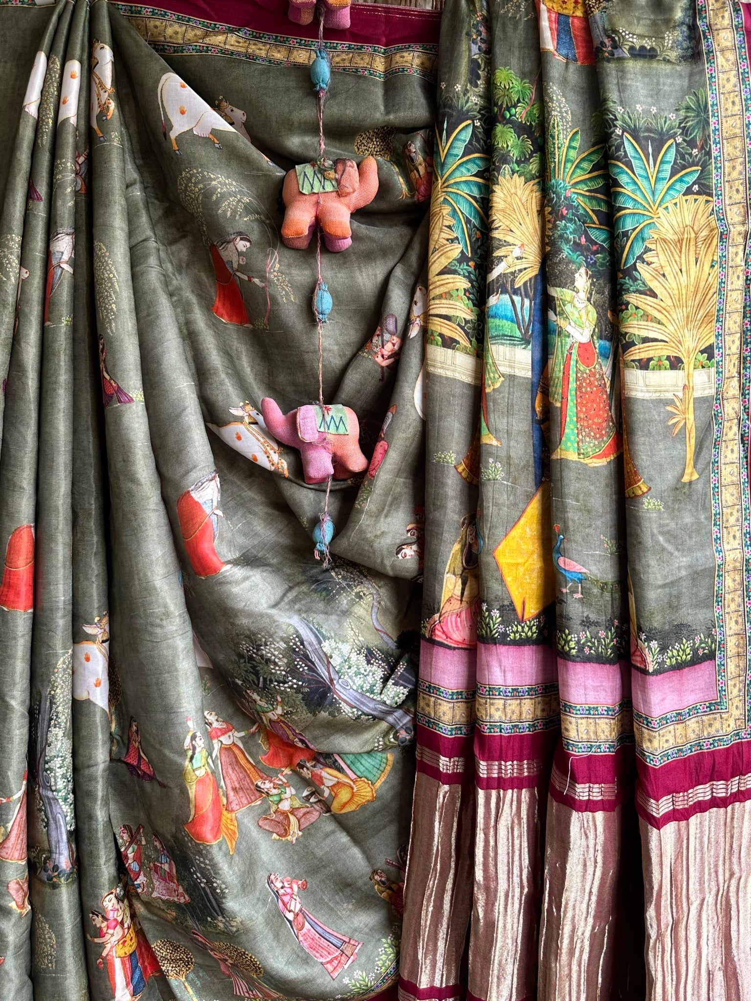 grey maroon pichwai modal silk printed patola sari with nakshi zari border with