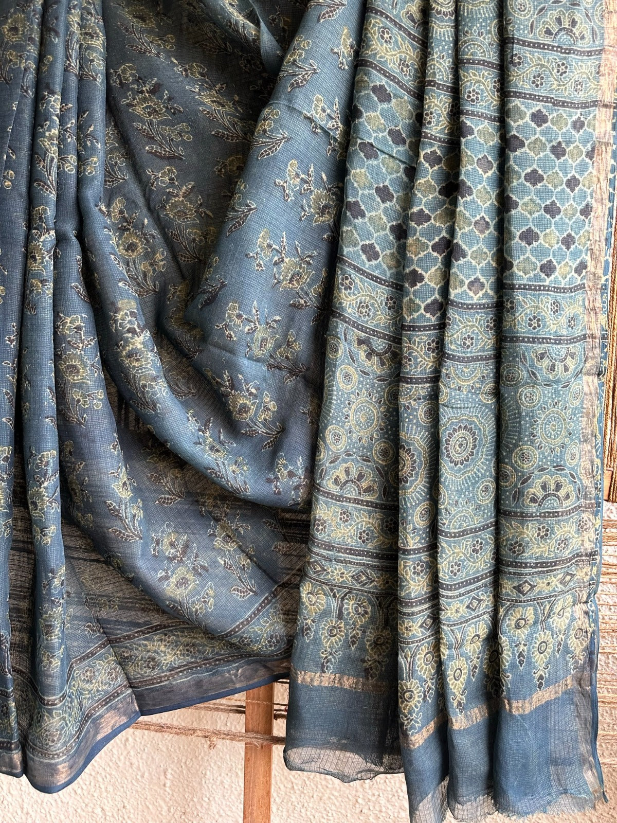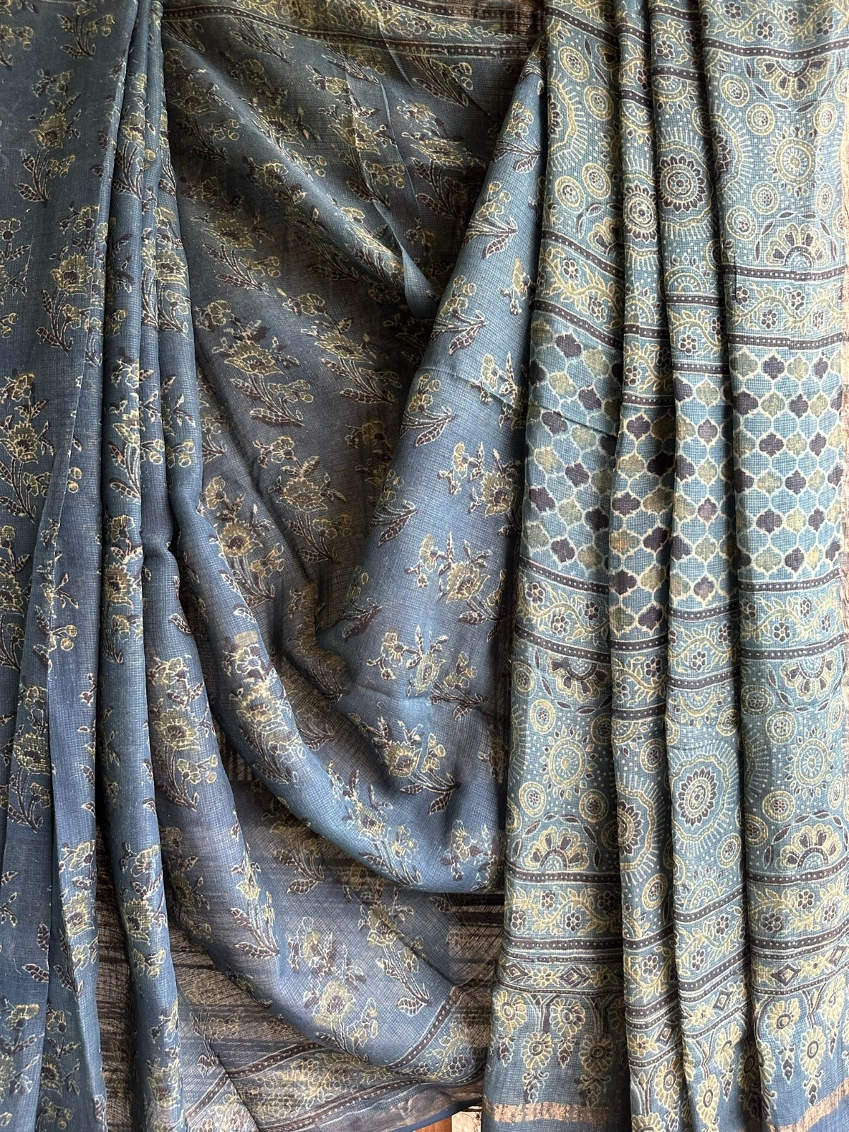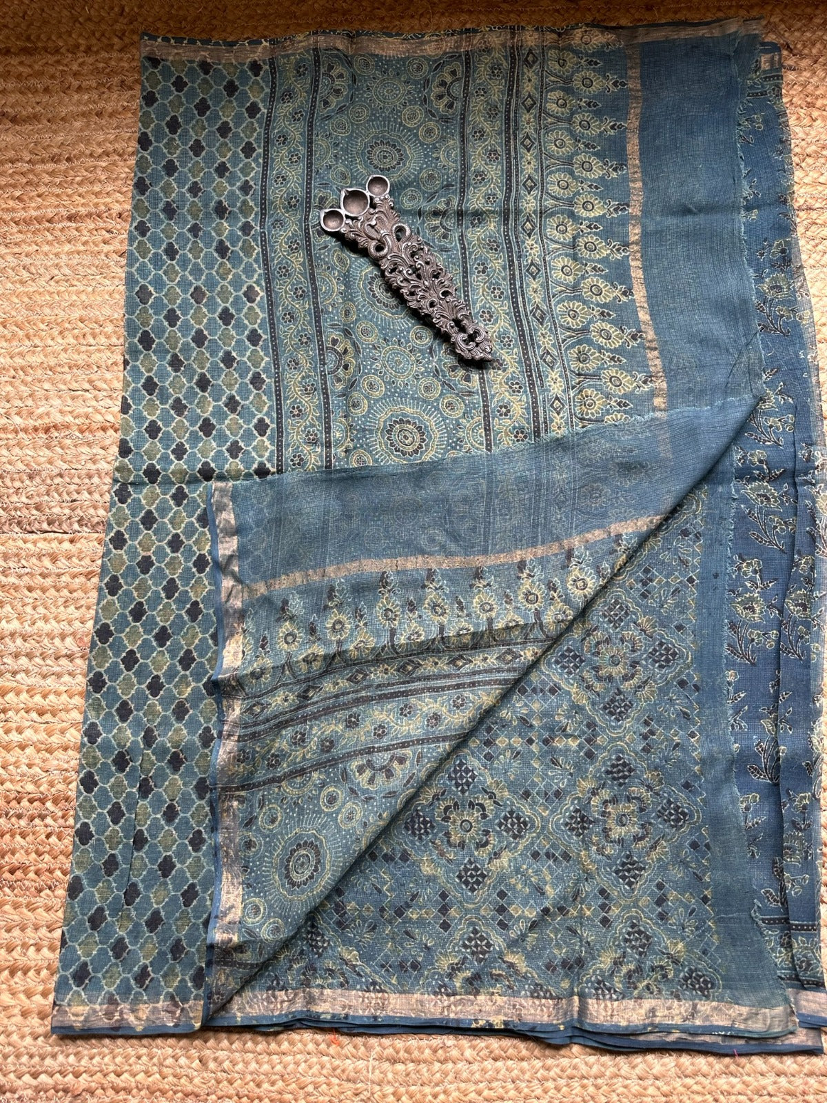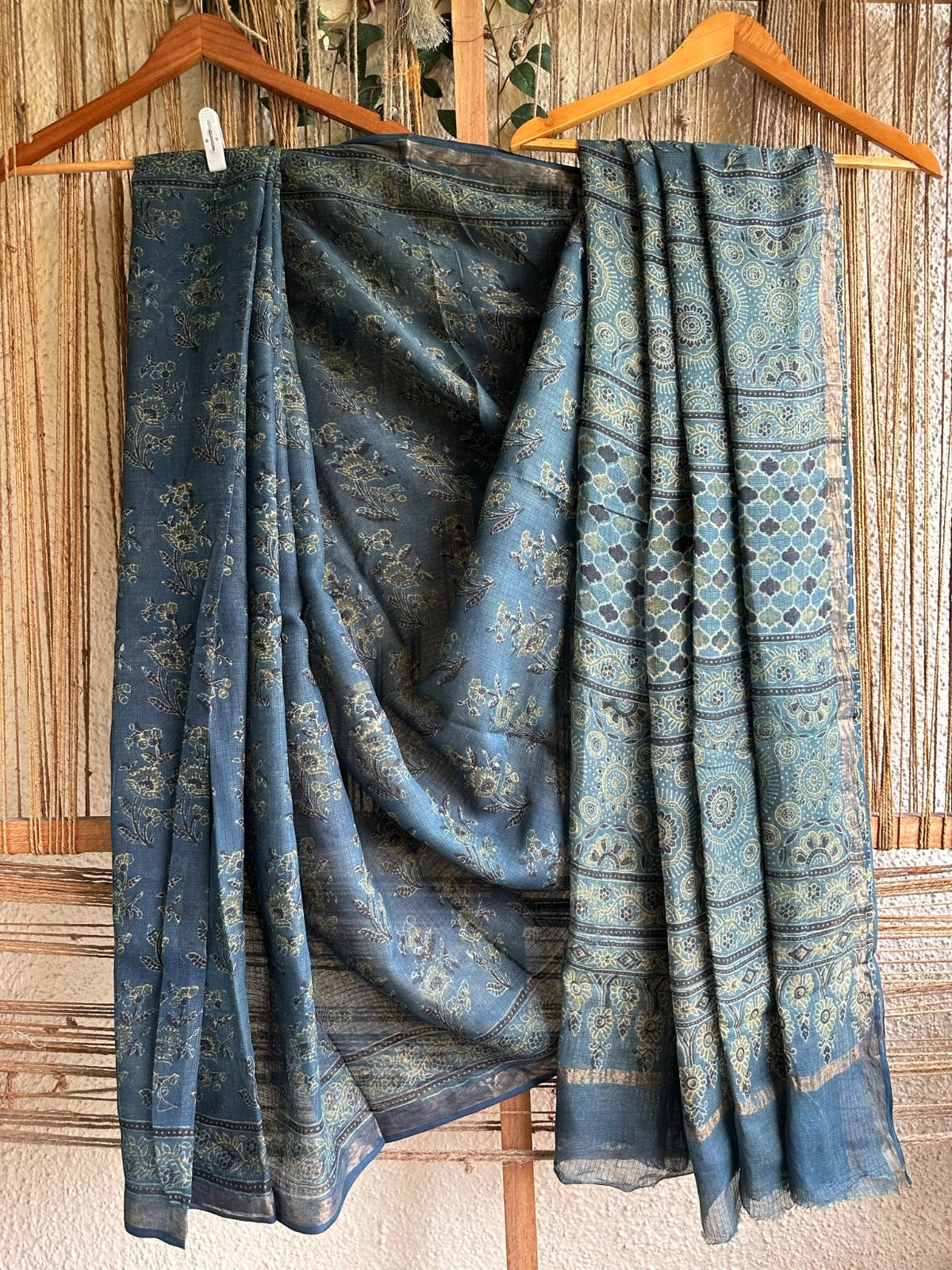 indigo kota ajrakh lining hand block sari, has its own running blouse piece