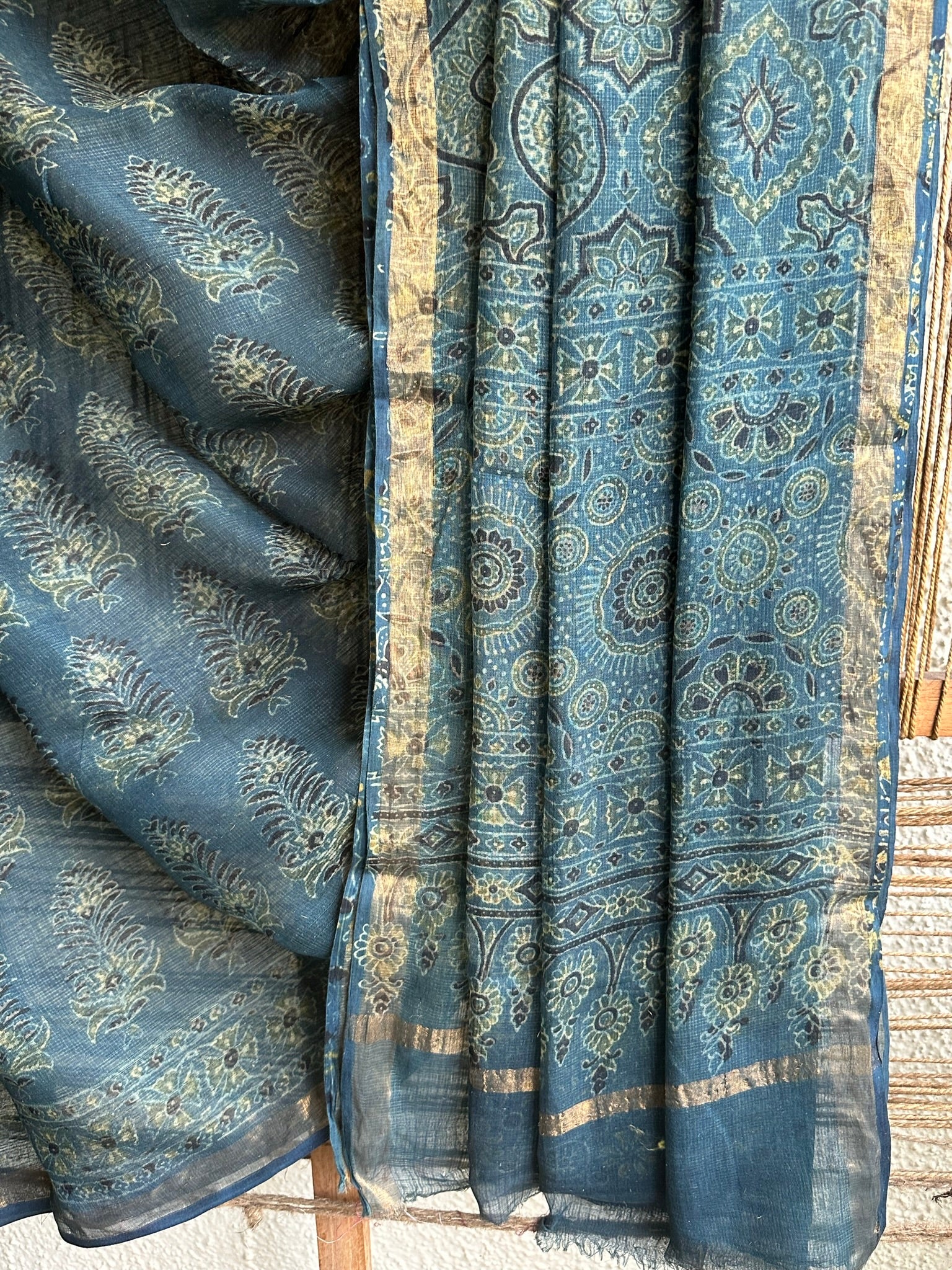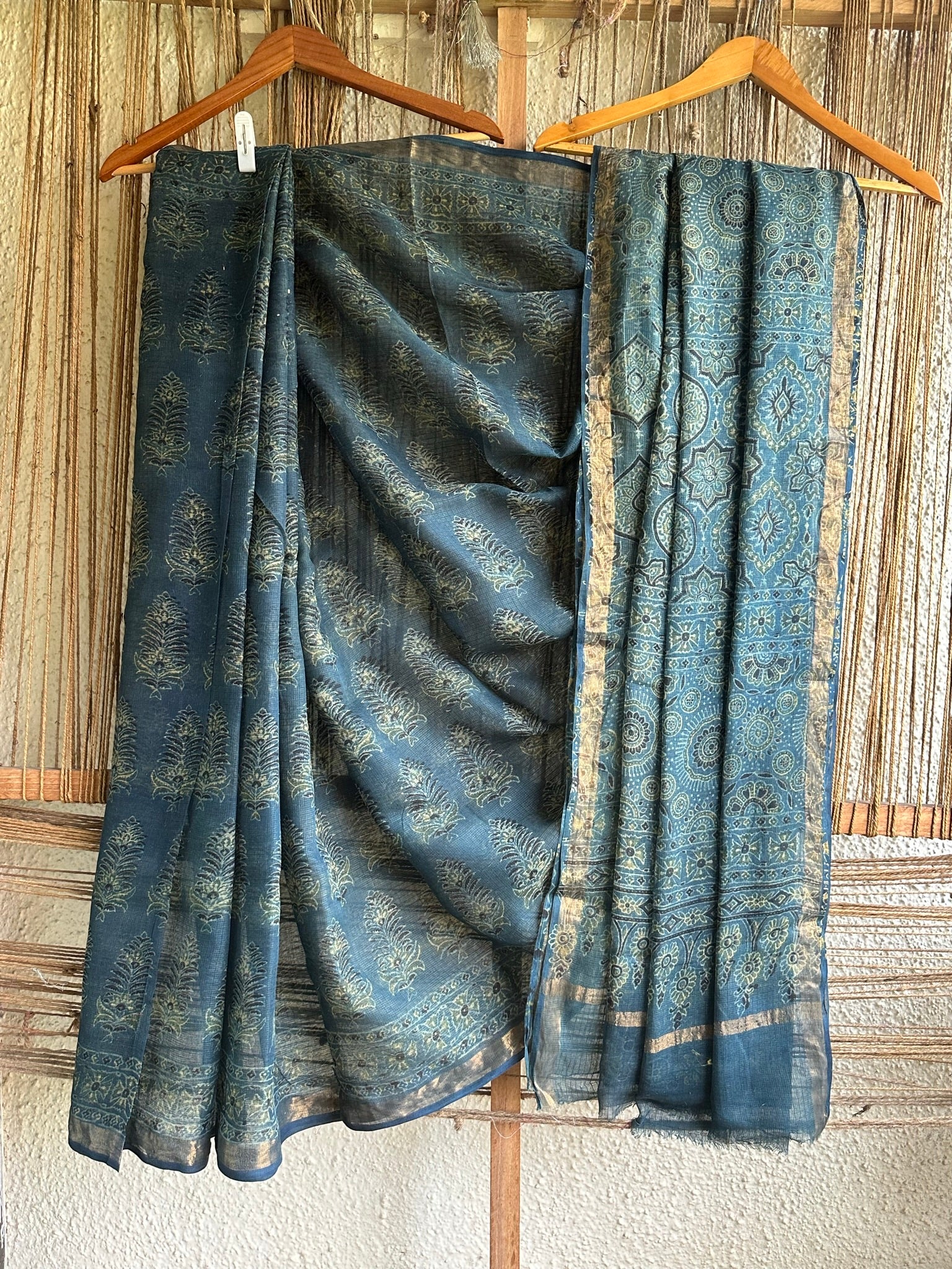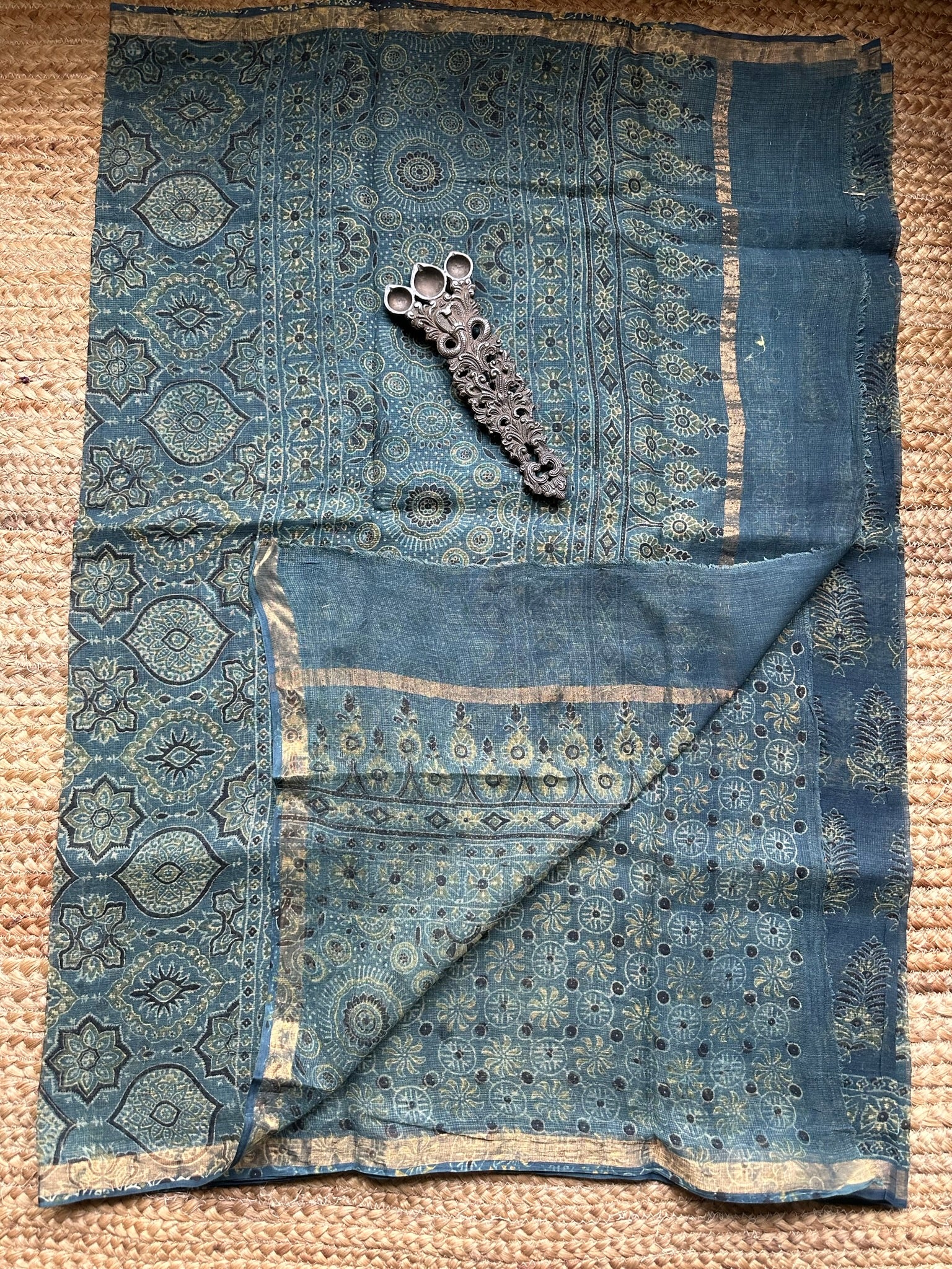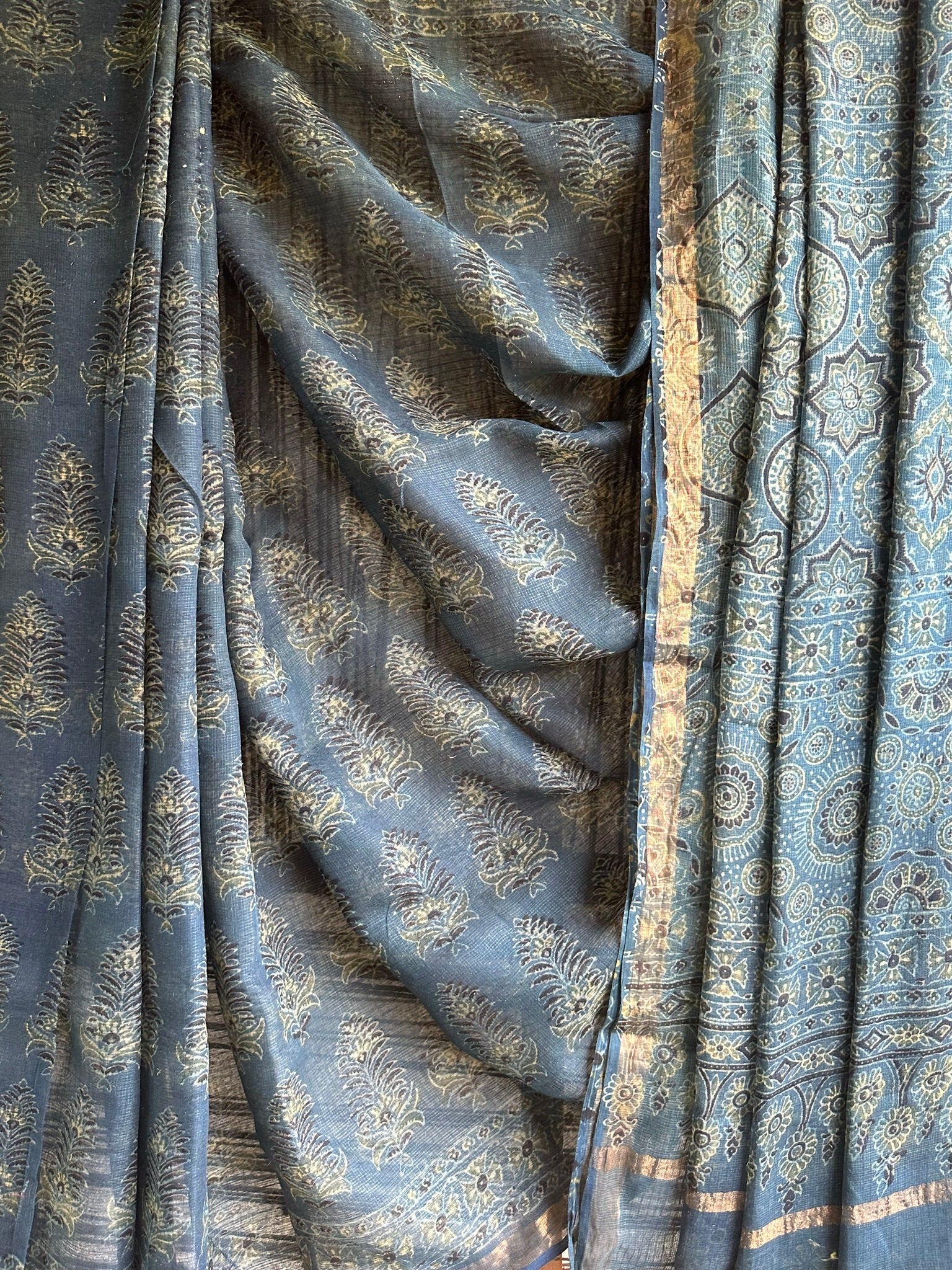 indigo kota print with ajrakh lining handblock sari, has its own running blouse piece