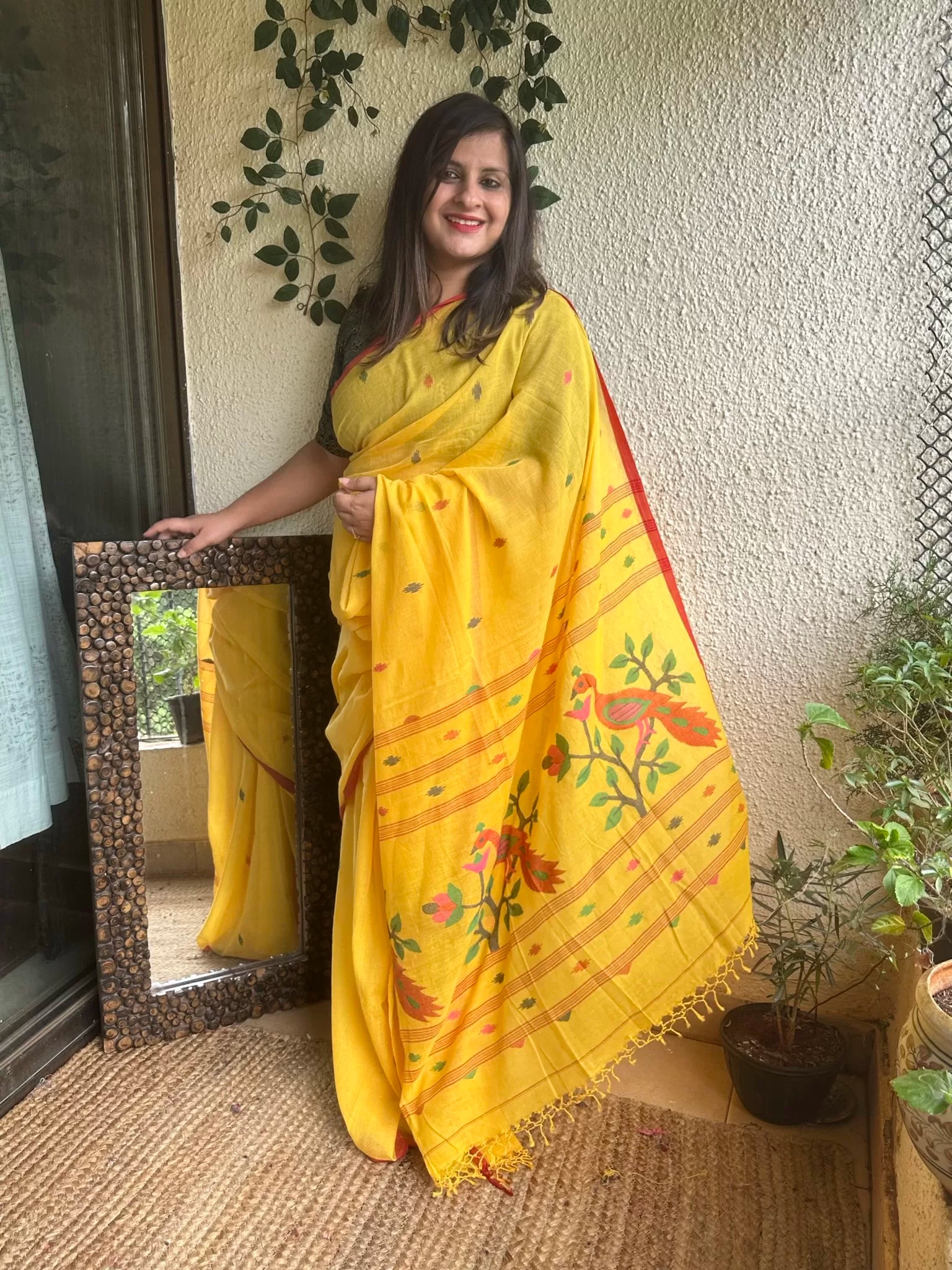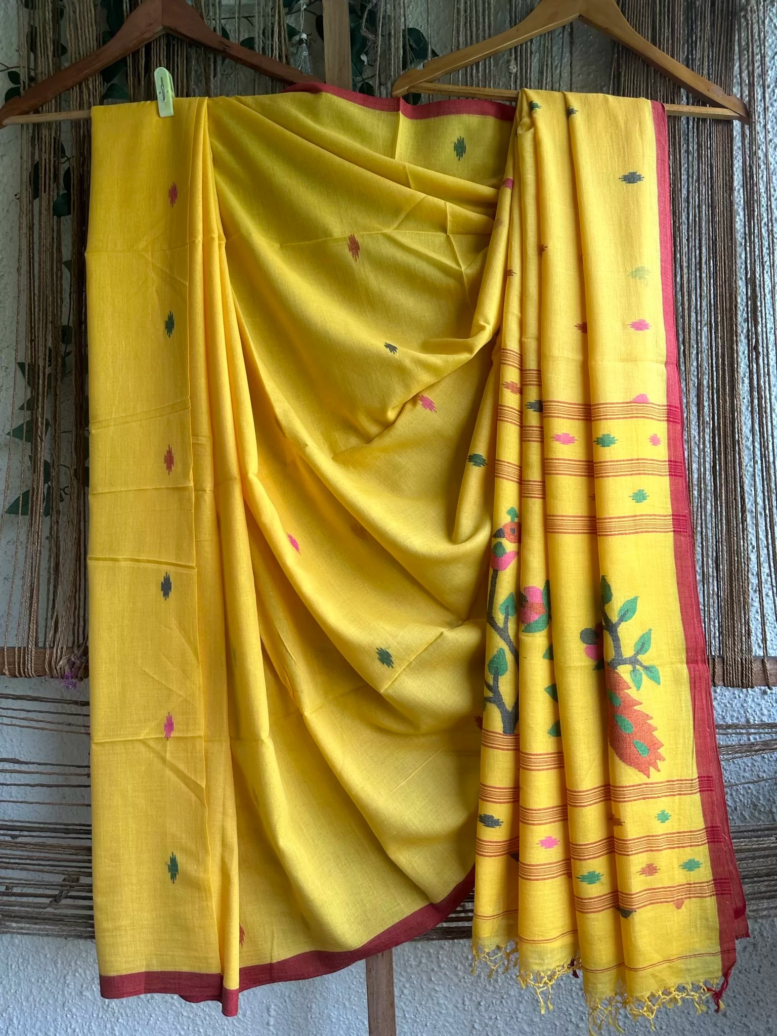 mango yellow jamdani cotton handloom saree with thread tassels at the end