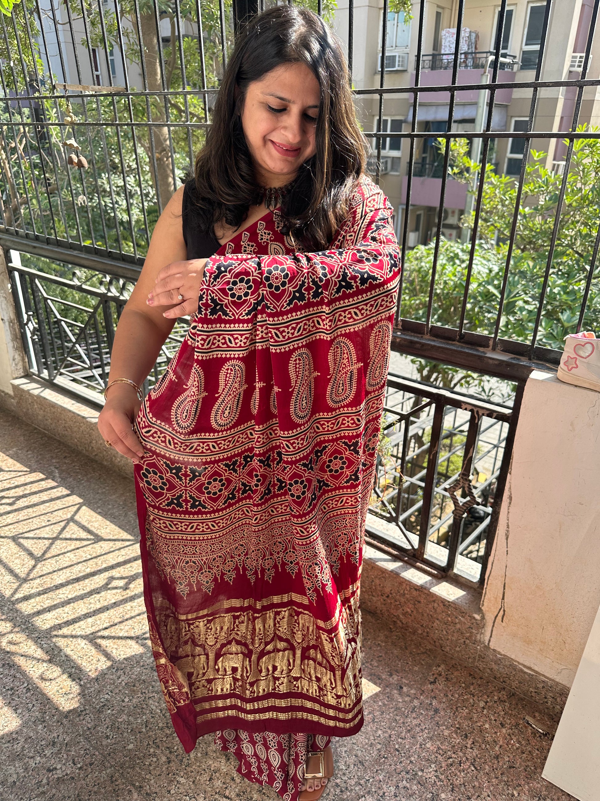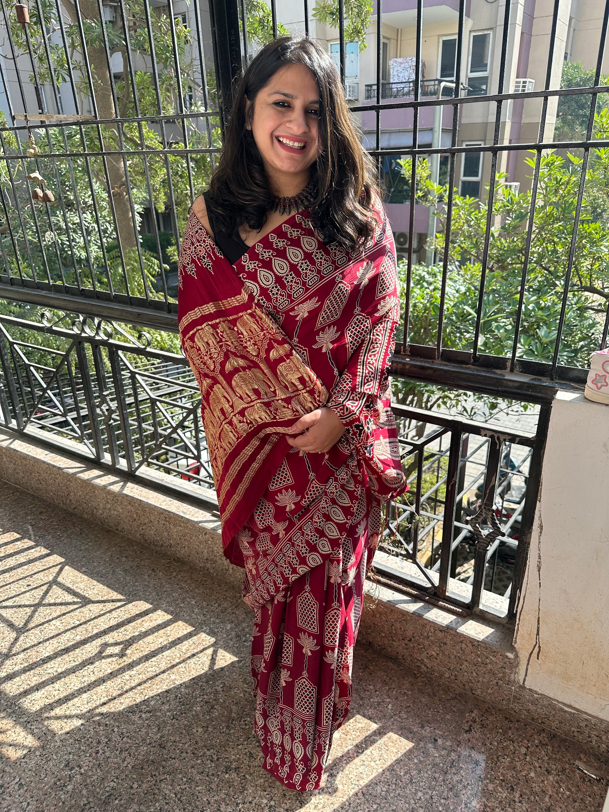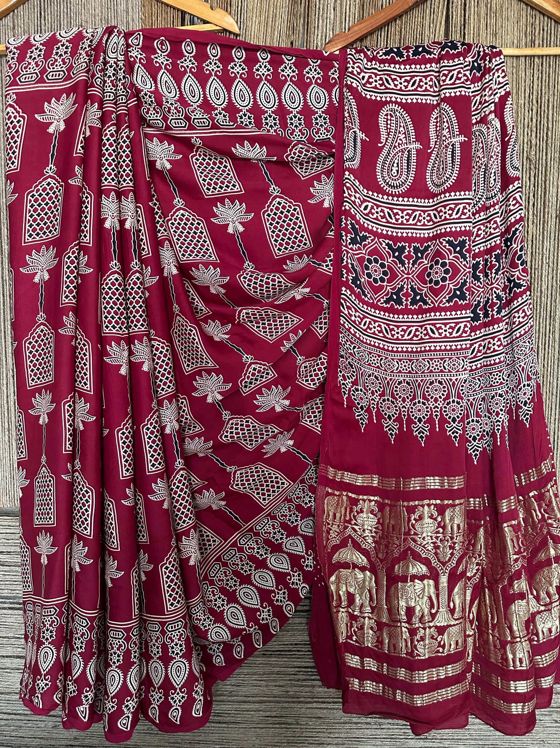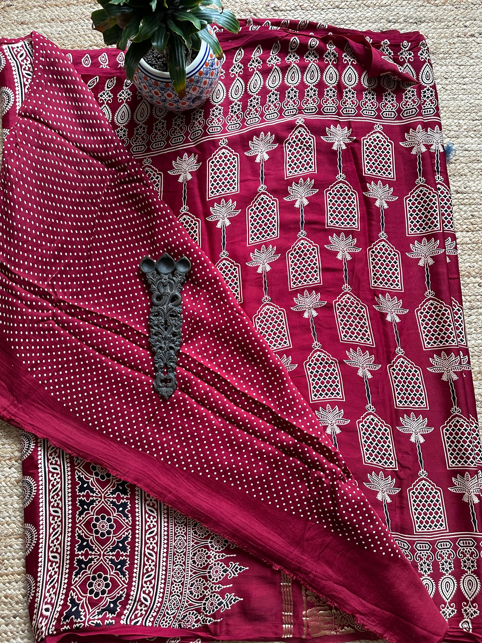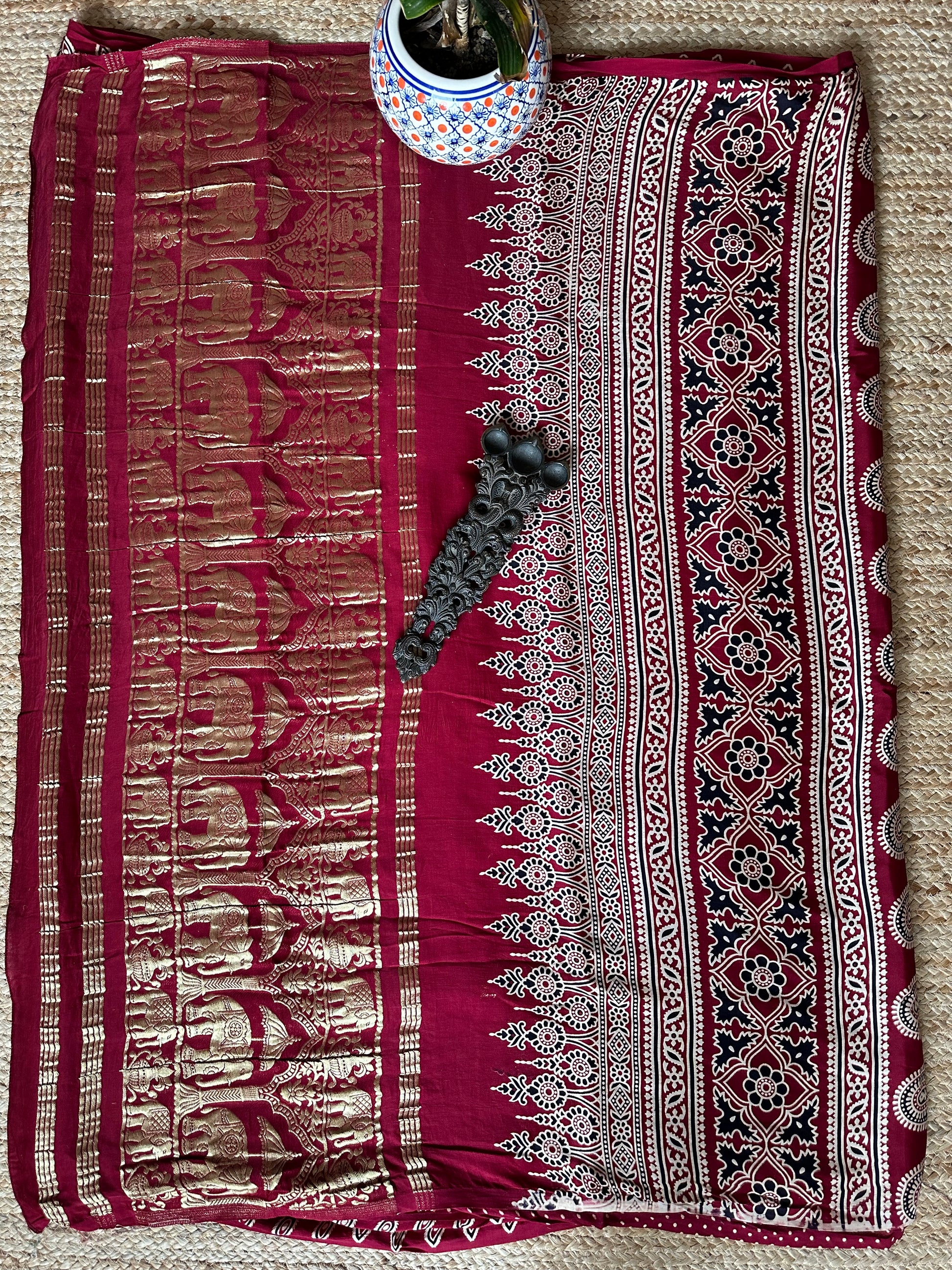 MAROON AJRAKH PRINT MODAL SILK SARI WITH ZARI BORDER