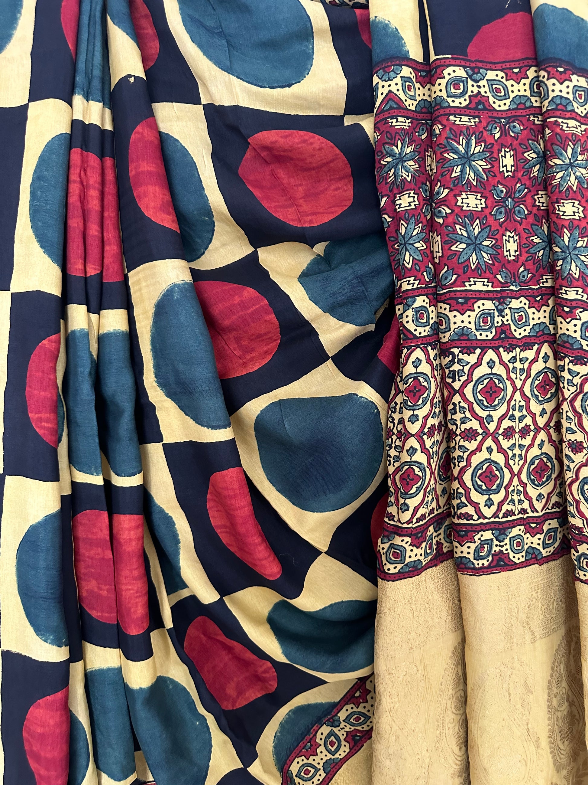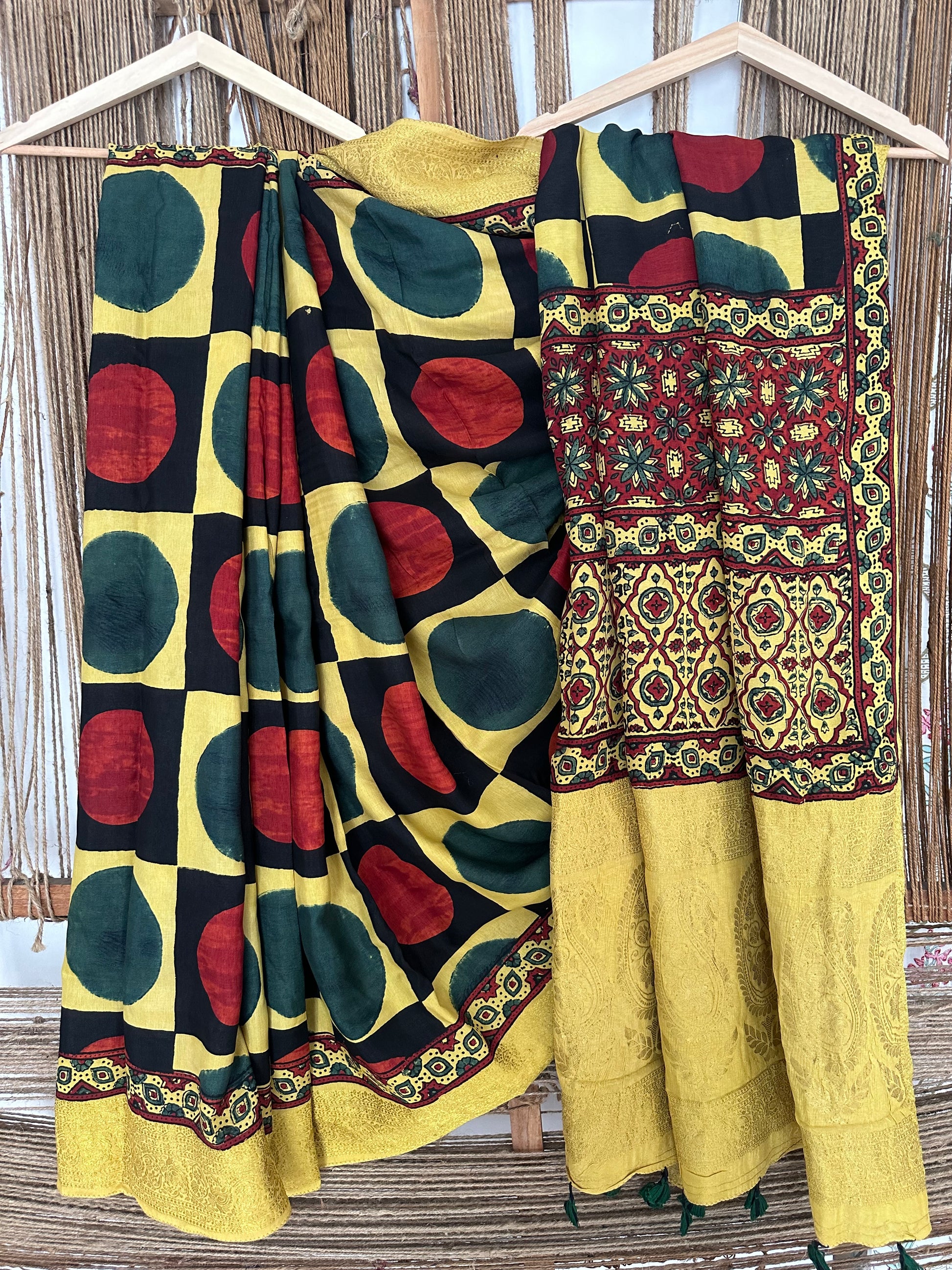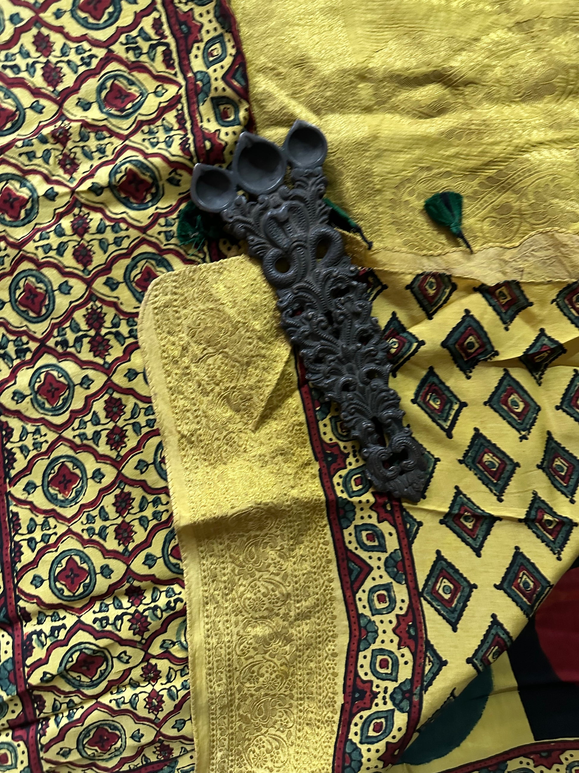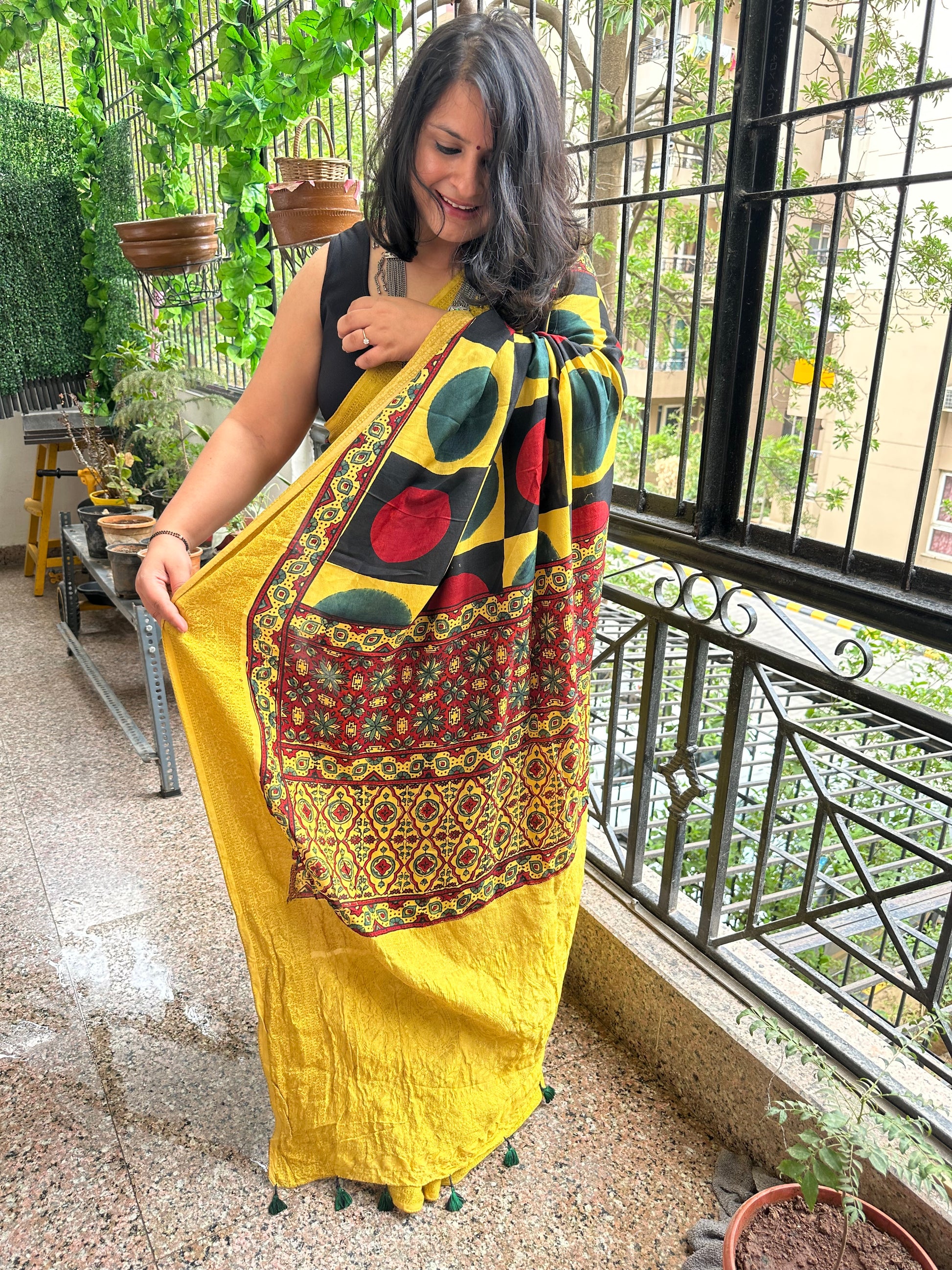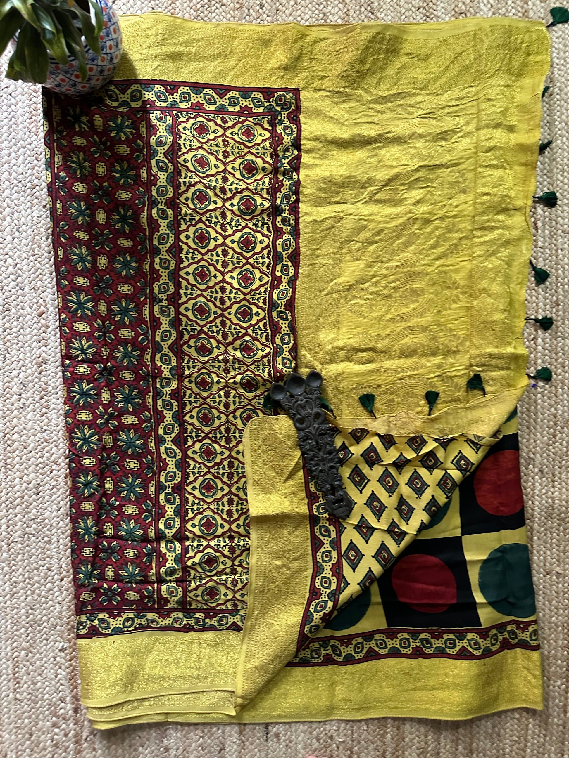 MUSTARD MAROON DOLA SILK AJRAKH ZARI BORDER SARI