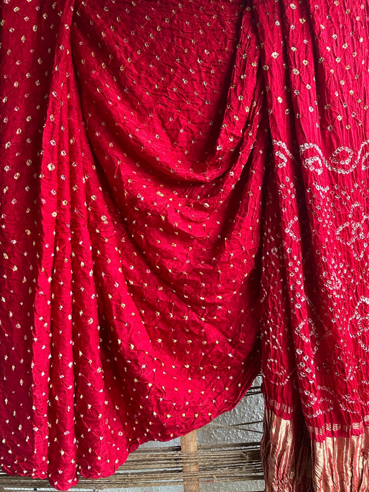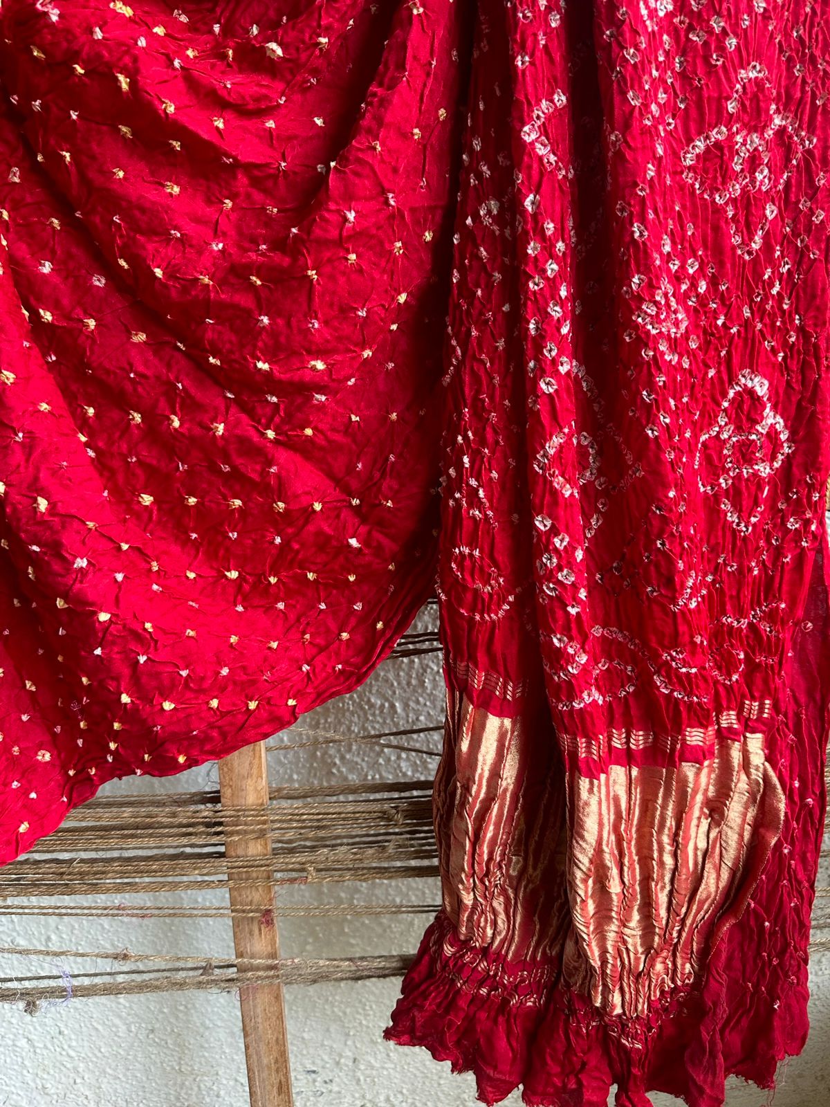 red modal silk bandhani handknotted zari woven sari with blouse piece