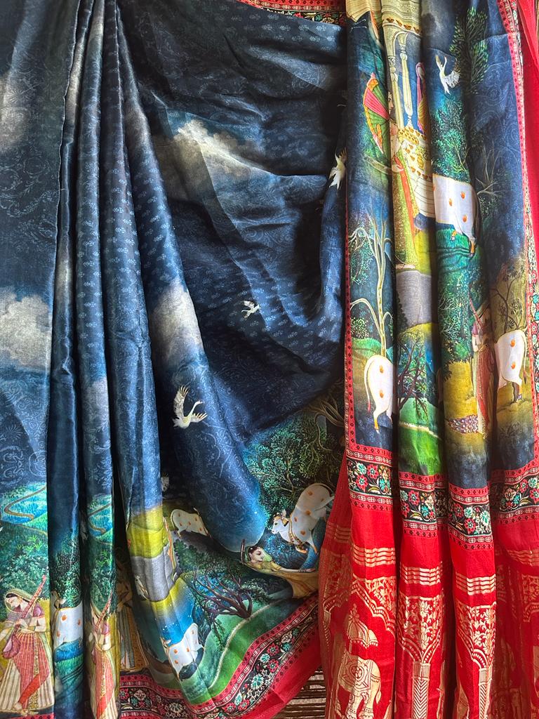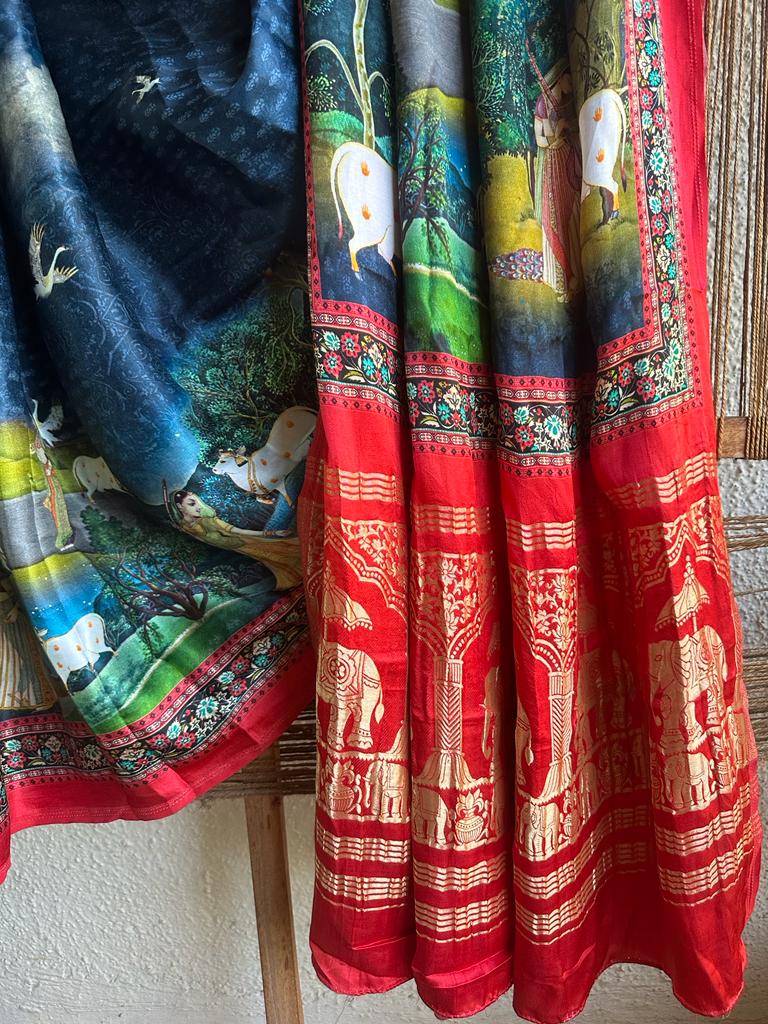 ROYAL BLUE AND RED PICHWAI MODAL SILK PRINTED PATOLA SARI WITH NAKSHI ZARI BORDER WITH