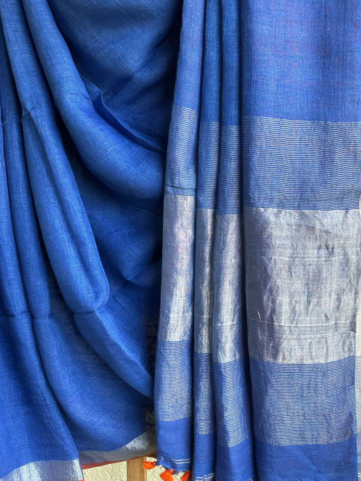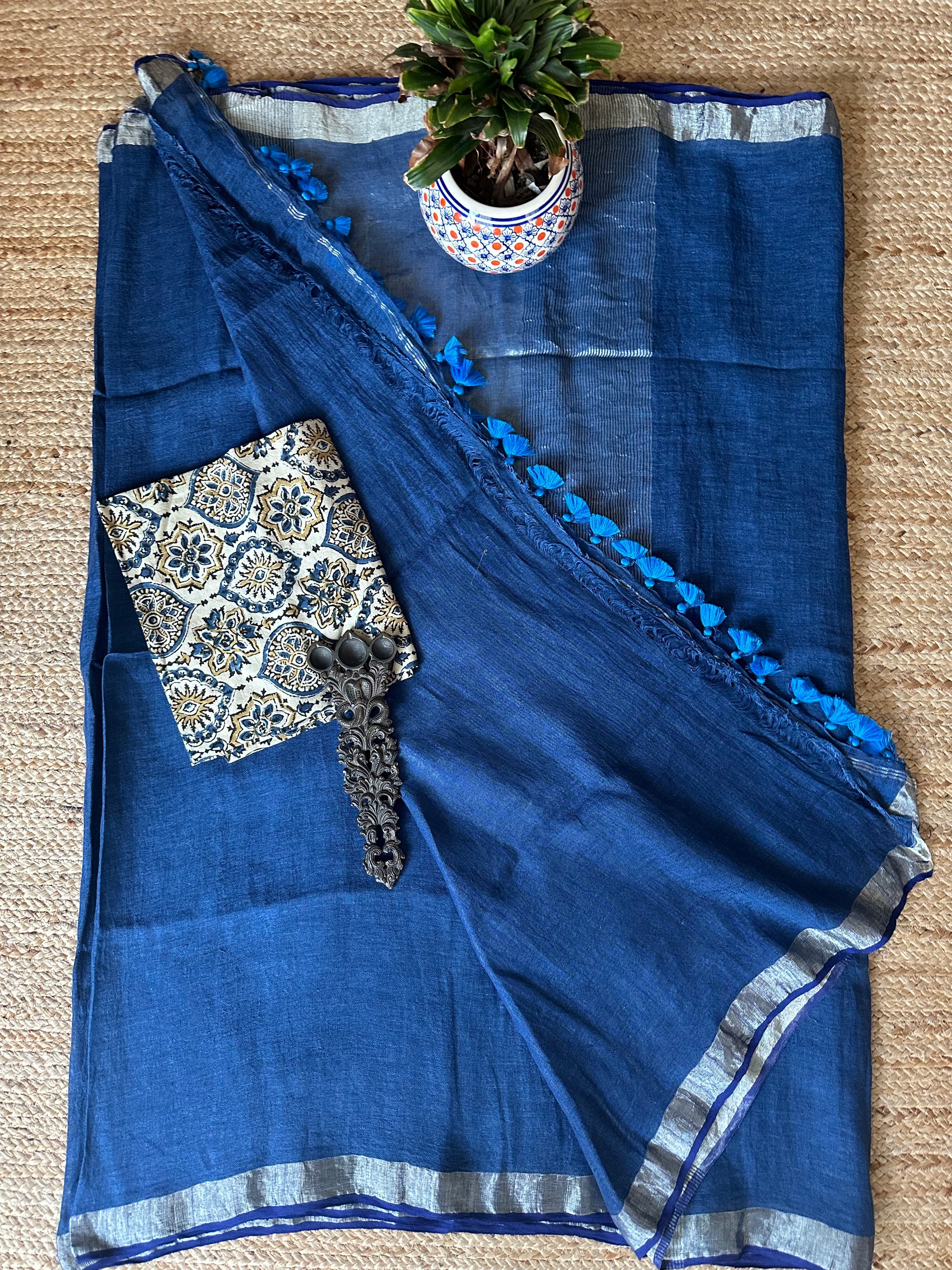 ROYAL BLUE LINEN COTTON SARI WITH WOVEN WHITE BORDER AND PALLA SIZE: 5.56 MTRS (Excluding 86 CMS BLOUSE) X 46" COMES WITH ITS OWN BLOUSE AND AN EXTRA PRINT COTTON BLOUSE PIECE (90 cms) THE SAREES ARE NATURAL DYED HENCE THEY ARE NOT AS BRIGHT AS SEEN IN PICTURES. A SLIGHT DIFFERENCE IN SHADE COULD BE DUE TO THE CAMERA & LIGHTS. EMBRACE THE IMPERFECTION !! HAPPY HANDLOOM DRY CLEAN ONLY