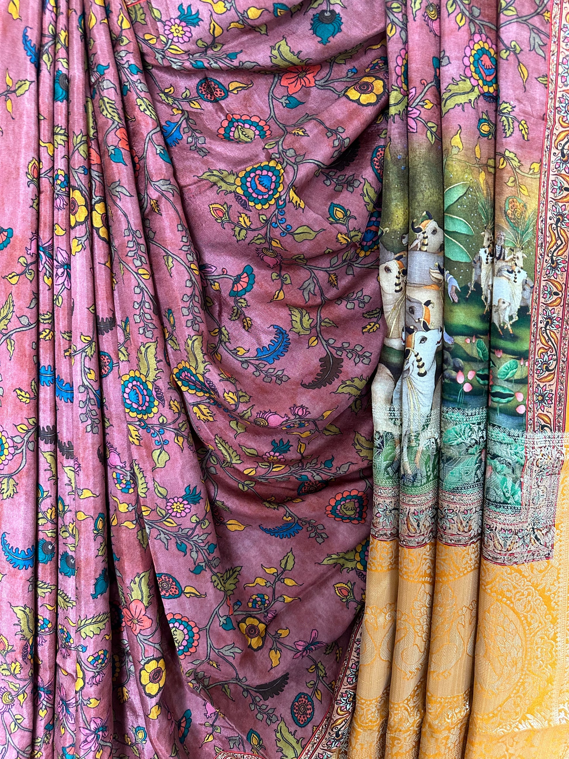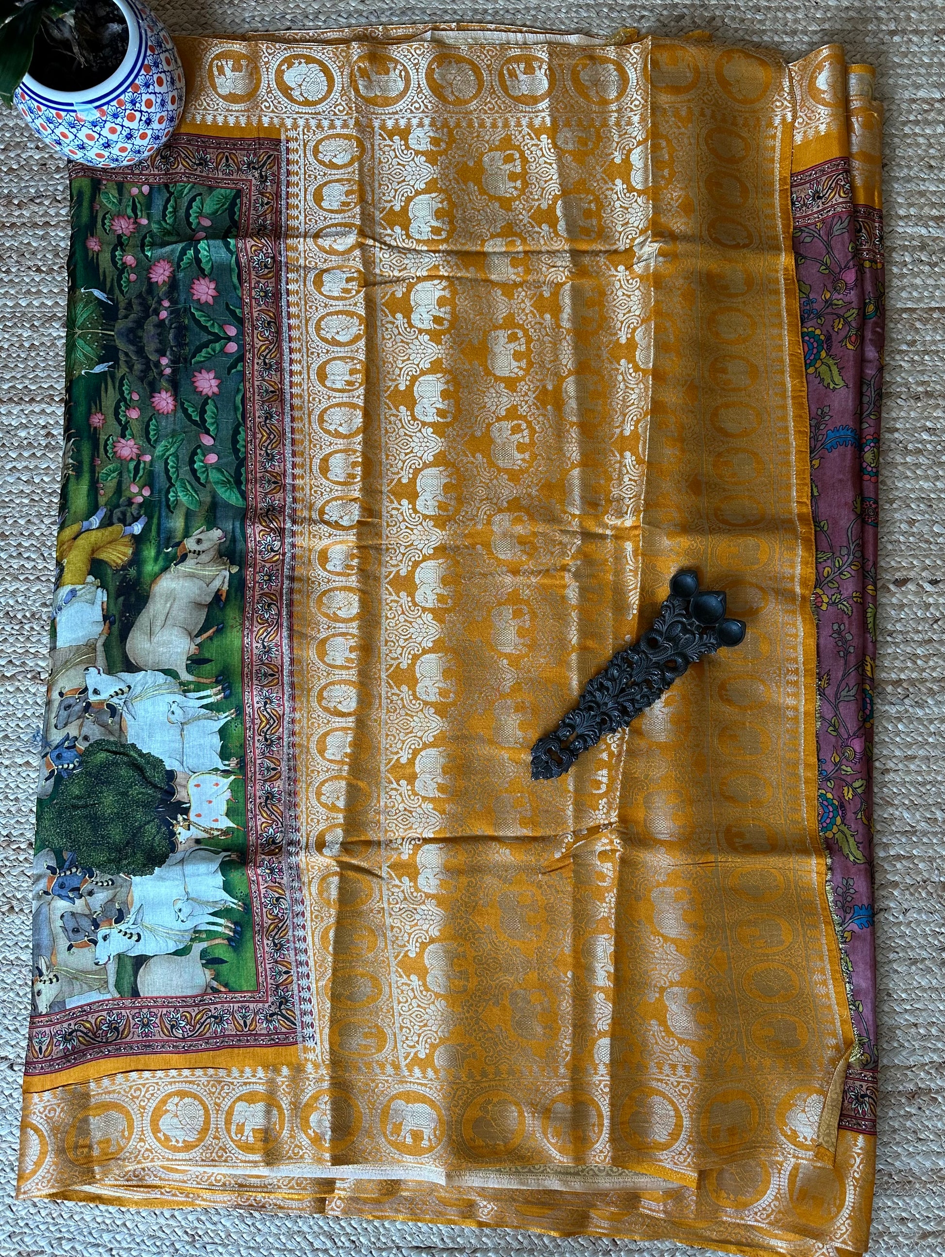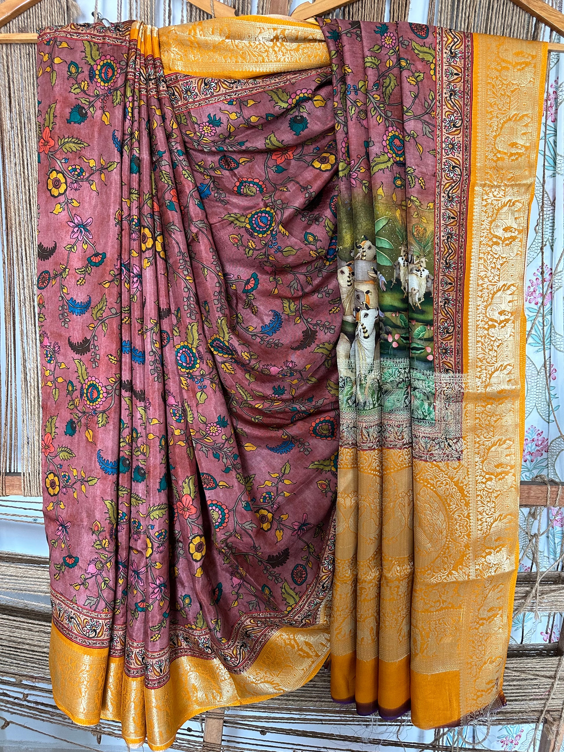 LIGHT BROWN YELLOW SILK PICHWAI PRINT ZARI BORDER SARI