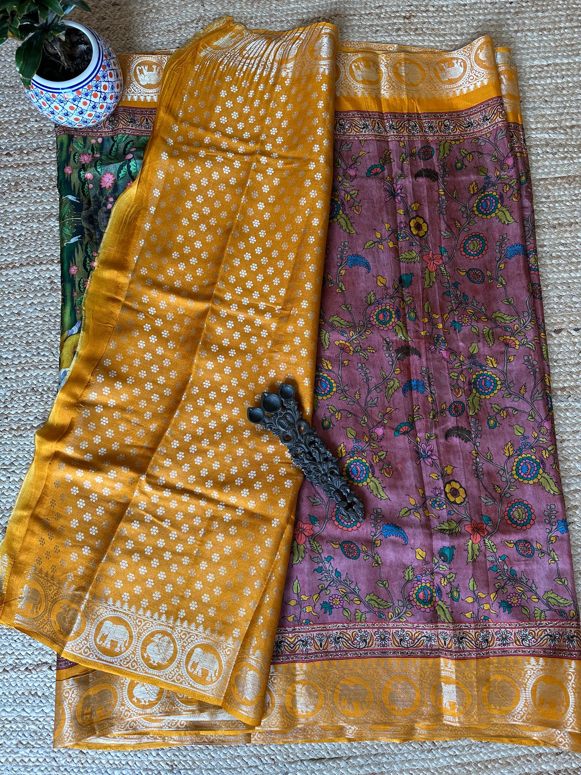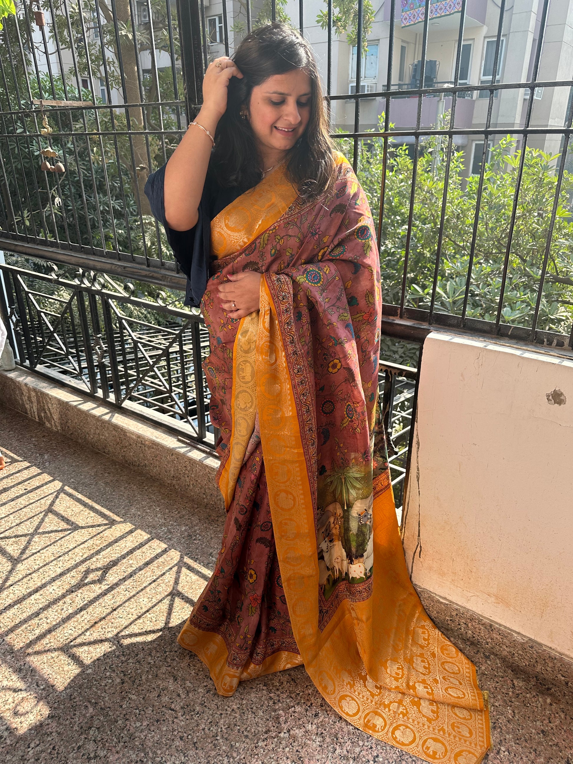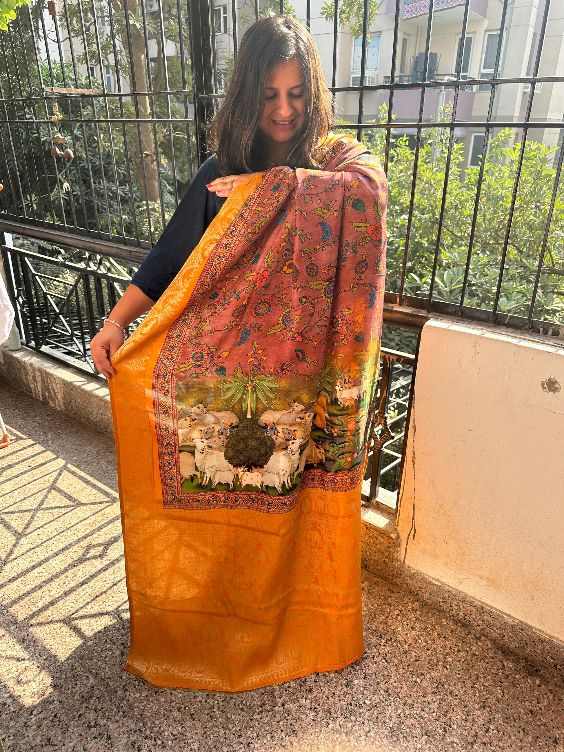 LIGHT BROWN YELLOW SILK PICHWAI PRINT ZARI BORDER SARI