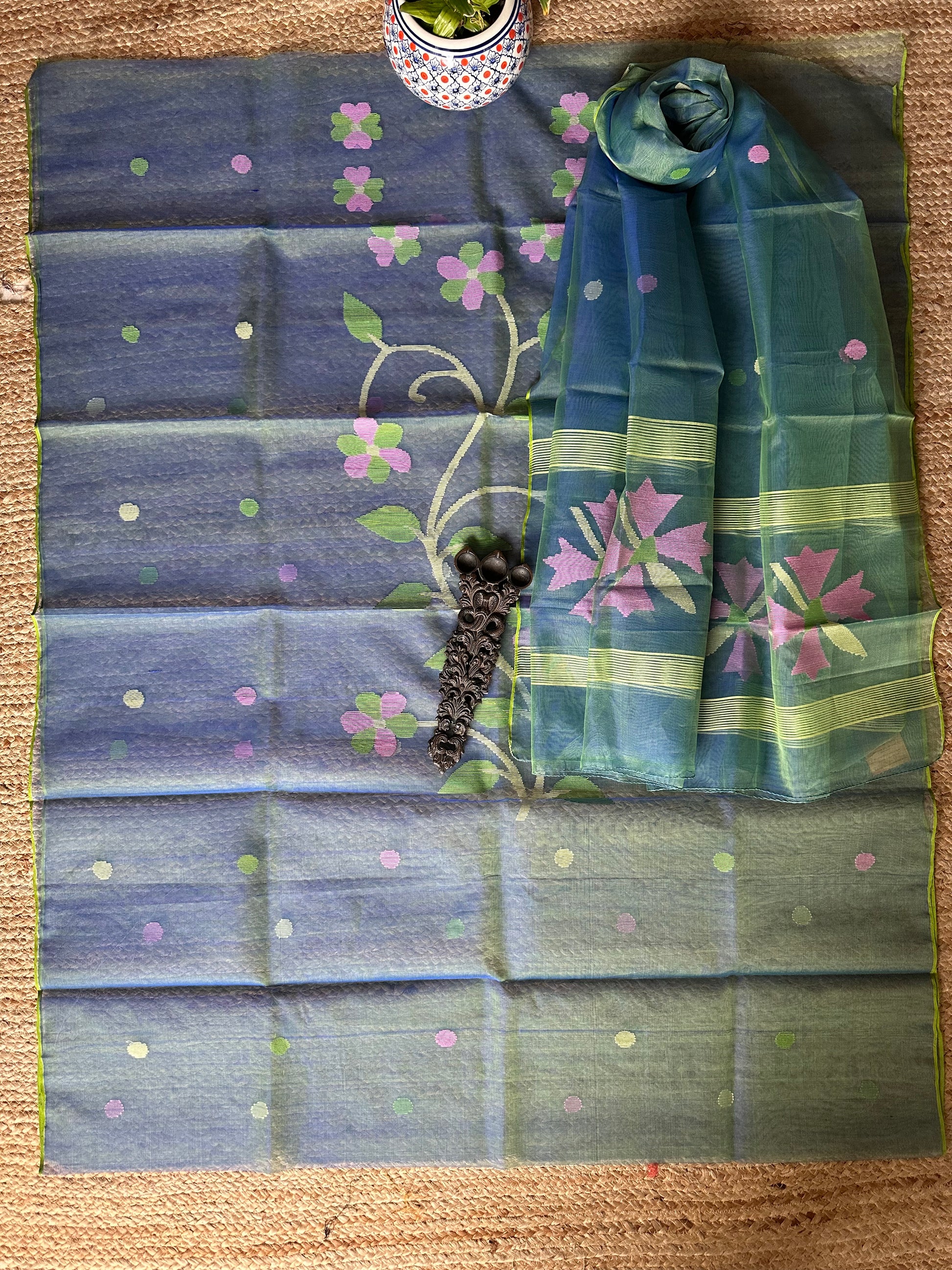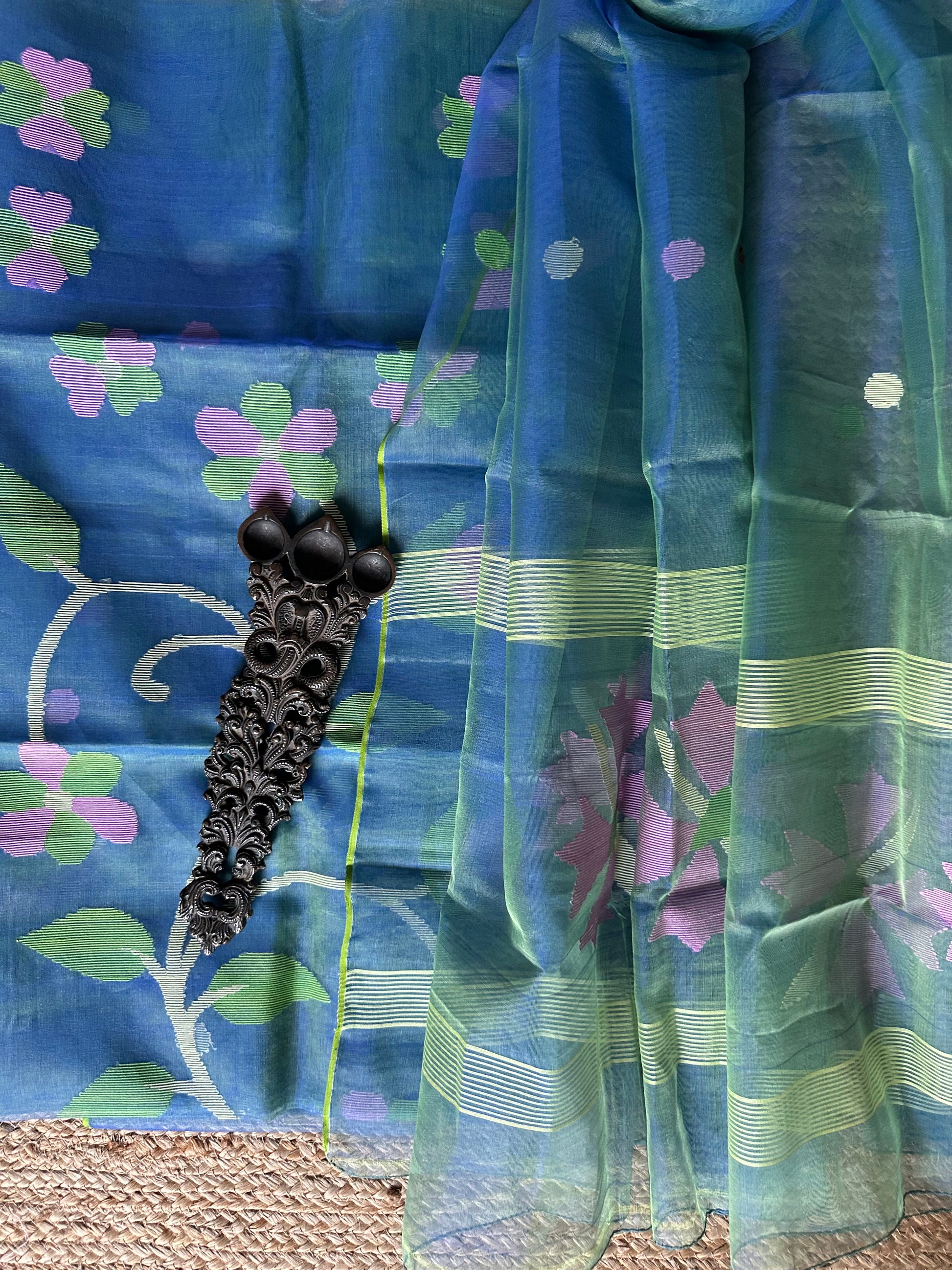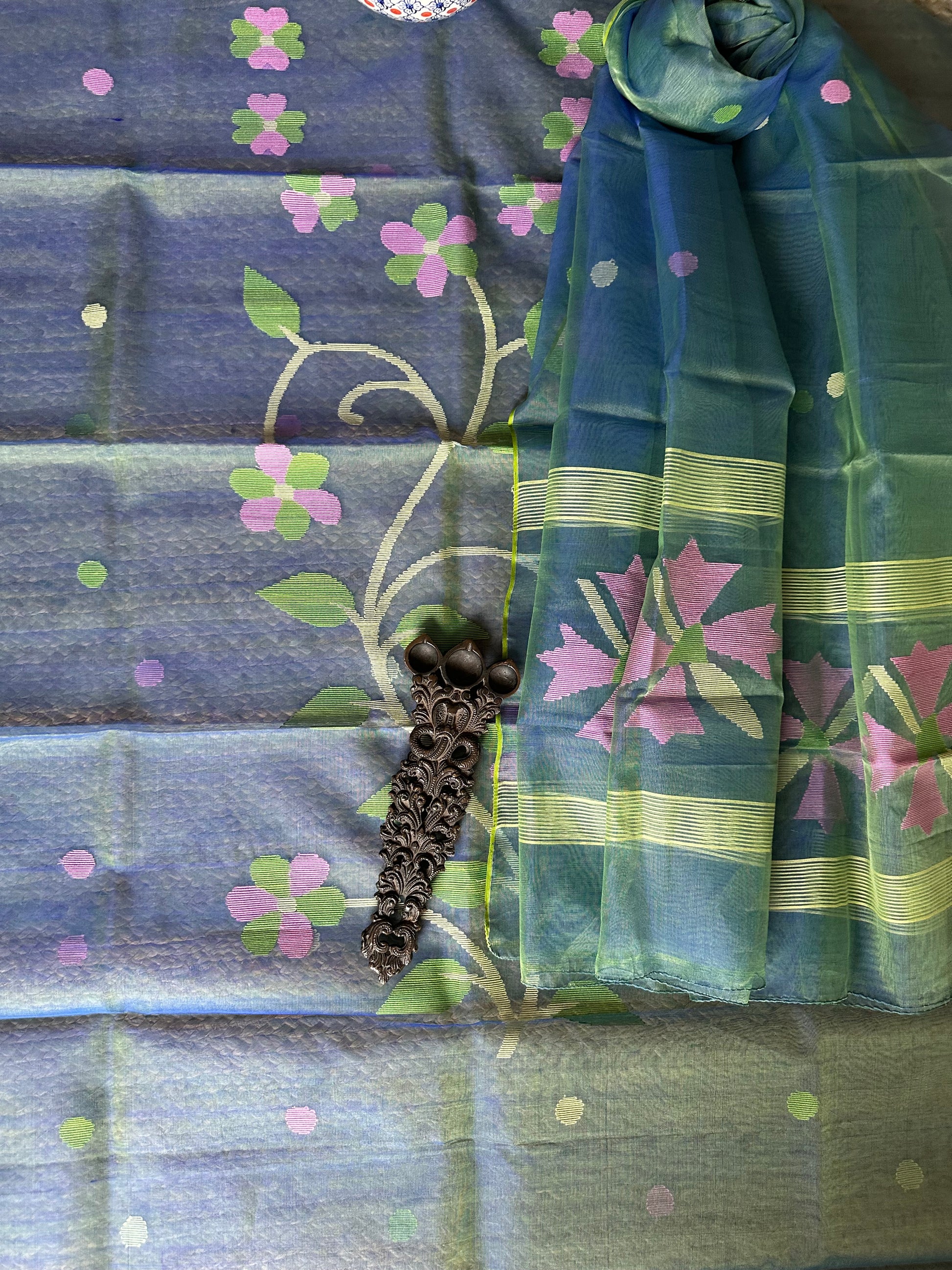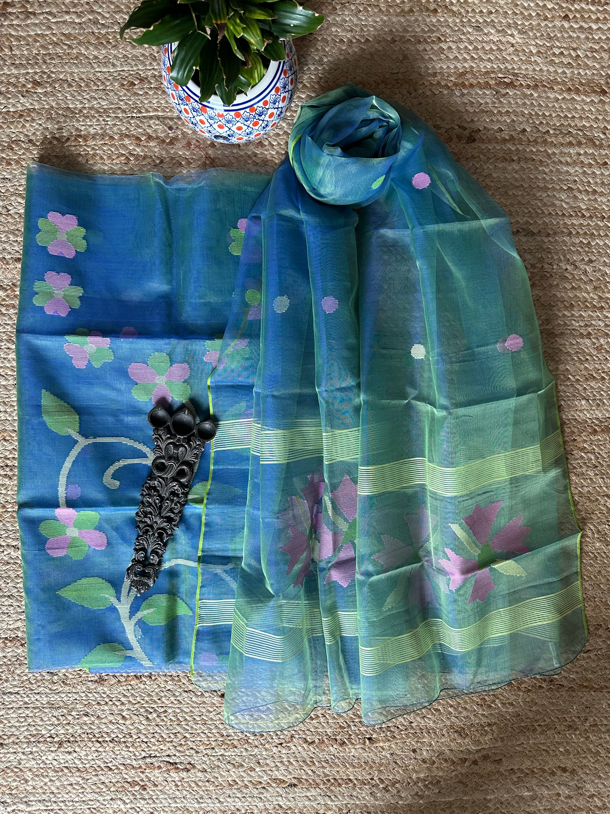 | blue & Green dual shade handwoven pure muslin silk kurta with resham jamdani muslin dupatta fabric: 2.5 mtrs meter dupatta : 2.5 mtrs * 35'' slight difference in shade could be due to camera & lights. embrace the imperfection !! happy handloom dry clean only |