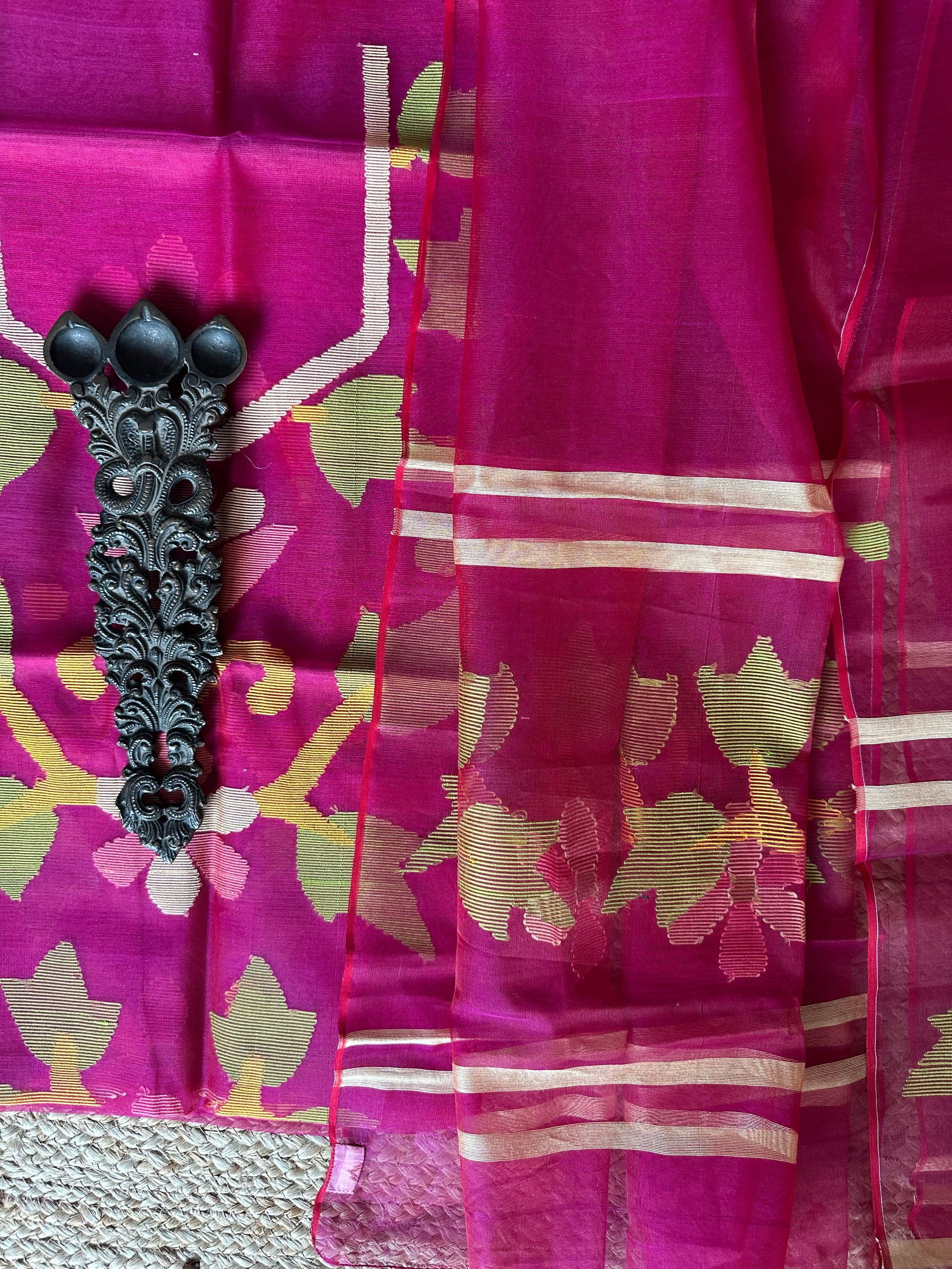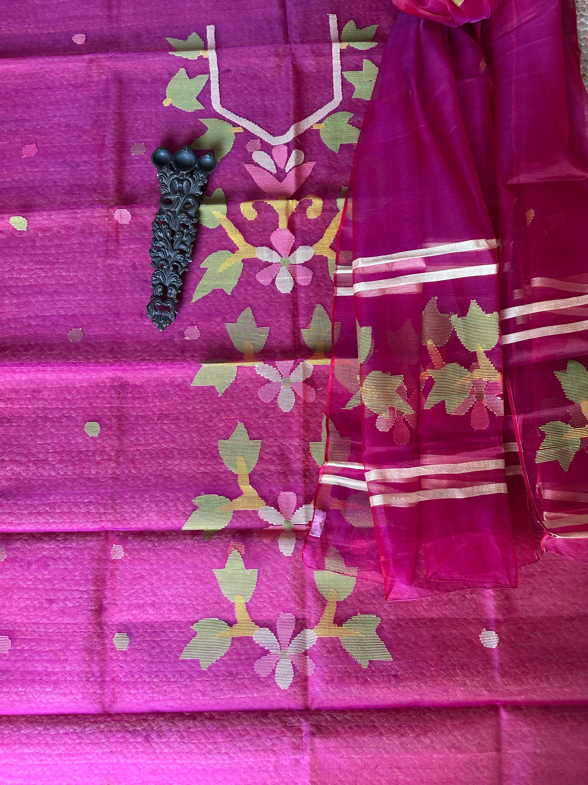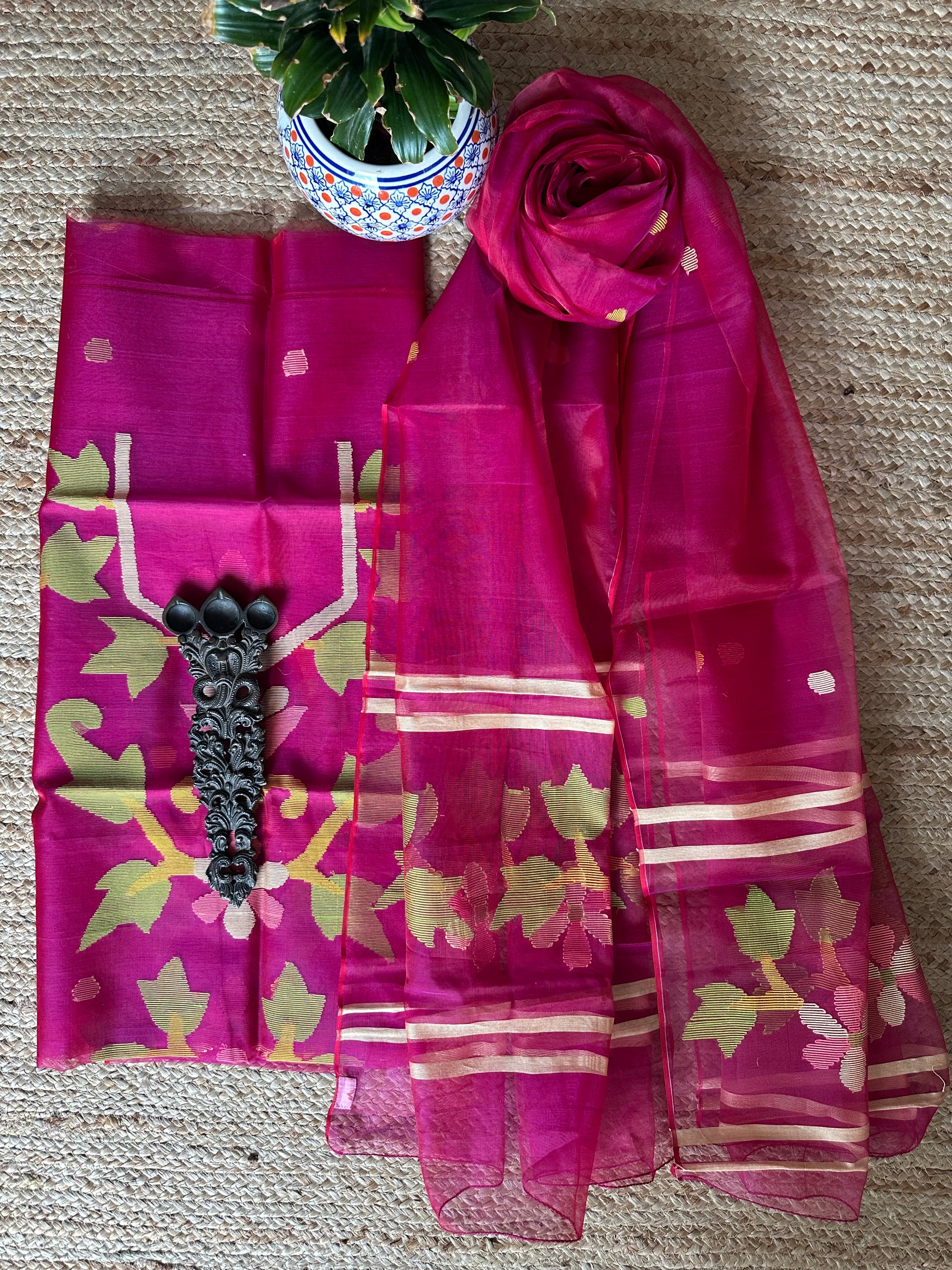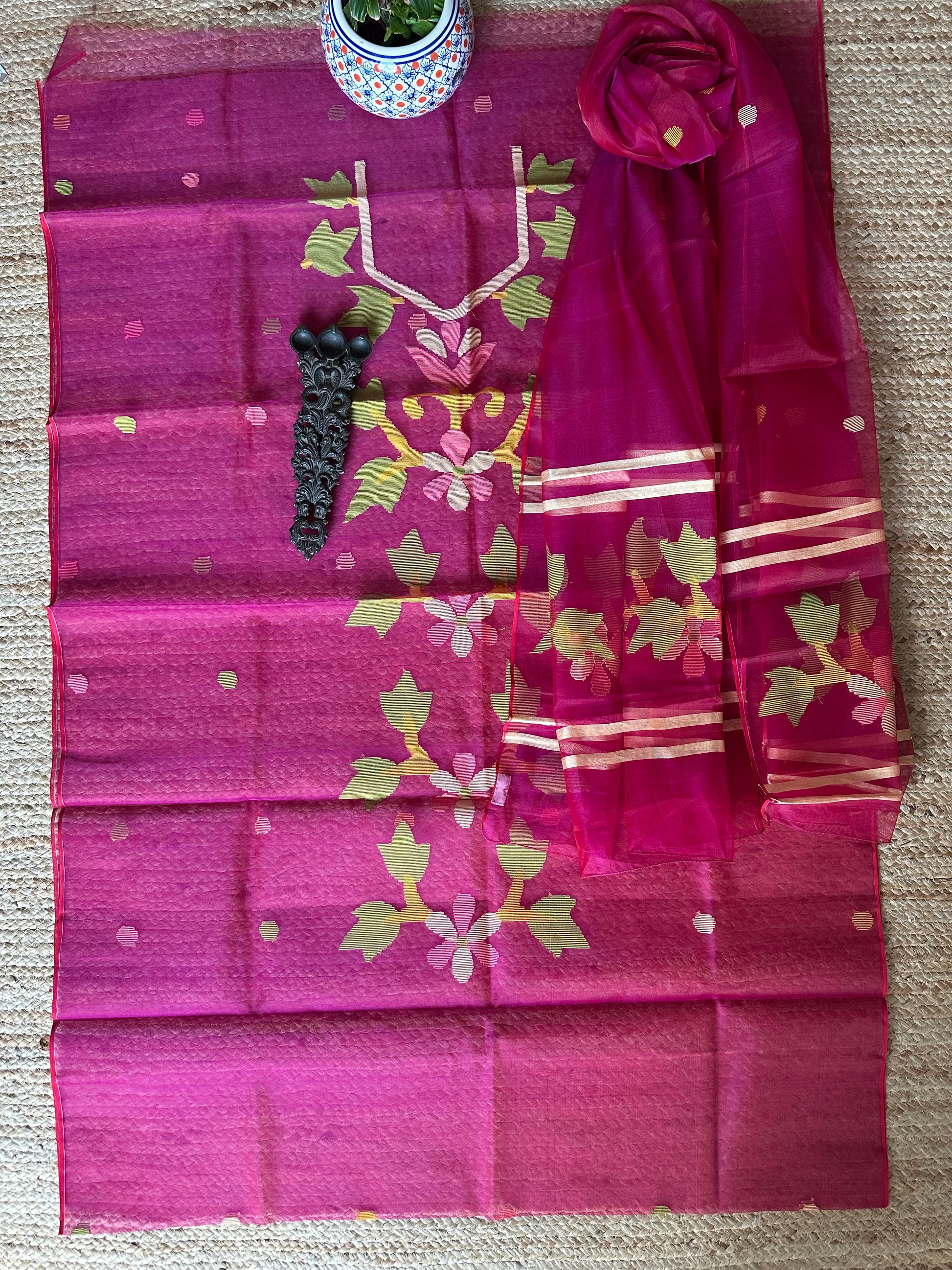 | Rani pink handwoven pure muslin silk kurta with resham jamdani muslin dupatta fabric: 2.5 mtrs meter dupatta : 2.5 mtrs * 35'' slight difference in shade could be due to camera & lights. embrace the imperfection !! happy handloom dry clean only |