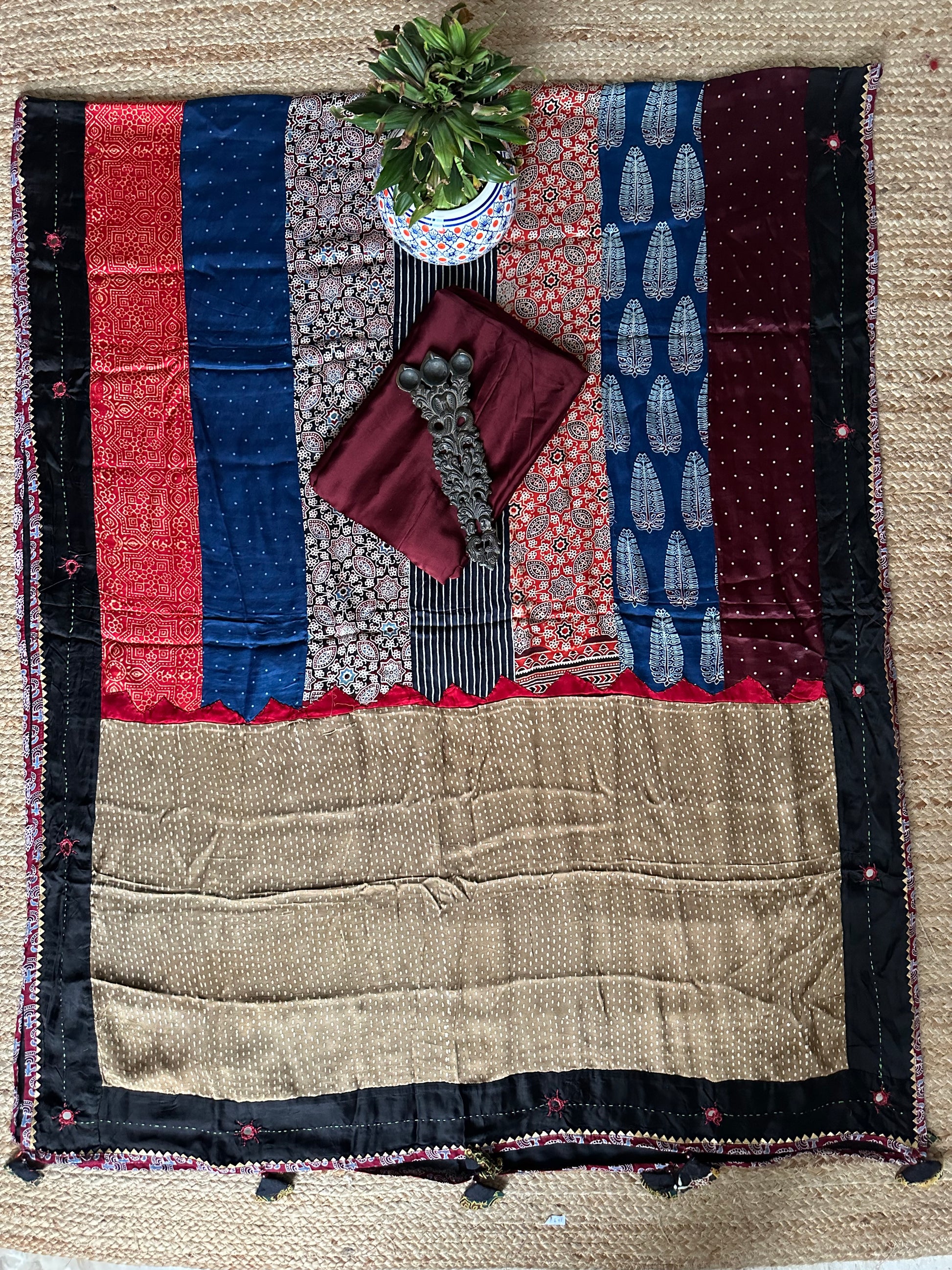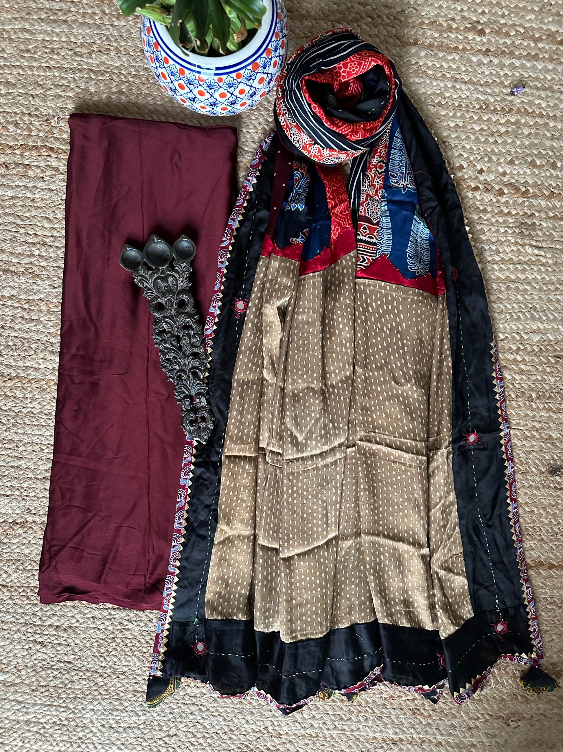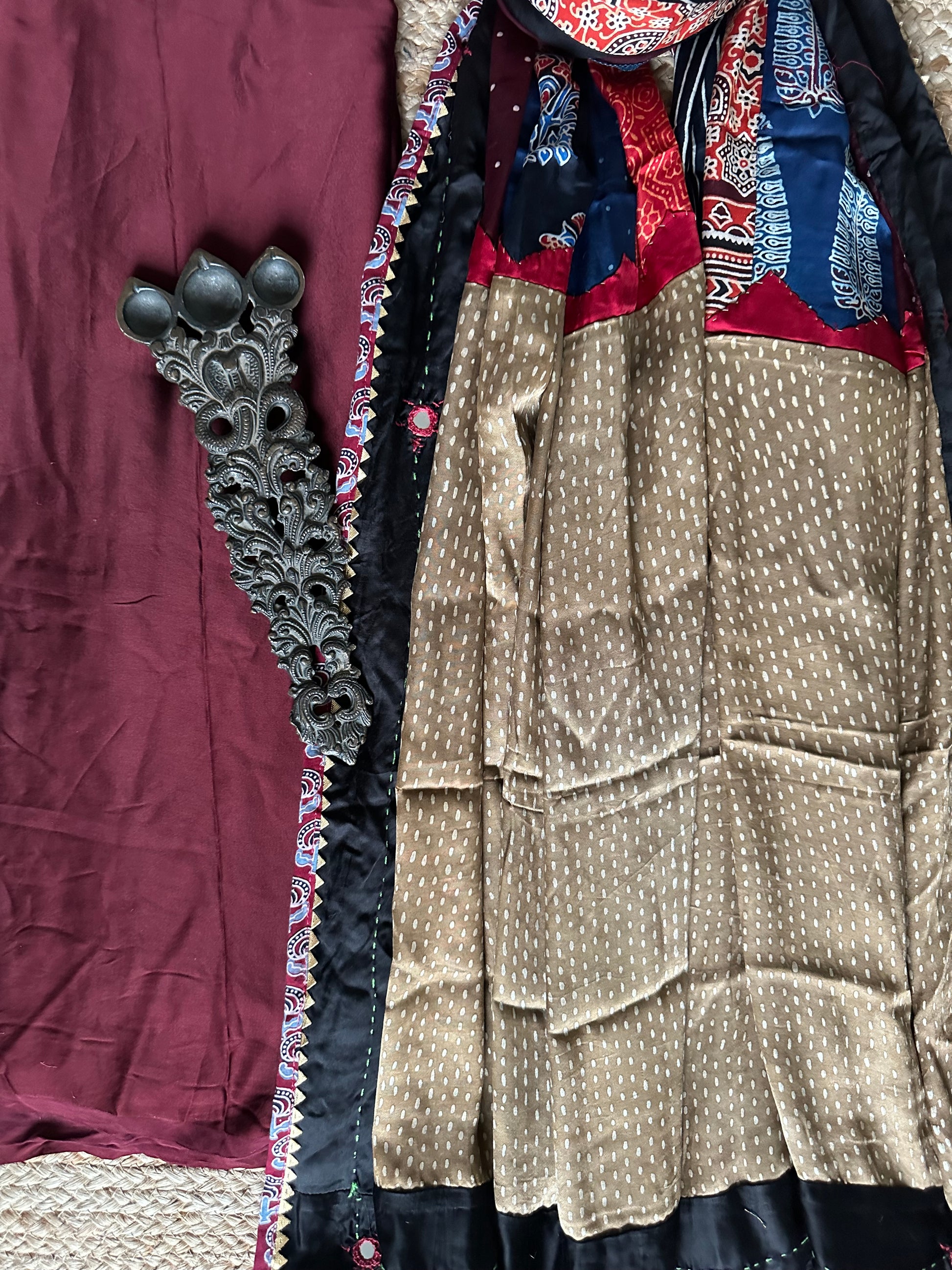 | WINE MAROON SILK KURTA WITH AJRAKH PATCHWORK HANDCRAFTED MODAL SILK DUPATTA