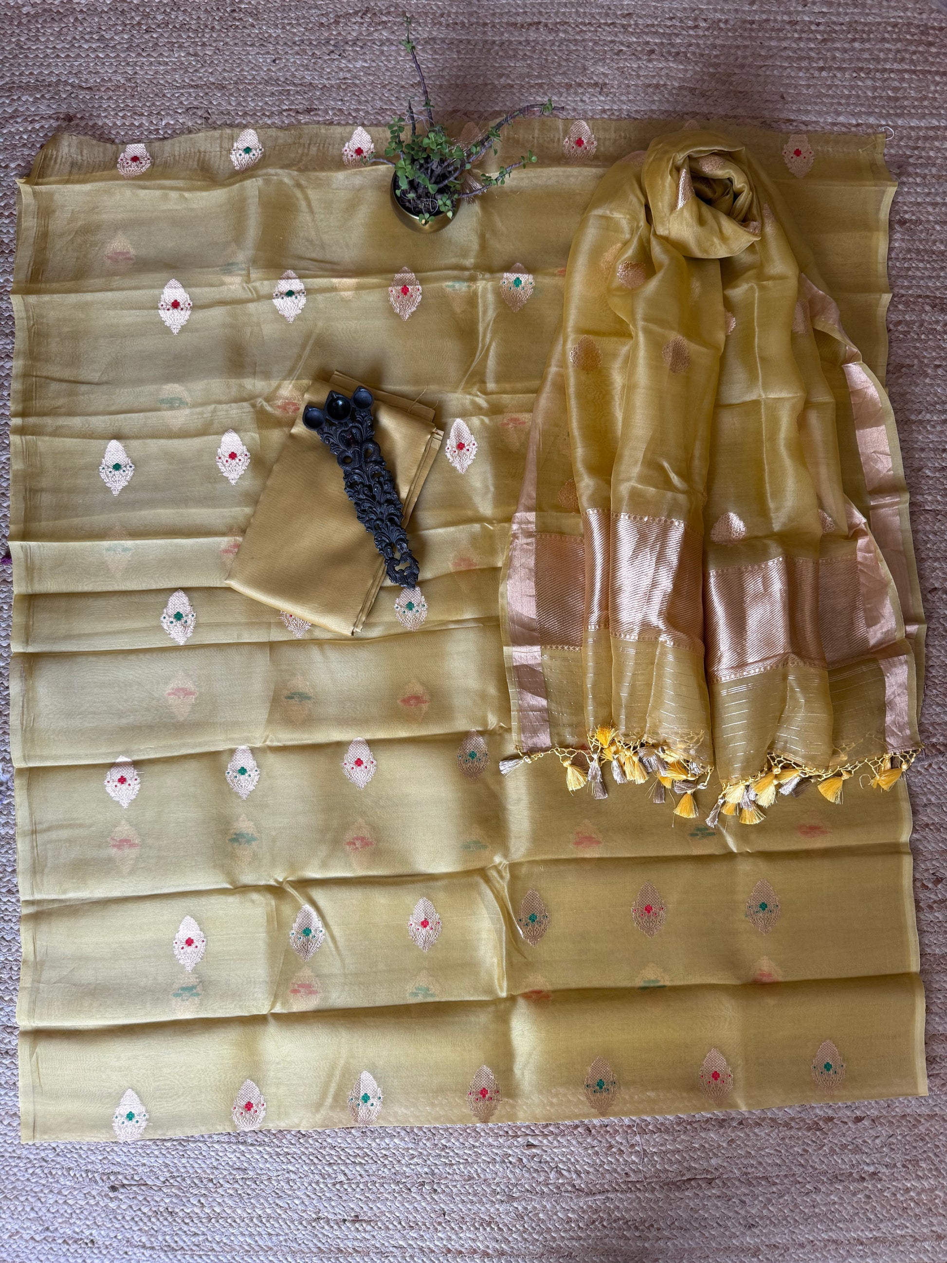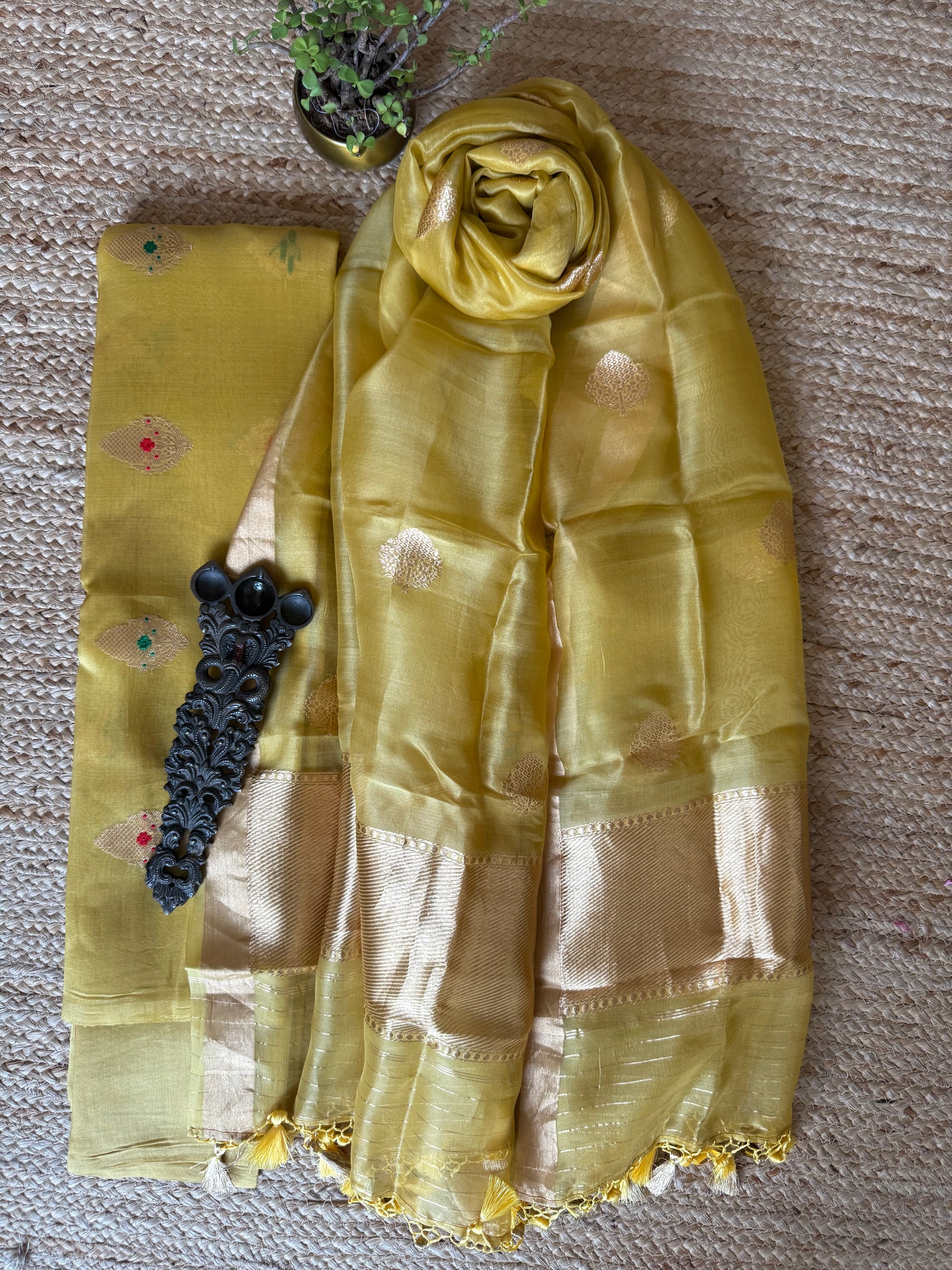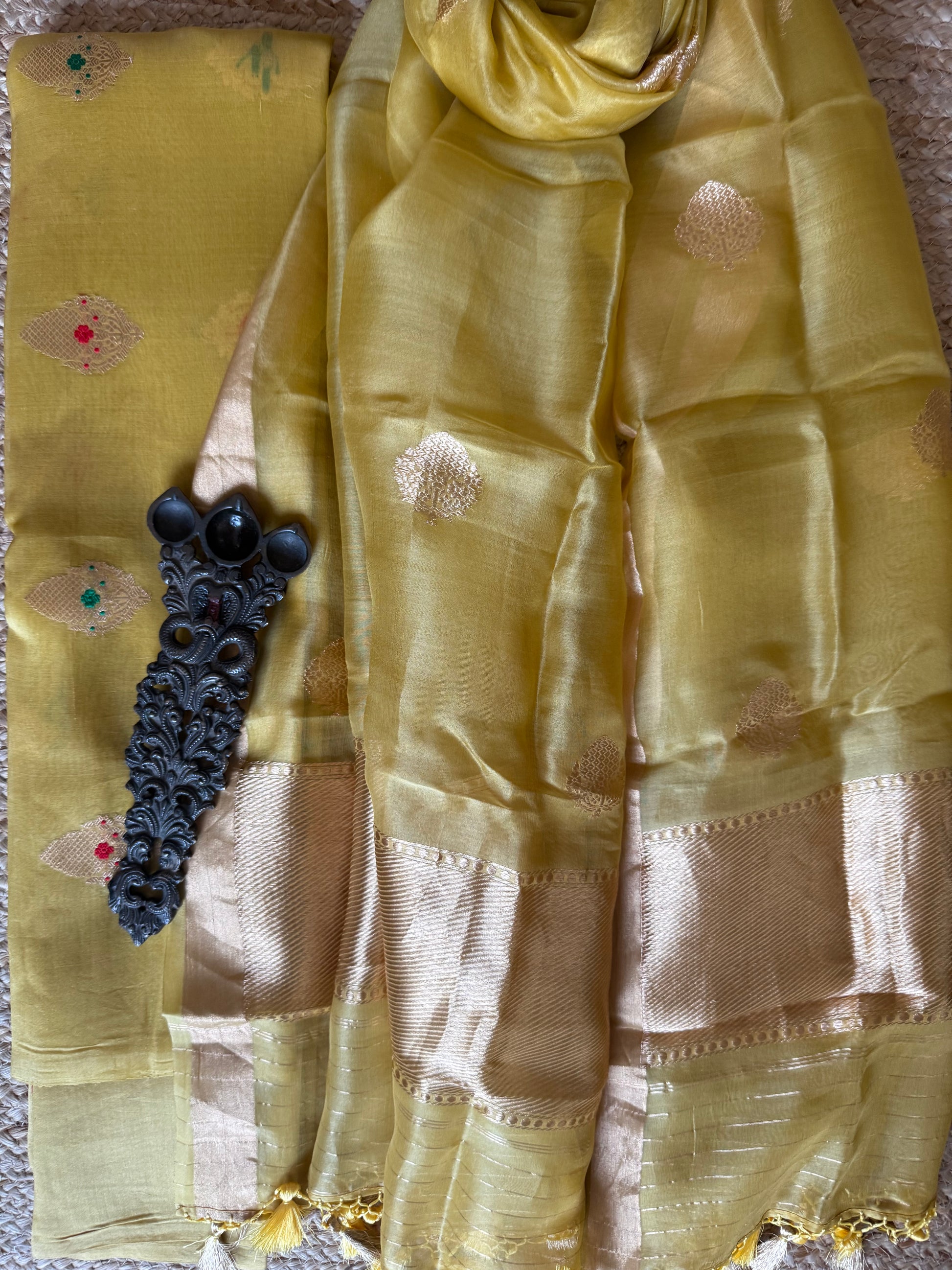 Saffron yellow Kora Silk certified  handloom  Banarsi kadwa booti meenakari 3 piece suit set