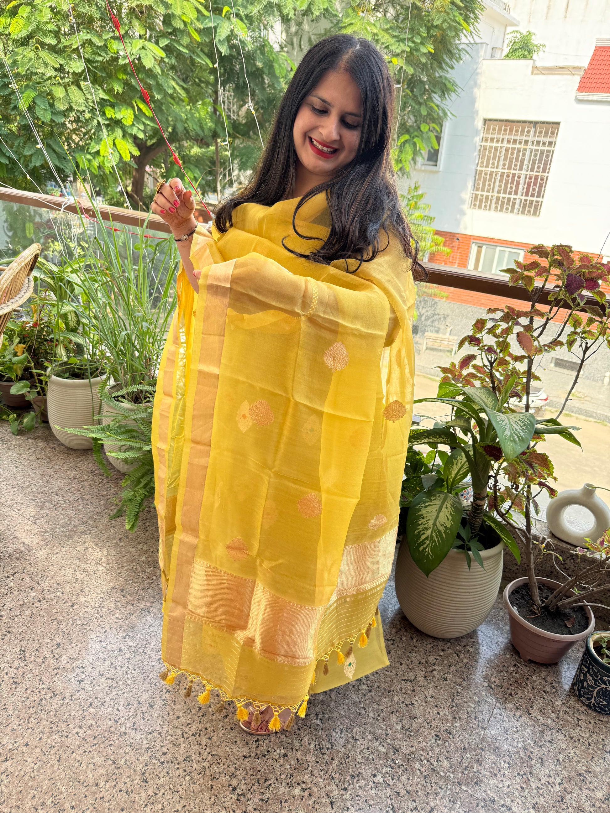Saffron Yellow Kora silk certified handloom Banarsi kadwa Booti three piece suit