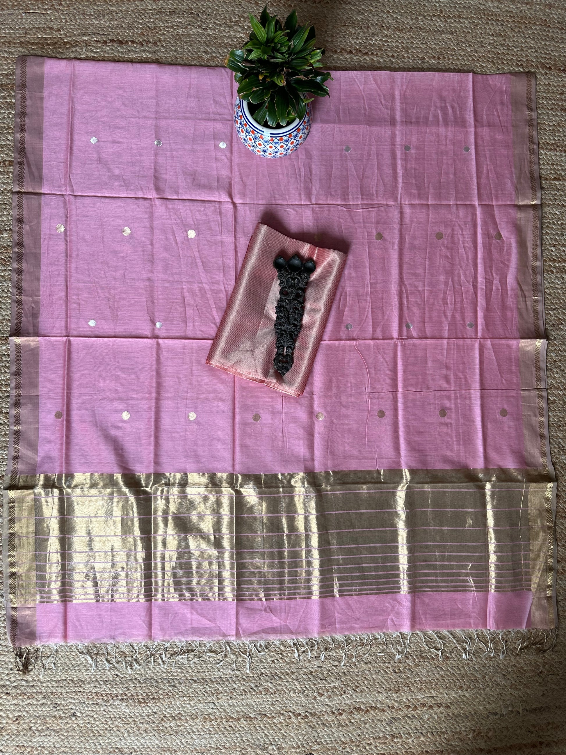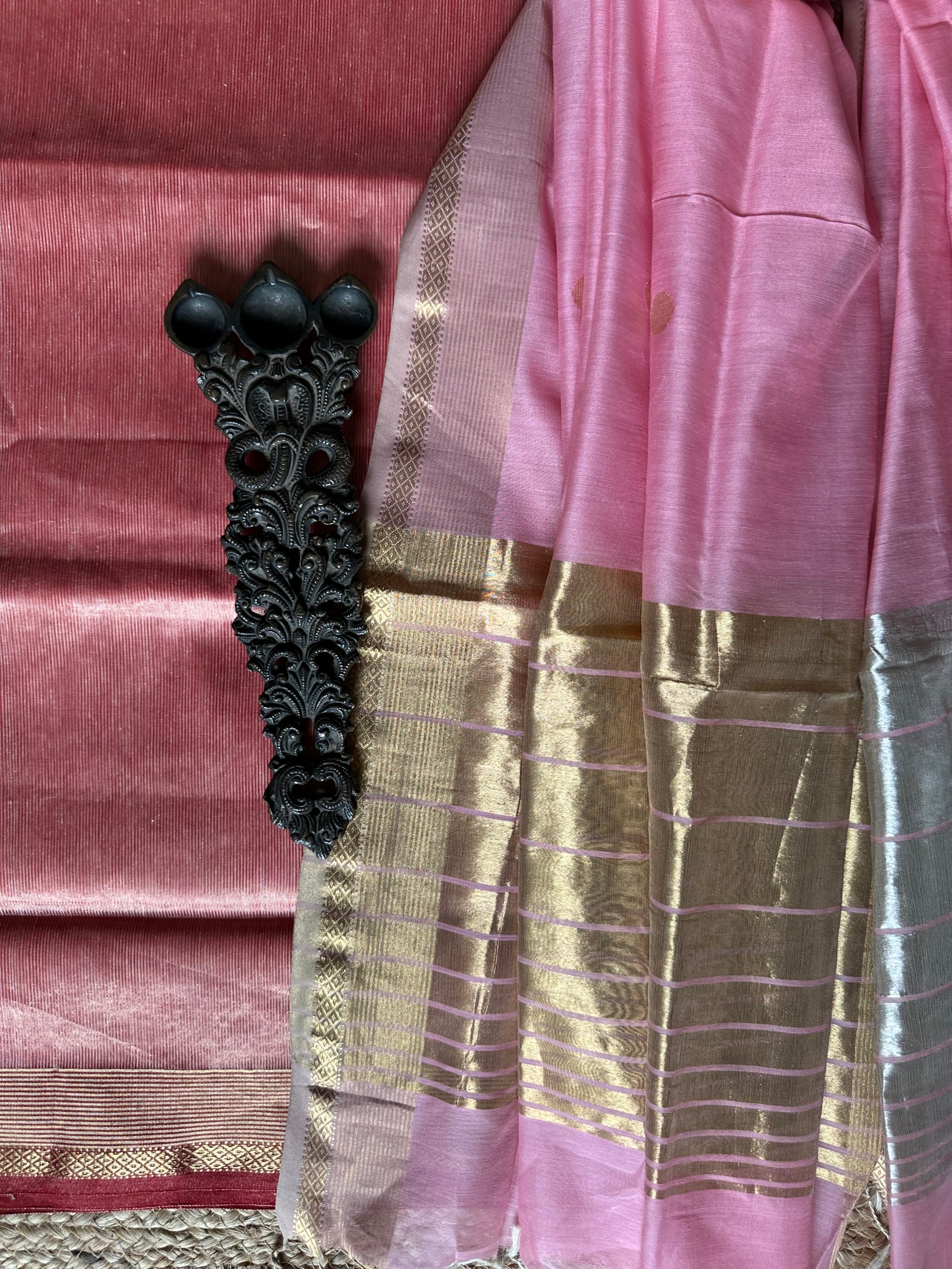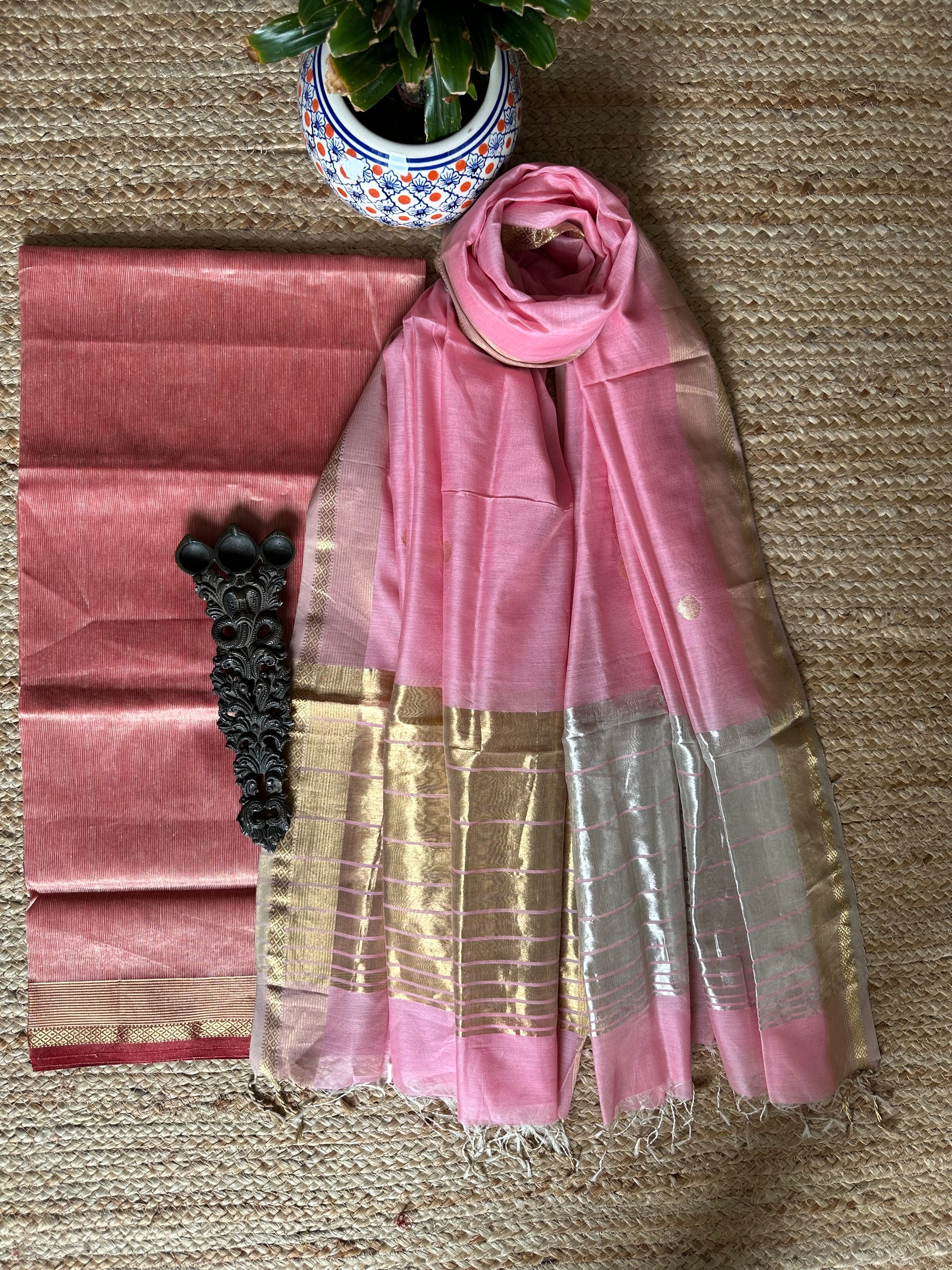 | GOLDEN LIGHT PINK TISSUE MAHESHWARI SILK HANDLOOM SUIT WITH ZARI WOVEN SILK DUPATT