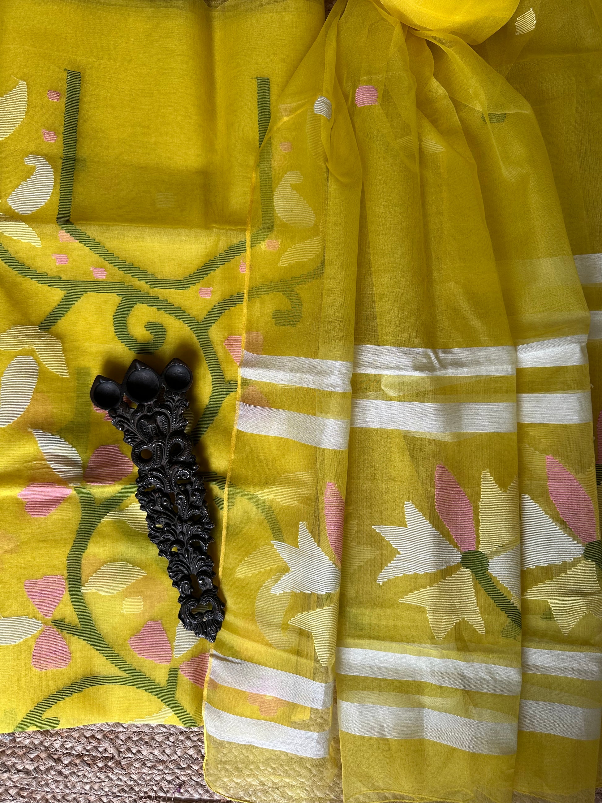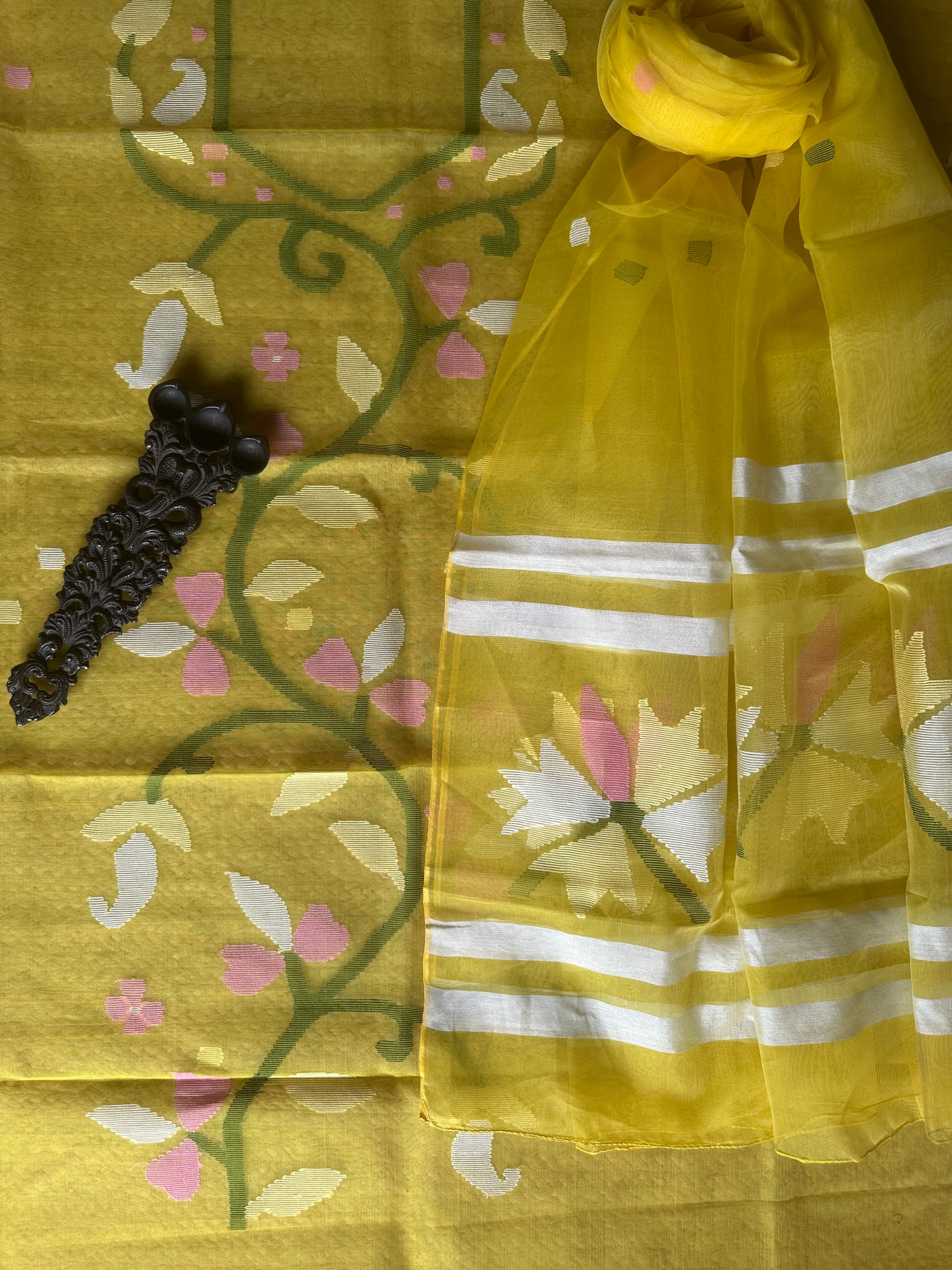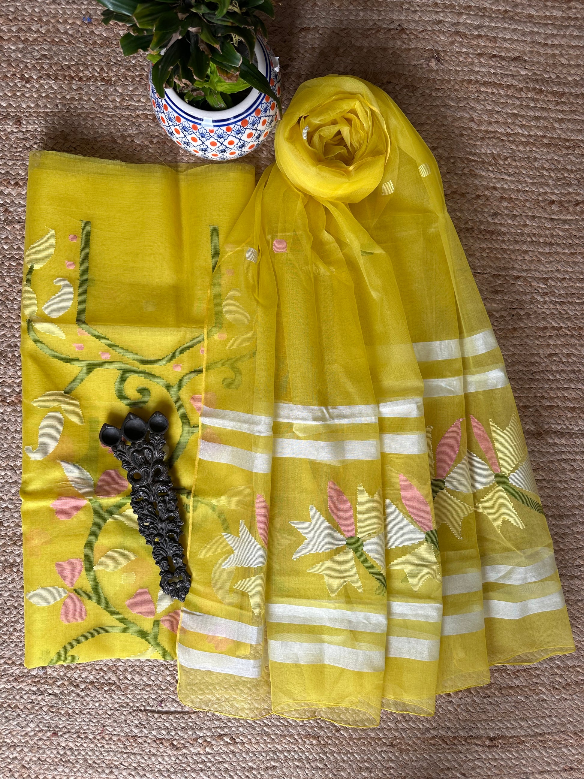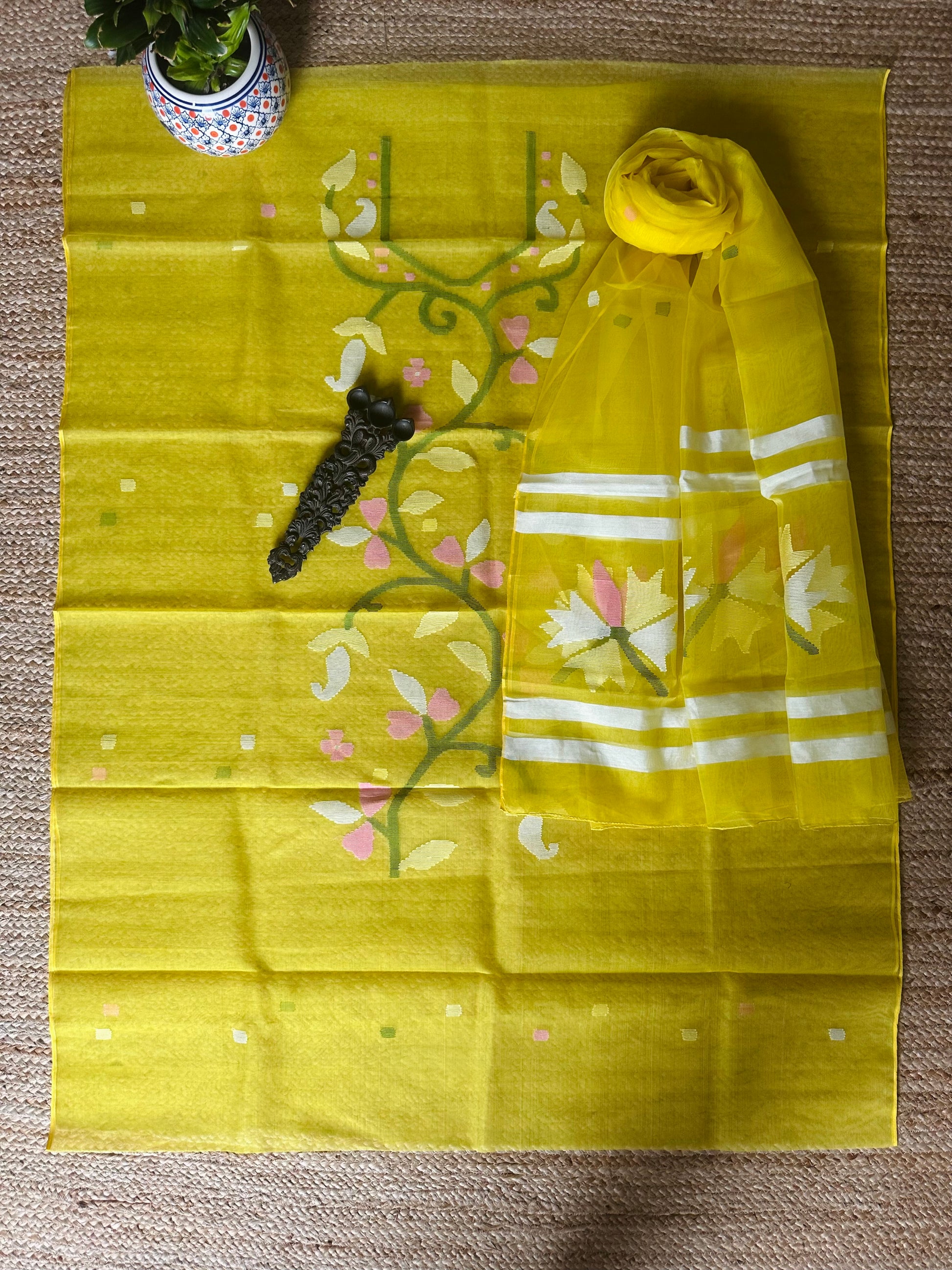 | Yellow handwoven pure muslin silk kurta with resham jamdani muslin dupatta fabric: 2.5 mtrs meter dupatta : 2.5 mtrs * 35'' slight difference in shade could be due to camera & lights. embrace the imperfection !! happy handloom dry clean only |